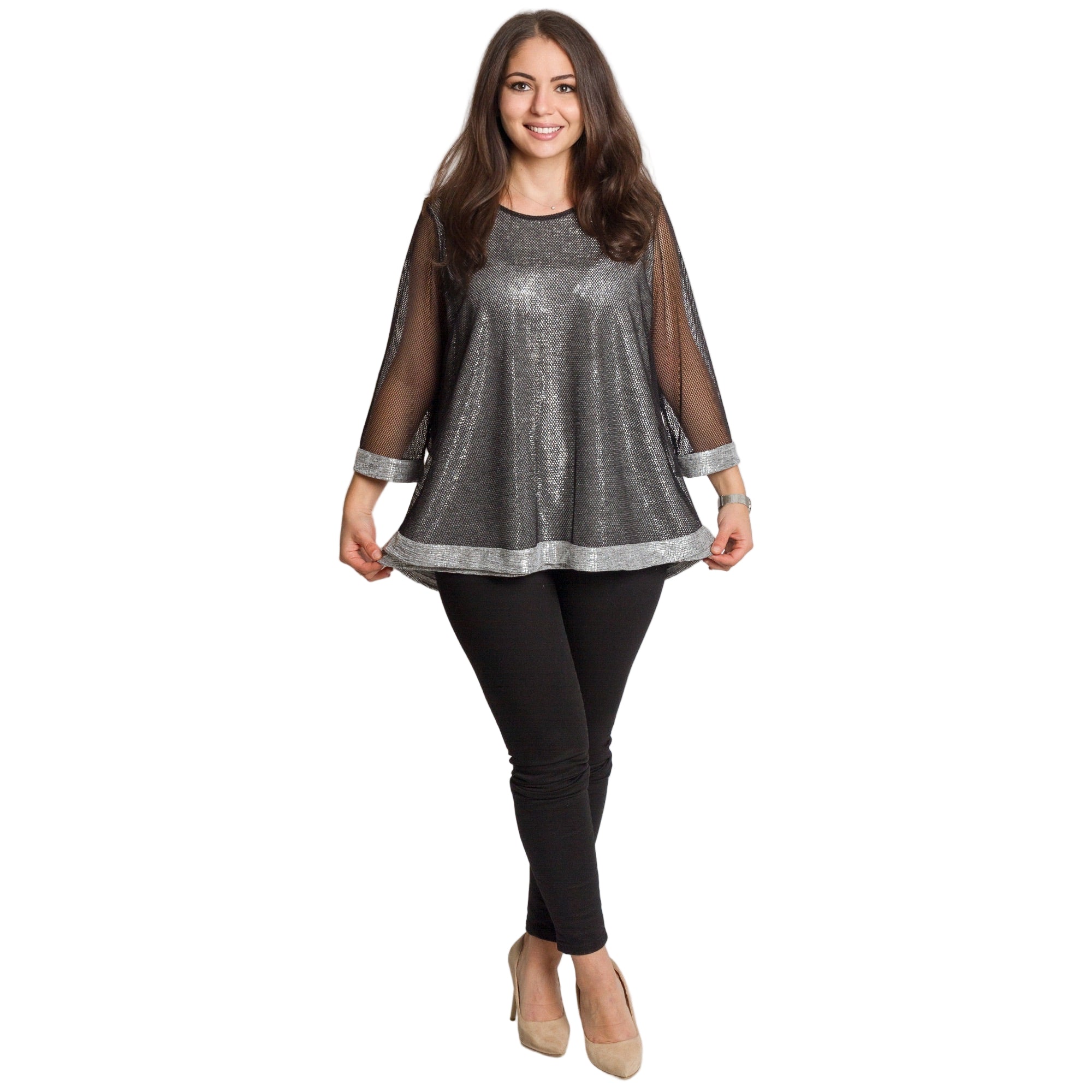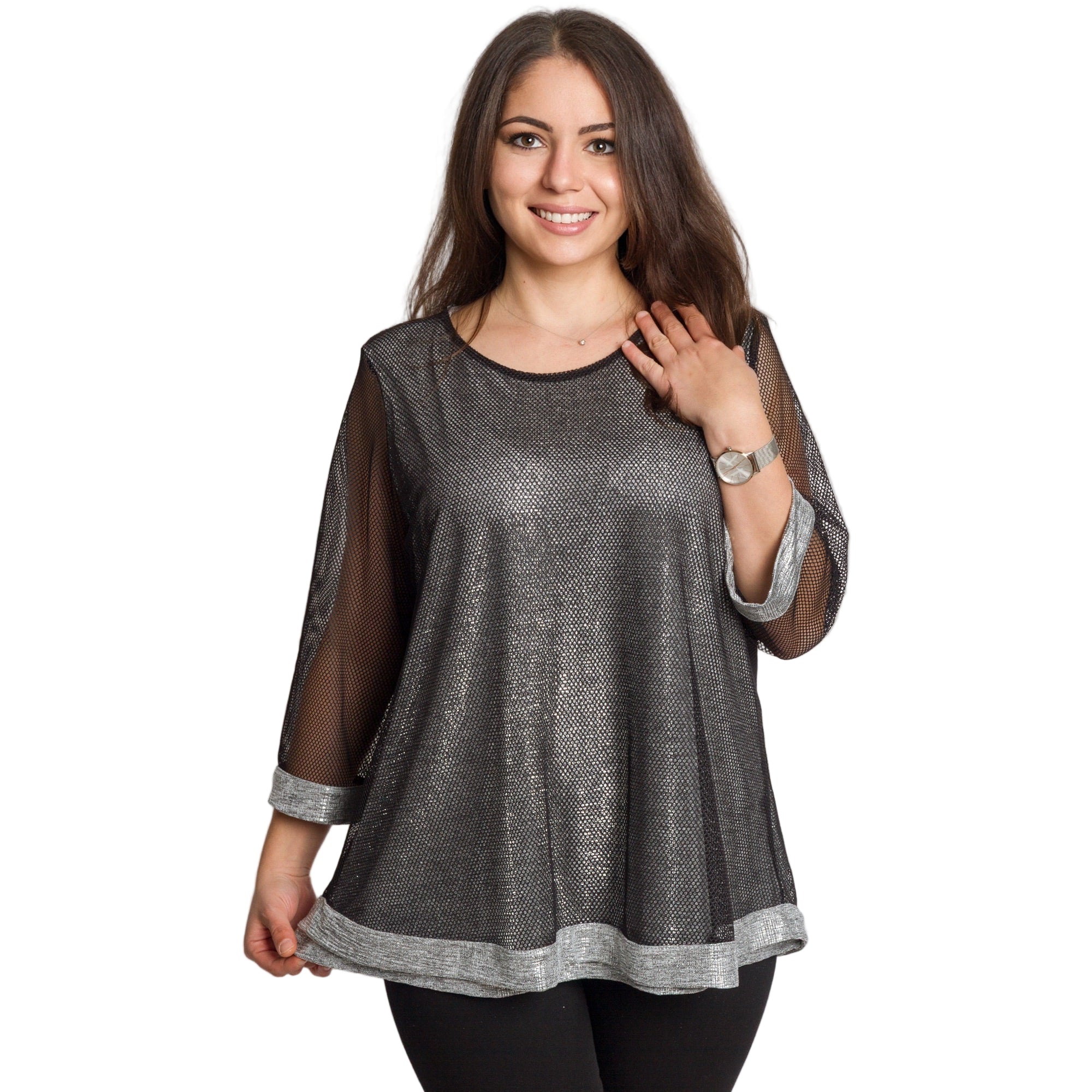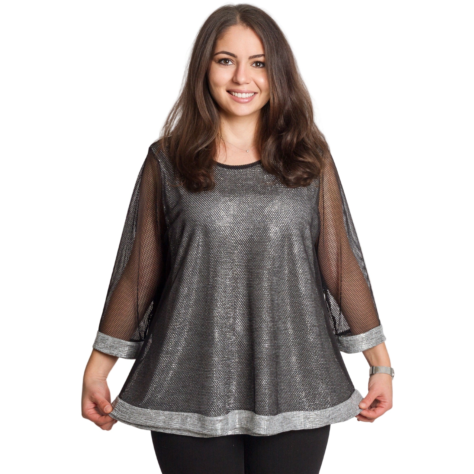 Елегантна туника в големи размери, изработена от висококачествена материя с блестящ металически ефект. Моделът впечатлява с ефирни мрежести ръкави 3/4 и контрастни сребристи кантове по маншетите и подгъва. Кройката е разкроена и свободна, осигуряваща комфорт и стил едновременно. Идеална за официални събития, празнични вечери и специални поводи през есенно-зимния сезон.