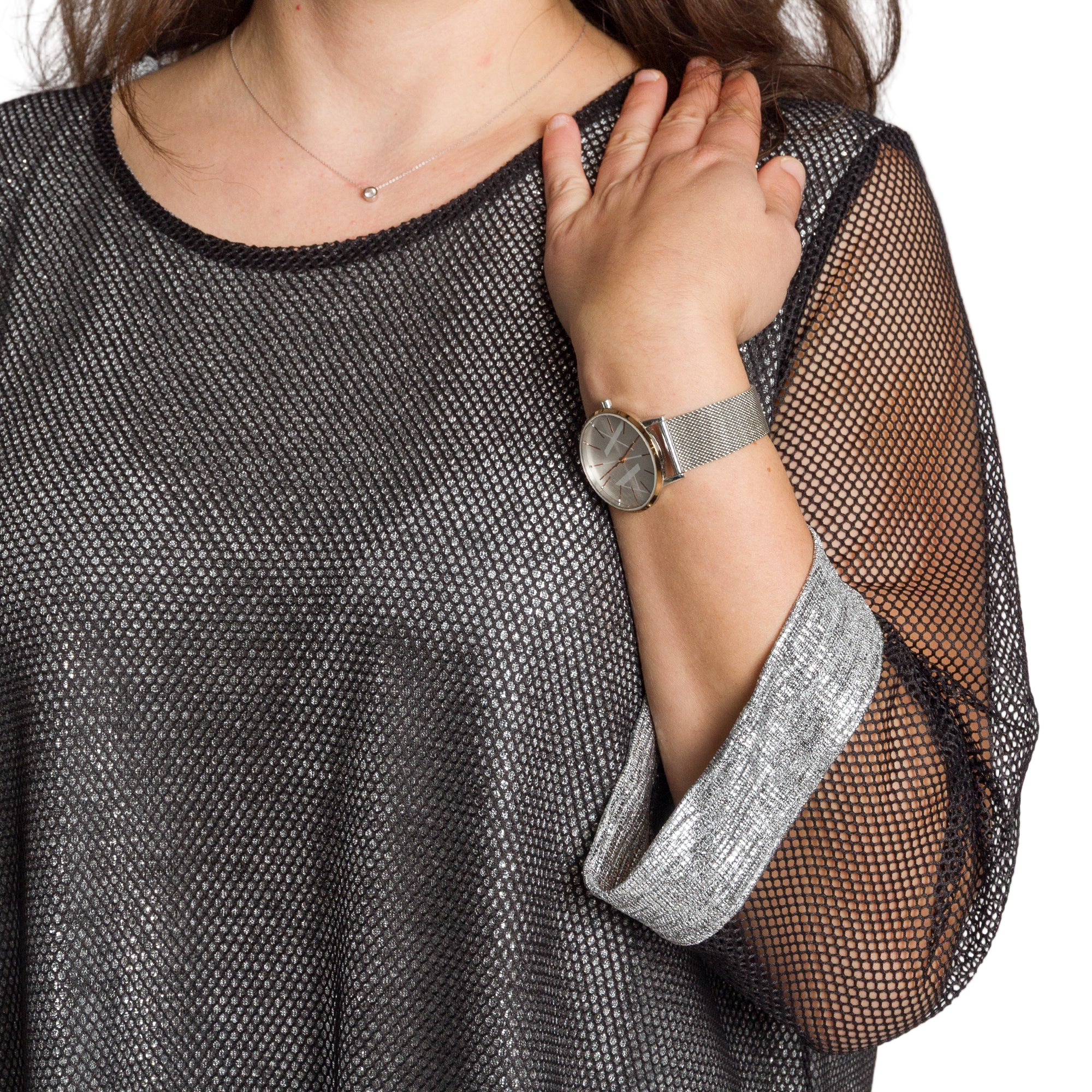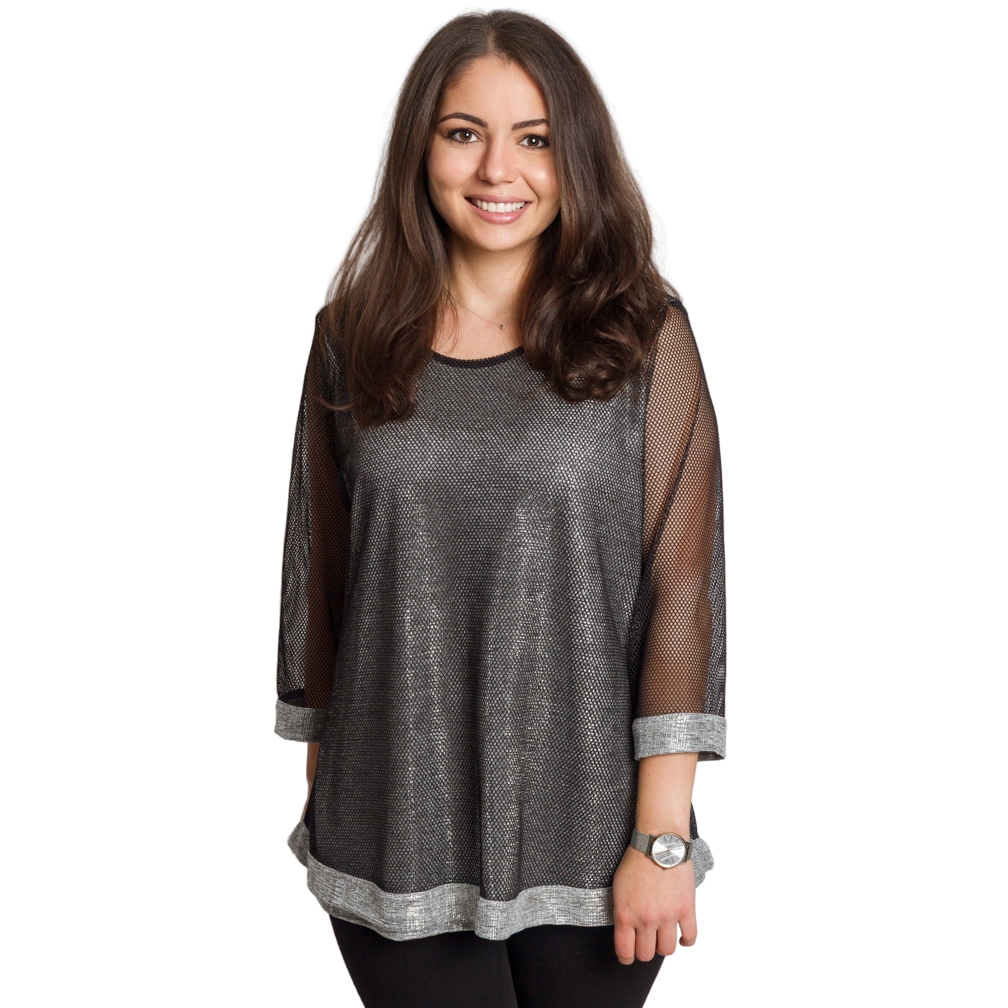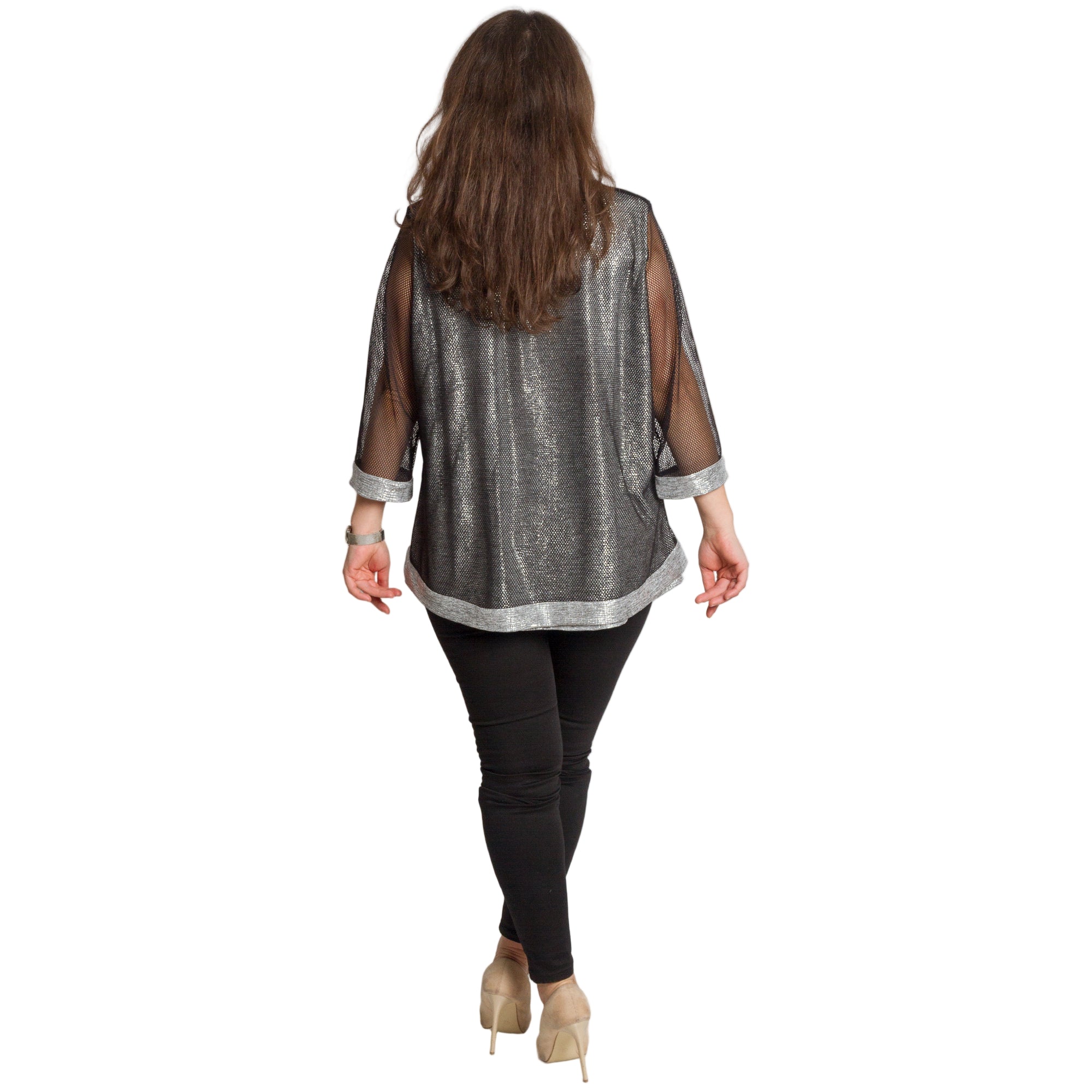 Елегантна туника в големи размери, изработена от висококачествена материя с блестящ металически ефект. Моделът впечатлява с ефирни мрежести ръкави 3/4 и контрастни сребристи кантове по маншетите и подгъва. Кройката е разкроена и свободна, осигуряваща комфорт и стил едновременно. Идеална за официални събития, празнични вечери и специални поводи през есенно-зимния сезон.