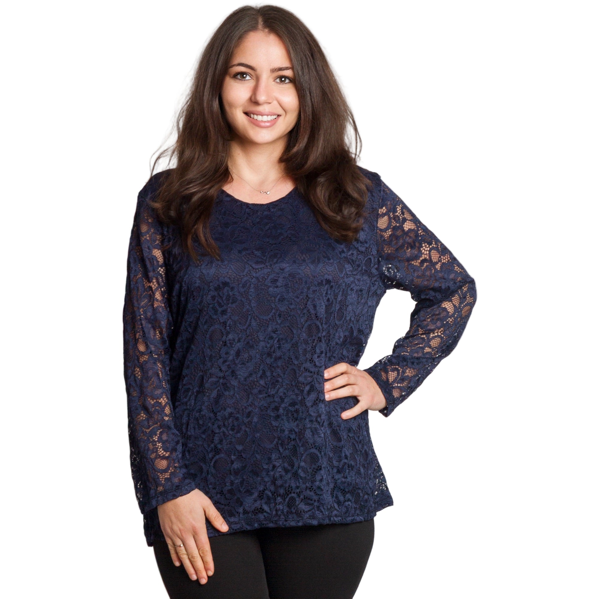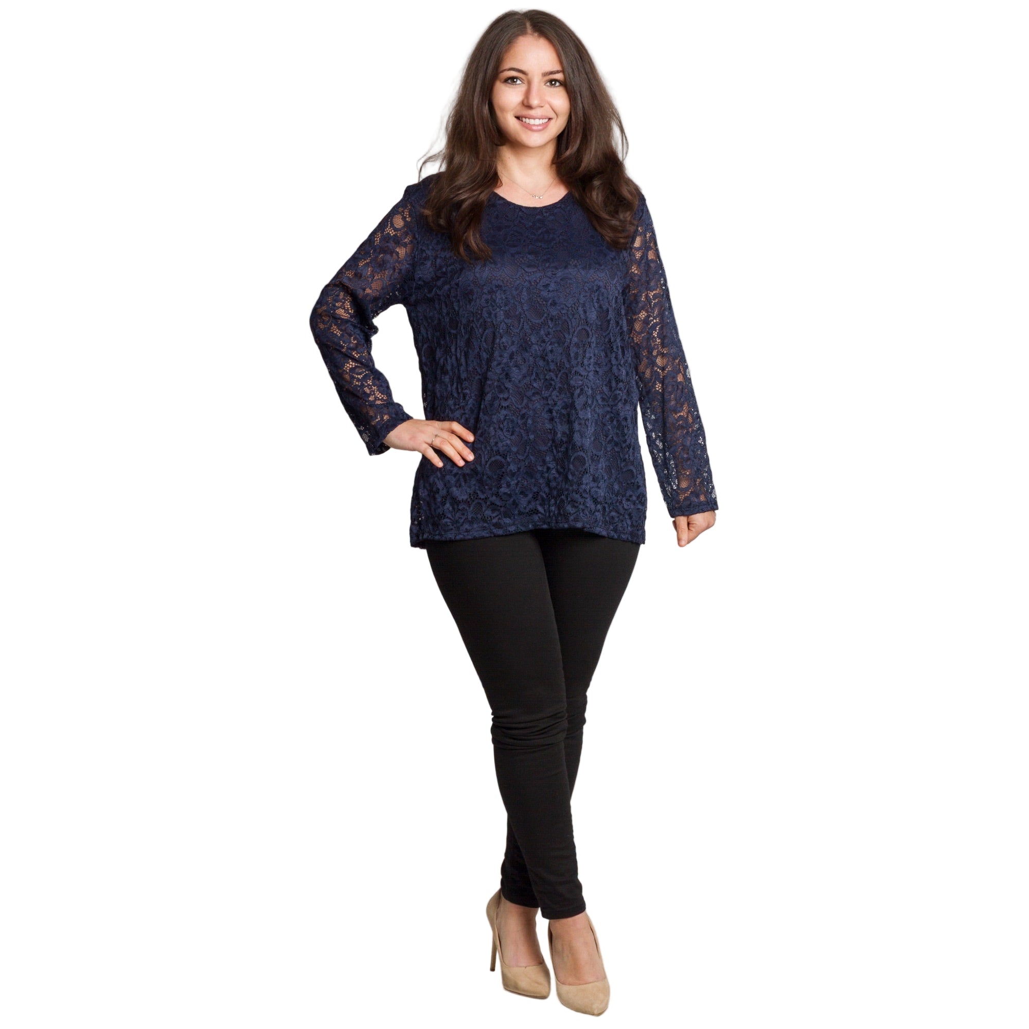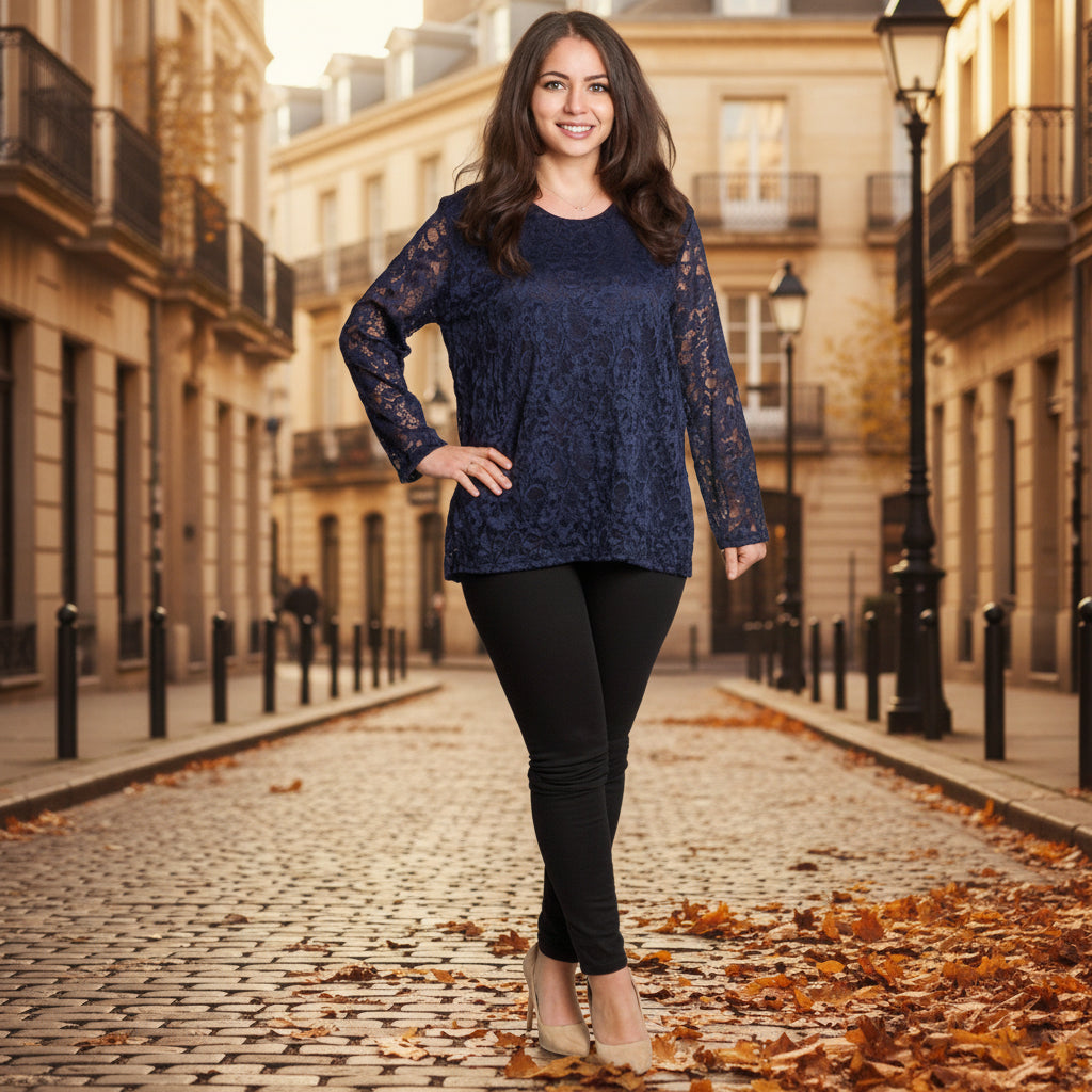 Елегантна тъмносиня блуза, идеална за официални поводи и стилни събития. Изработена е от мека вискоза с еластан, покрита с фина дантелена материя. Ръкавите и долната част са прозрачни, докато бюстът и деколтето имат непрозрачна подплата за комфорт и увереност. Правата кройка пада свободно и не очертава, като визуално издължава силуета. Тъмносиният цвят придава изисканост и лесно се комбинира с панталон или пола. Перфектен избор за вечеря, празник или официална визия през есенно-зимния сезон.