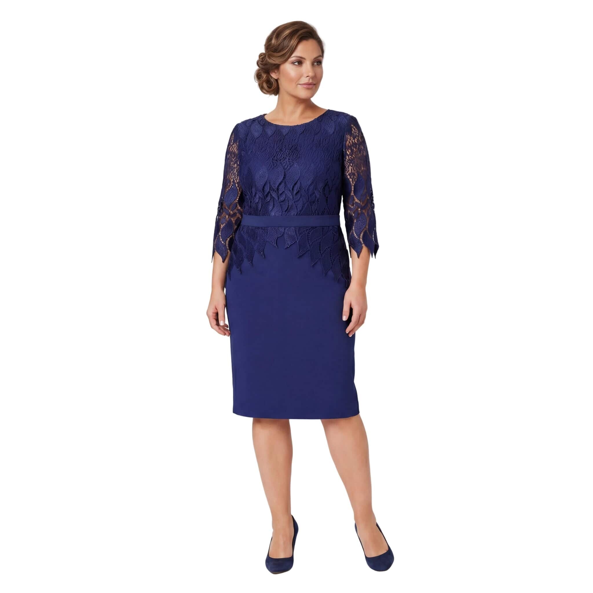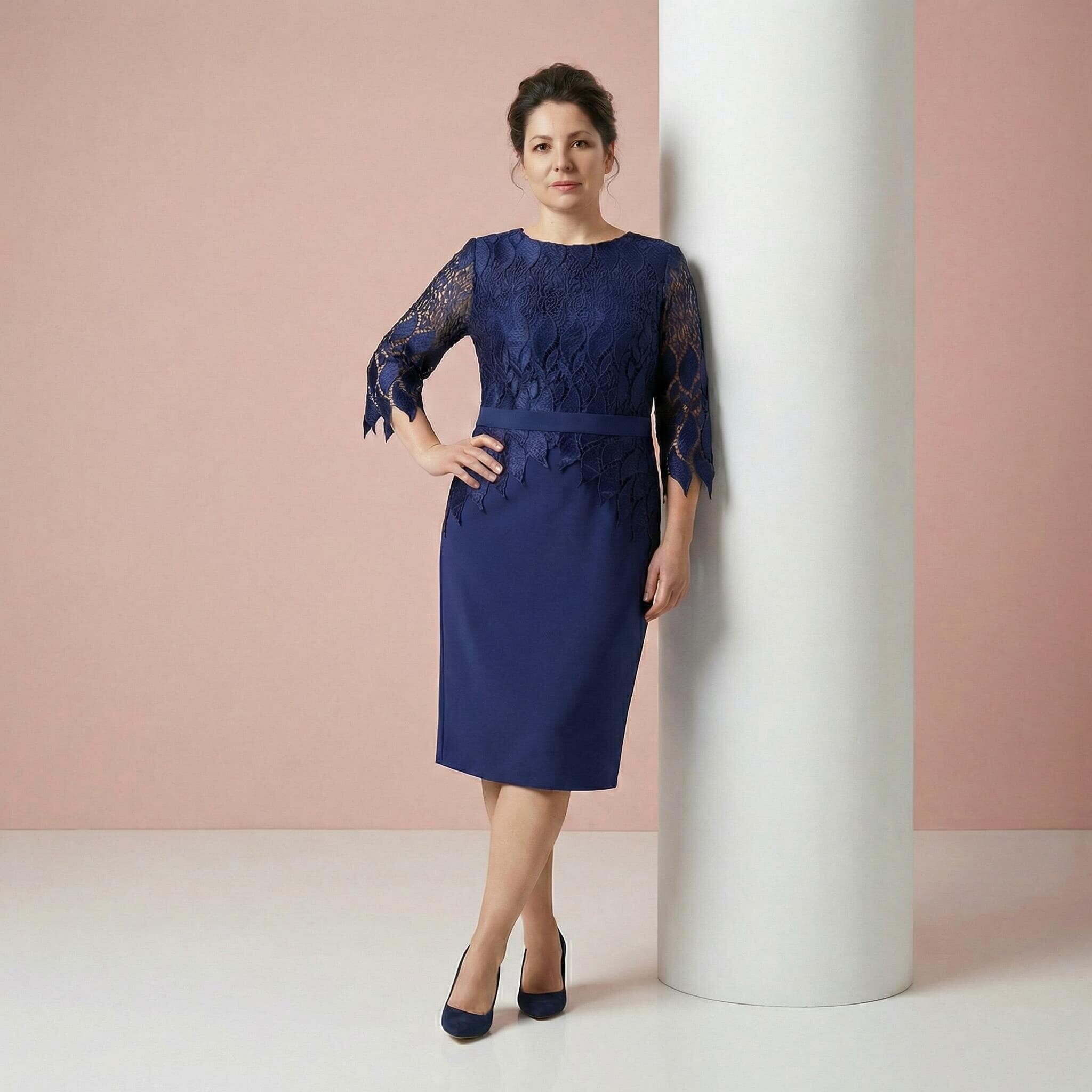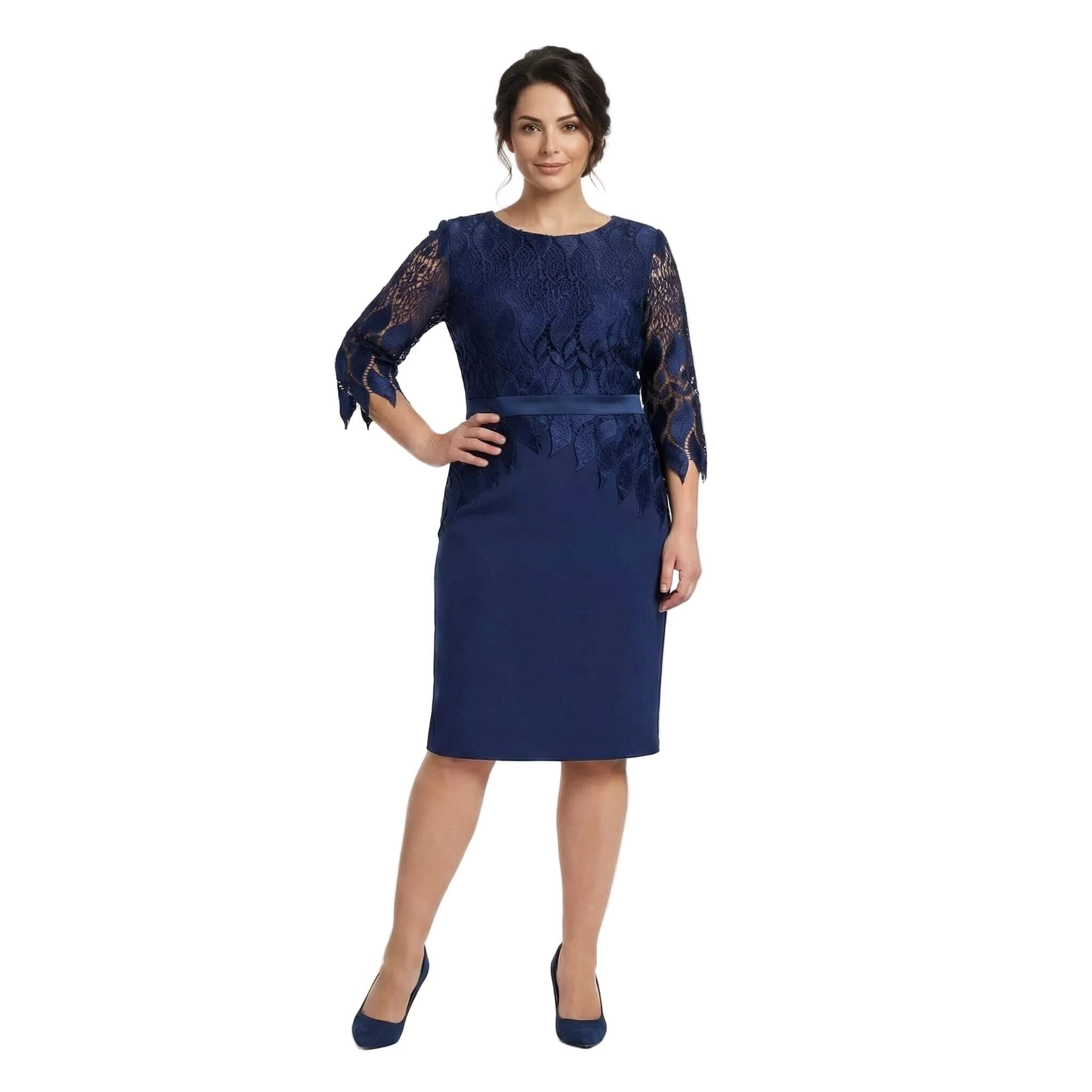 Открийте съвършения баланс между изисканост и комфорт с тази официална рокля в наситен тъмносин цвят. Моделът е специално създаден за дами с извивки, като съчетава мекотата на висококачествената вискоза с луксозното излъчване на фината дантела. Горната част е декорирана с изящна дантела с флорални мотиви и нежен назъбен ръб, който добавя доза романтика към визията. Кройката е права и пада тежко, следвайки естествените линии на тялото без да очертава излишно. Включеното коланче позволява деликатно акцентиране на талията, а 7/8 ръкавите придават завършен и стилен вид. Тази рокля е идеалният избор за сватба, кръщене или официална вечеря, гарантирайки ви увереност и класа.