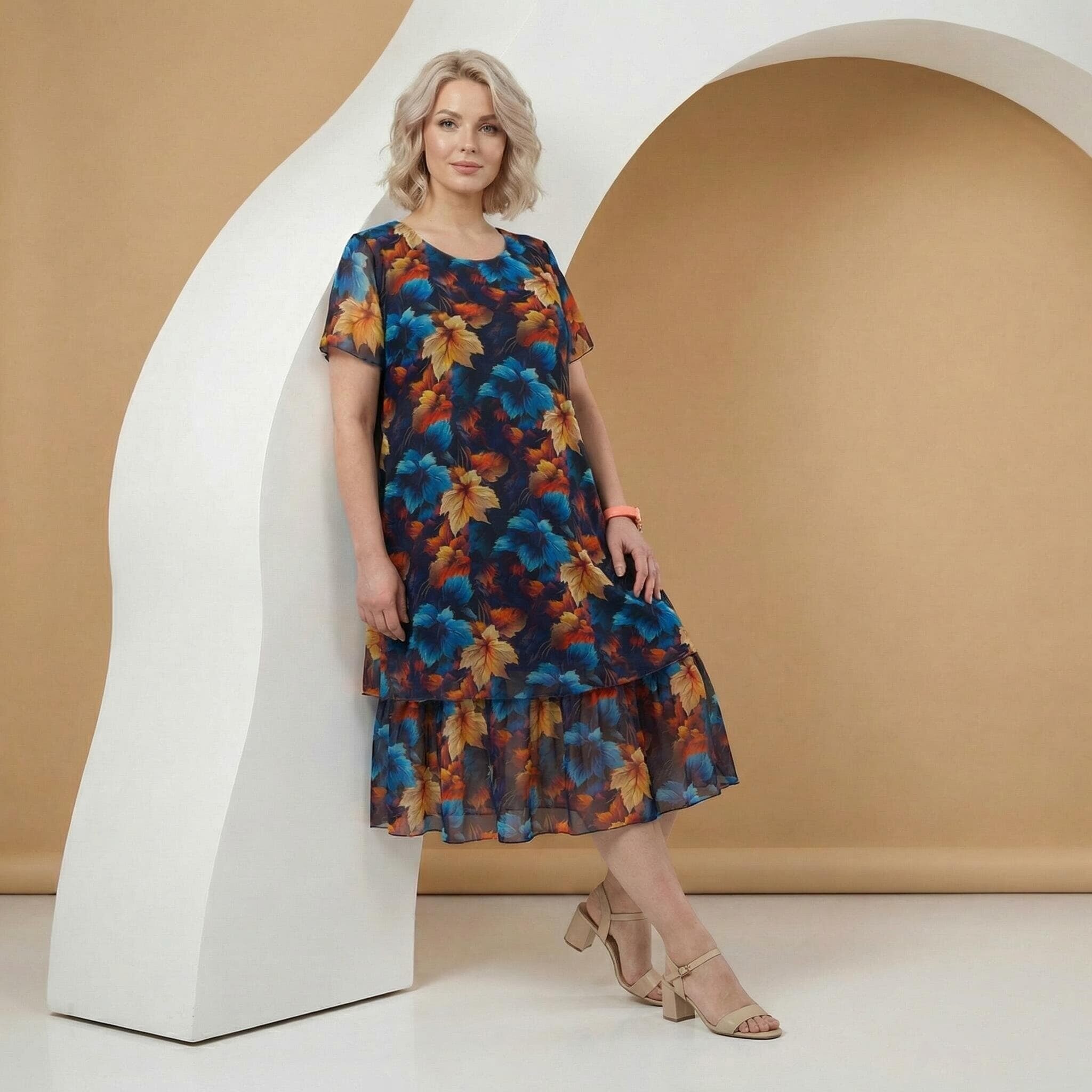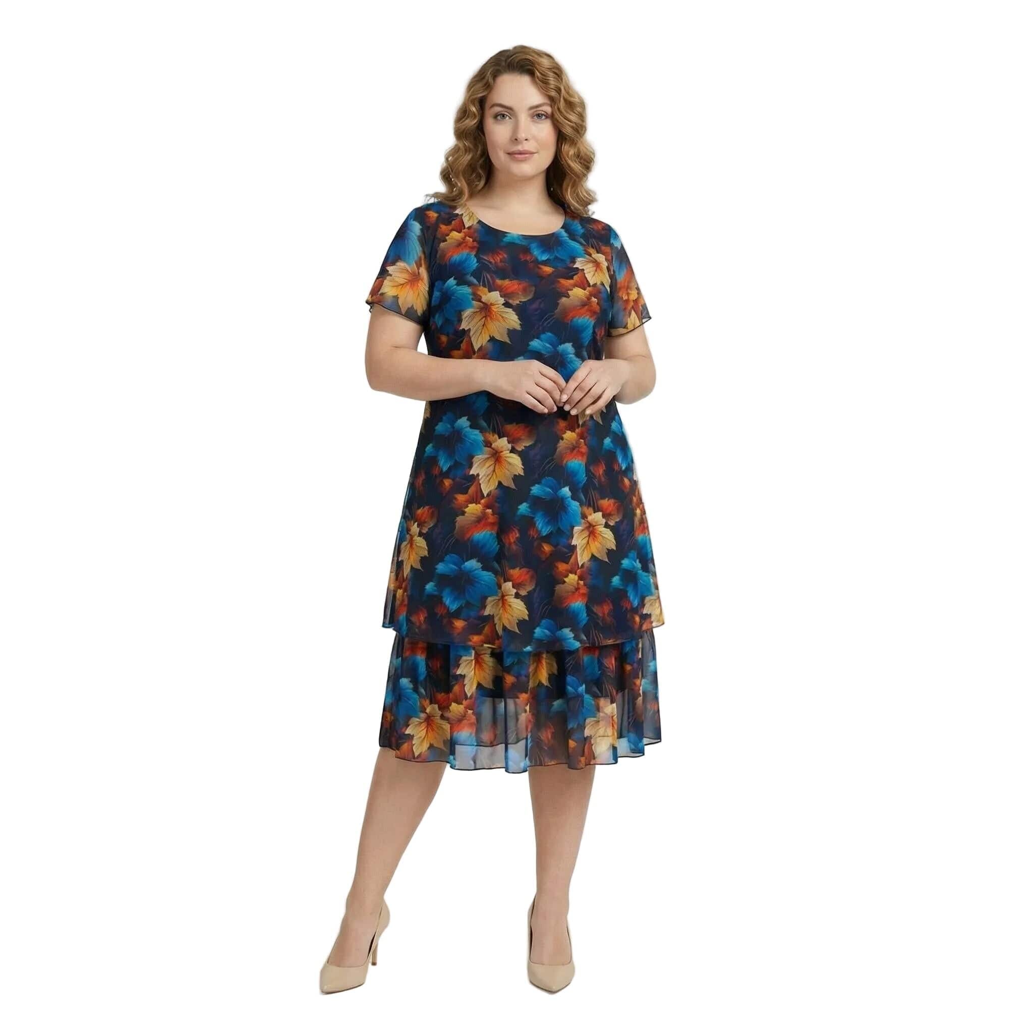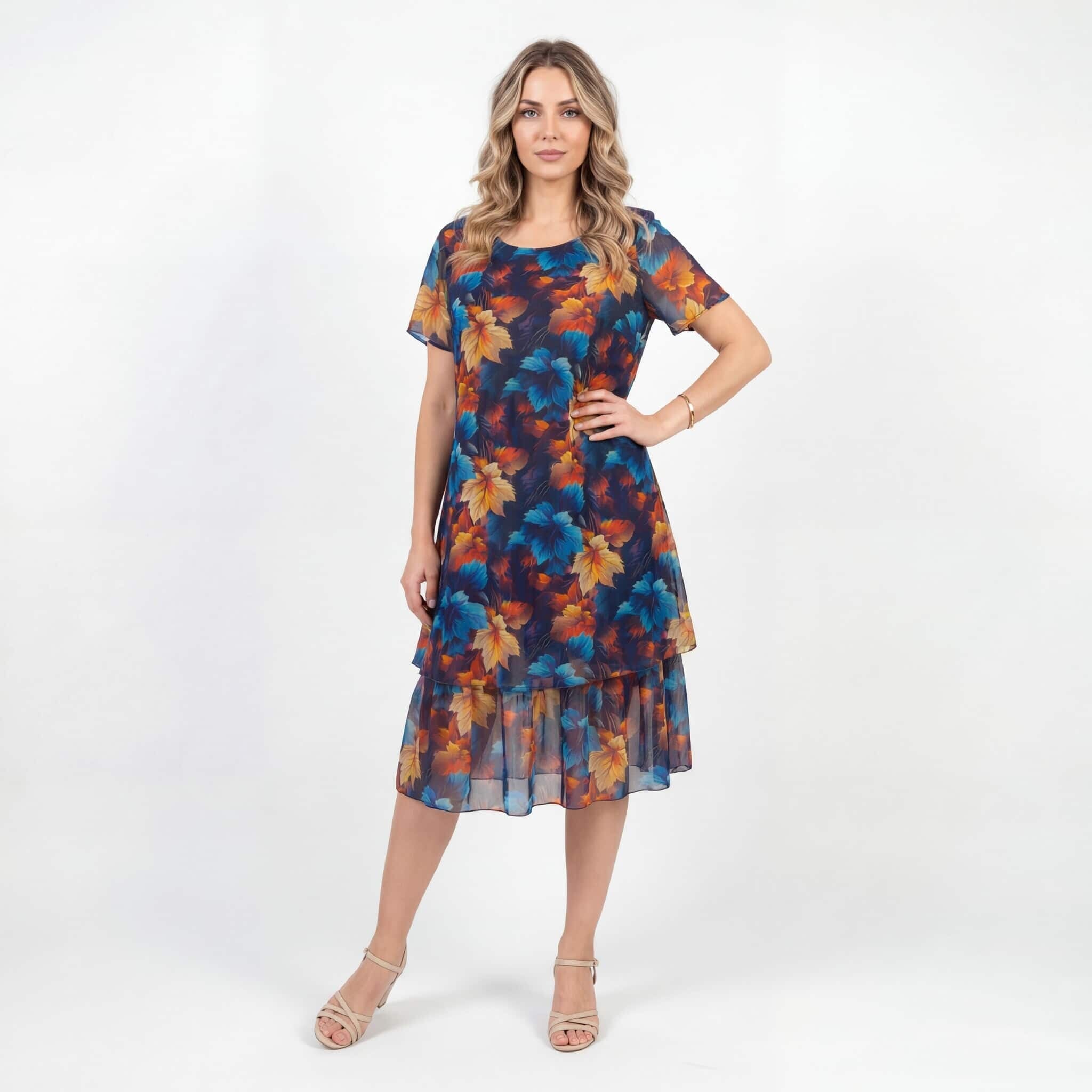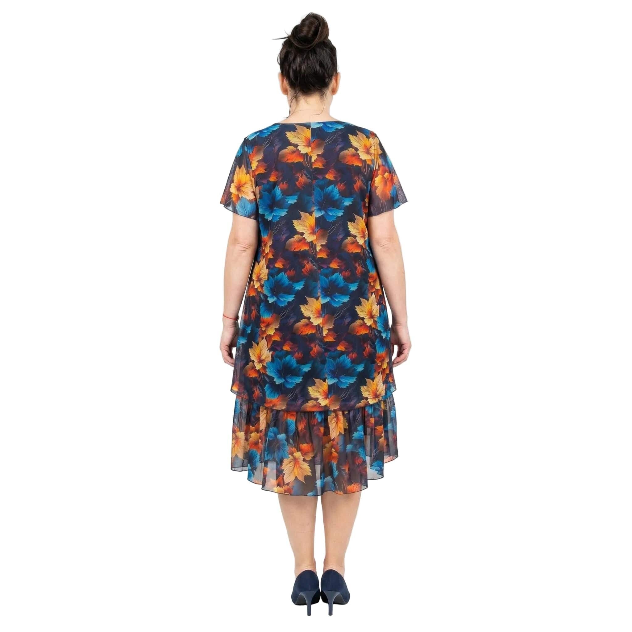 Официална тъмносиня макси рокля от шифон с многоцветен принт на листа