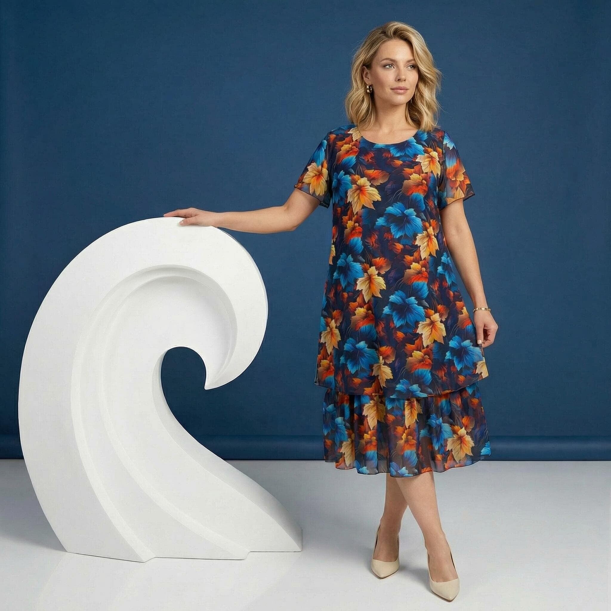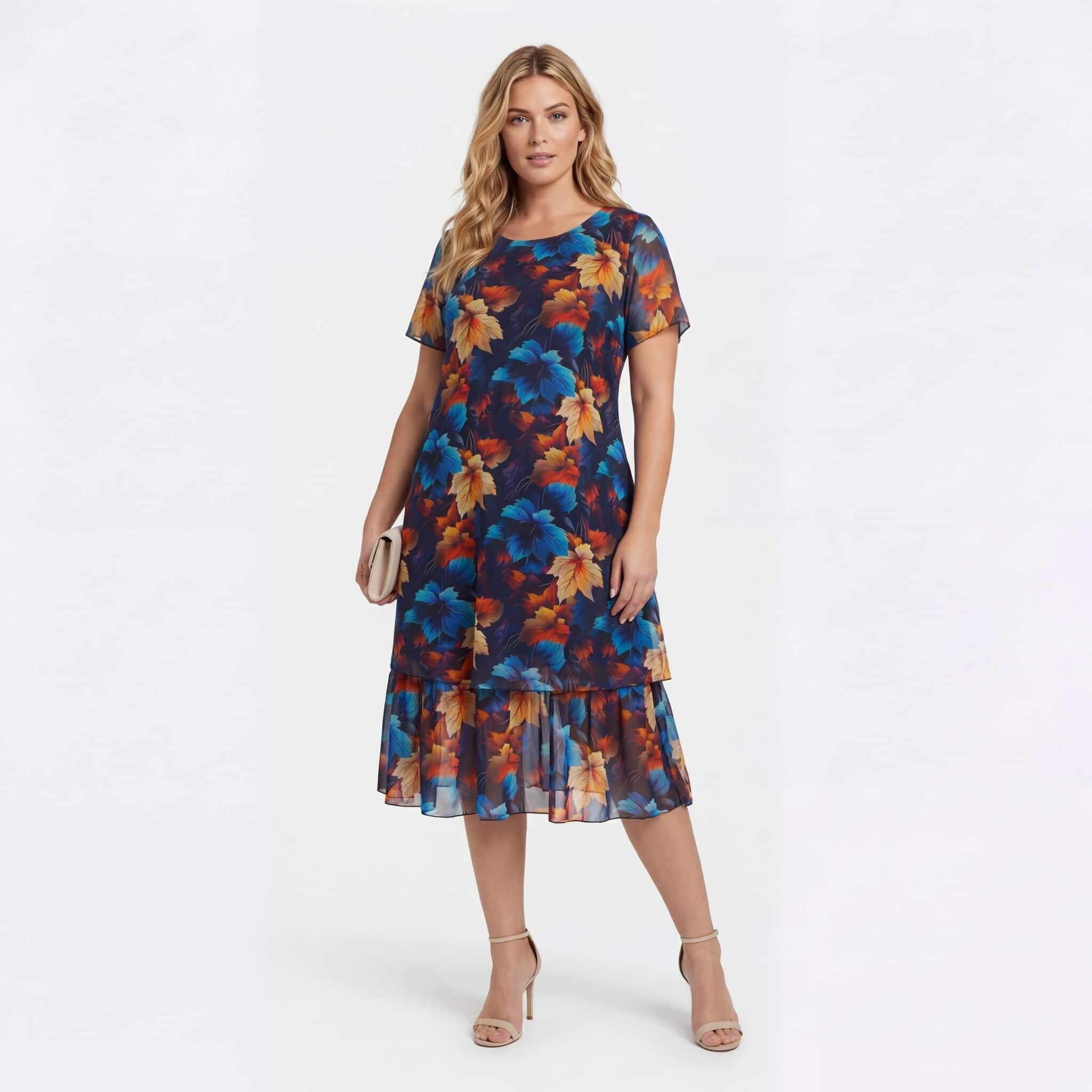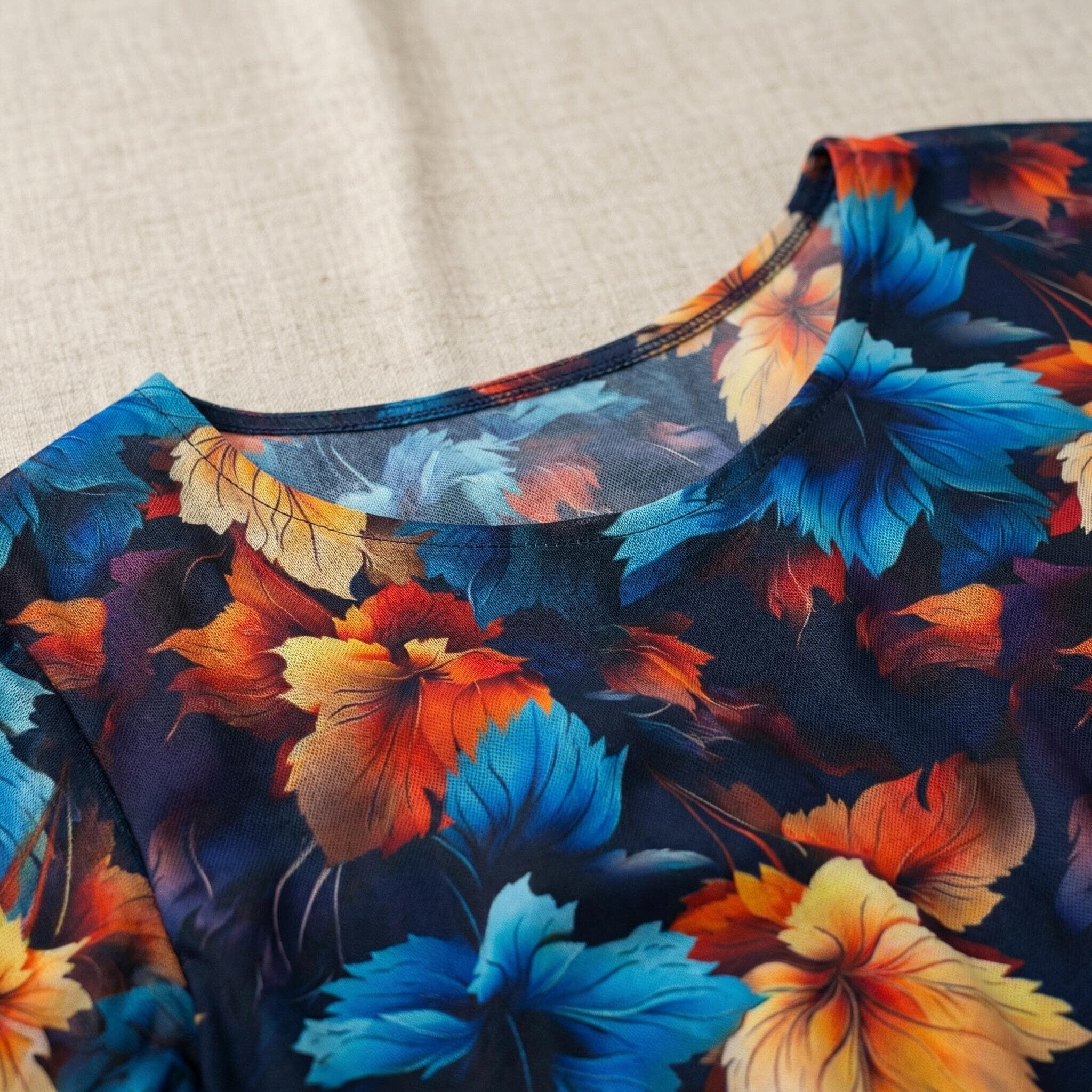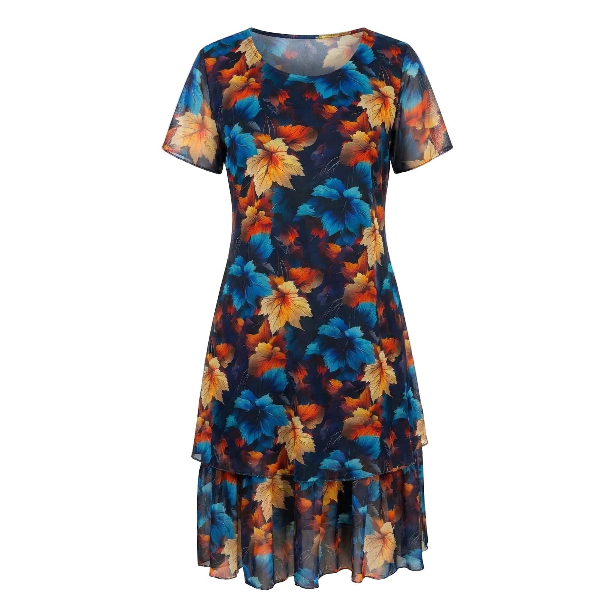 Официална тъмносиня макси рокля от шифон с многоцветен принт на листа