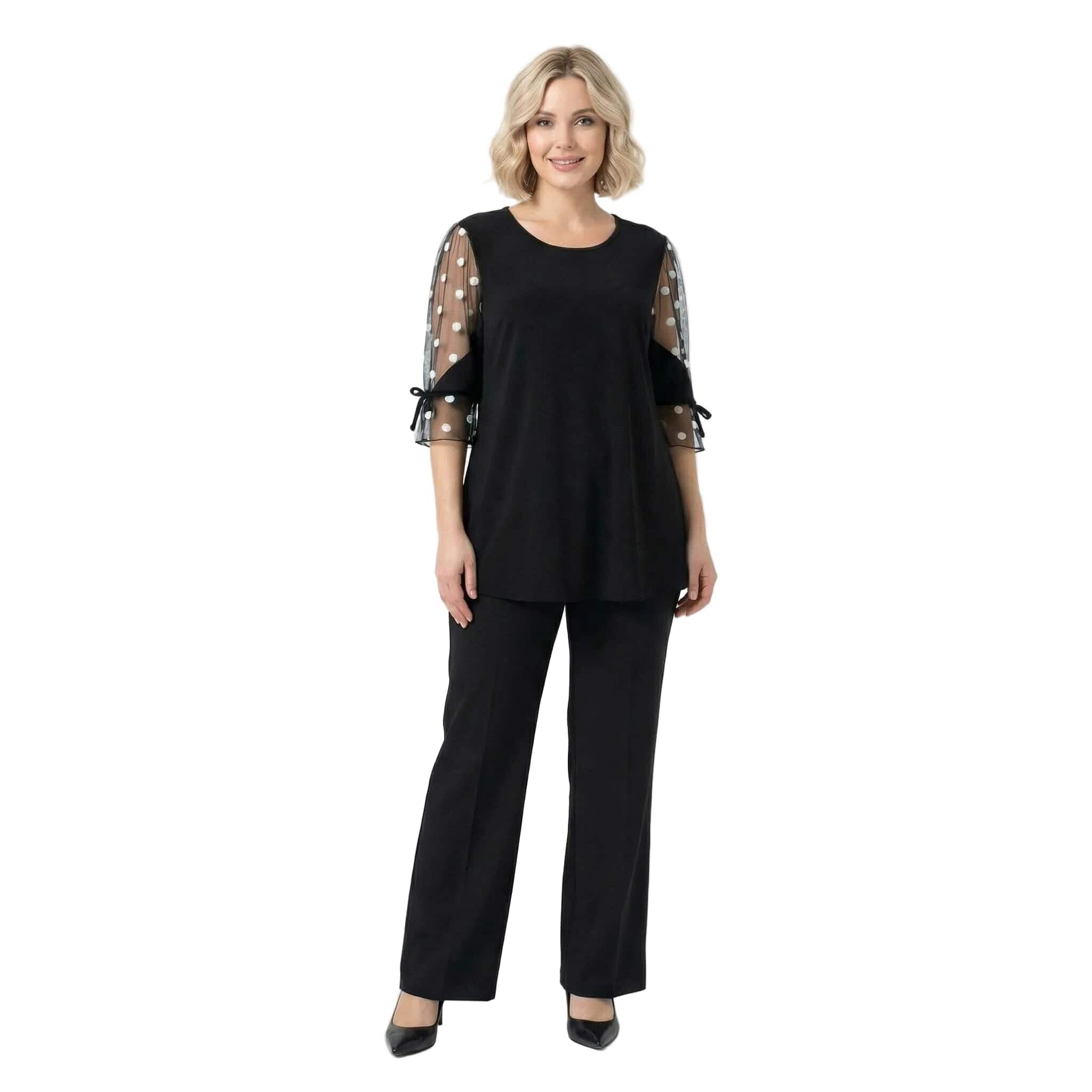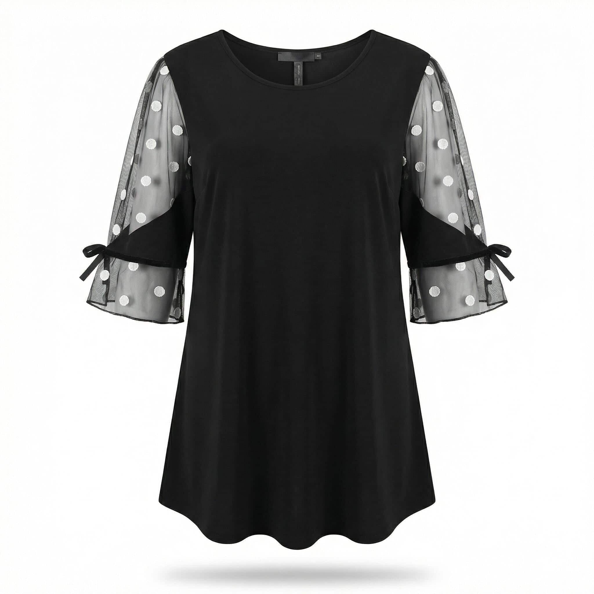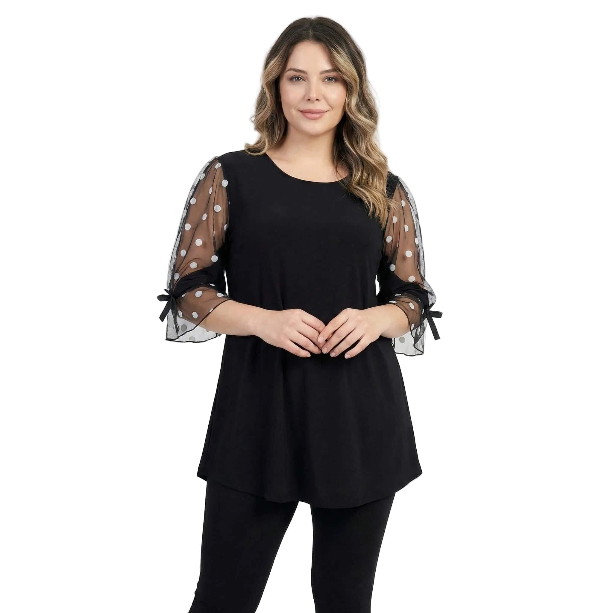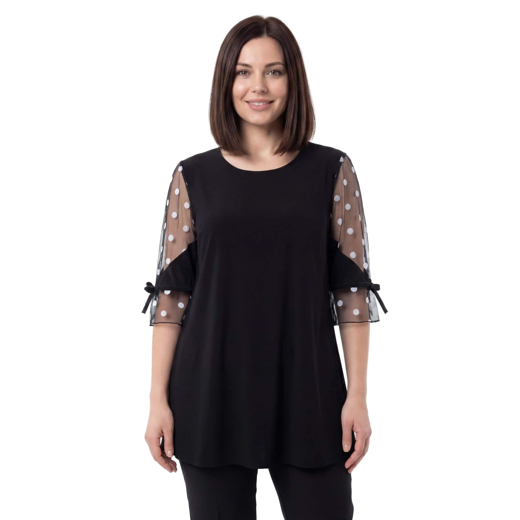 Официална черна туника големи размери с ефектен тюл на точки и панделка