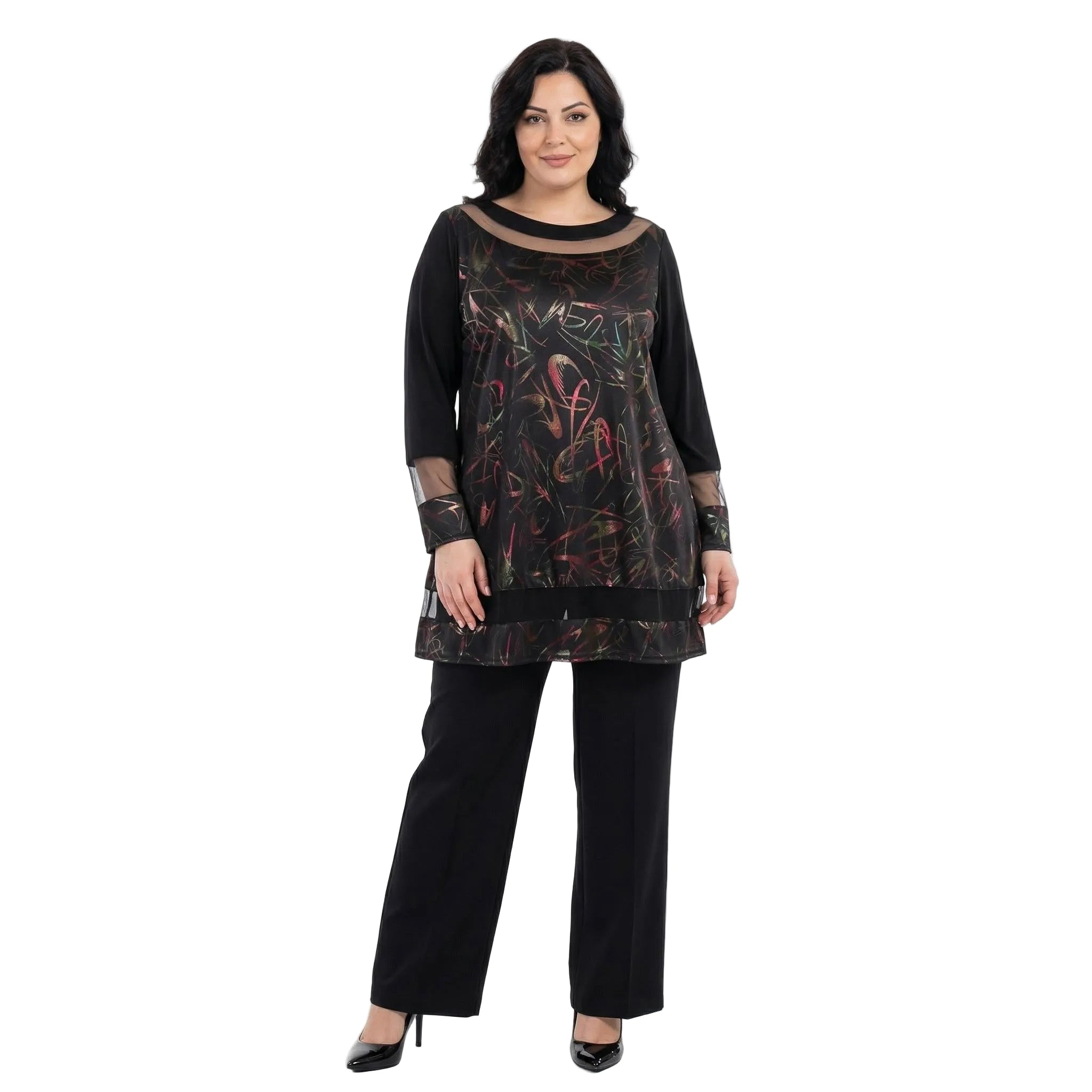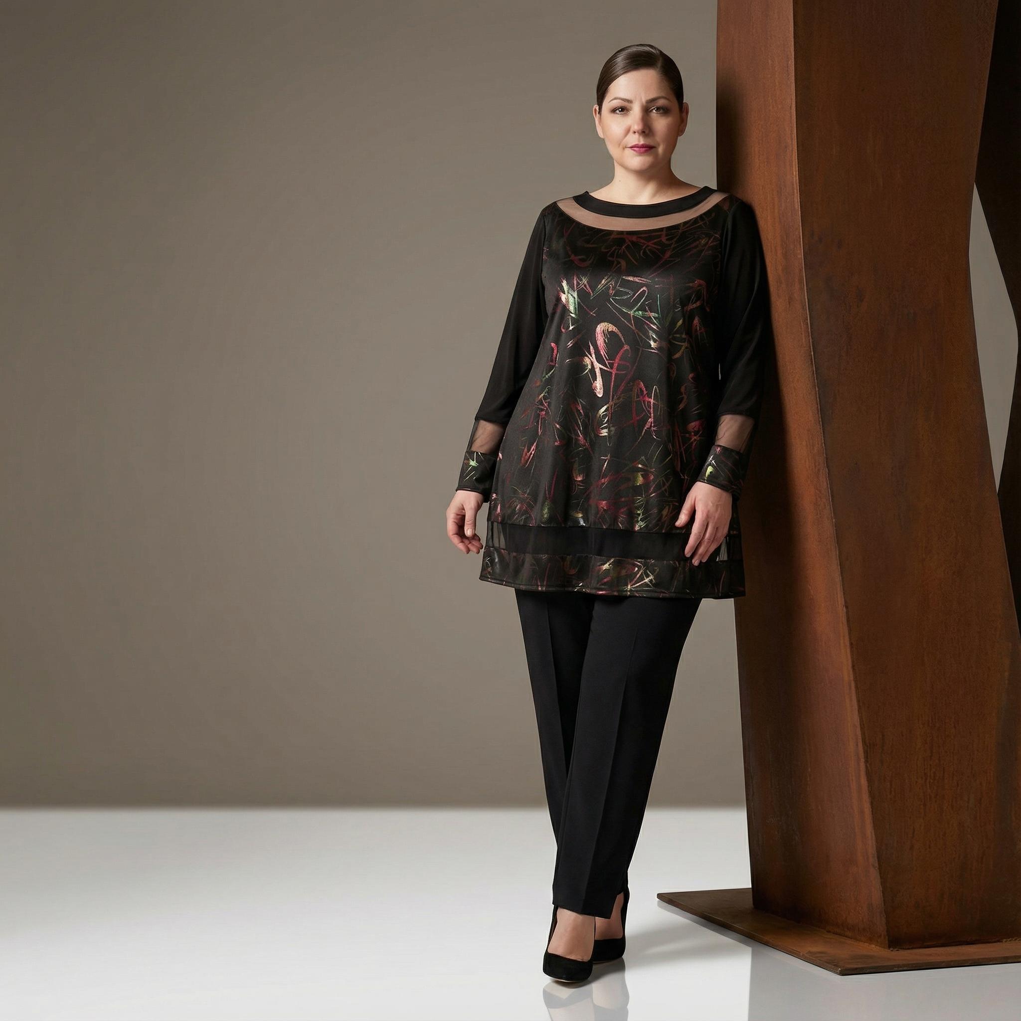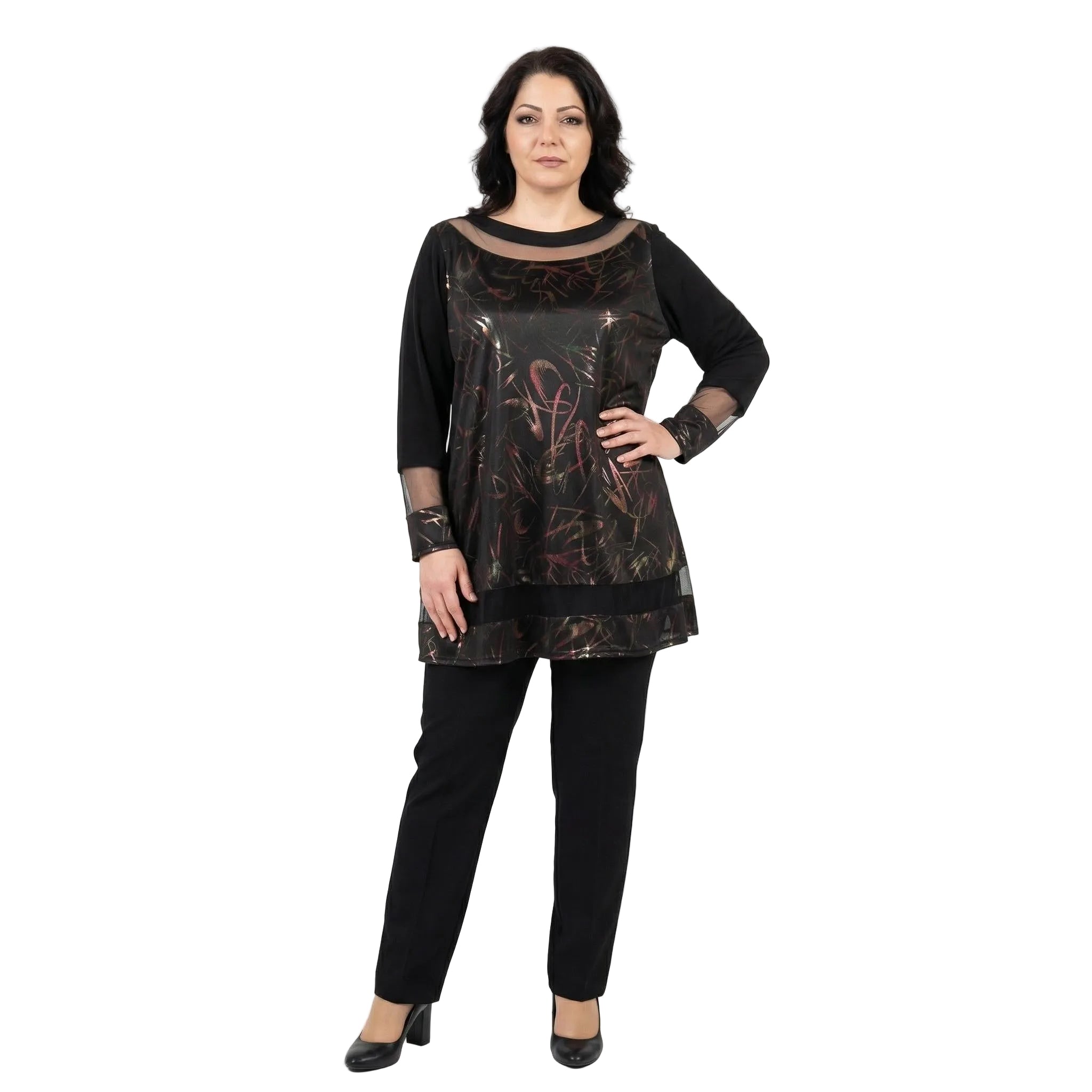 Заблестете със стил и увереност на всяко специално събитие. Тази изящна официална туника е създадена да подчертае красотата на макси дамата, съчетавайки класическата елегантност на черния цвят с модерни, дръзки акценти. Ефирното деколте от тюл добавя нотка загадъчност и женственост, докато прецизно разположените елементи от еко кожа придават структура и модерно излъчване.