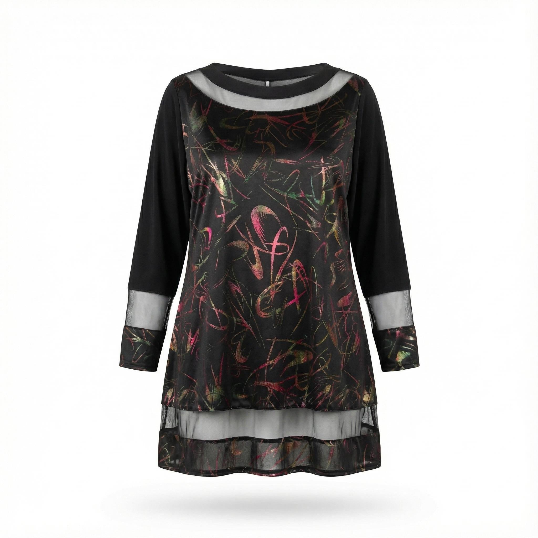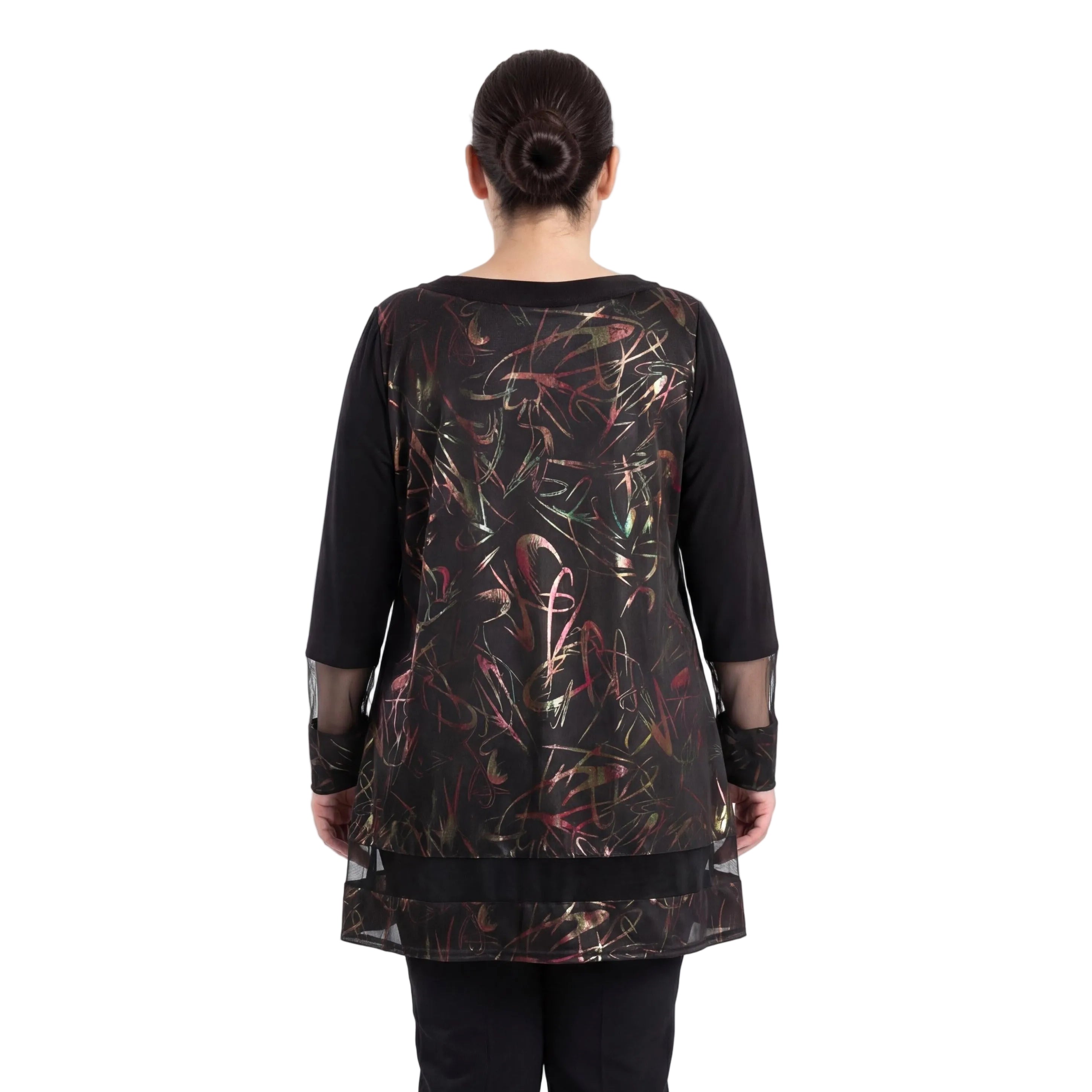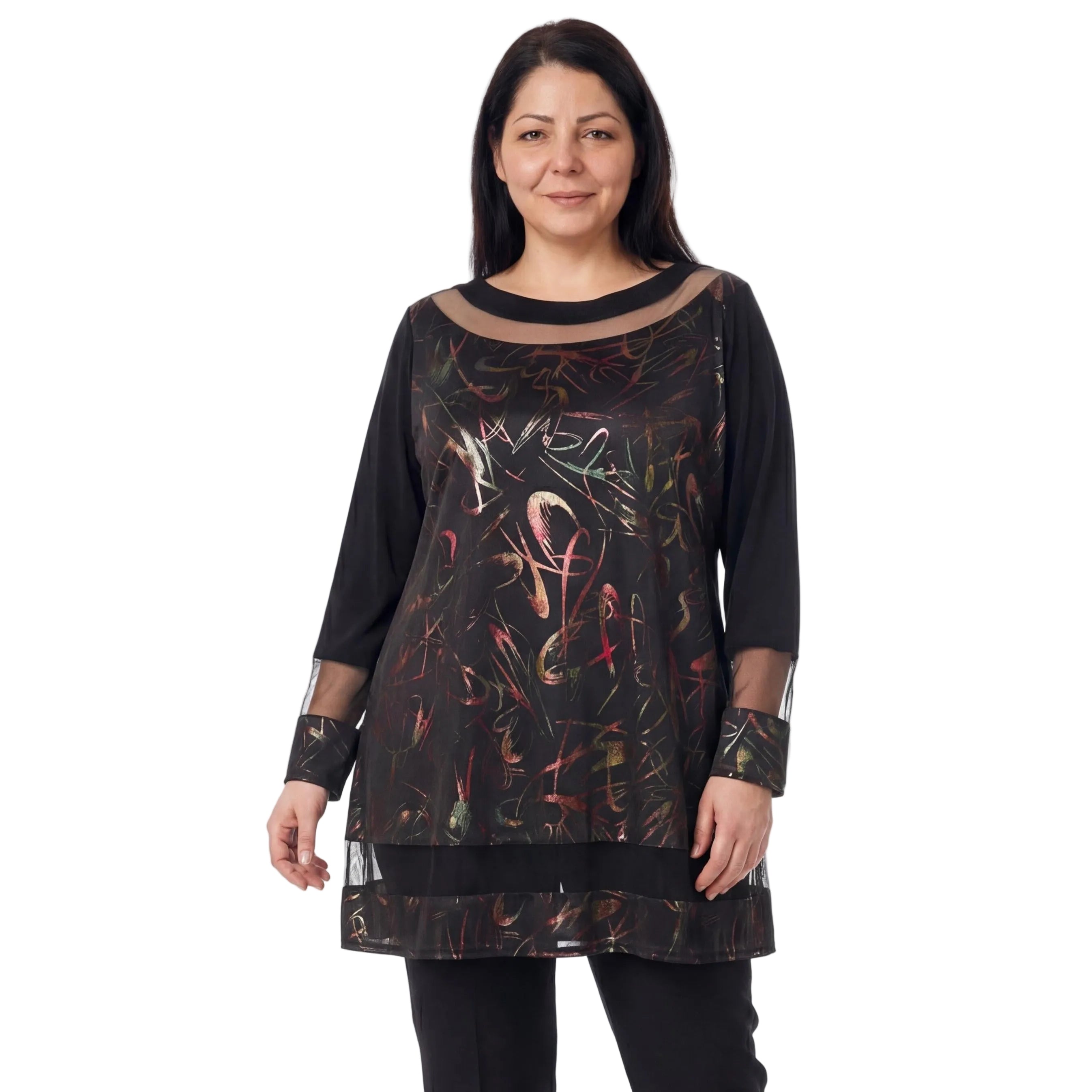 Заблестете със стил и увереност на всяко специално събитие. Тази изящна официална туника е създадена да подчертае красотата на макси дамата, съчетавайки класическата елегантност на черния цвят с модерни, дръзки акценти. Ефирното деколте от тюл добавя нотка загадъчност и женственост, докато прецизно разположените елементи от еко кожа придават структура и модерно излъчване.