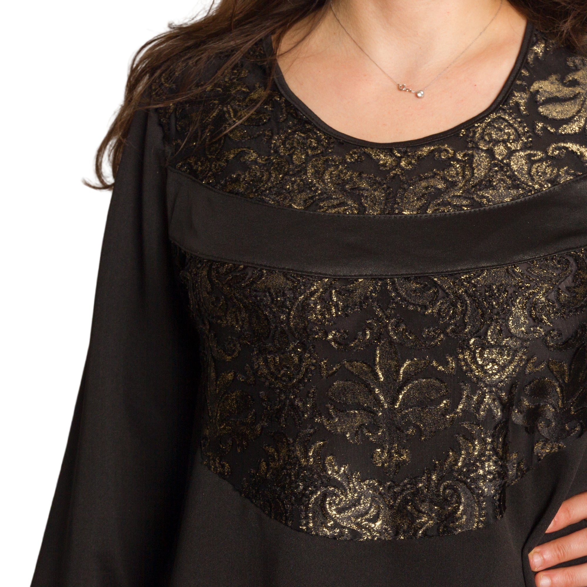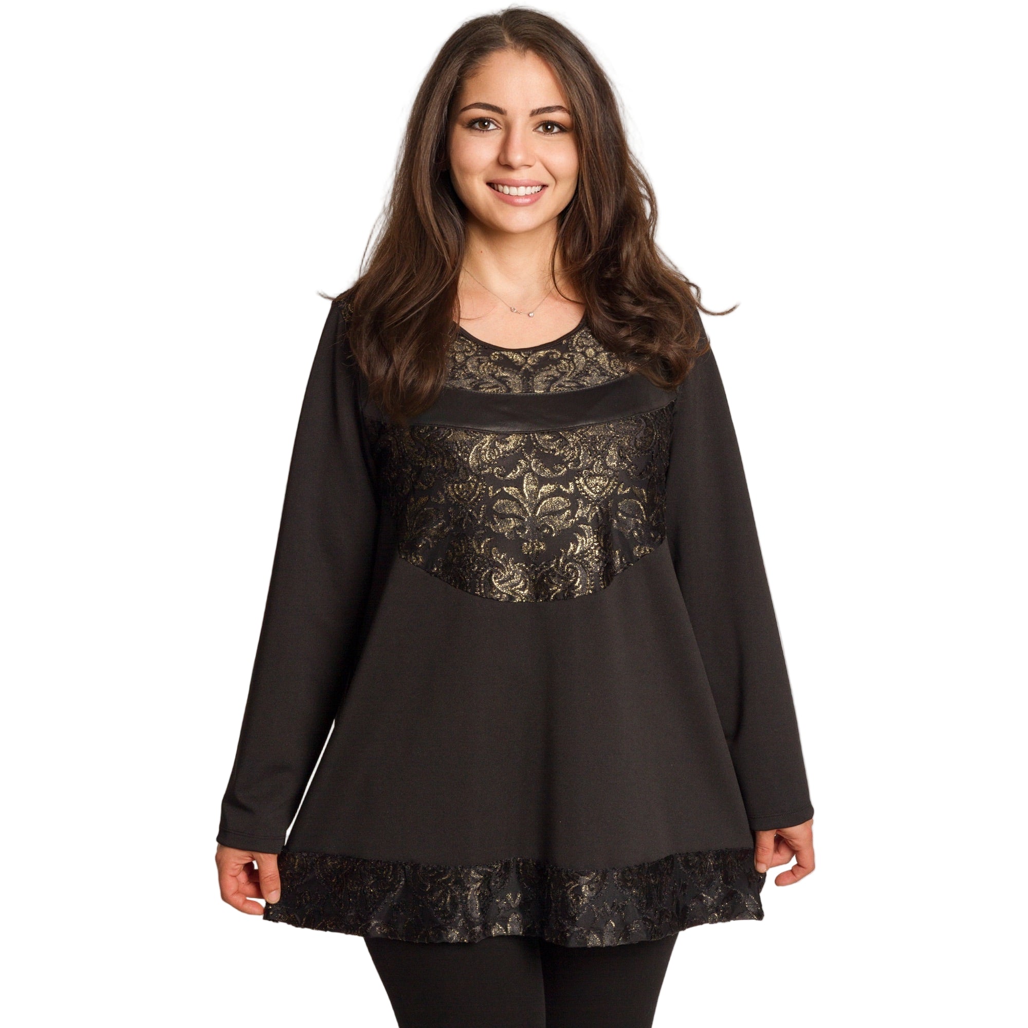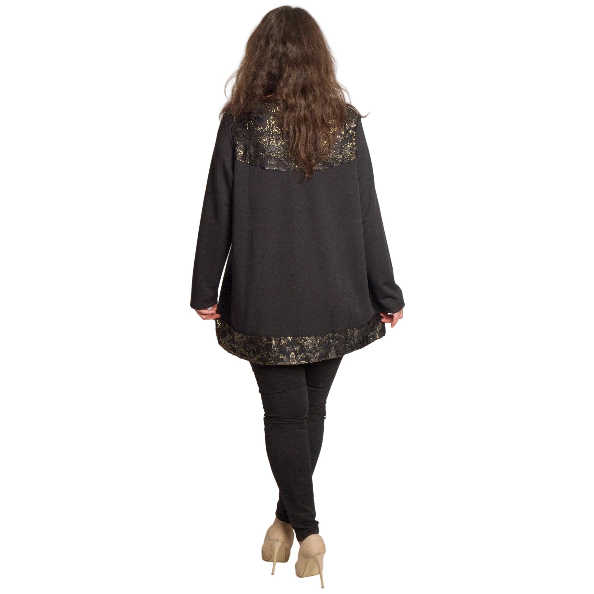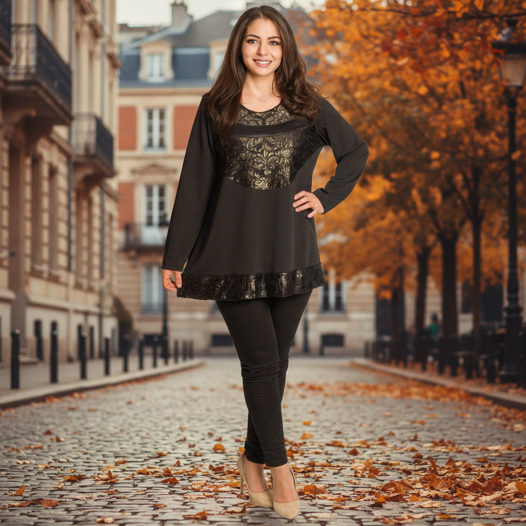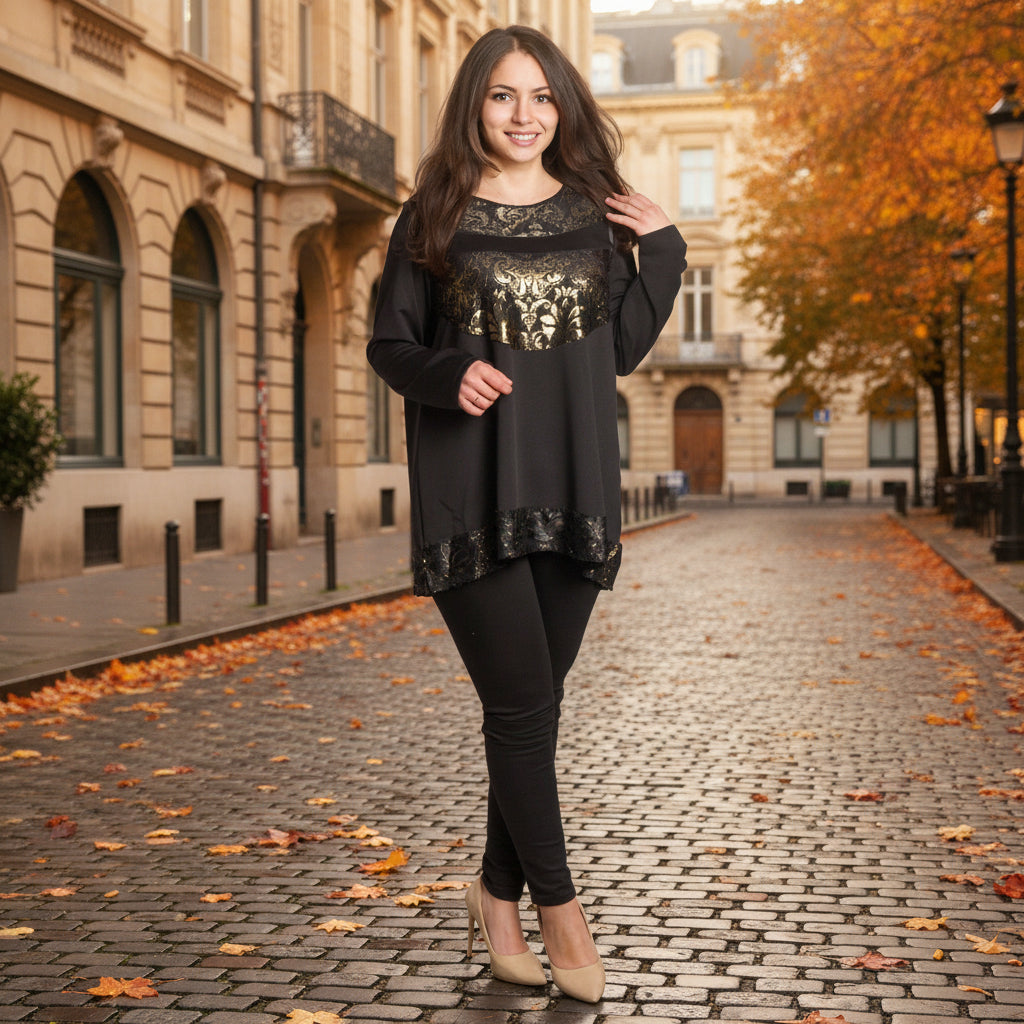 Туниката има обло деколте и дълги ръкави, а декоративните елементи в златисто придават блясък и изтънченост на визията. Подходяща е за специални поводи, празнични вечери и официални излизания през есенно-зимния сезон.