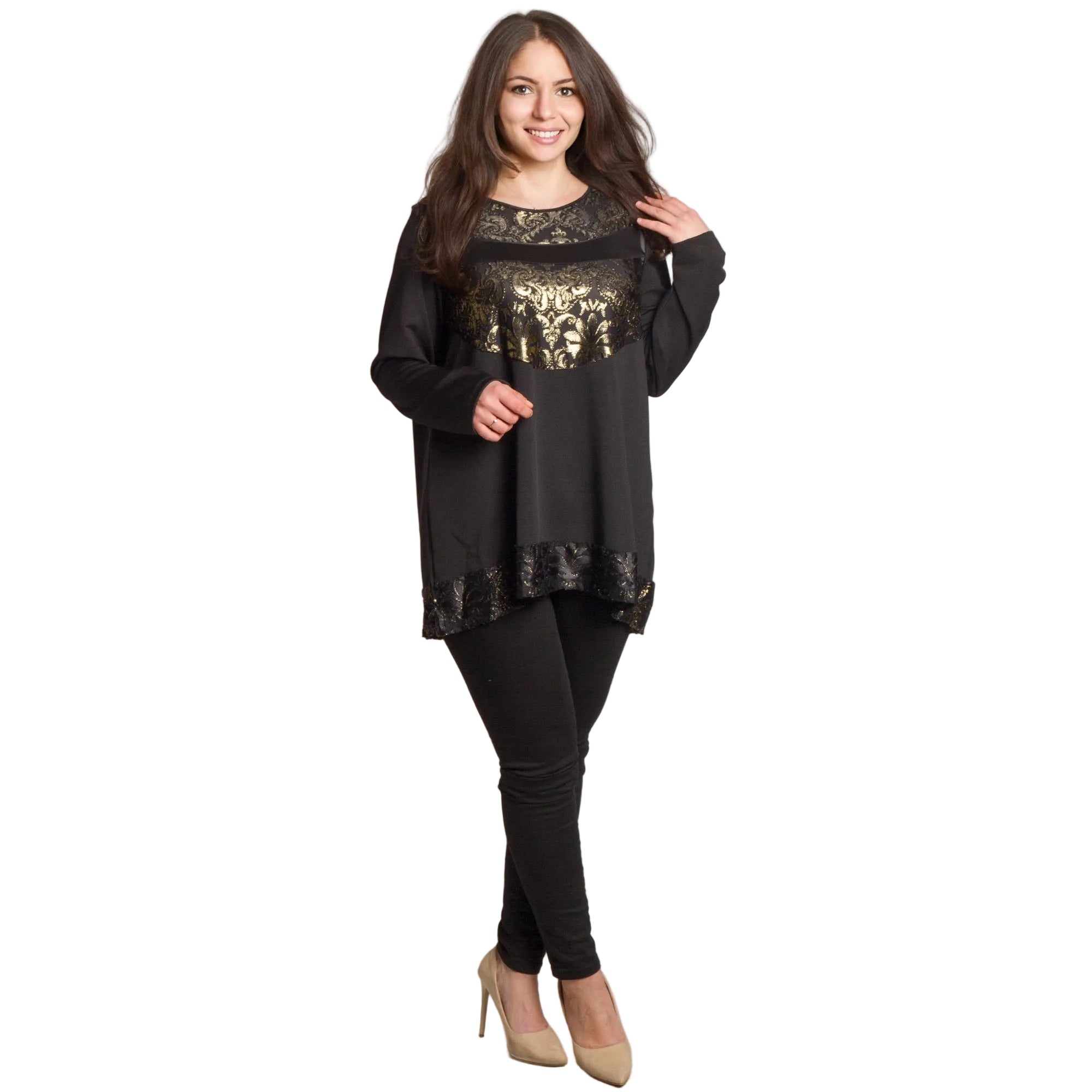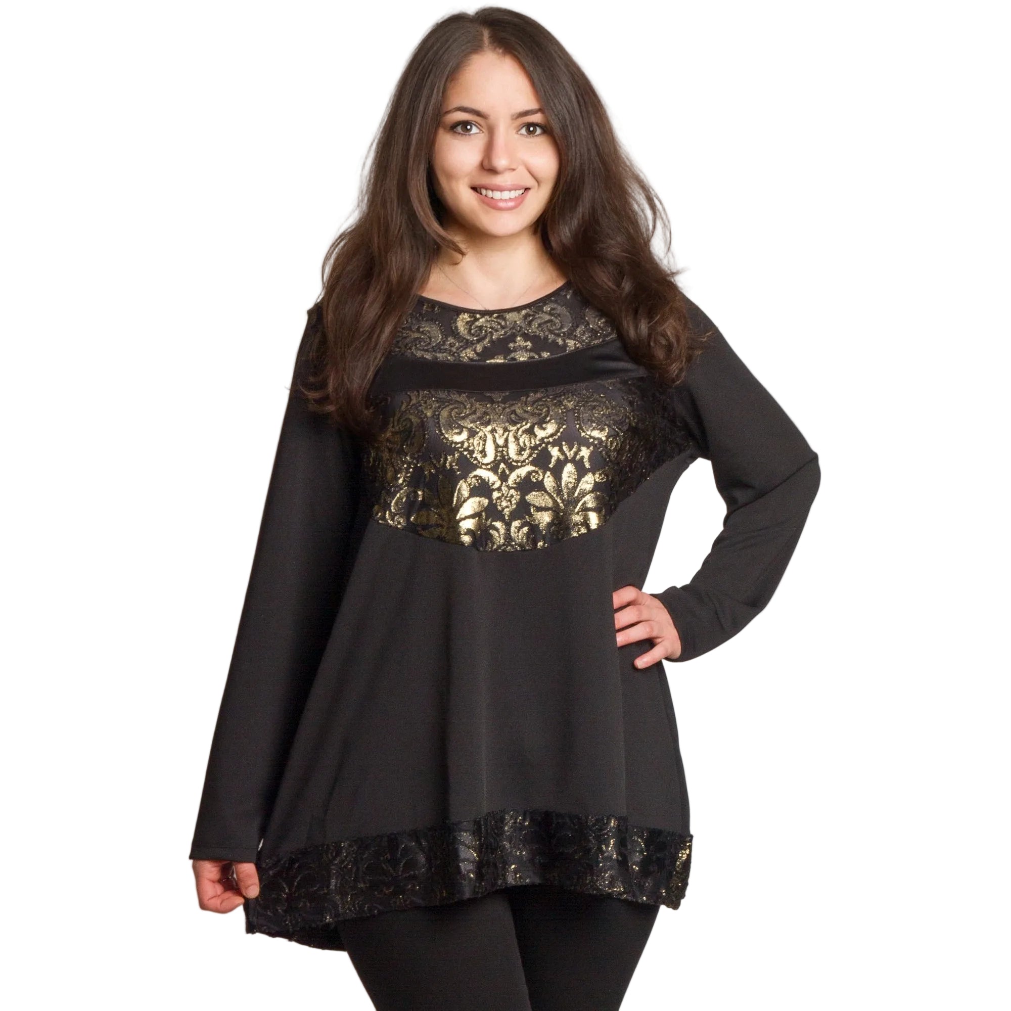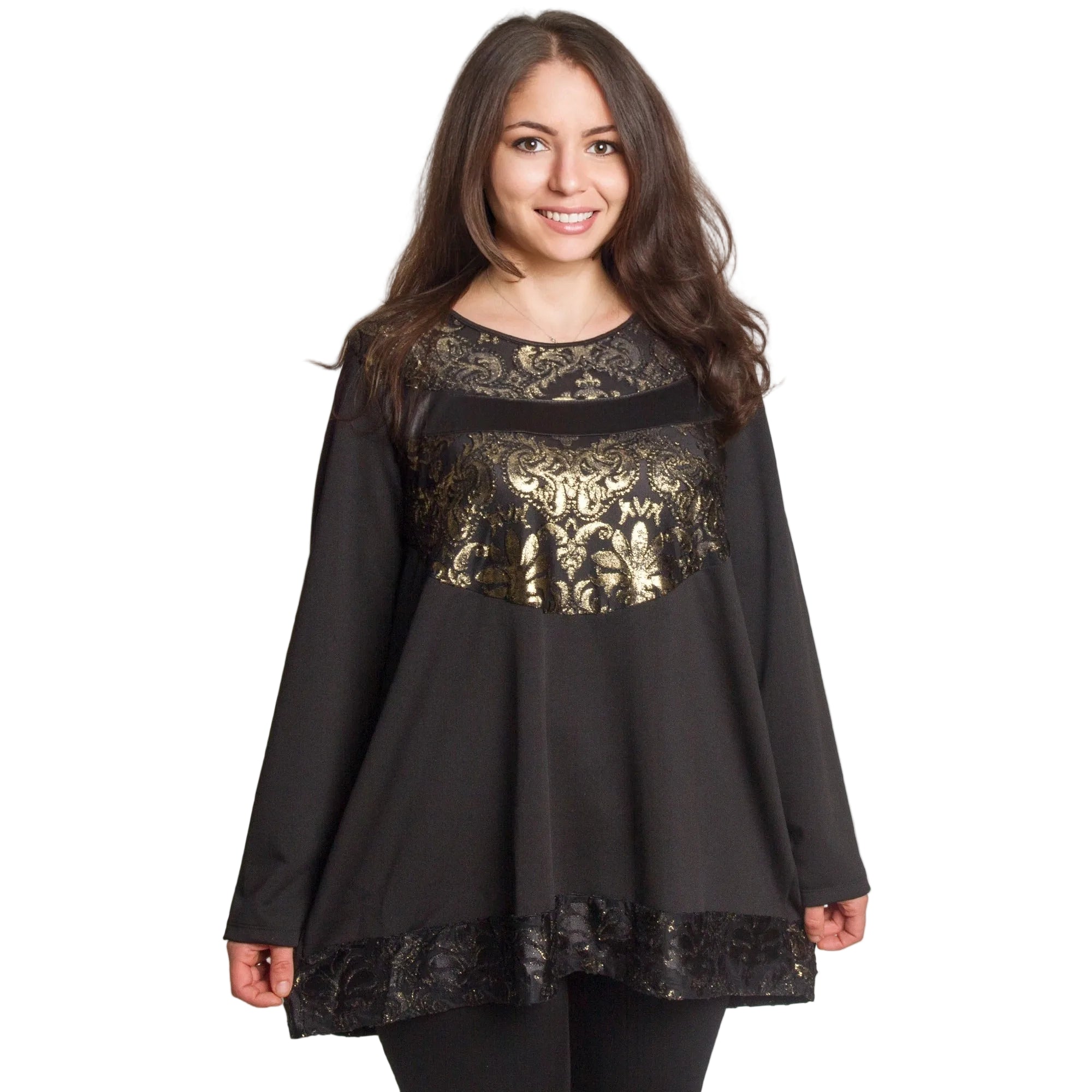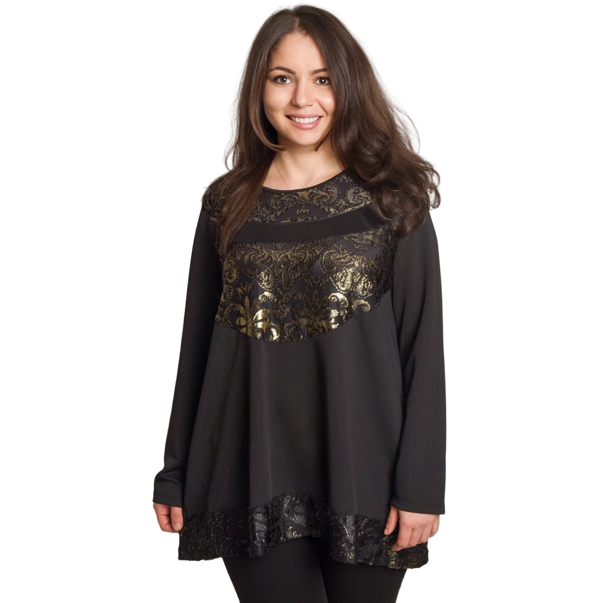 Туниката има обло деколте и дълги ръкави, а декоративните елементи в златисто придават блясък и изтънченост на визията. Подходяща е за специални поводи, празнични вечери и официални излизания през есенно-зимния сезон.
