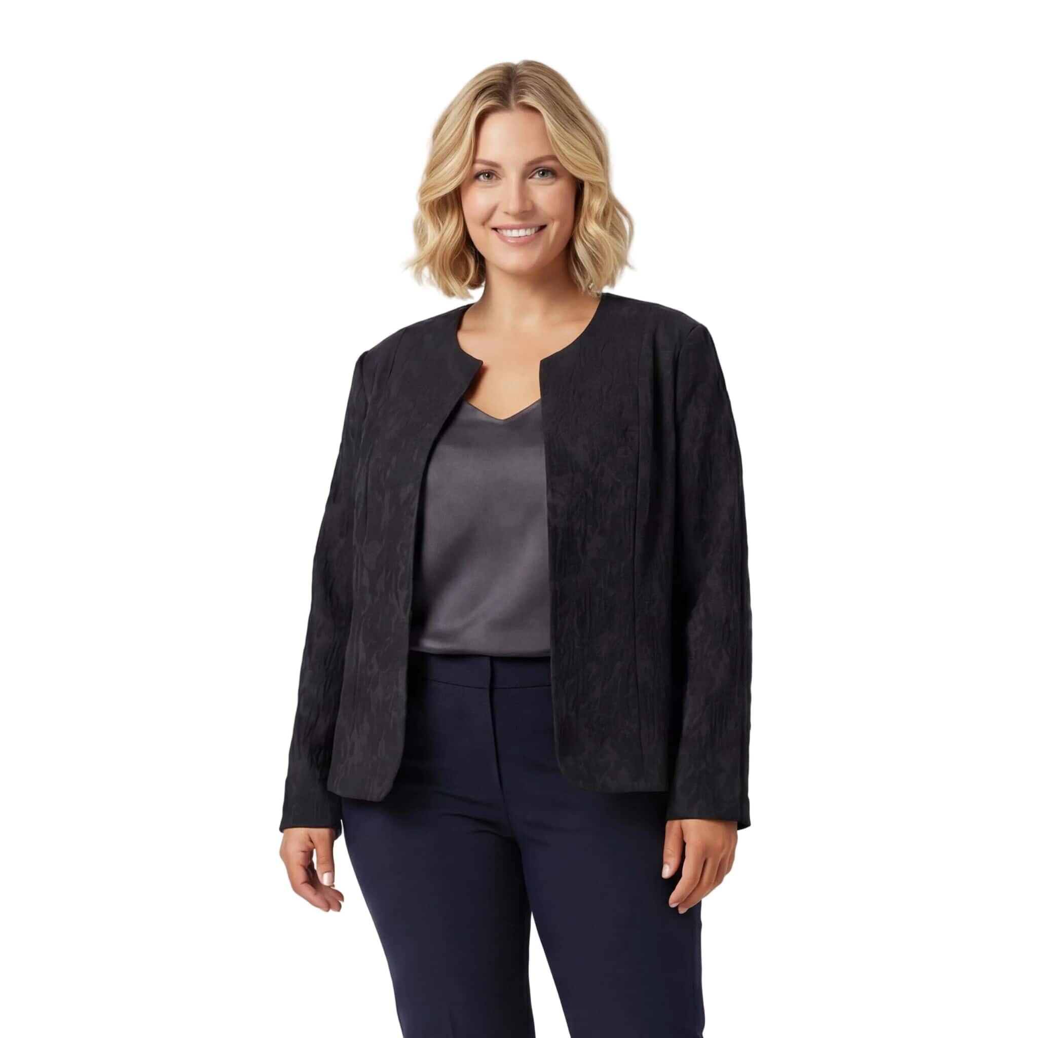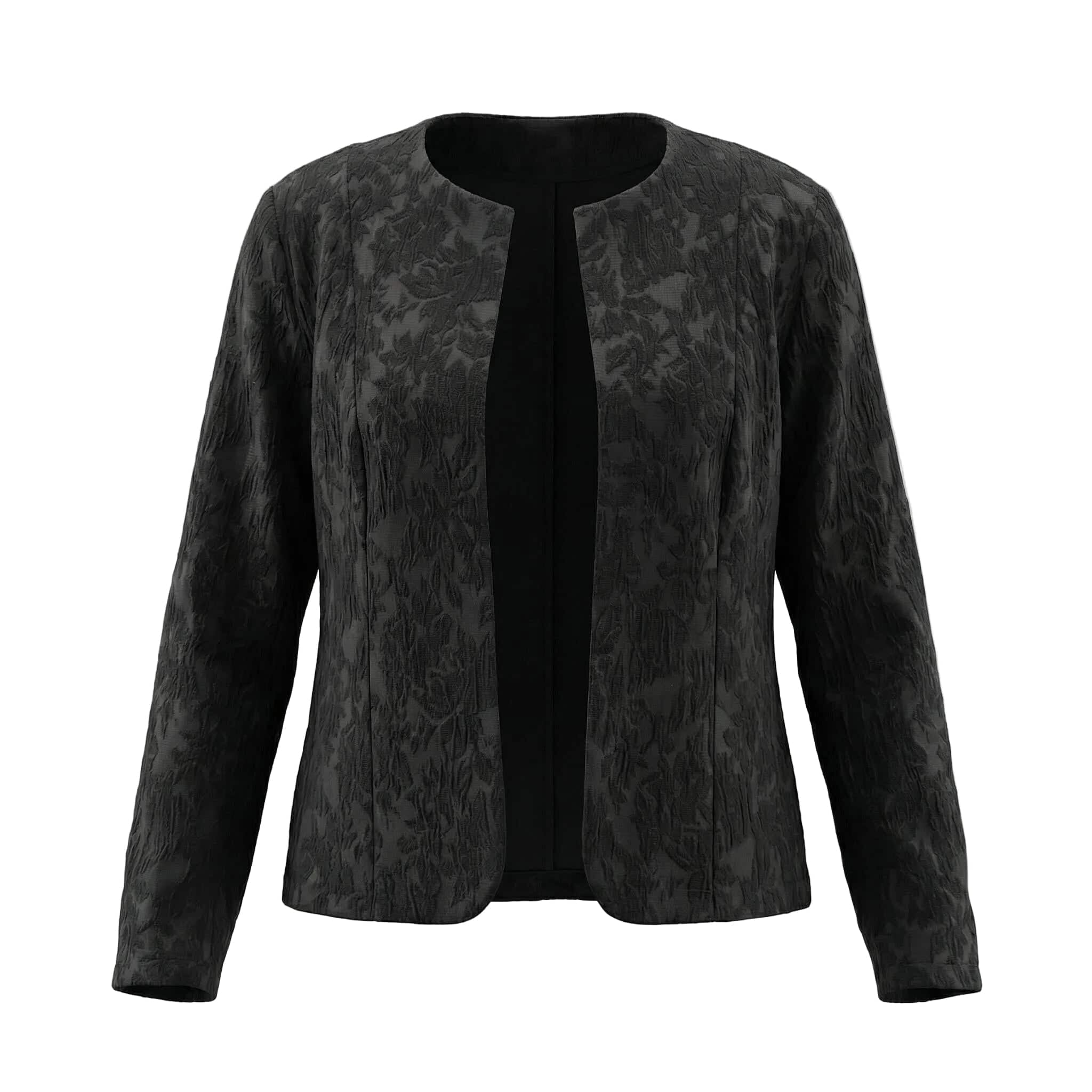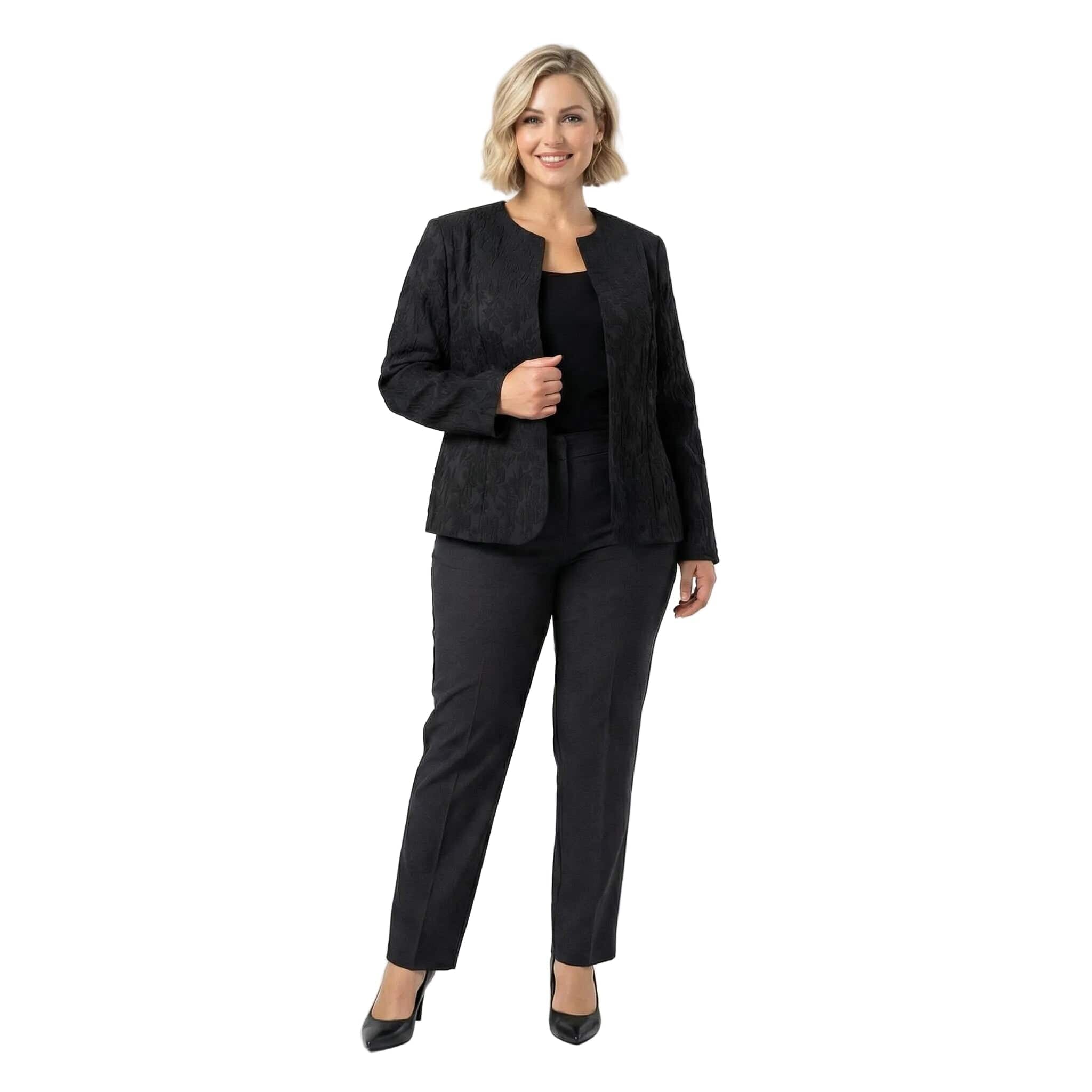 Добавете нотка изтънченост към своя гардероб с това елегантно дамско сако в класически черен цвят, създадено специално за дами с извивки. Моделът се отличава с красив, релефен плат, който придава дълбочина и луксозно излъчване на визията. Кройката е права и свободна, без закопчаване, което осигурява безупречен комфорт и позволява на дрехата да пада тежко и стилно. Еластичната материя гарантира удобство при движение, превръщайки това сако в перфектния избор за всеки официален повод, делова среща или вечерно събитие през есенно-зимния сезон. Съчетава се лесно както с панталони, така и с поли, за да се чувствате уверени и неотразими.