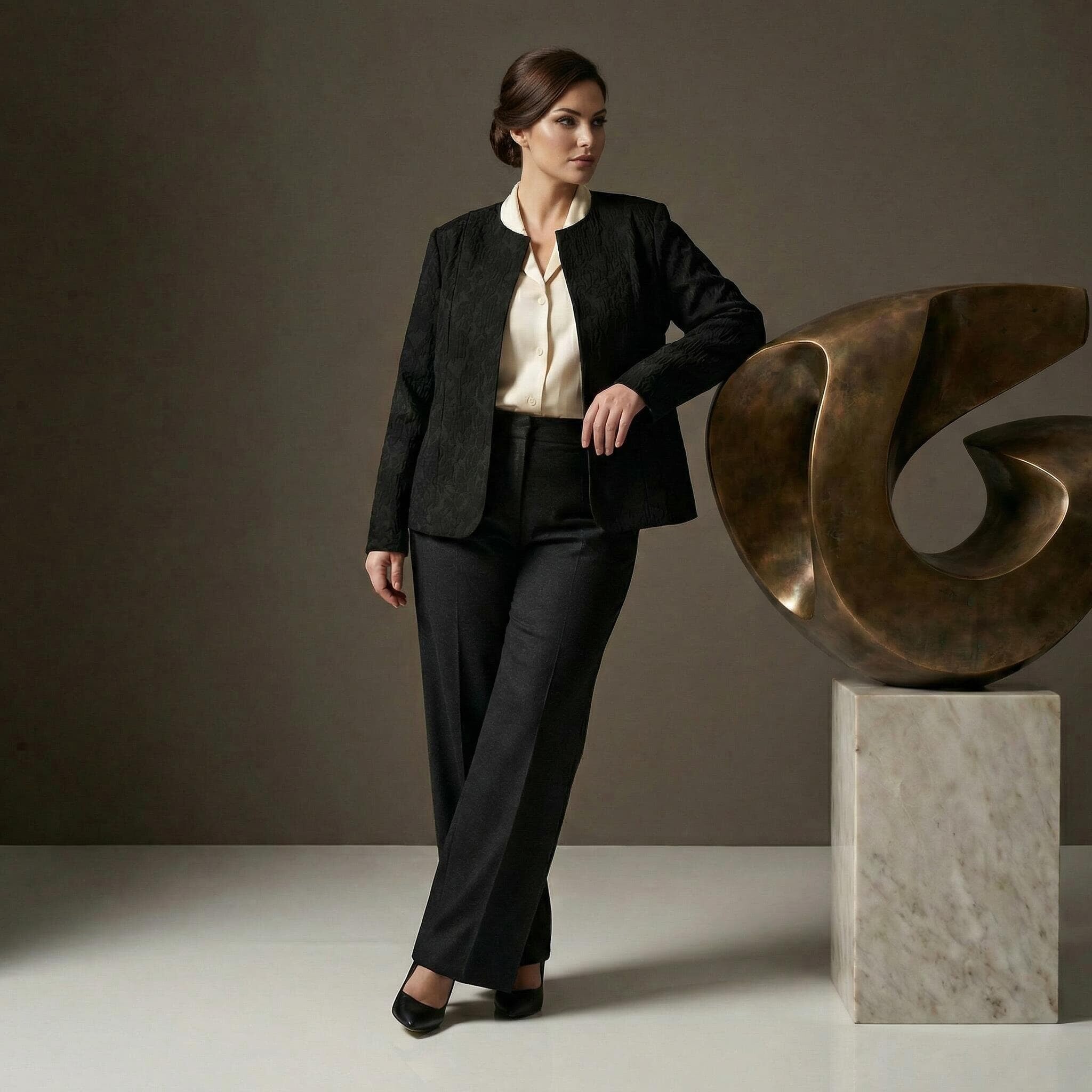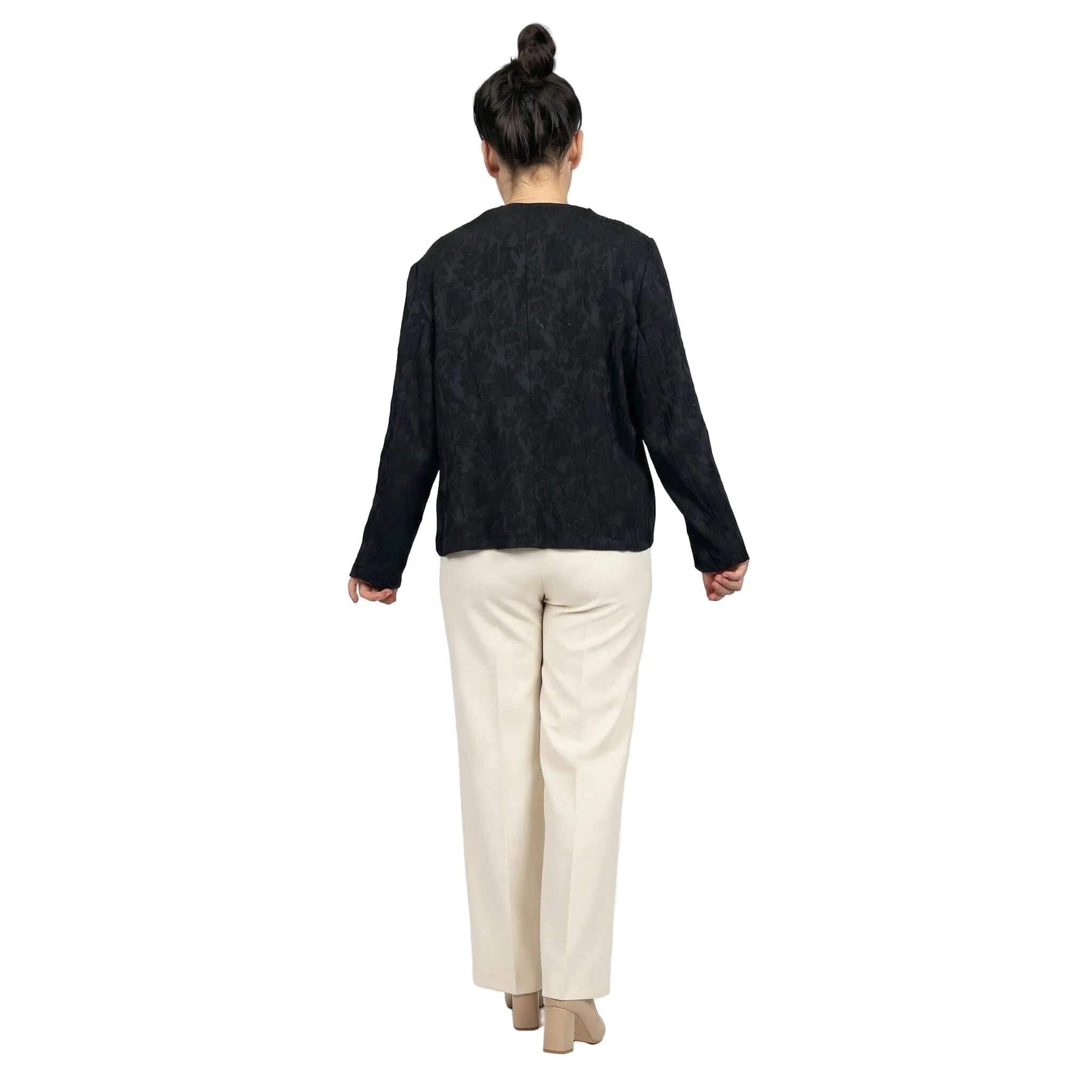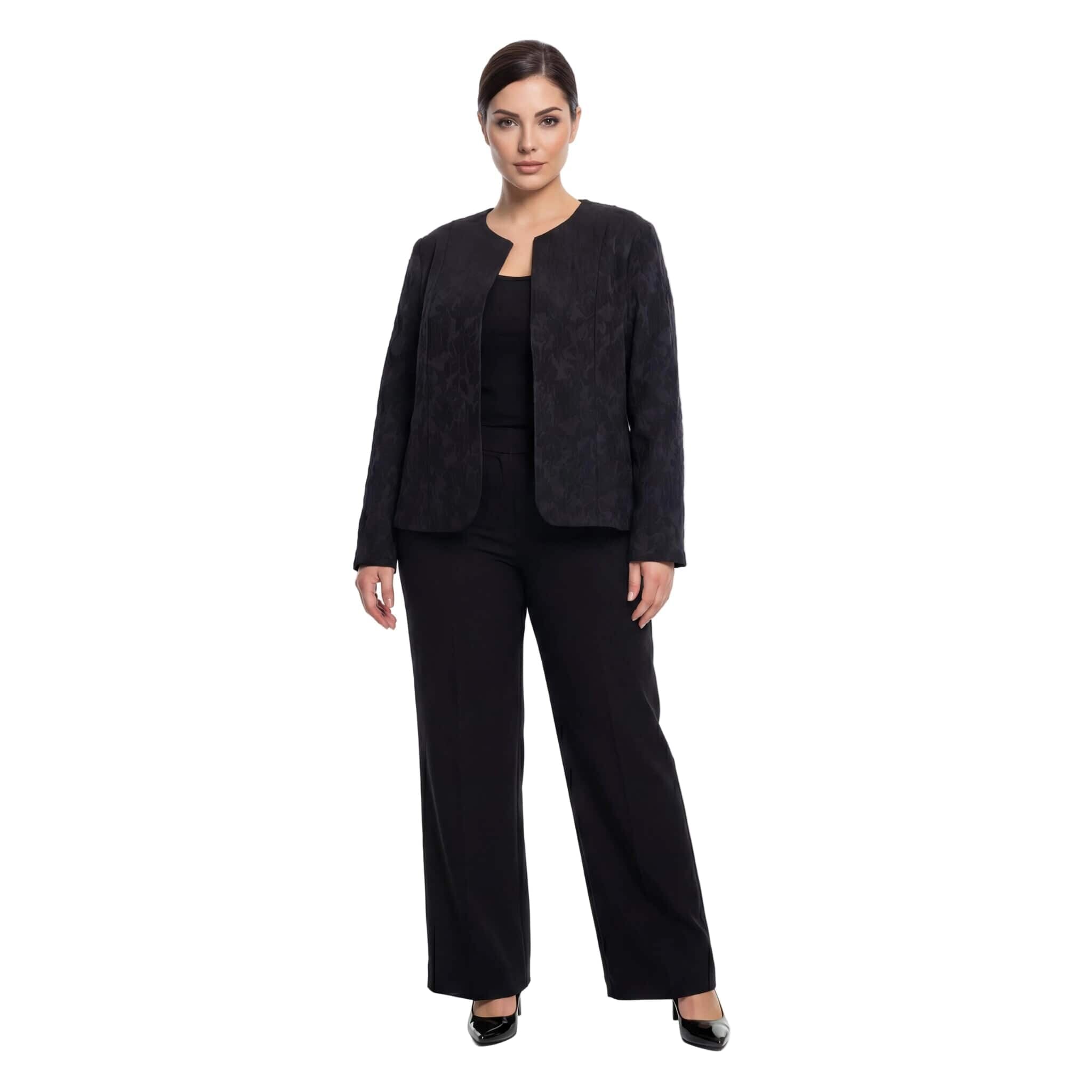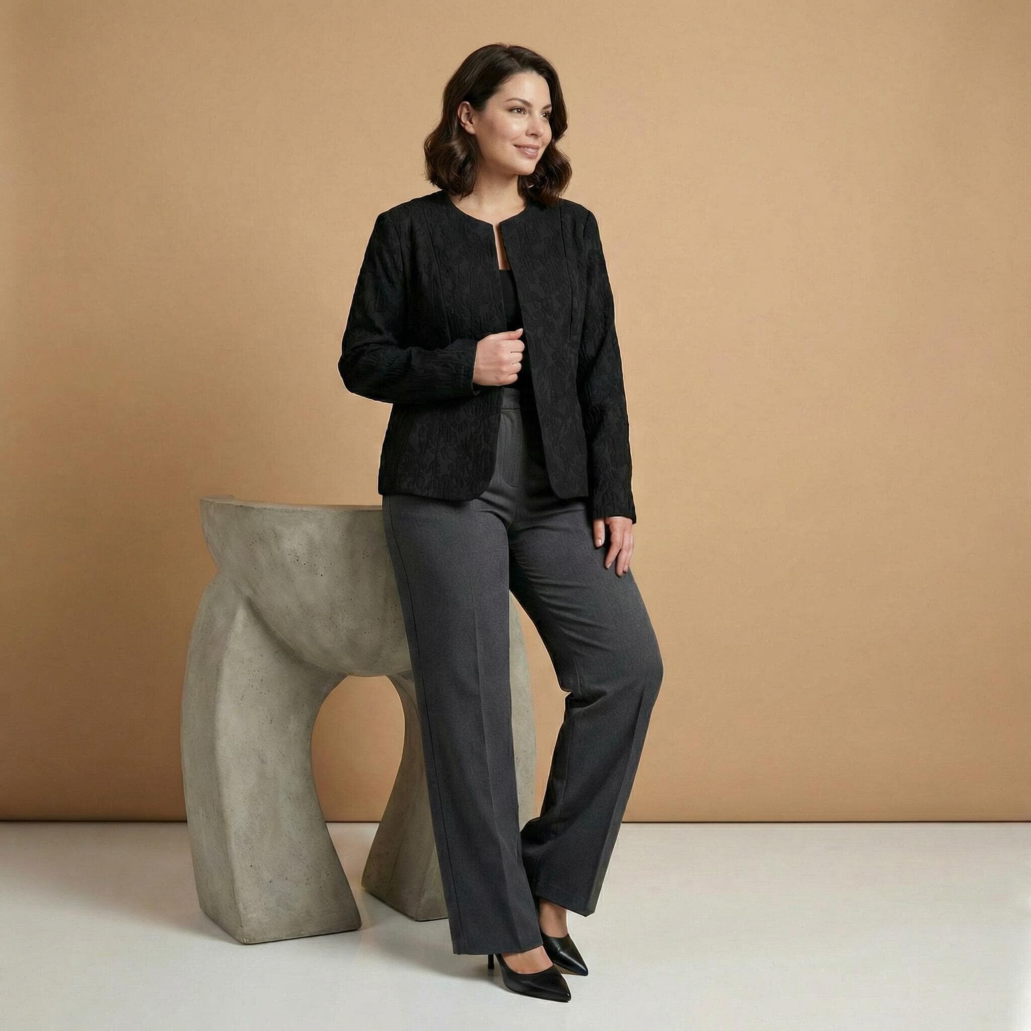 Добавете нотка изтънченост към своя гардероб с това елегантно дамско сако в класически черен цвят, създадено специално за дами с извивки. Моделът се отличава с красив, релефен плат, който придава дълбочина и луксозно излъчване на визията. Кройката е права и свободна, без закопчаване, което осигурява безупречен комфорт и позволява на дрехата да пада тежко и стилно. Еластичната материя гарантира удобство при движение, превръщайки това сако в перфектния избор за всеки официален повод, делова среща или вечерно събитие през есенно-зимния сезон. Съчетава се лесно както с панталони, така и с поли, за да се чувствате уверени и неотразими.