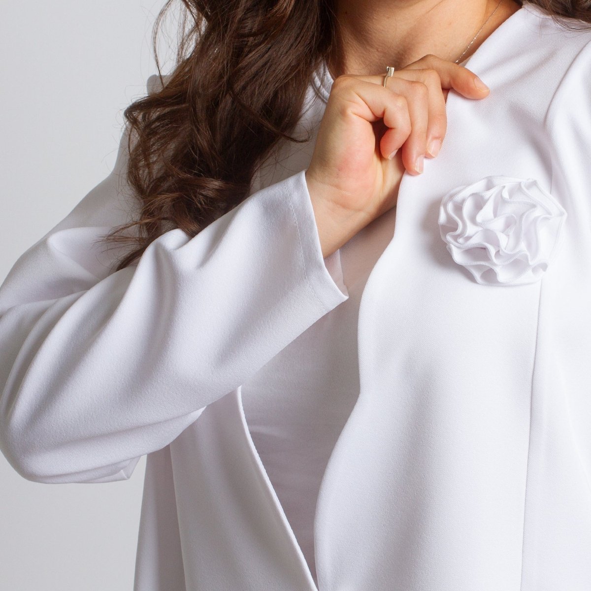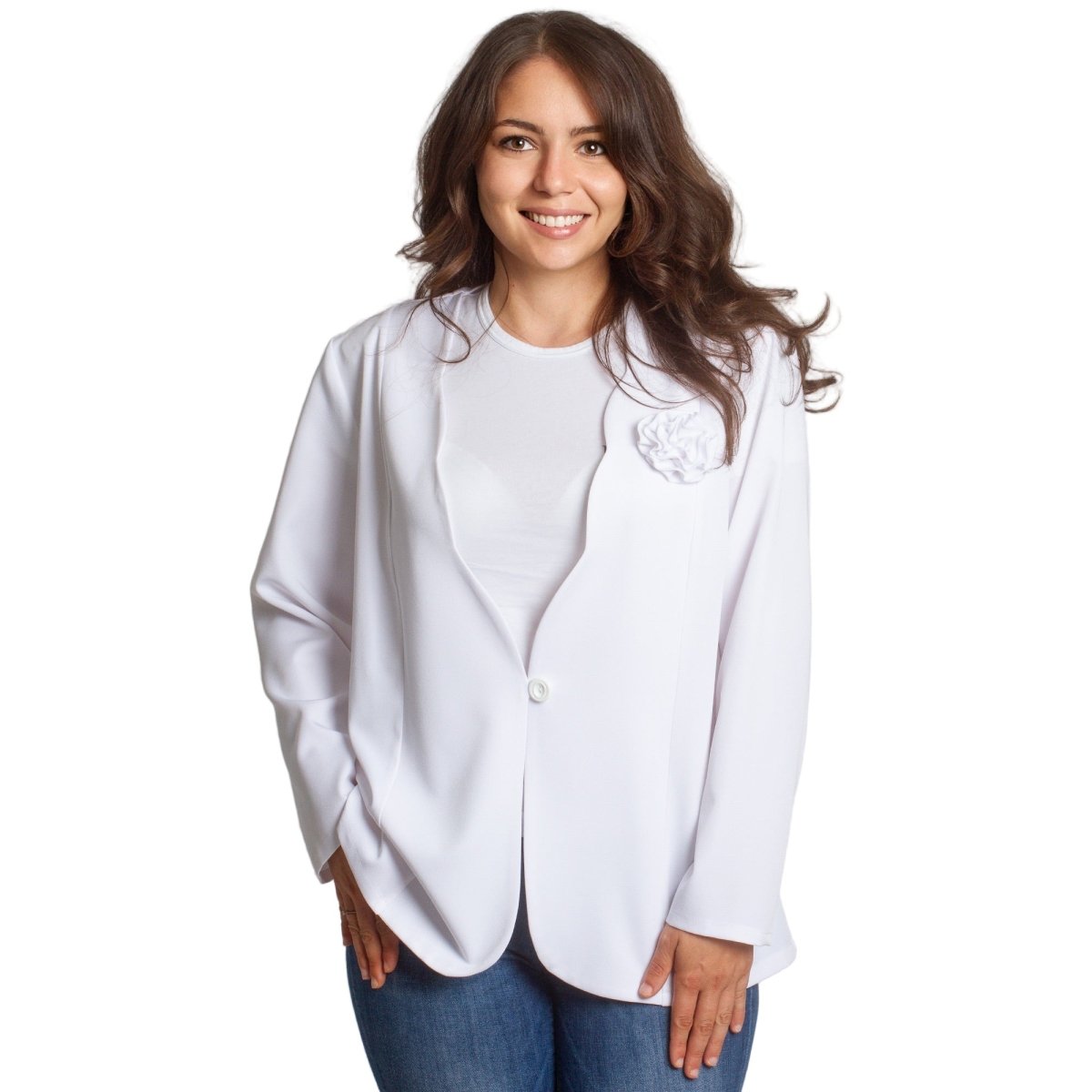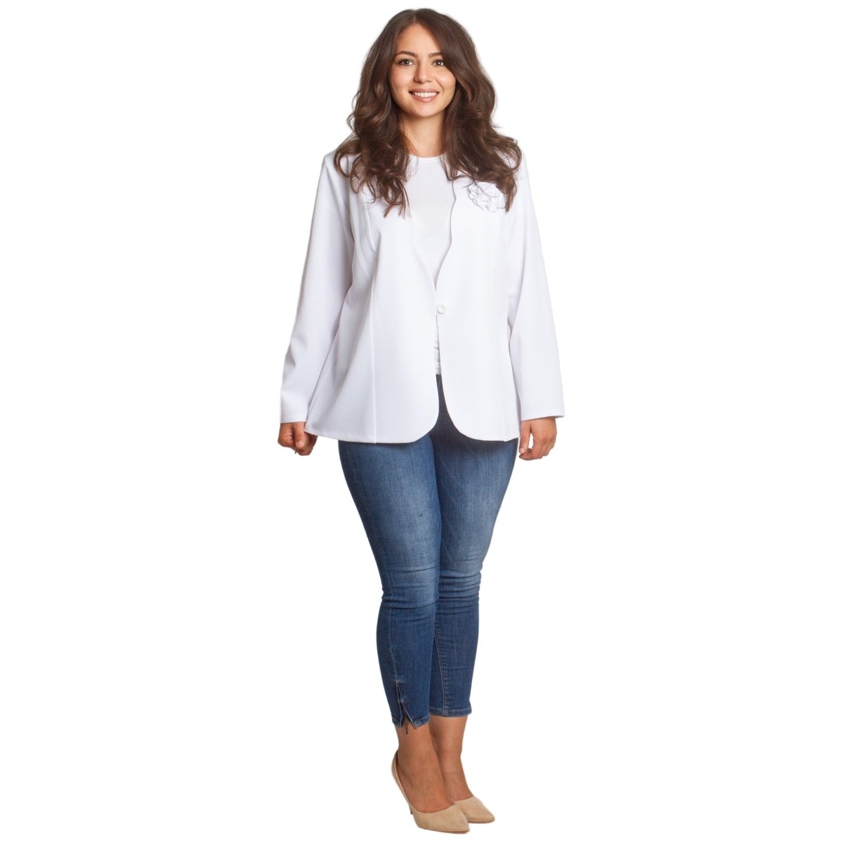 Стилно бяло сако в големи размери, което съчетава елегантност и комфорт. Изработено е от мека и еластична материя (95% вискоза, 5% еластан), която осигурява свобода на движенията и удобство при носене. Сакото е с права кройка, дълги ръкави и едноредово закопчаване с копче. Декоративното цвете на ревера придава свеж и изискан акцент, който подчертава женствеността. Подходящо е за официални поводи, бизнес срещи или празнични събития през есенно-зимния сезон.
