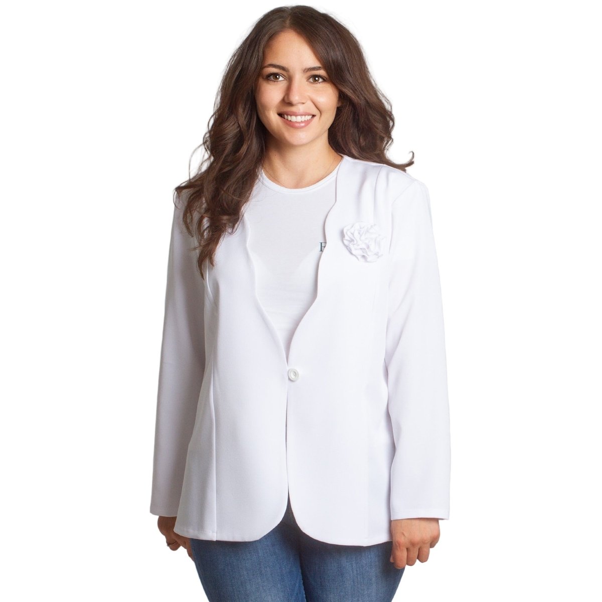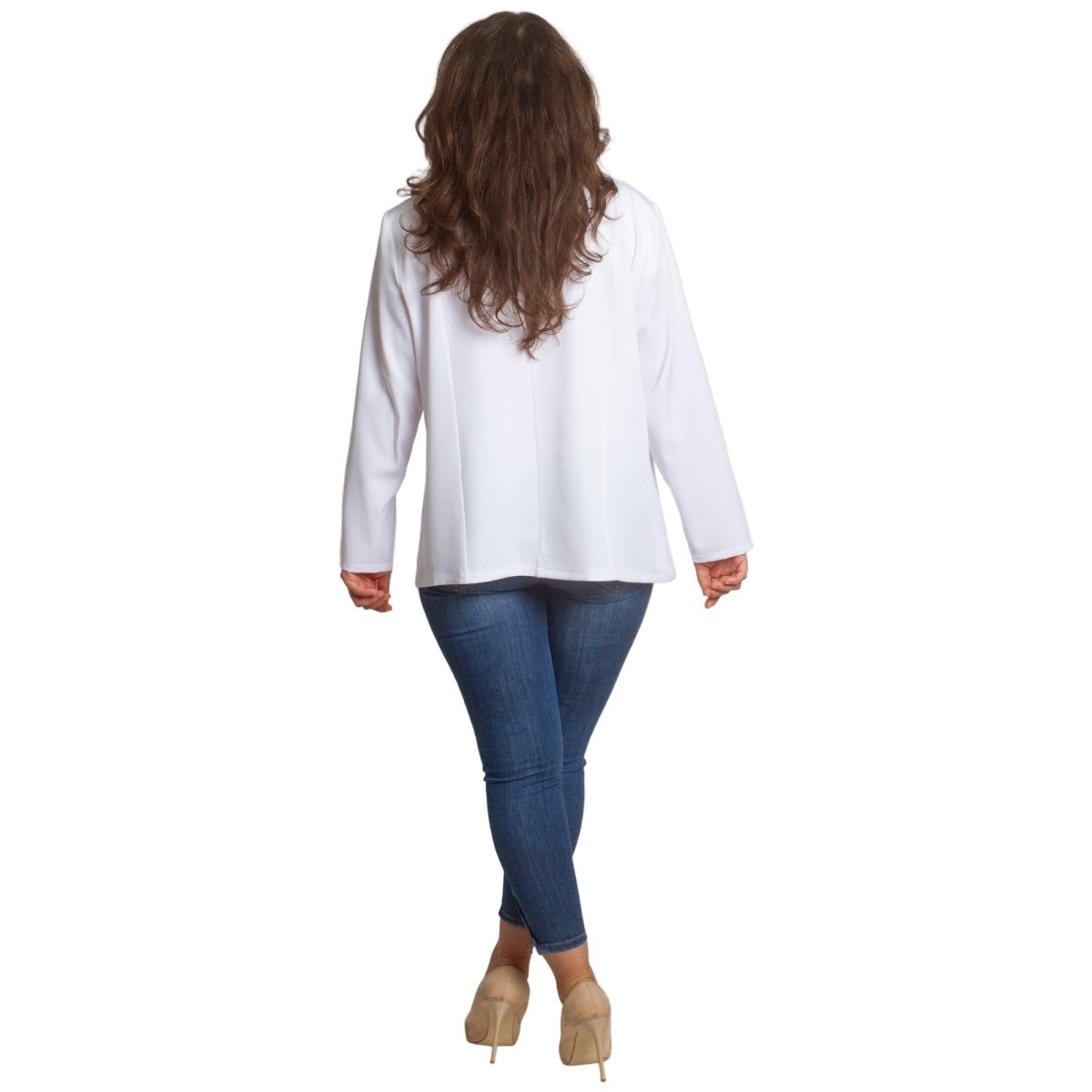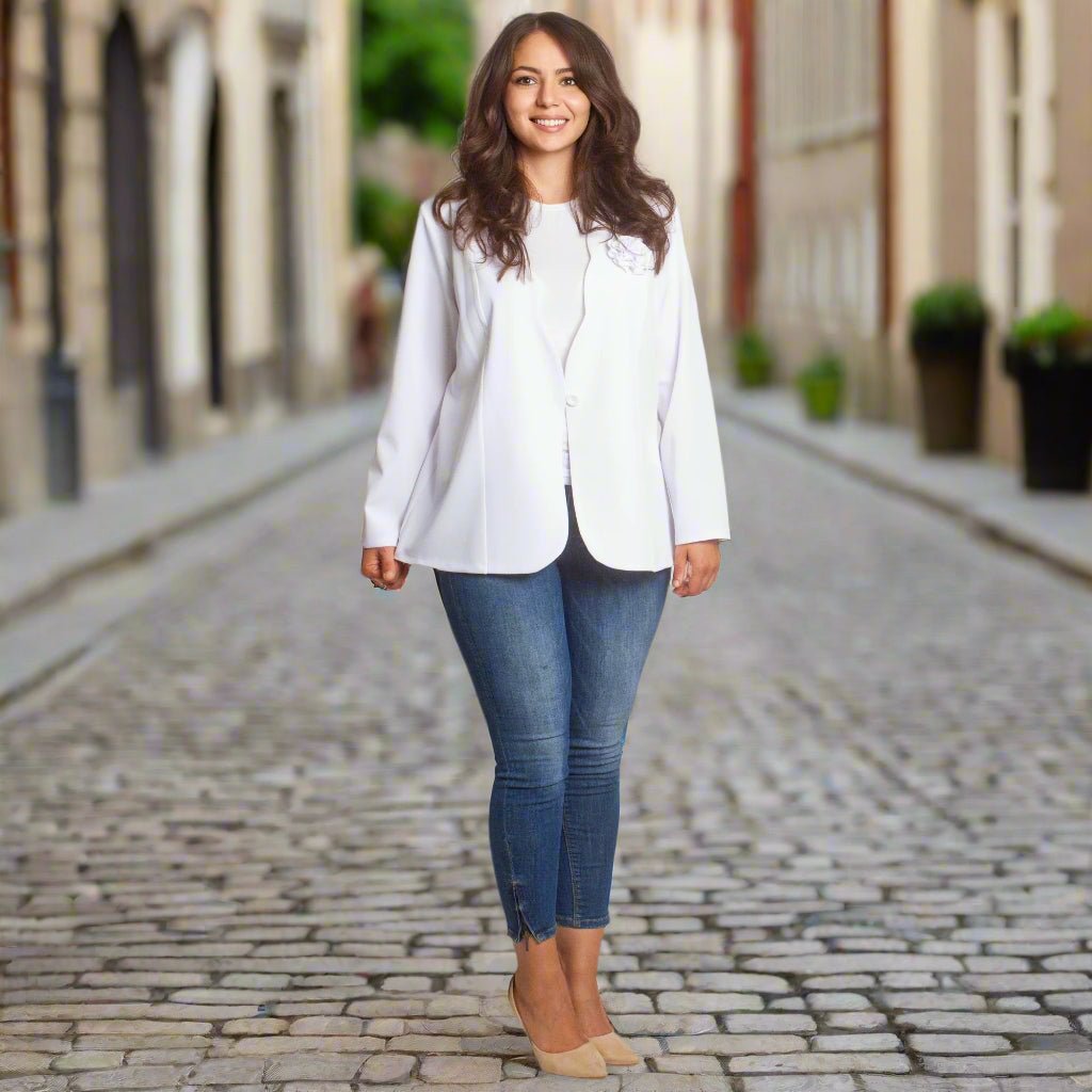 Стилно бяло сако в големи размери, което съчетава елегантност и комфорт. Изработено е от мека и еластична материя (95% вискоза, 5% еластан), която осигурява свобода на движенията и удобство при носене. Сакото е с права кройка, дълги ръкави и едноредово закопчаване с копче. Декоративното цвете на ревера придава свеж и изискан акцент, който подчертава женствеността. Подходящо е за официални поводи, бизнес срещи или празнични събития през есенно-зимния сезон.