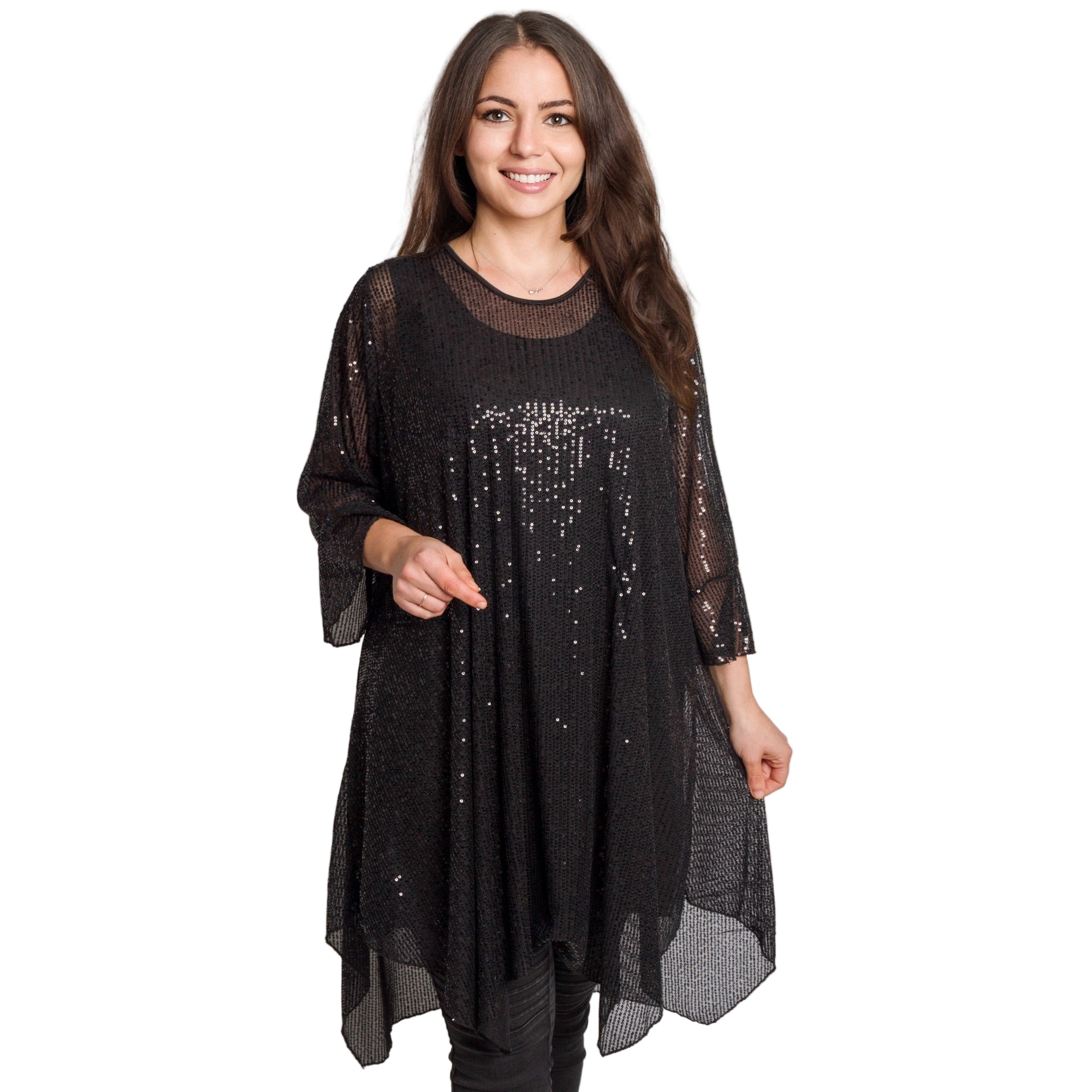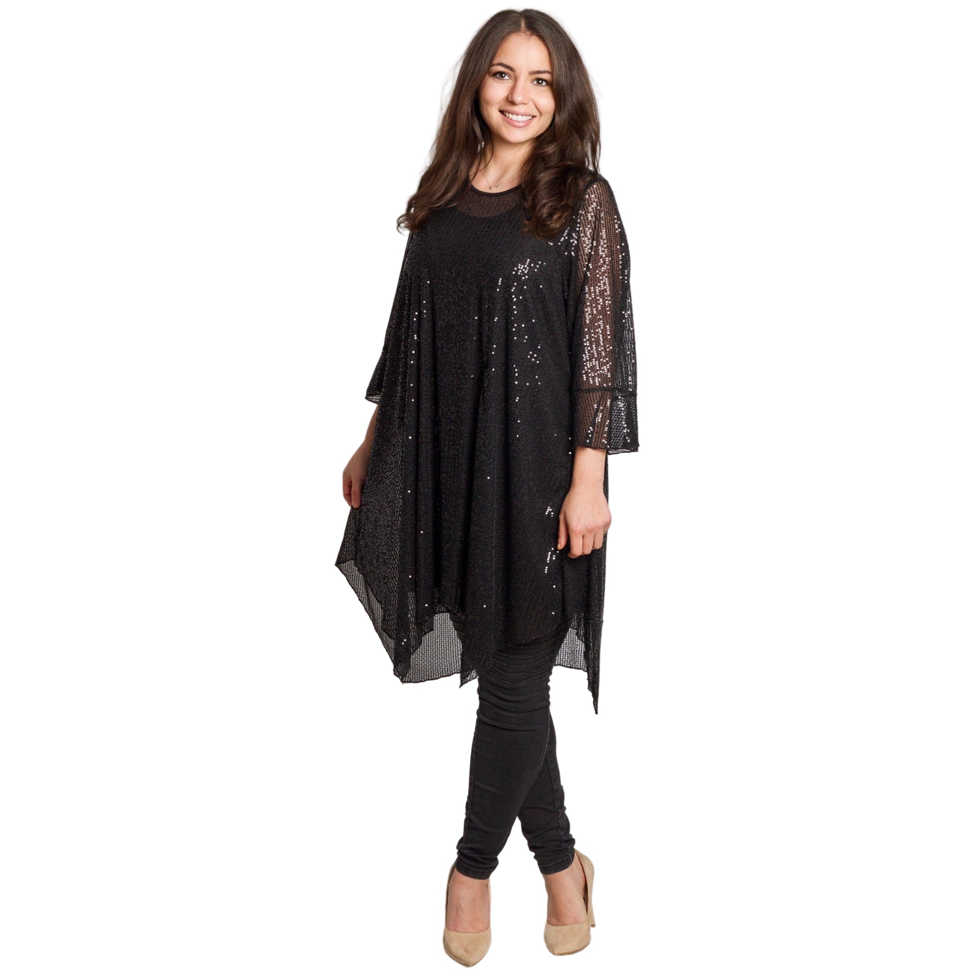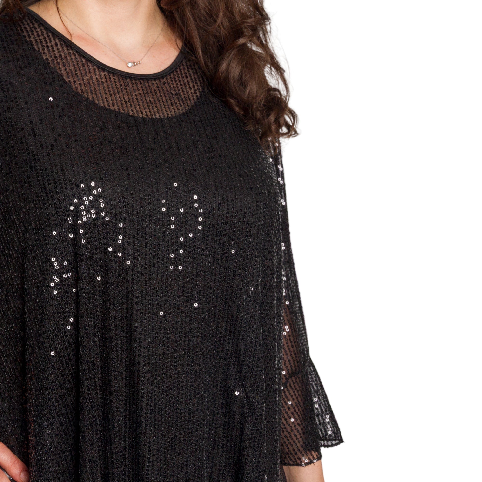 Елегантна черна туника с разкроена линия и вграден потник, създадена за специални поводи и събития. Горният слой е изработен от лек тюл с фини пайети, които придават сияен ефект и подчертават женствеността. Трите четвърти прозрачни ръкави завършват с леко разкроен маншет, а облото деколте съчетава прозрачна мрежа с класическа кройка. Свободната разкроена форма прикрива нежно силуета и осигурява максимален комфорт. Перфектен избор за официални вечери, празници и специални моменти.