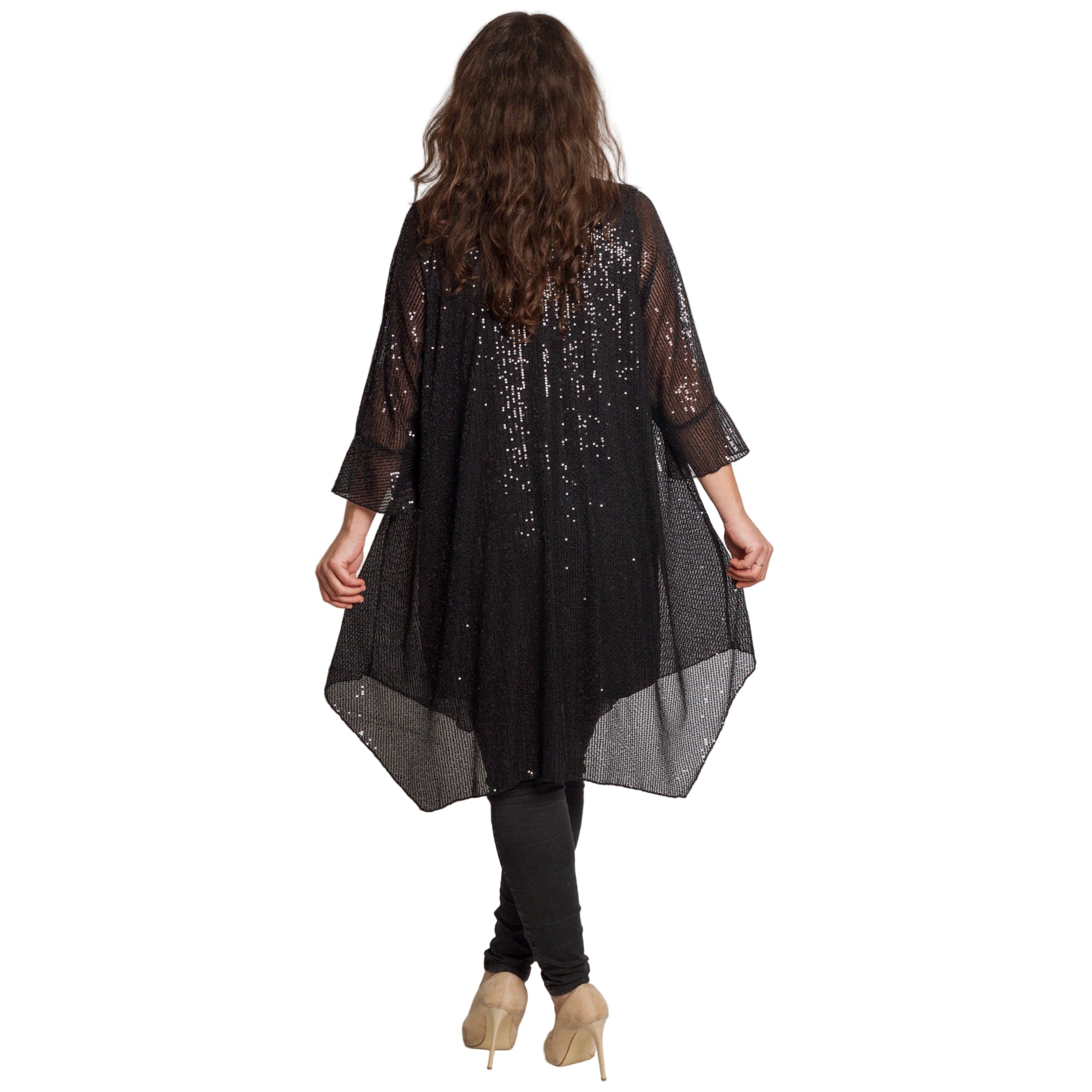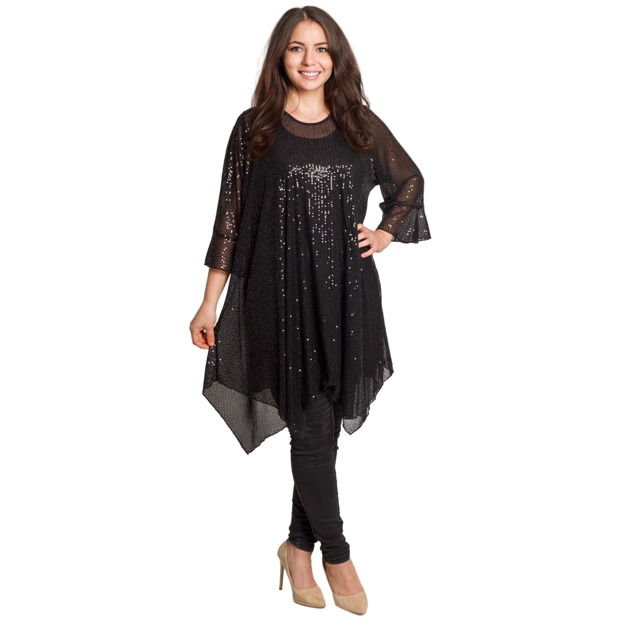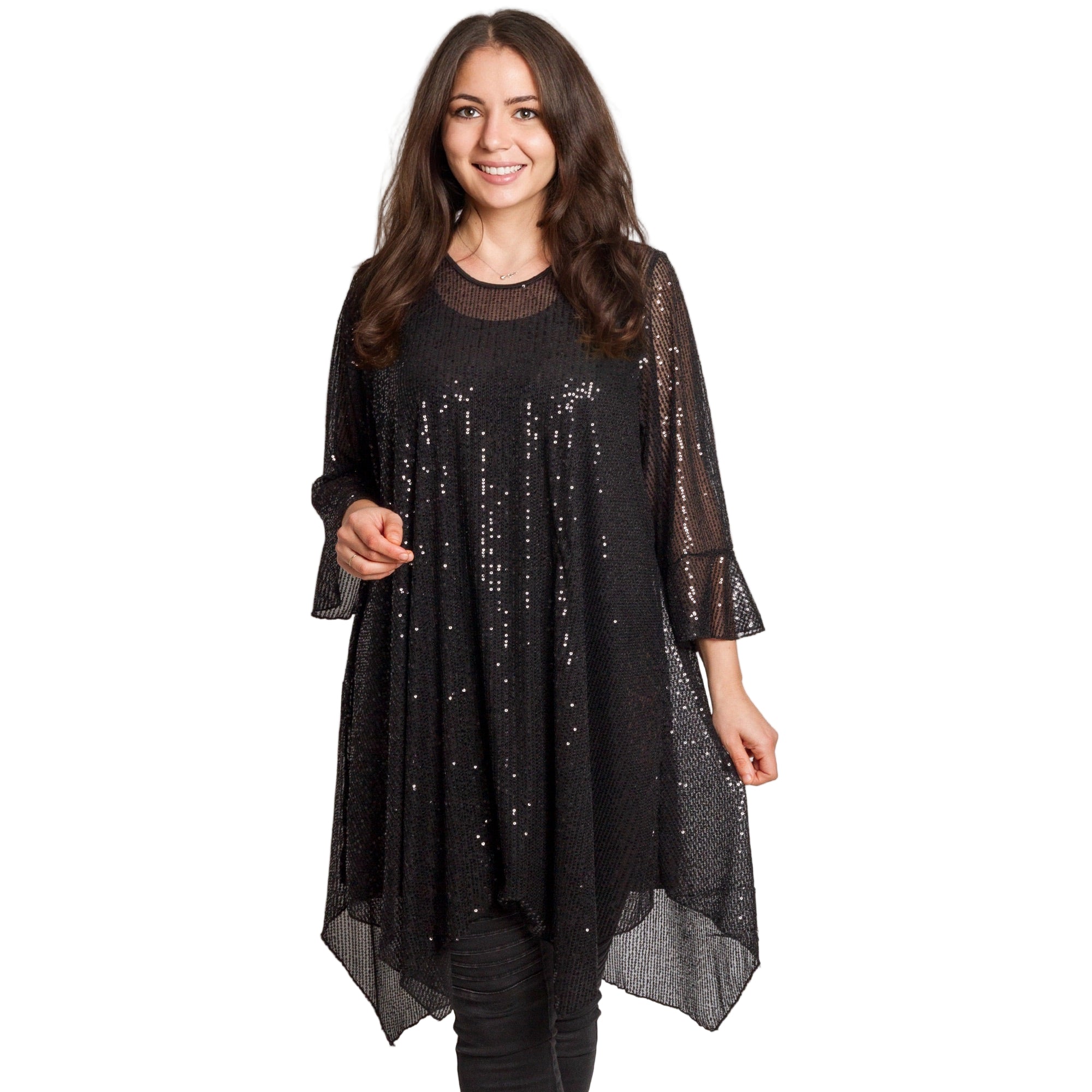 Елегантна черна туника с разкроена линия и вграден потник, създадена за специални поводи и събития. Горният слой е изработен от лек тюл с фини пайети, които придават сияен ефект и подчертават женствеността. Трите четвърти прозрачни ръкави завършват с леко разкроен маншет, а облото деколте съчетава прозрачна мрежа с класическа кройка. Свободната разкроена форма прикрива нежно силуета и осигурява максимален комфорт. Перфектен избор за официални вечери, празници и специални моменти.