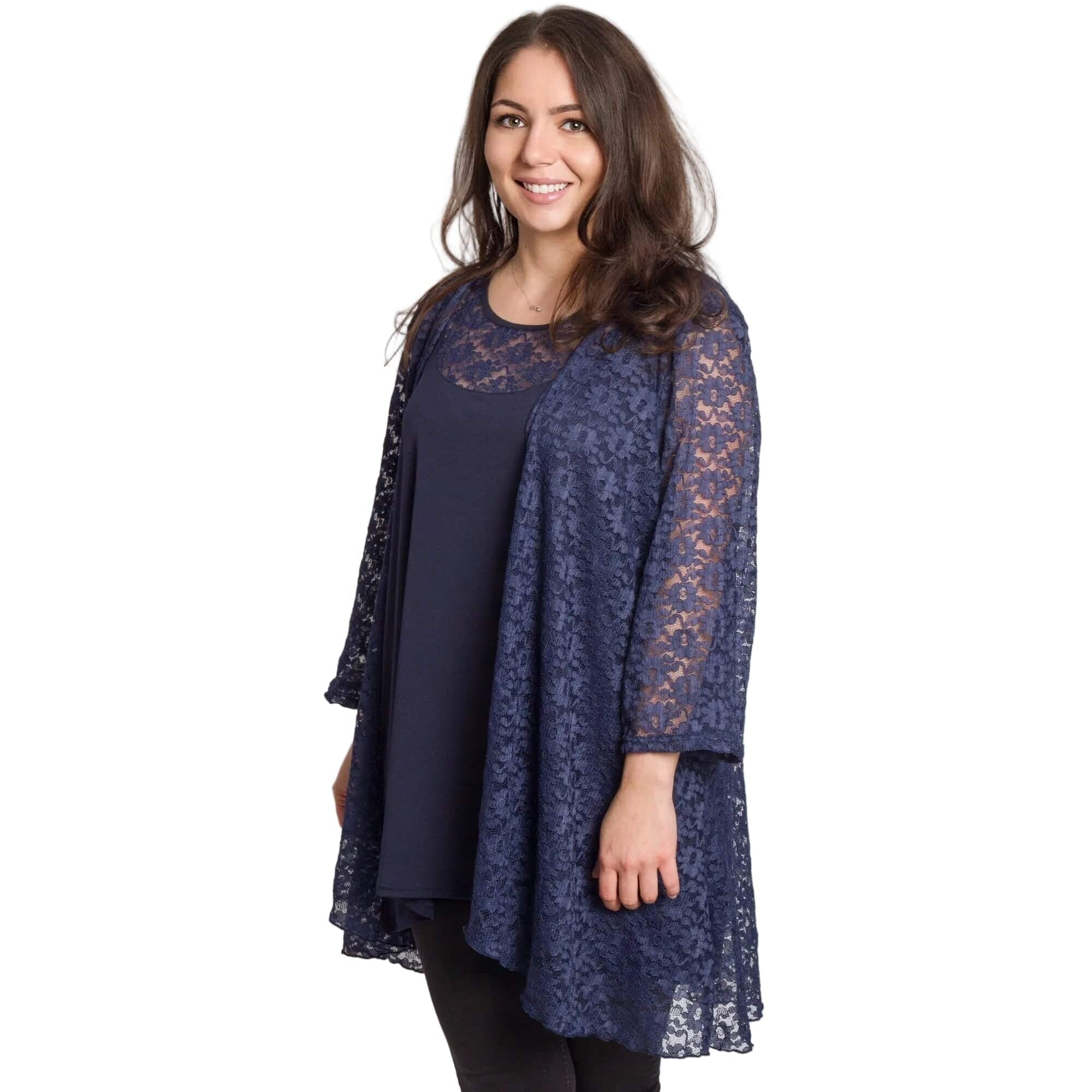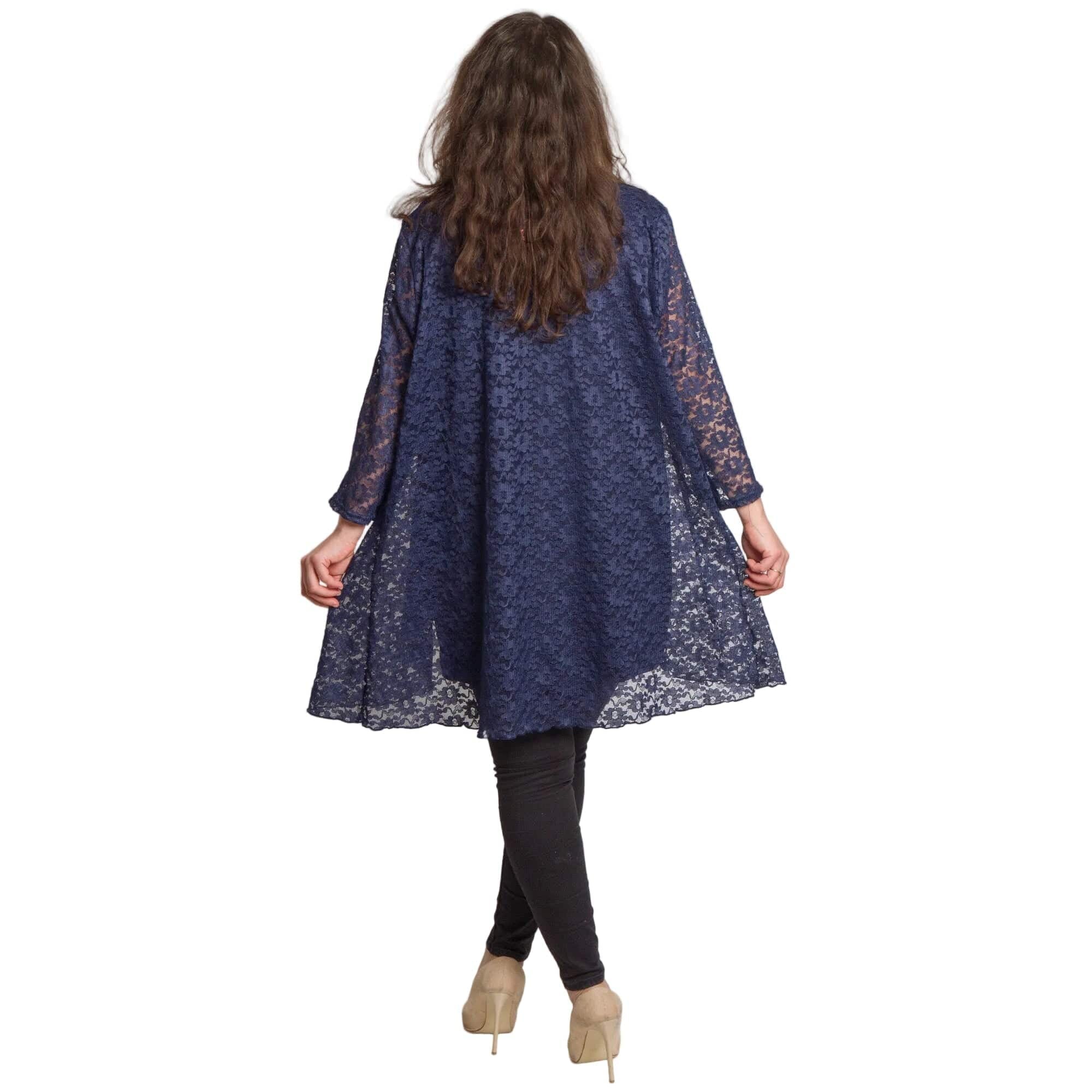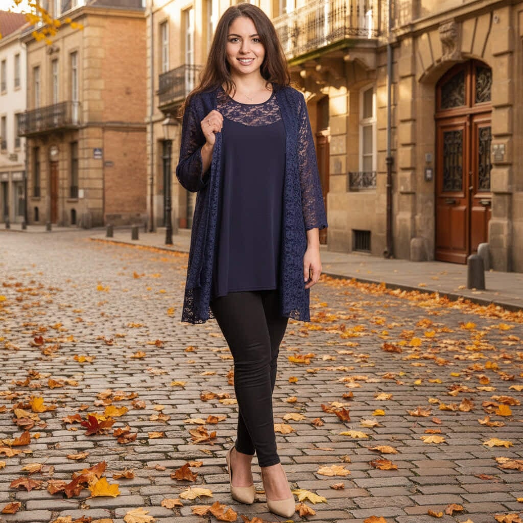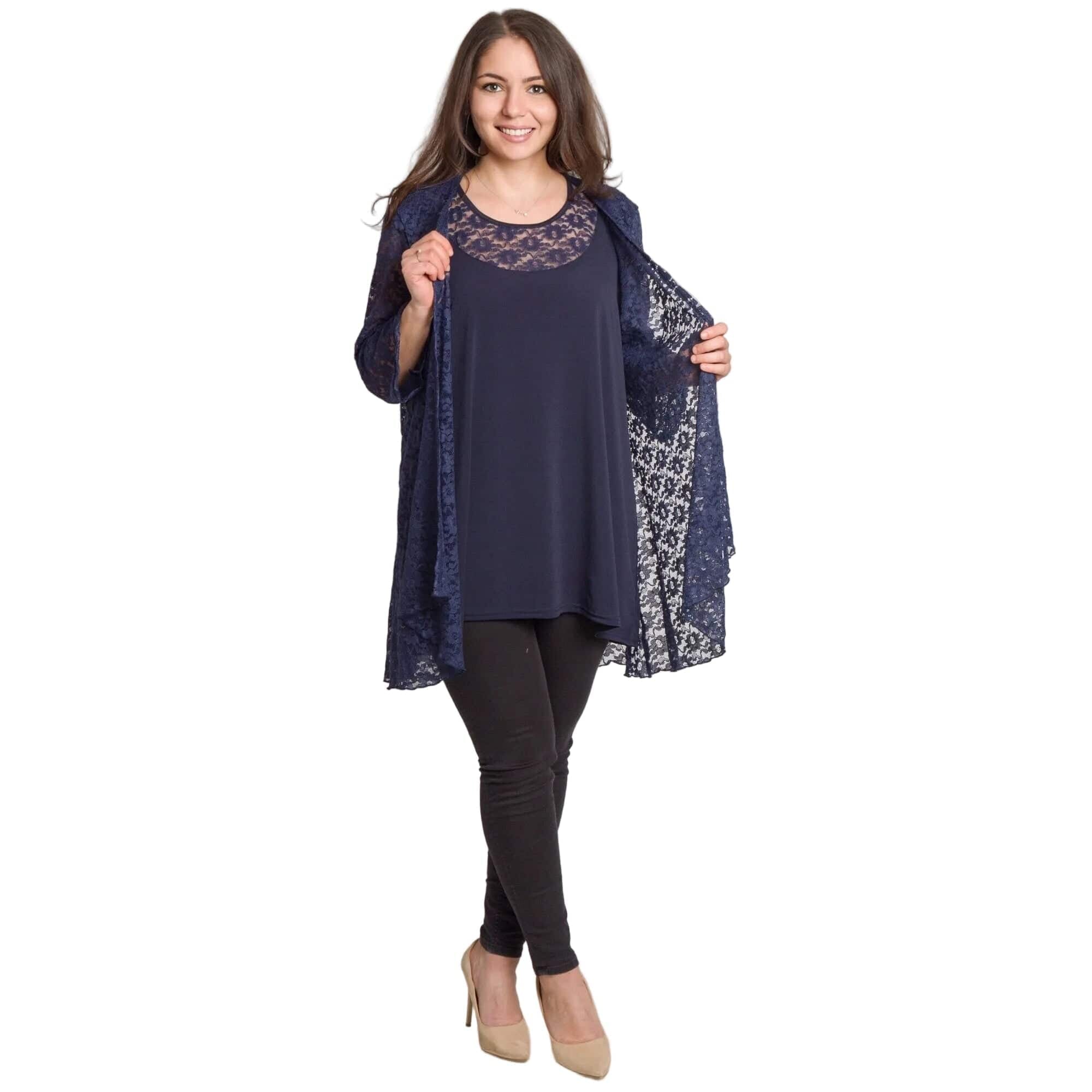 Елегантен официален комплект в тъмносин цвят, състоящ се от свободна туника и ефирно дантелено сако. Туниката е с кръгло деколте и изчистена линия, която осигурява комфорт и елегантна визия, а дантеленото сако добавя стилен и женствен завършек. Свободната кройка пада леко по тялото и прикрива несъвършенствата, като подчертава силуета по изискан начин. Материята е еластична и приятна на допир, подходяща за продължително носене. Комплектът е отличен избор за официални поводи през есенно-зимния сезон.