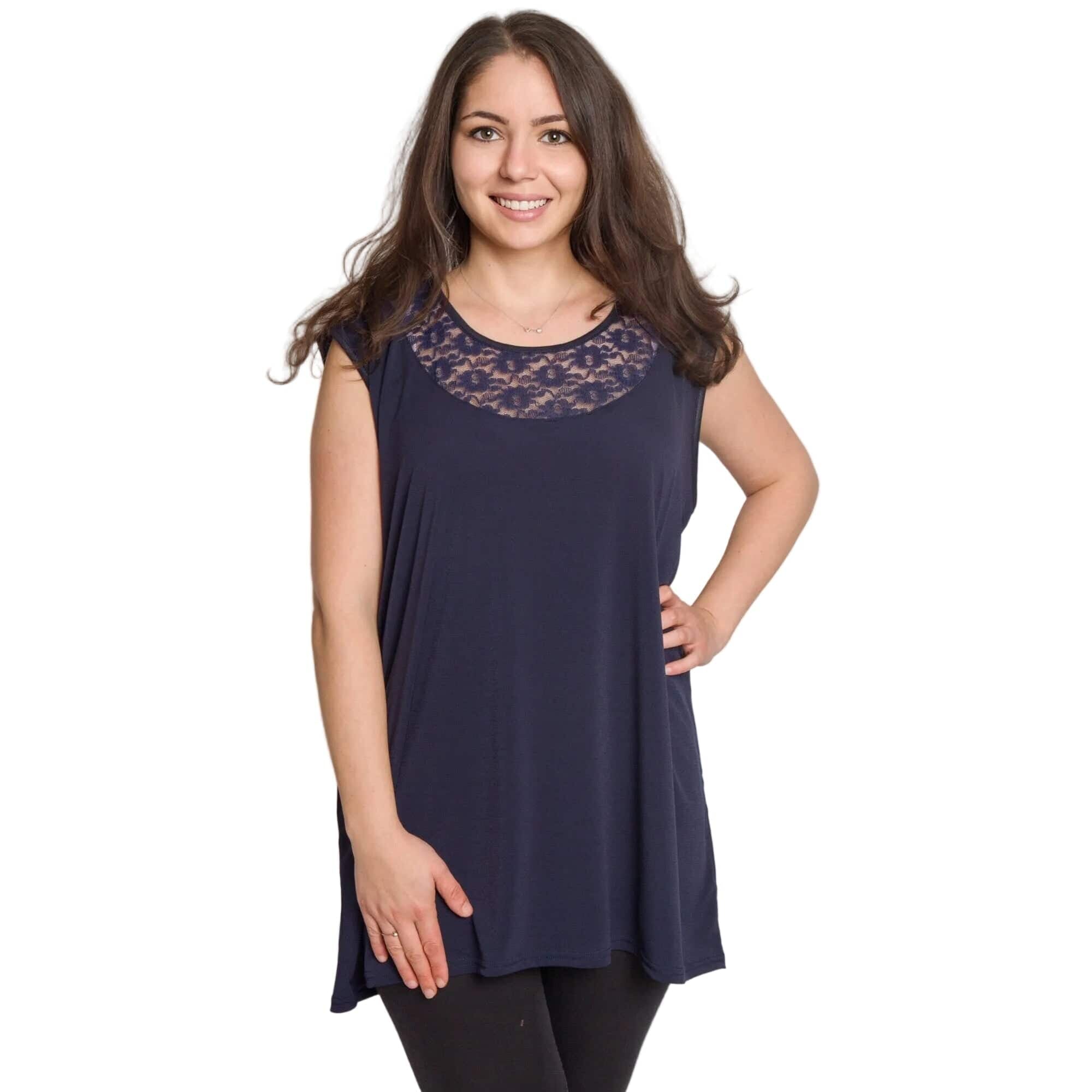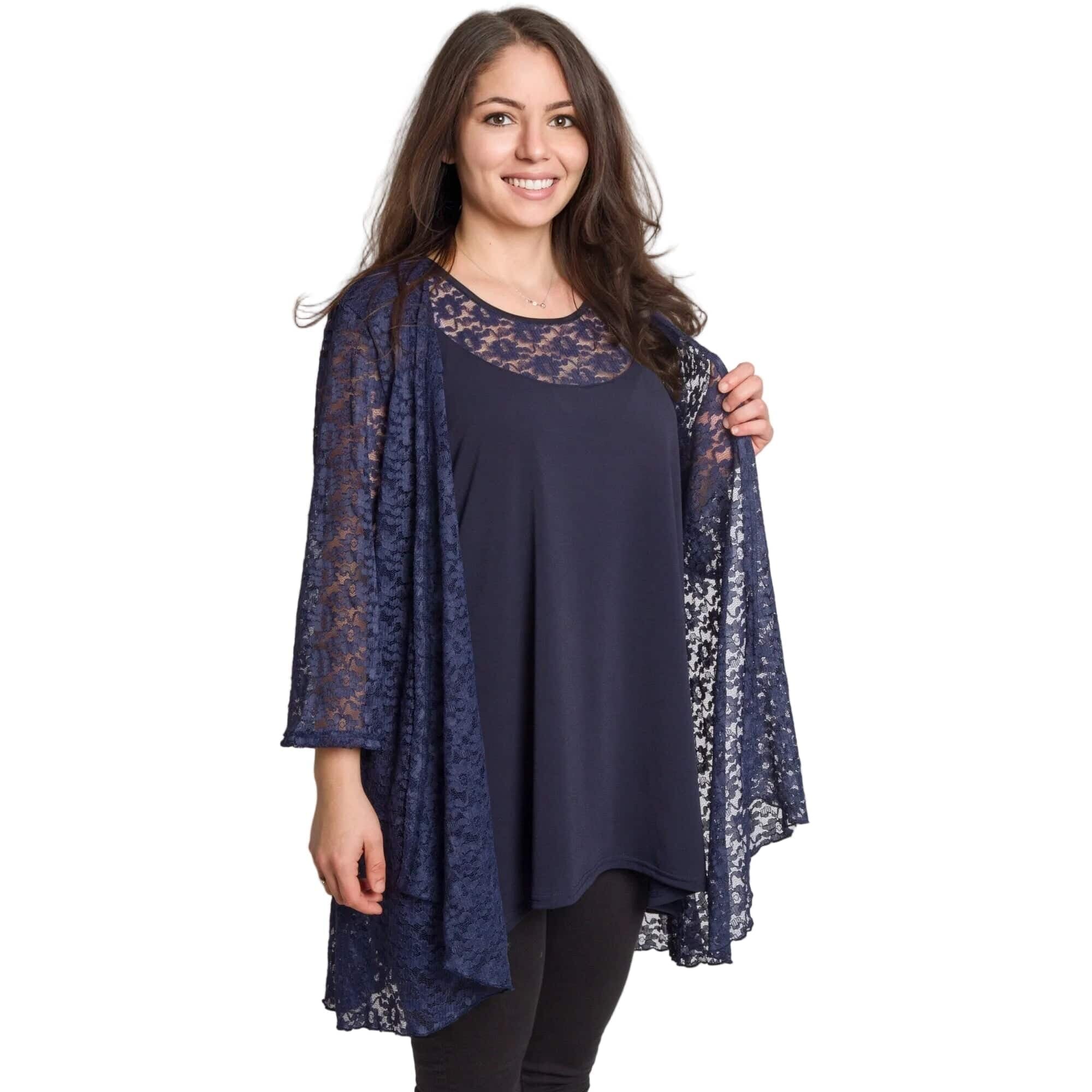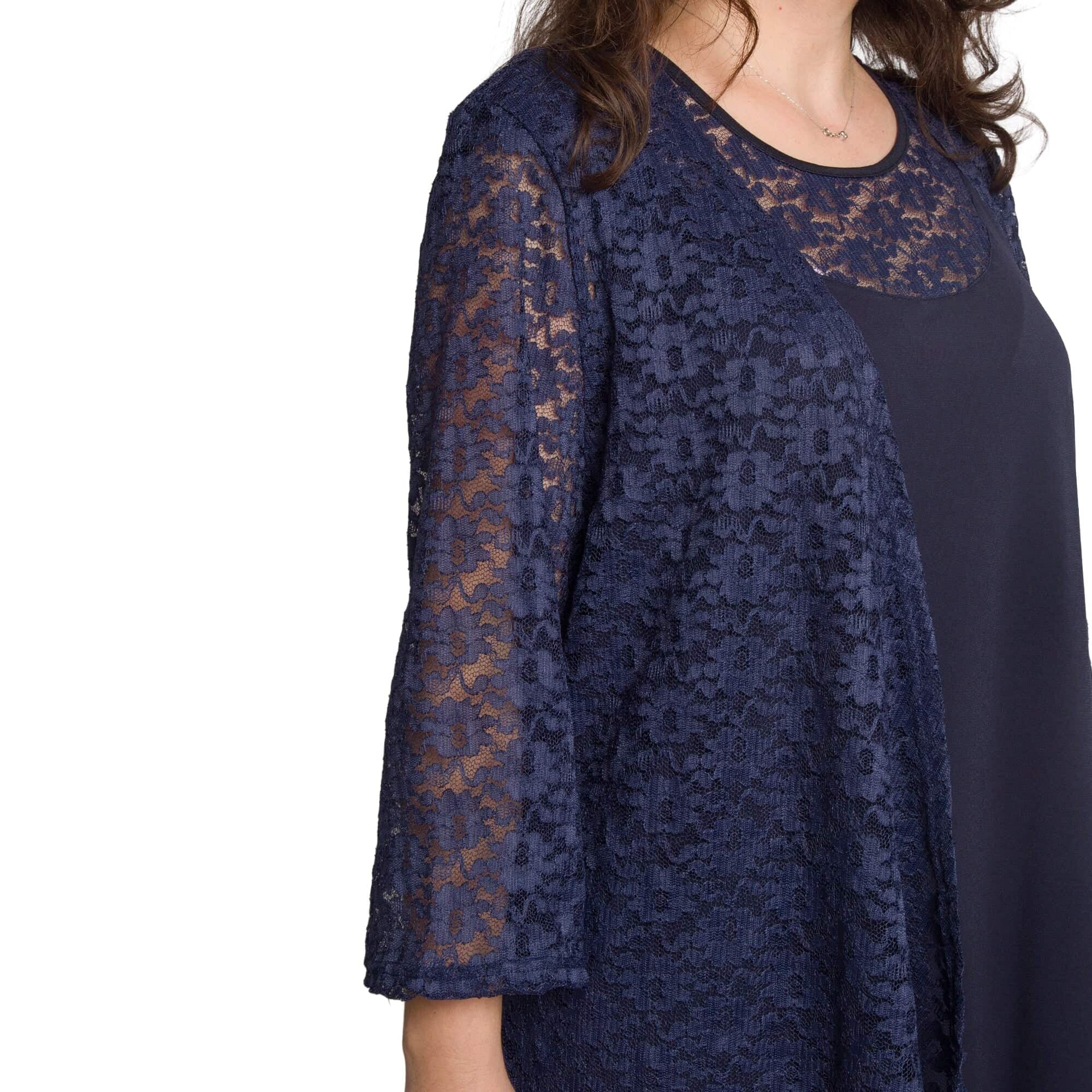 Елегантен официален комплект в тъмносин цвят, състоящ се от свободна туника и ефирно дантелено сако. Туниката е с кръгло деколте и изчистена линия, която осигурява комфорт и елегантна визия, а дантеленото сако добавя стилен и женствен завършек. Свободната кройка пада леко по тялото и прикрива несъвършенствата, като подчертава силуета по изискан начин. Материята е еластична и приятна на допир, подходяща за продължително носене. Комплектът е отличен избор за официални поводи през есенно-зимния сезон.