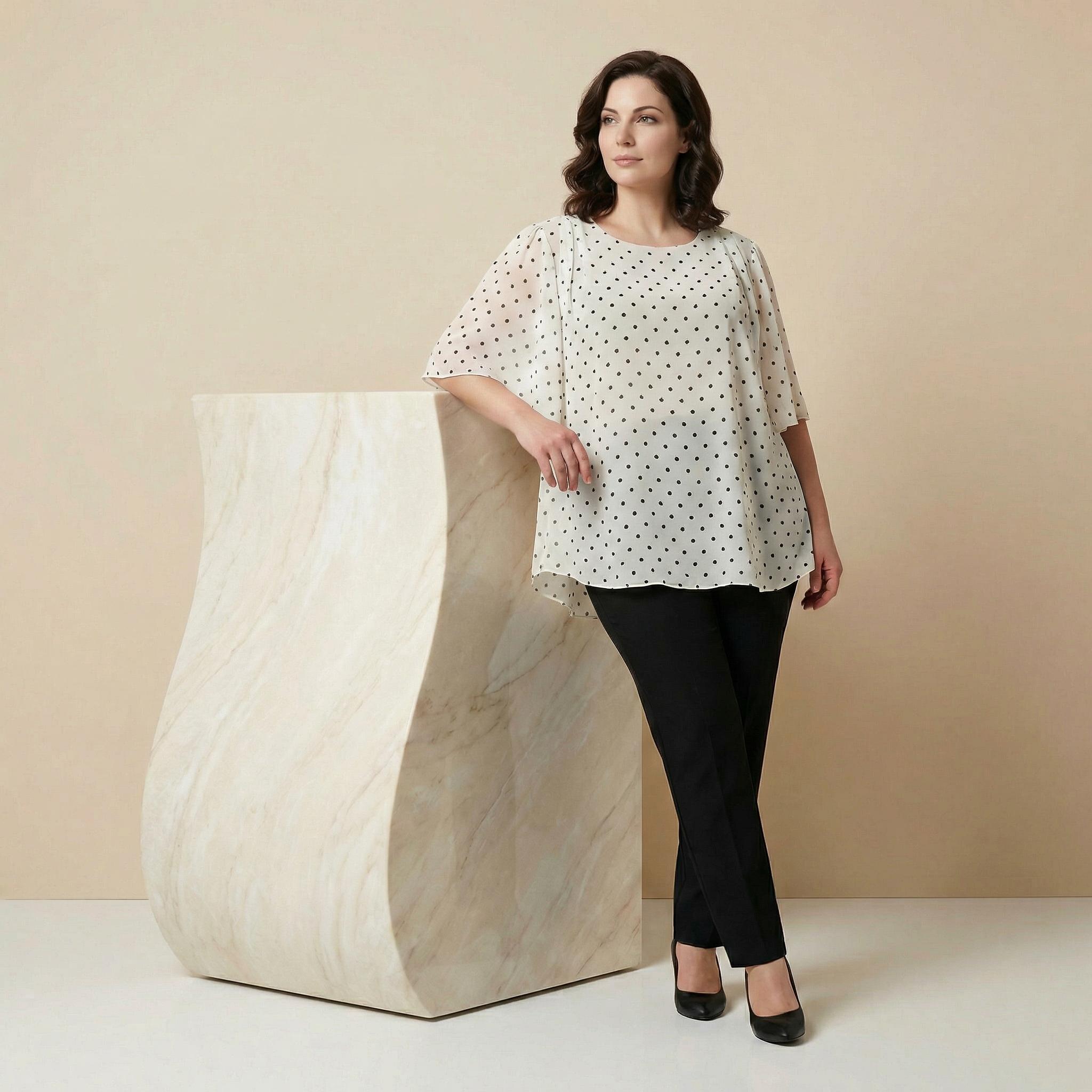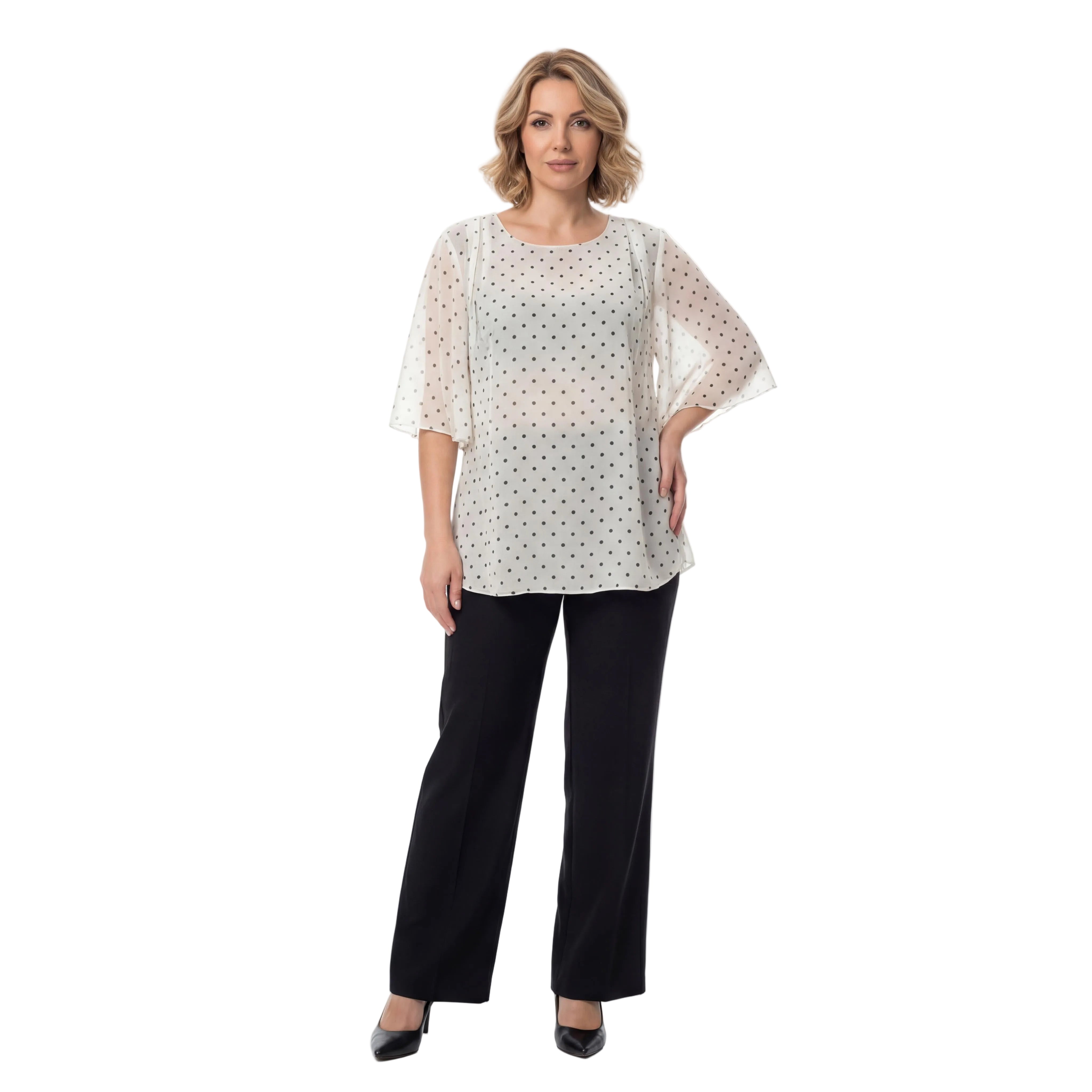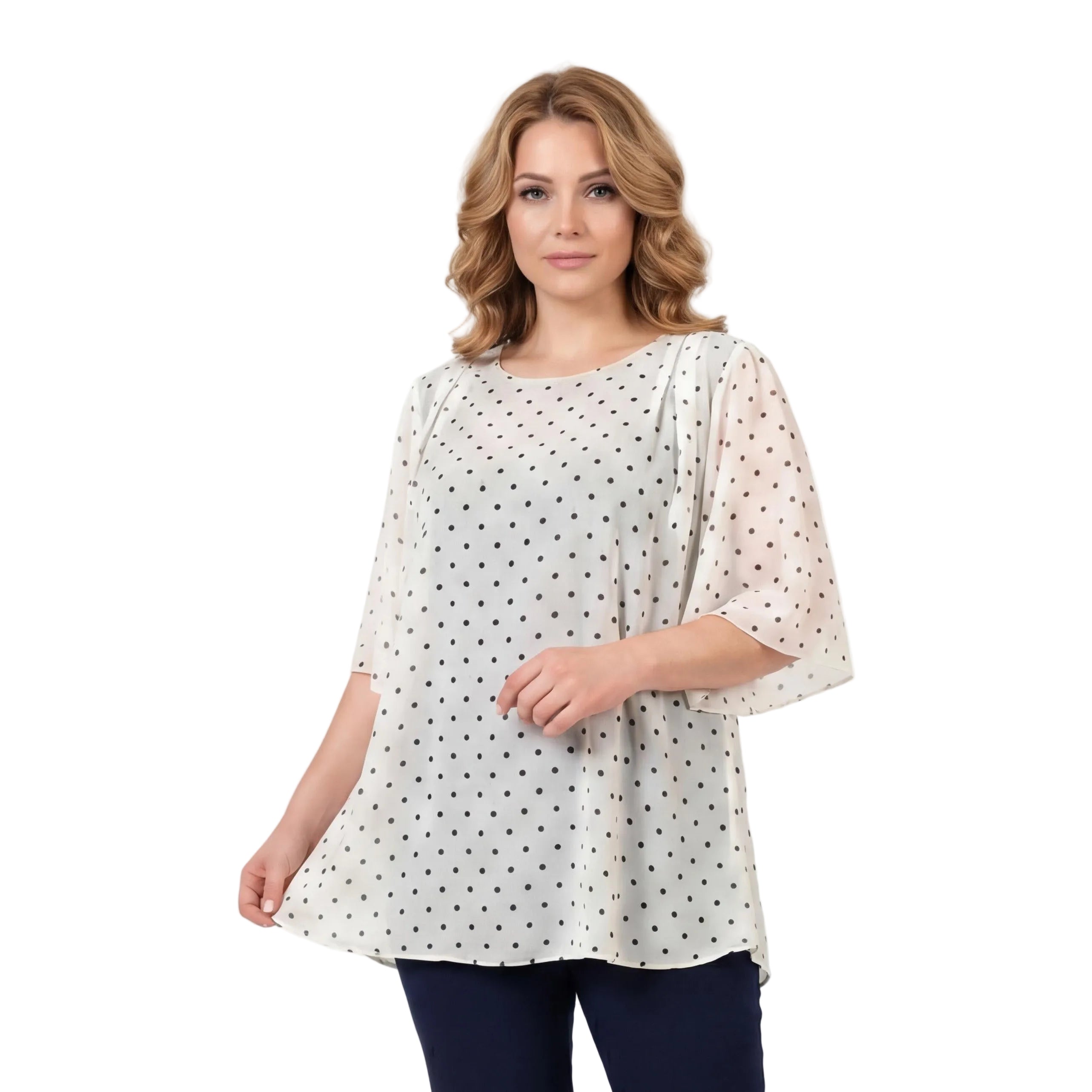 Добавете нотка изтънченост към гардероба си с тази официална бяла туника на черни точки, създадена да подчертае женствеността на дамите с пищни форми. Моделът е изработен от нежен и ефирен шифон, който пада свободно и елегантно, осигурявайки усещане за лекота и комфорт. Дизайнът се отличава с красиво набрана горна част и разкроена кройка, която следва естествените извивки на тялото без да прилепва. Туниката разполага с мека подплата, която гарантира непрозрачност и удобство при носене. Подходяща както за сватби, кръщенета и коктейли, така и за стилна визия в ежедневието.