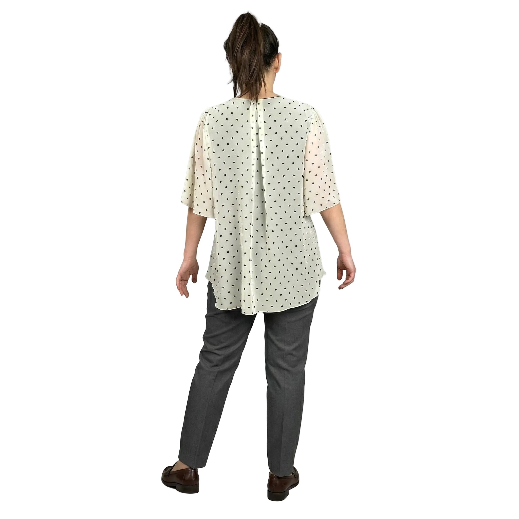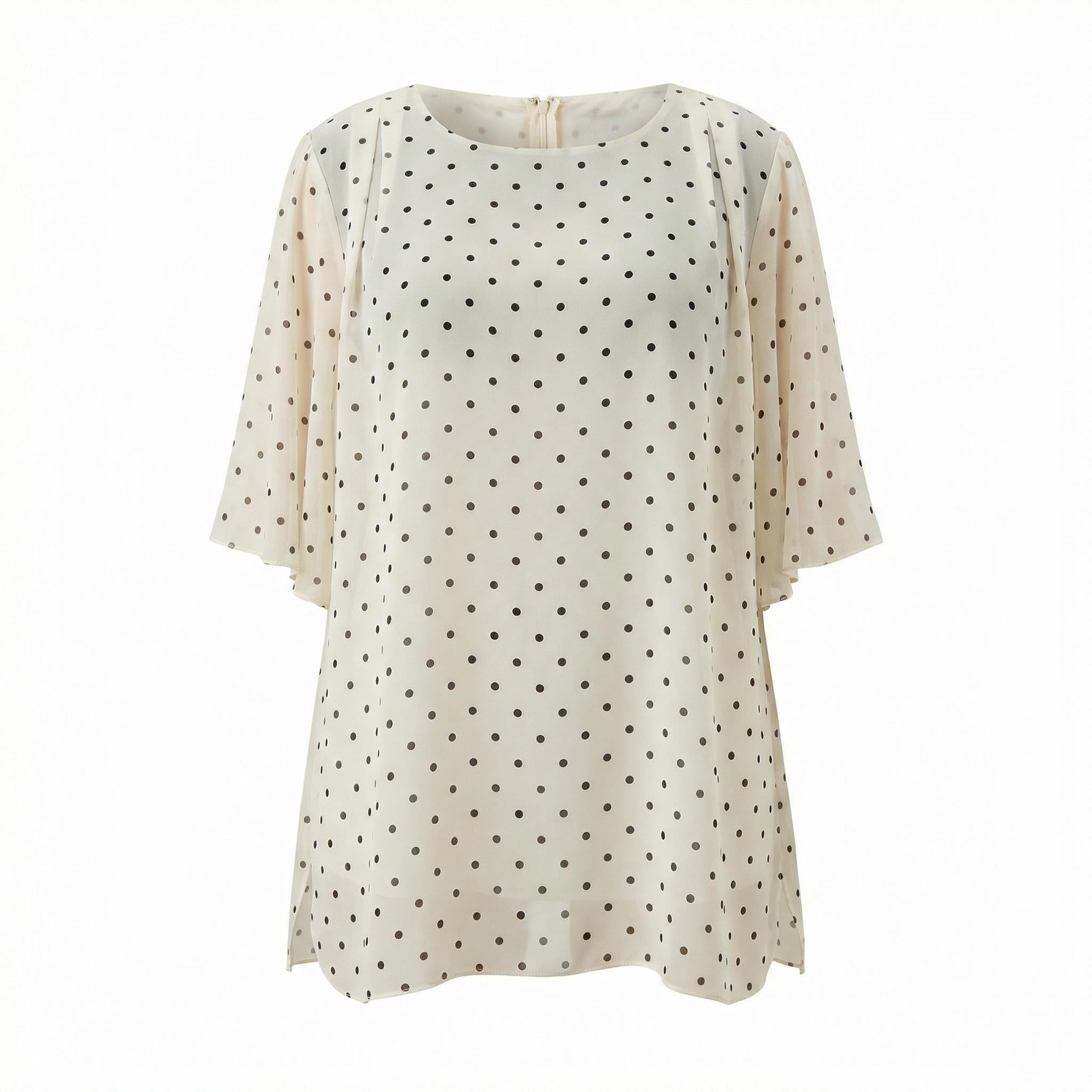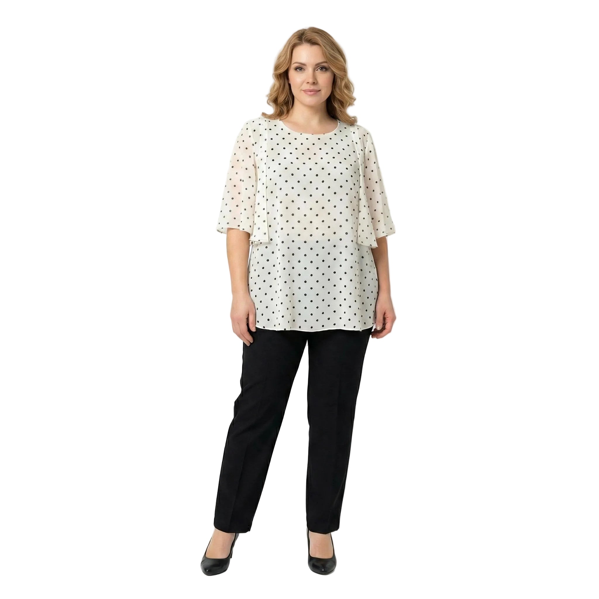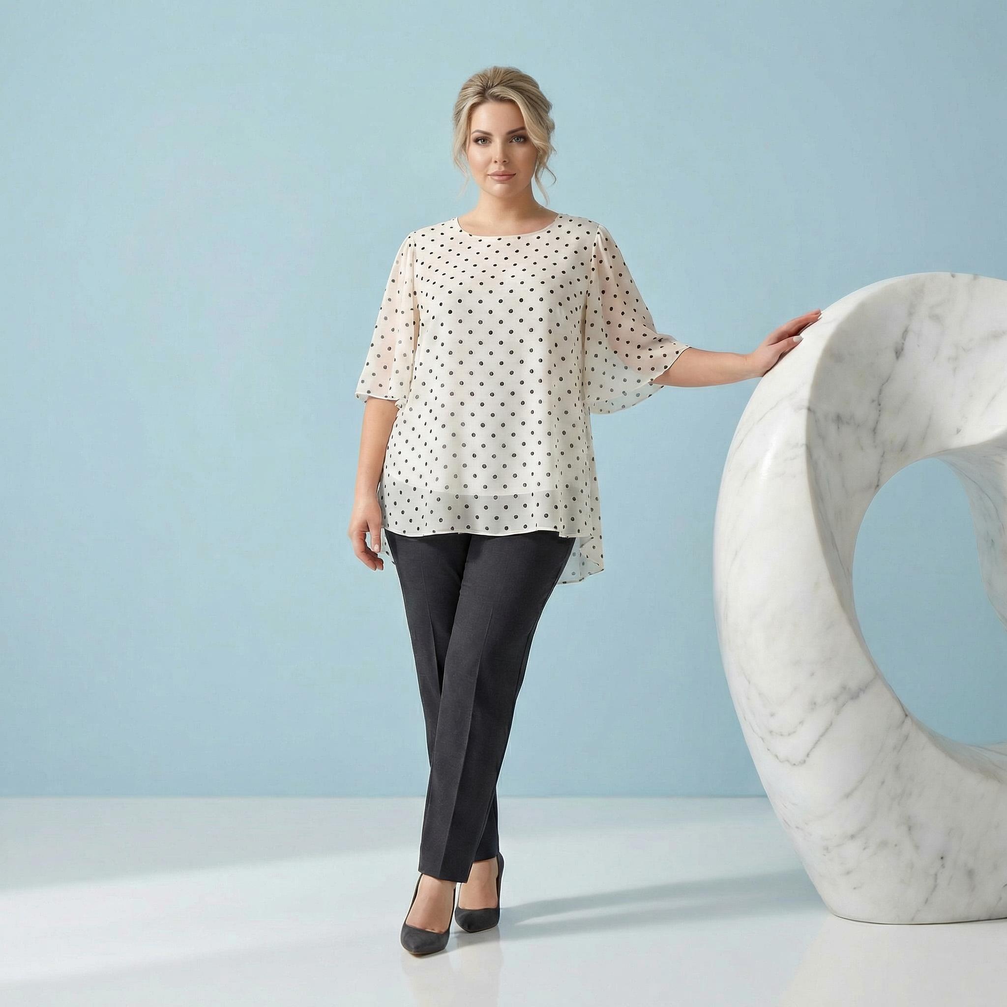 Добавете нотка изтънченост към гардероба си с тази официална бяла туника на черни точки, създадена да подчертае женствеността на дамите с пищни форми. Моделът е изработен от нежен и ефирен шифон, който пада свободно и елегантно, осигурявайки усещане за лекота и комфорт. Дизайнът се отличава с красиво набрана горна част и разкроена кройка, която следва естествените извивки на тялото без да прилепва. Туниката разполага с мека подплата, която гарантира непрозрачност и удобство при носене. Подходяща както за сватби, кръщенета и коктейли, така и за стилна визия в ежедневието.