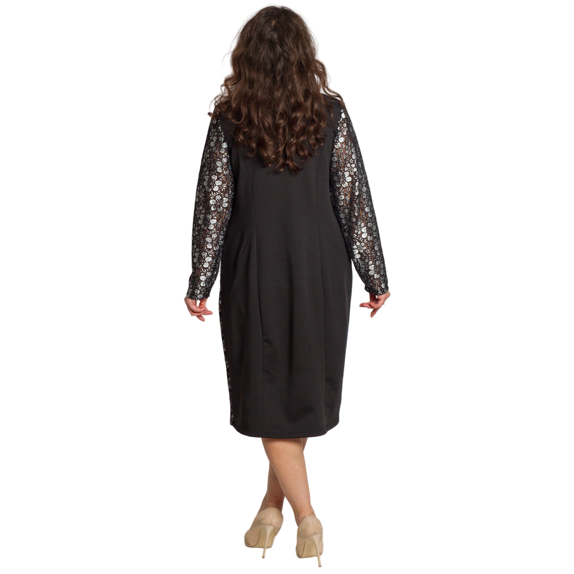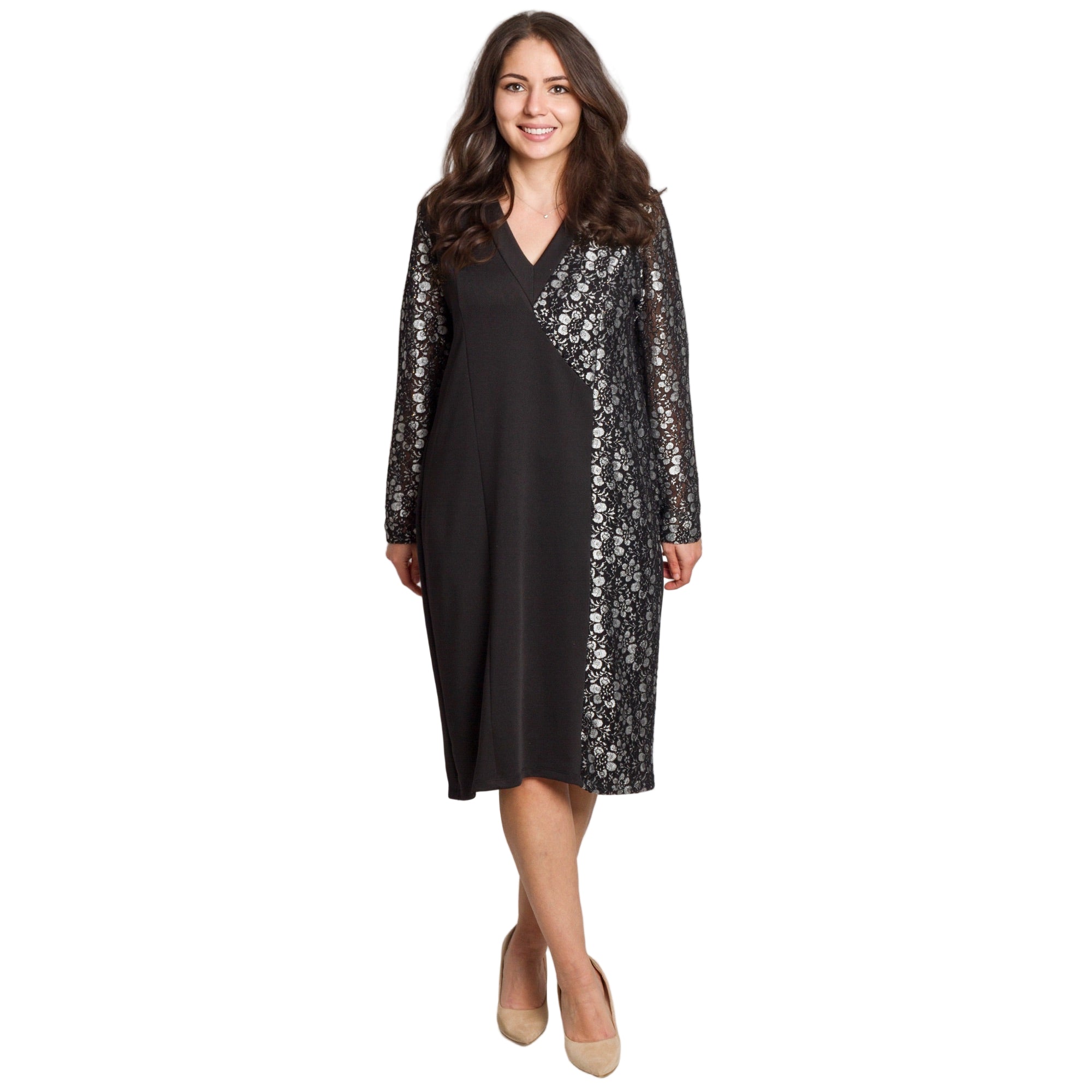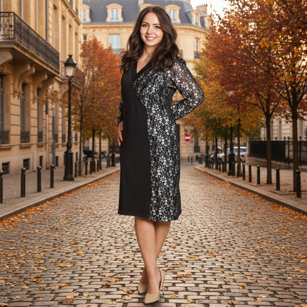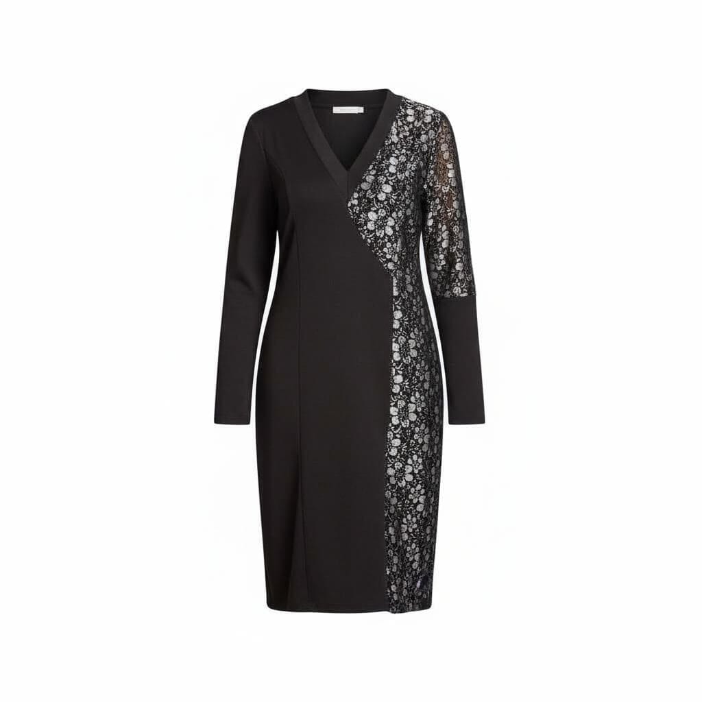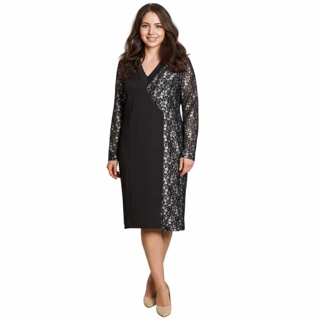 Тази официална черна рокля комбинира изчистена линия с изискан флорален десен в сребристи тонове, които подчертават силуета по елегантен и фин начин. Материята от 50% памук и 50% полиестер предлага комфорт, лекота и добра устойчивост на формата, като остава приятна към кожата и подходяща за продължително носене. V-образното деколте издължава фигурата, а разкроената кройка пада свободно и създава стегнат, но в същото време комфортен силует. Дължината до коляното и дългите ръкави правят модела подходящ за официални събития, вечерни излизания и специални поводи през пролетно-летния сезон. Перфектен избор за дами в големи размери, които искат да изглеждат стилно, уверено и фино подчертано.