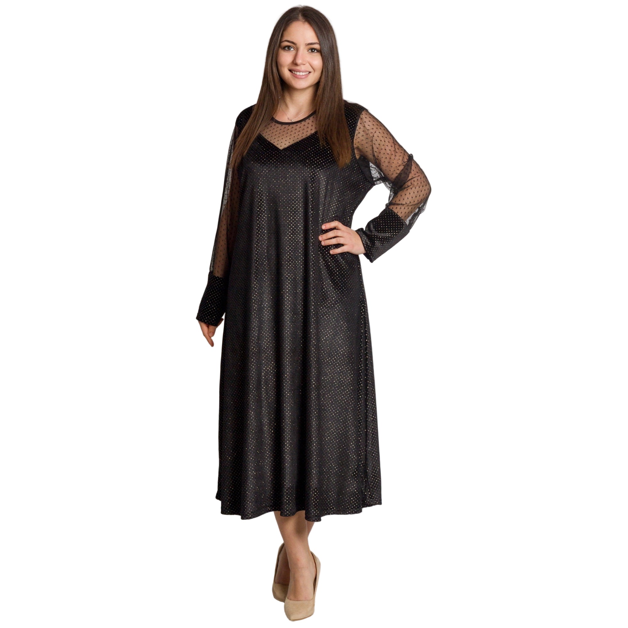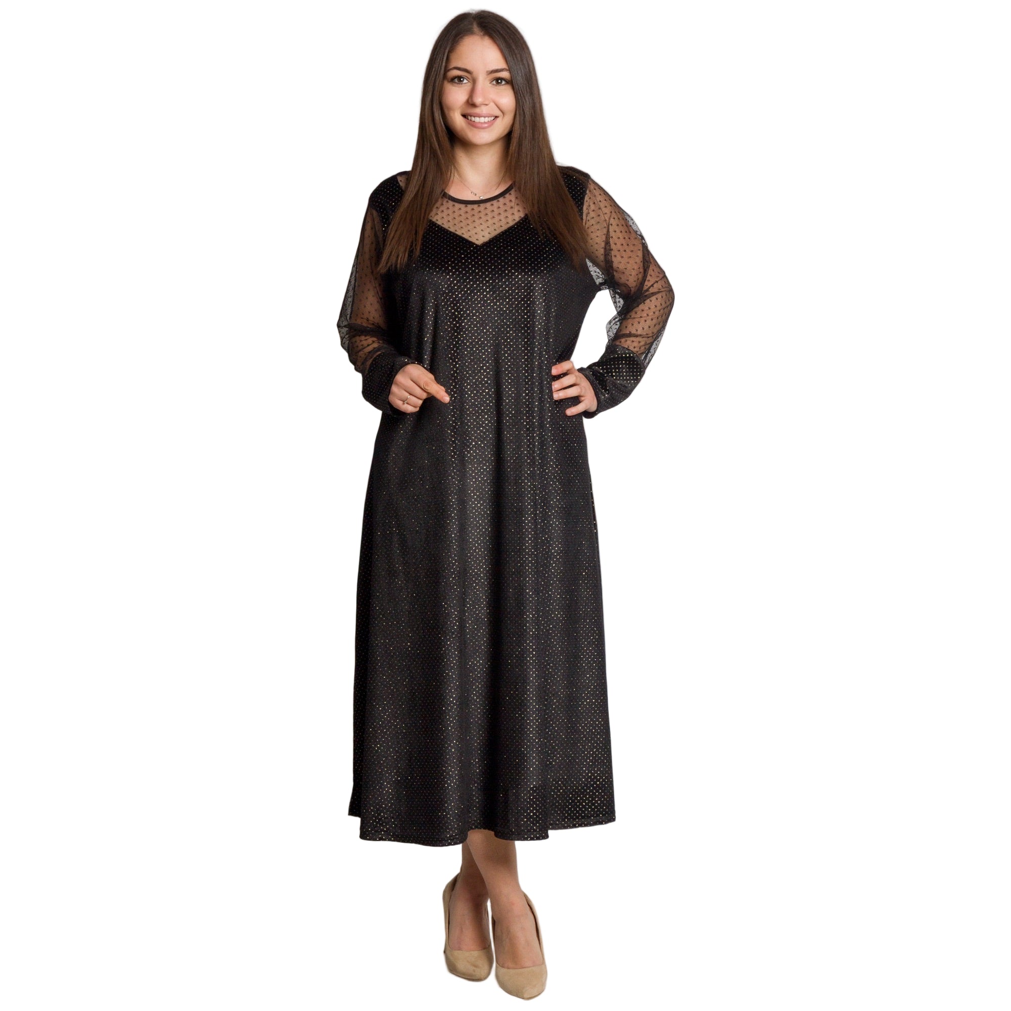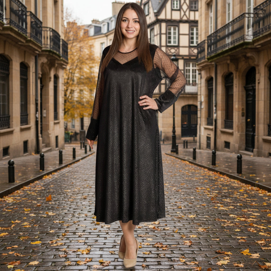 Подарете си изисканост и комфорт с тази елегантна черна рокля в големи размери, създадена за специални поводи през есенно-зимния сезон. Моделът впечатлява с разкроена линия, която пада красиво и прикрива нежеланите зони, осигурявайки свобода на движението. Горната част е изработена от фина мрежа с нежни блестящи точки, които придават празничен ефект и подчертават деколтето по изключително женствен начин. Ръкавите са леки и елегантни, а материята с еластичност гарантира удобство през целия ден или вечер. Тази рокля е идеален избор за празници, официални събития или всяка специална вечер, в която искате да изглеждате впечатляващо и уверено.