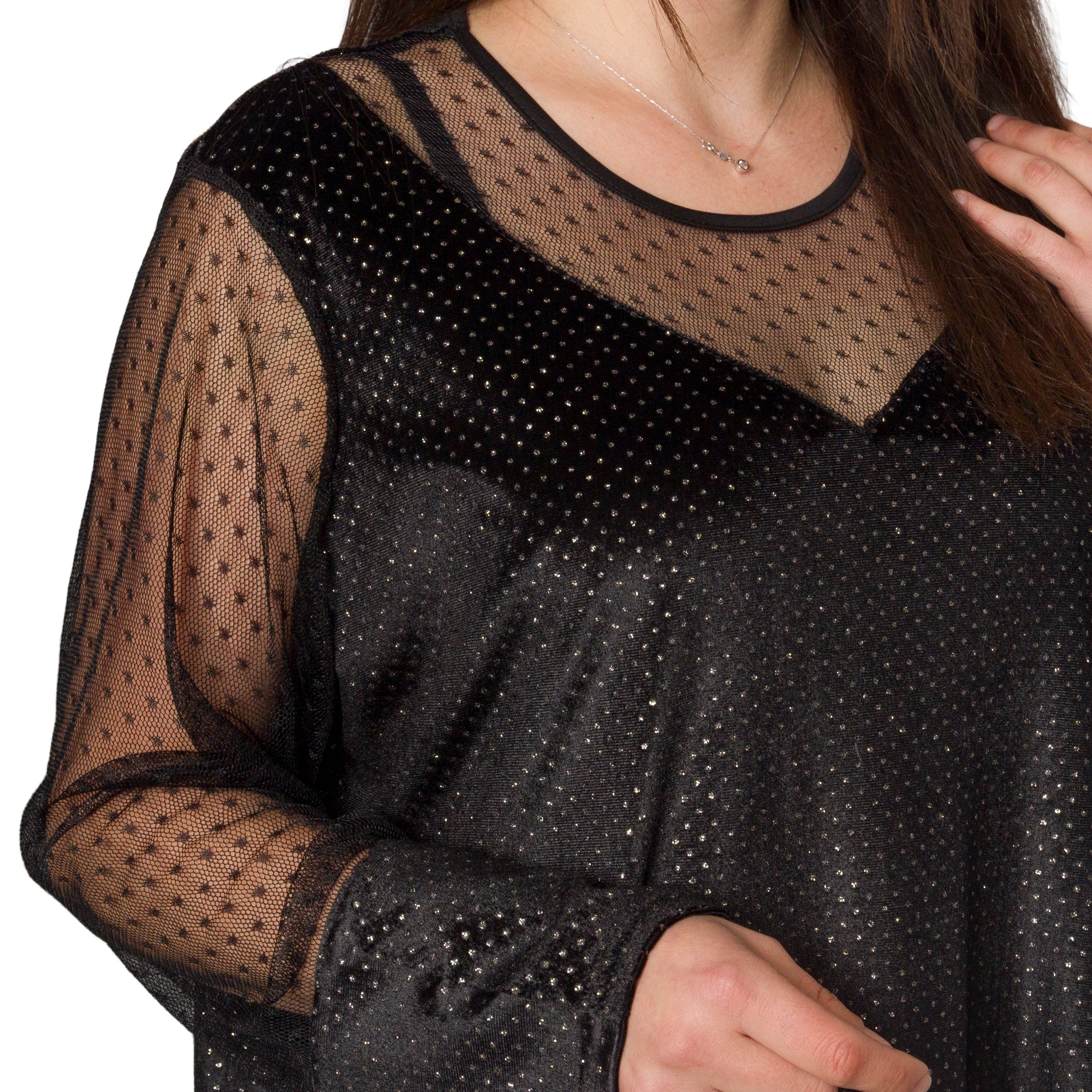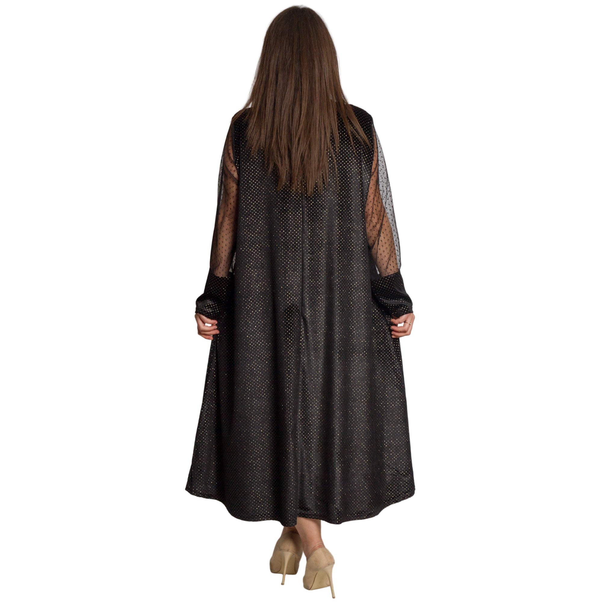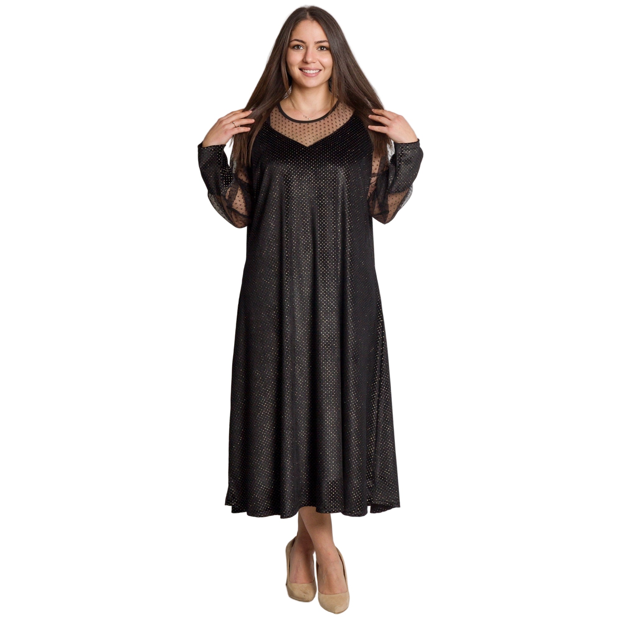 Подарете си изисканост и комфорт с тази елегантна черна рокля в големи размери, създадена за специални поводи през есенно-зимния сезон. Моделът впечатлява с разкроена линия, която пада красиво и прикрива нежеланите зони, осигурявайки свобода на движението. Горната част е изработена от фина мрежа с нежни блестящи точки, които придават празничен ефект и подчертават деколтето по изключително женствен начин. Ръкавите са леки и елегантни, а материята с еластичност гарантира удобство през целия ден или вечер. Тази рокля е идеален избор за празници, официални събития или всяка специална вечер, в която искате да изглеждате впечатляващо и уверено.