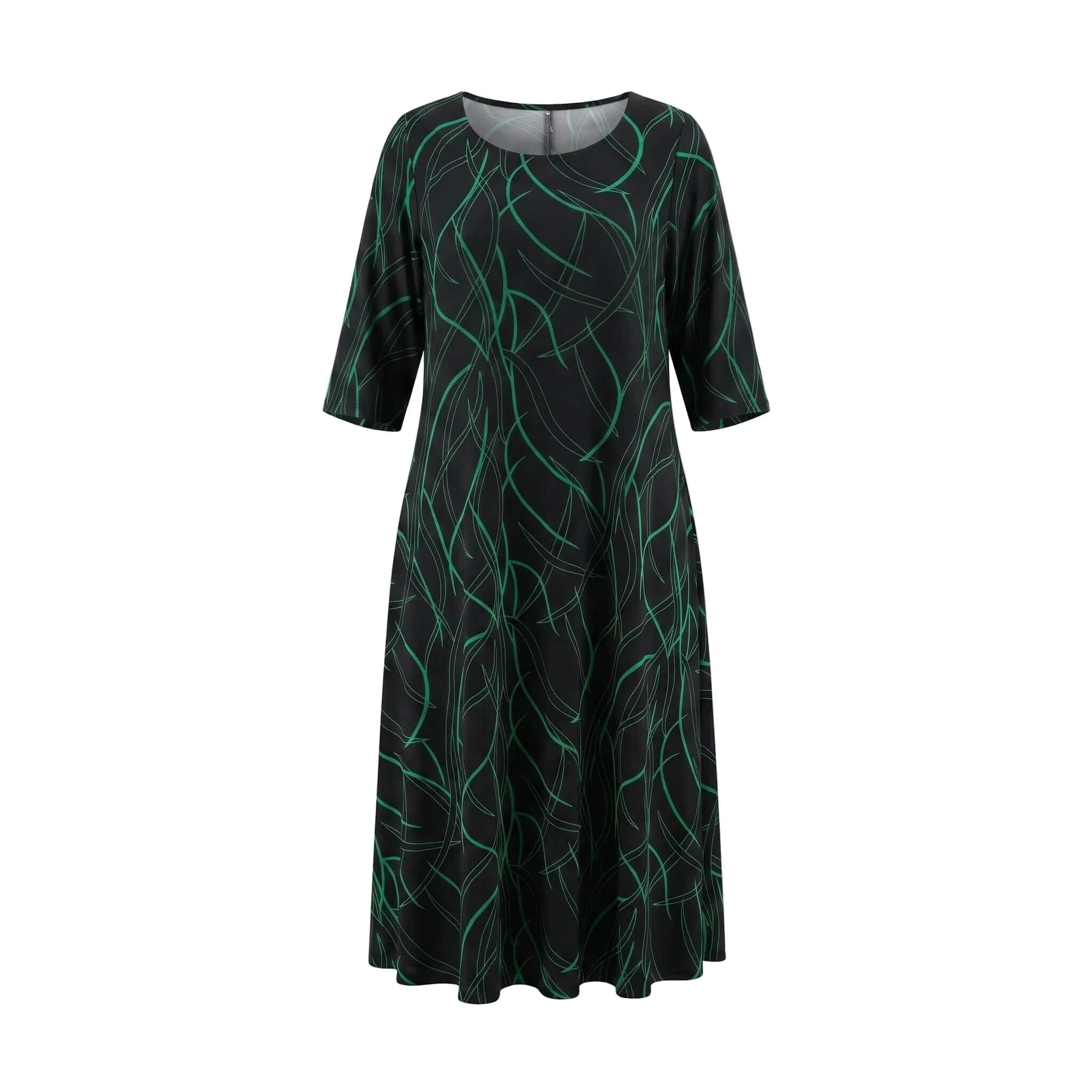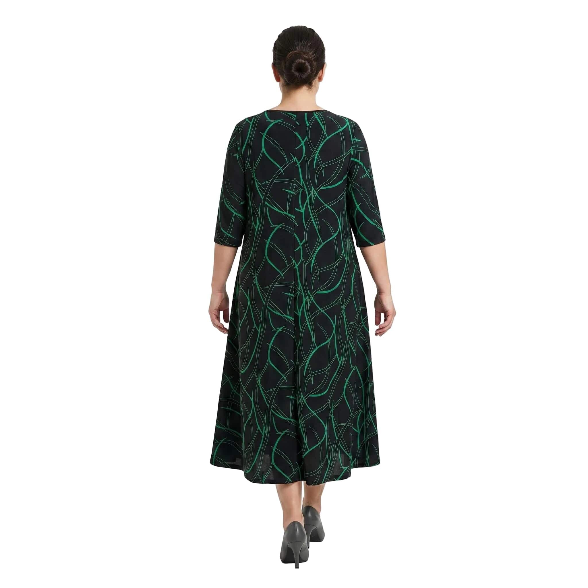 Открийте перфектния баланс между стил и комфорт с тази дълга официална макси рокля. Моделът се отличава с елегантен разкроен А-силует, който пада тежко и гладко по тялото, осигурявайки невероятна свобода на движение. Изработена от лека и еластична лятна материя с матово покритие и фин блясък, роклята е създадена да подчертава женствеността. Завладяващият черен десен е освежен с модерен абстрактен линеен принт в зелено. С дължина до глезена, къси ръкави и класическо обло деколте, този модел е изключително практичен и универсален избор както за специални поводи, така и за елегантно ежедневие.