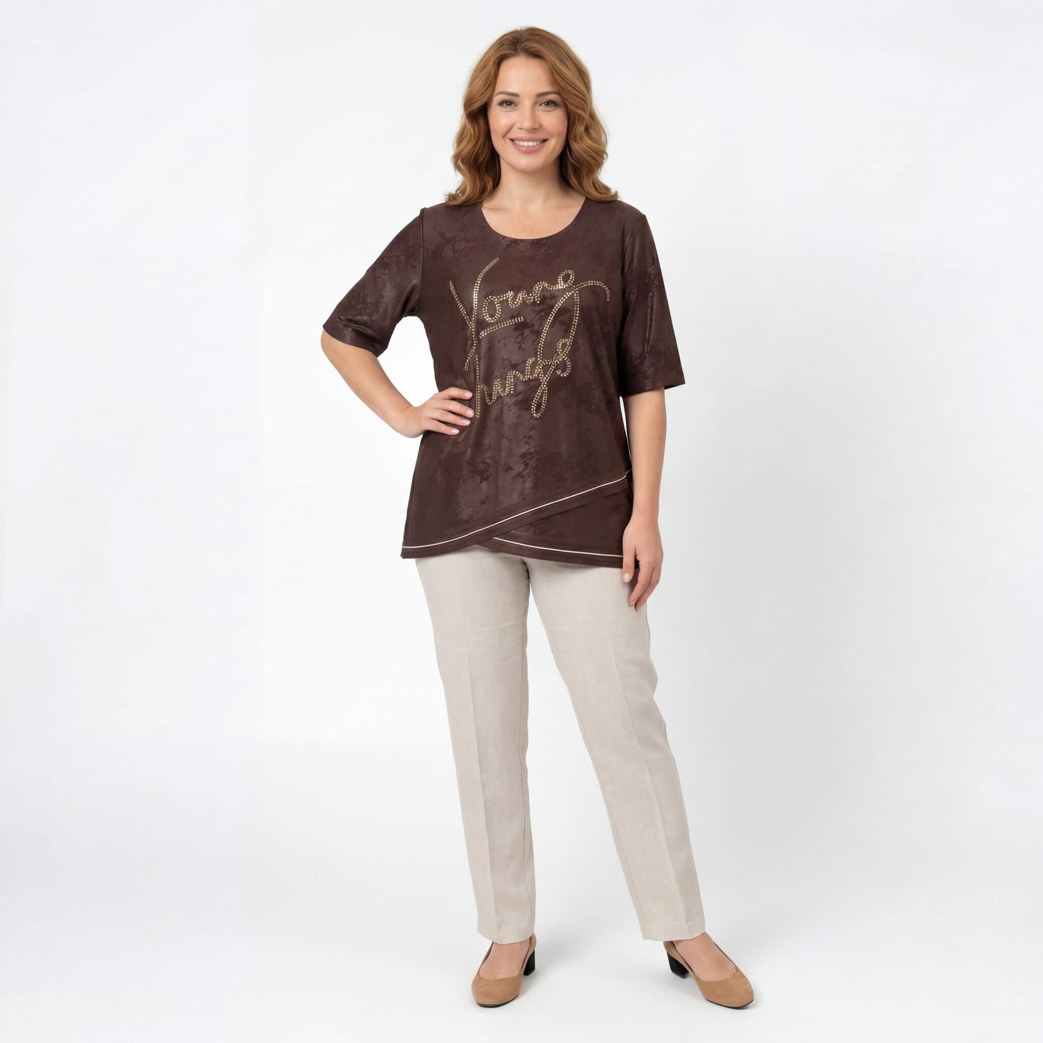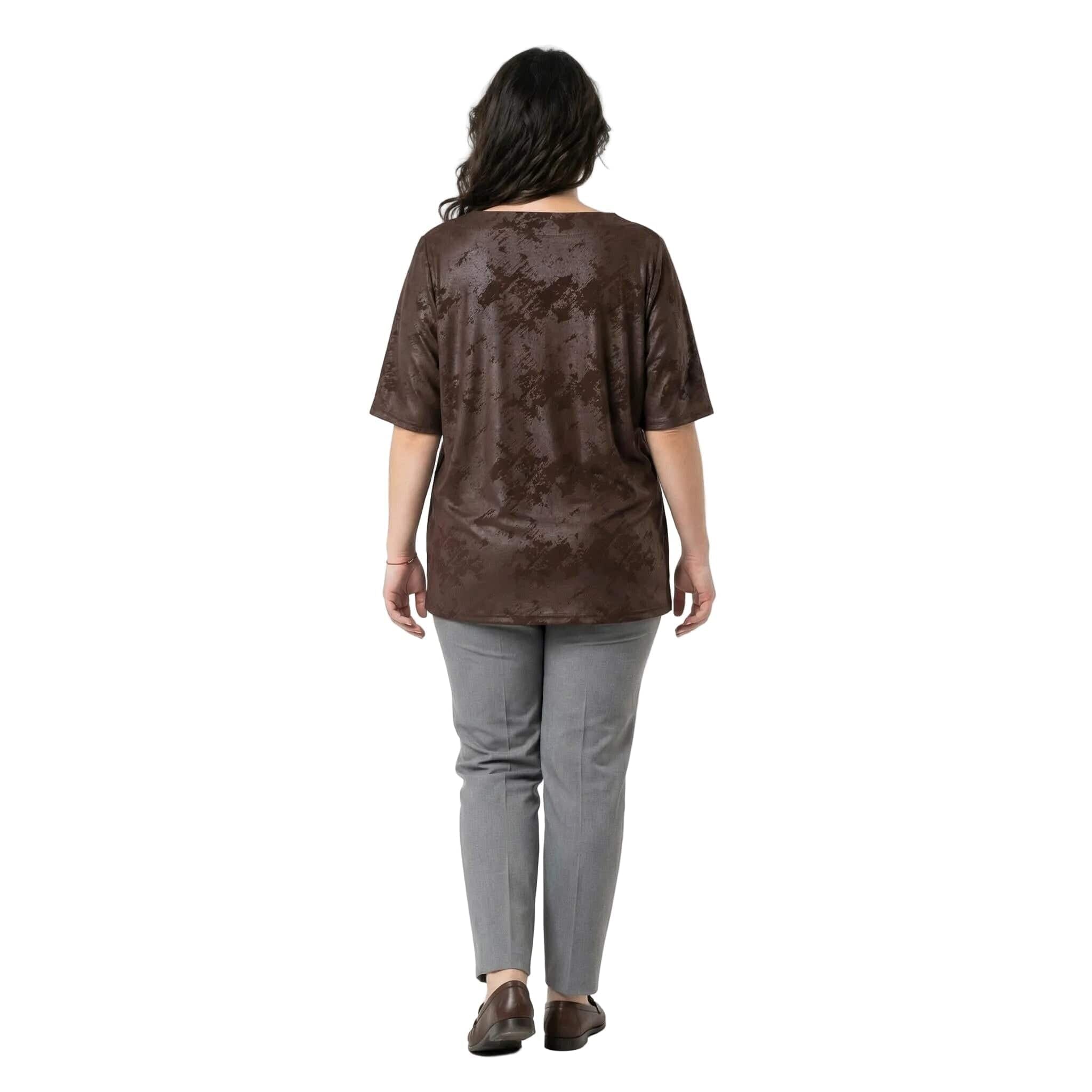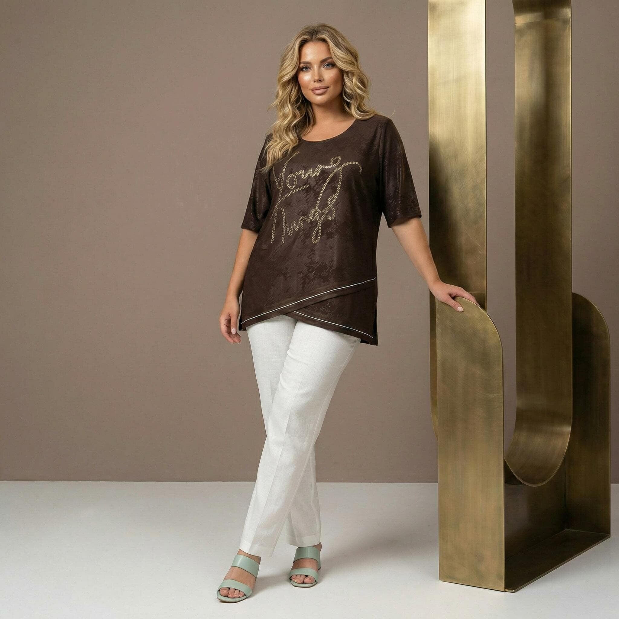 Подчертайте своята женственост и индивидуален стил с тази изискана официална макси туника в кафяво. Моделът е създаден с мисъл за дамите с пищни форми, съчетавайки безупречна елегантност и ежедневен комфорт. Изработена е от мека, еластична материя с ефектен релефен завършек и фин блясък, която пада тежко и красиво по тялото. Дизайнът се отличава с разкроена кройка, обло деколте и къси ръкави, осигуряващи пълна свобода на движение. Асиметричната предна част, акцентирана с деликатен бял кант, и бляскавият надпис от камъчета придават неповторимо очарование на дрехата. Тази туника е перфектният избор както за специални поводи, така и за стилно ежедневие, като се комбинира чудесно с елегантен панталон или любимия ви клин.