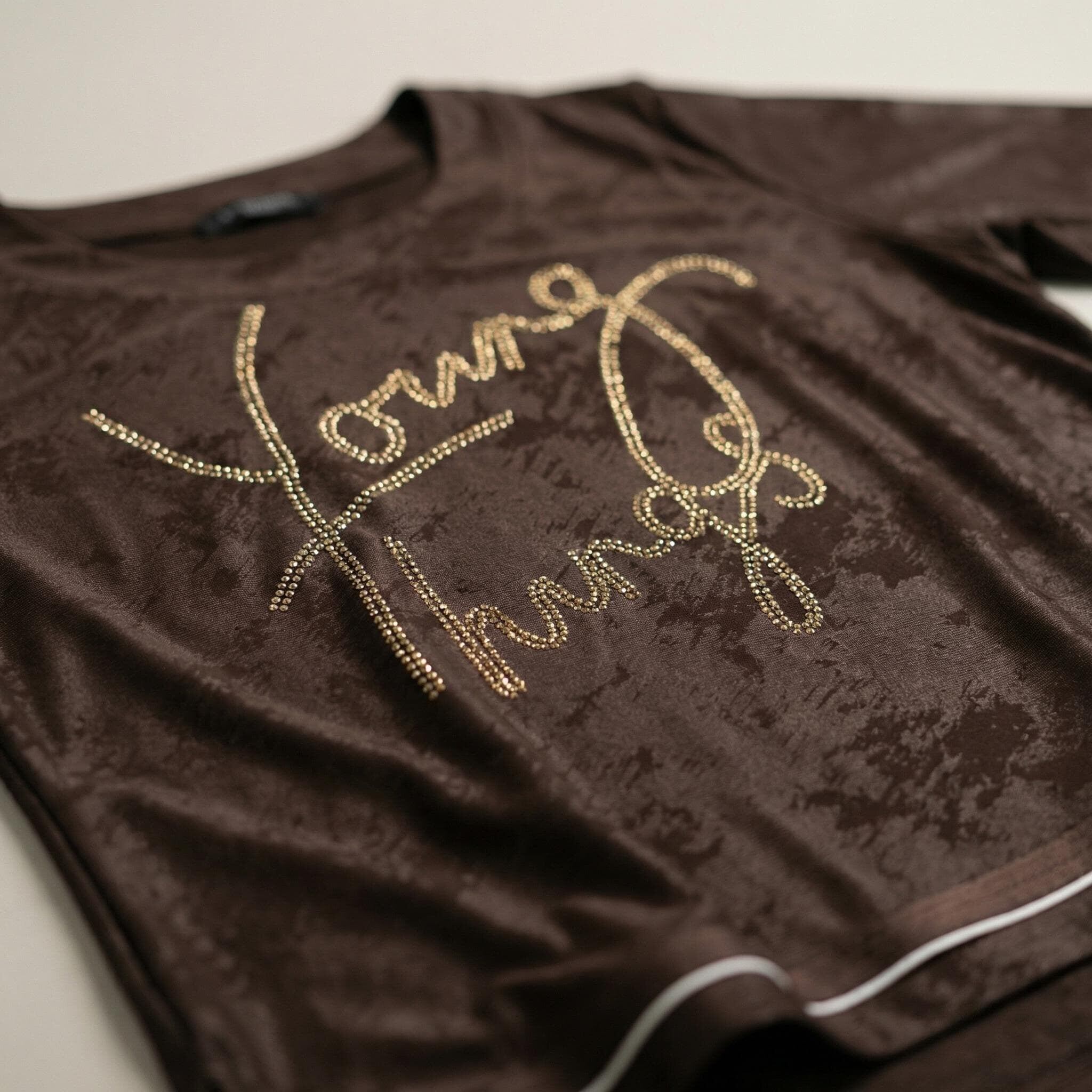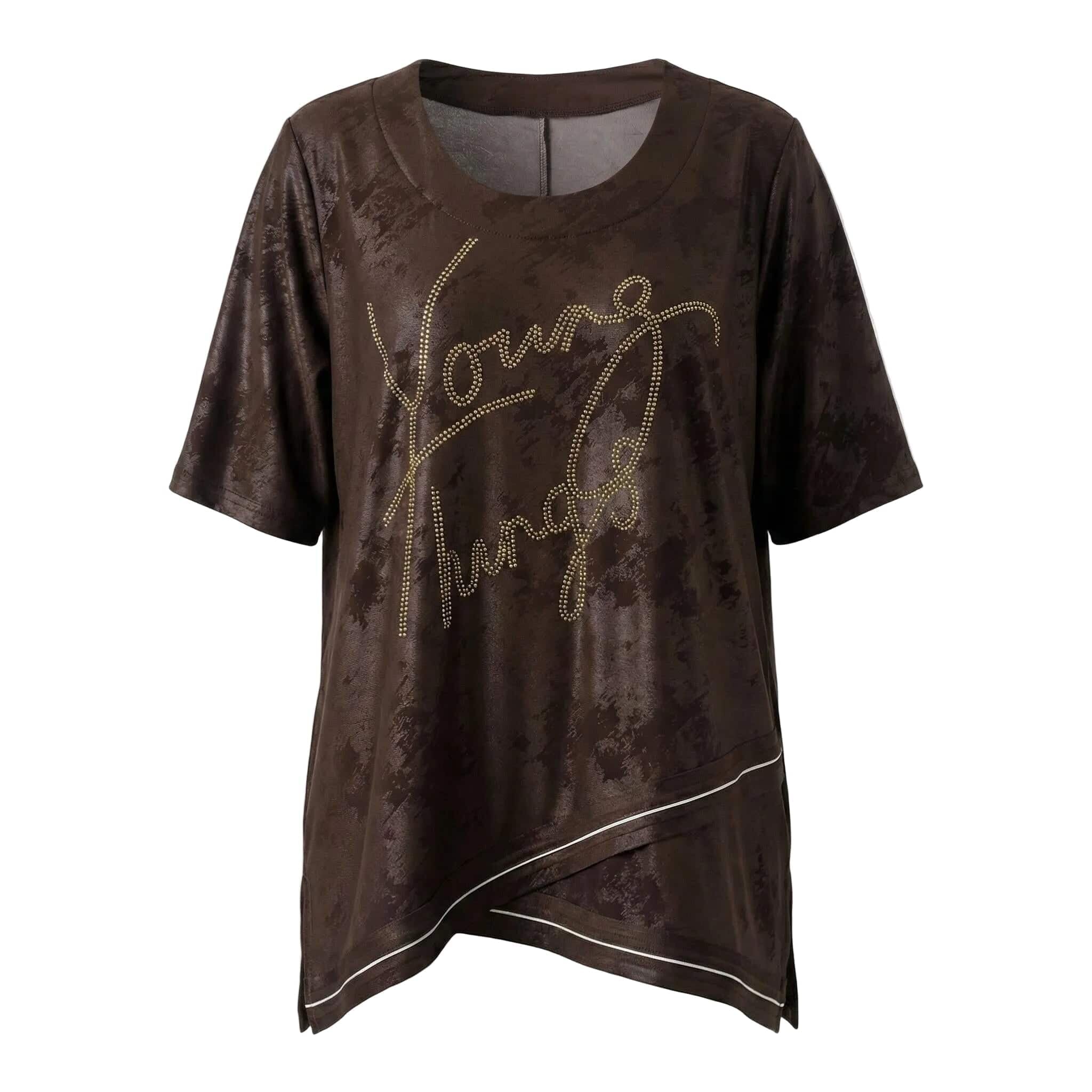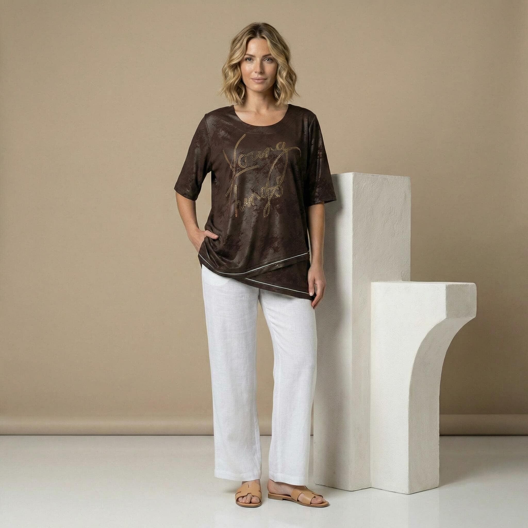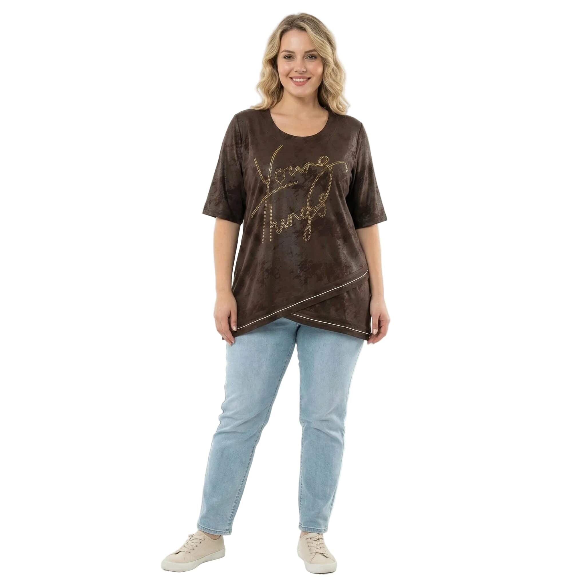 Подчертайте своята женственост и индивидуален стил с тази изискана официална макси туника в кафяво. Моделът е създаден с мисъл за дамите с пищни форми, съчетавайки безупречна елегантност и ежедневен комфорт. Изработена е от мека, еластична материя с ефектен релефен завършек и фин блясък, която пада тежко и красиво по тялото. Дизайнът се отличава с разкроена кройка, обло деколте и къси ръкави, осигуряващи пълна свобода на движение. Асиметричната предна част, акцентирана с деликатен бял кант, и бляскавият надпис от камъчета придават неповторимо очарование на дрехата. Тази туника е перфектният избор както за специални поводи, така и за стилно ежедневие, като се комбинира чудесно с елегантен панталон или любимия ви клин.