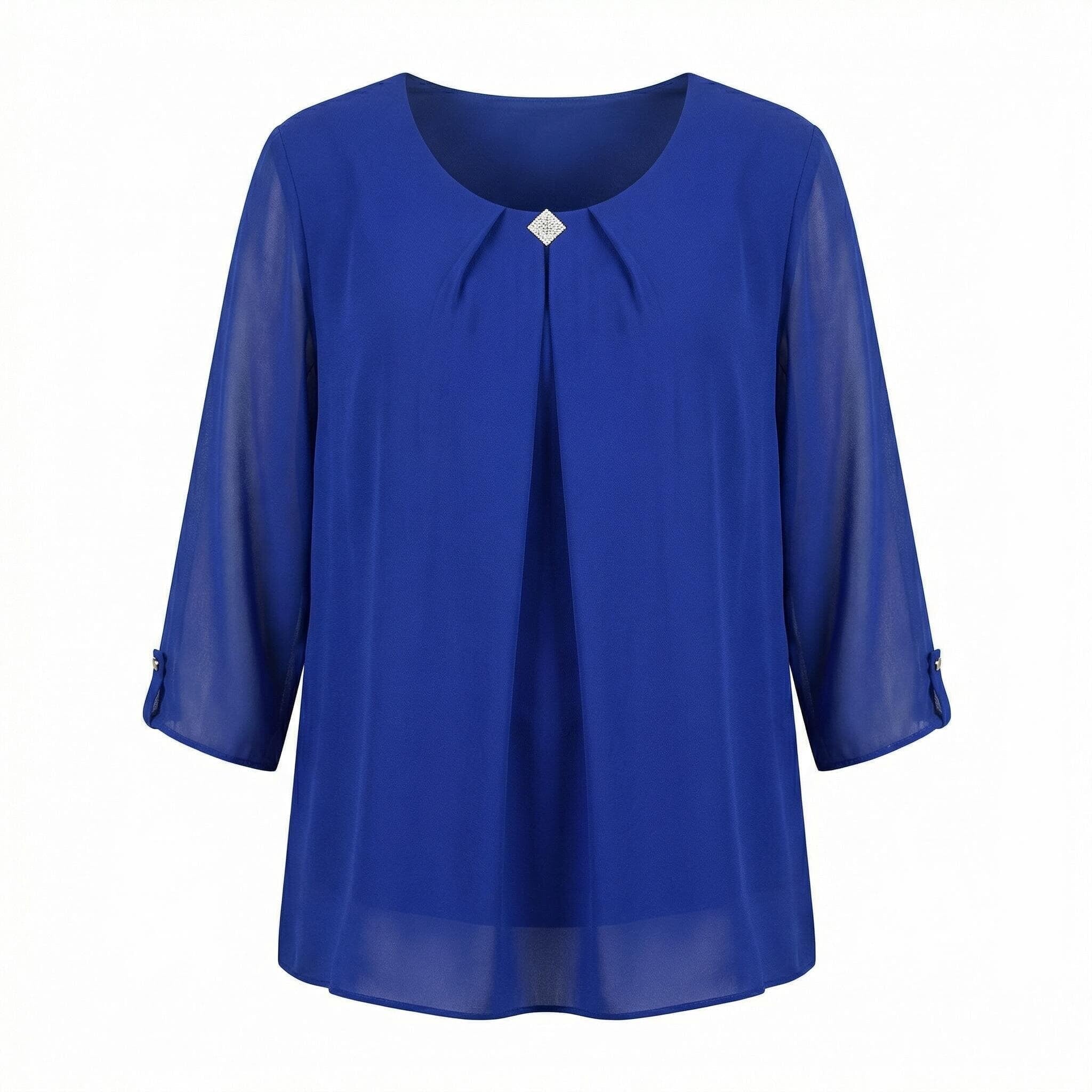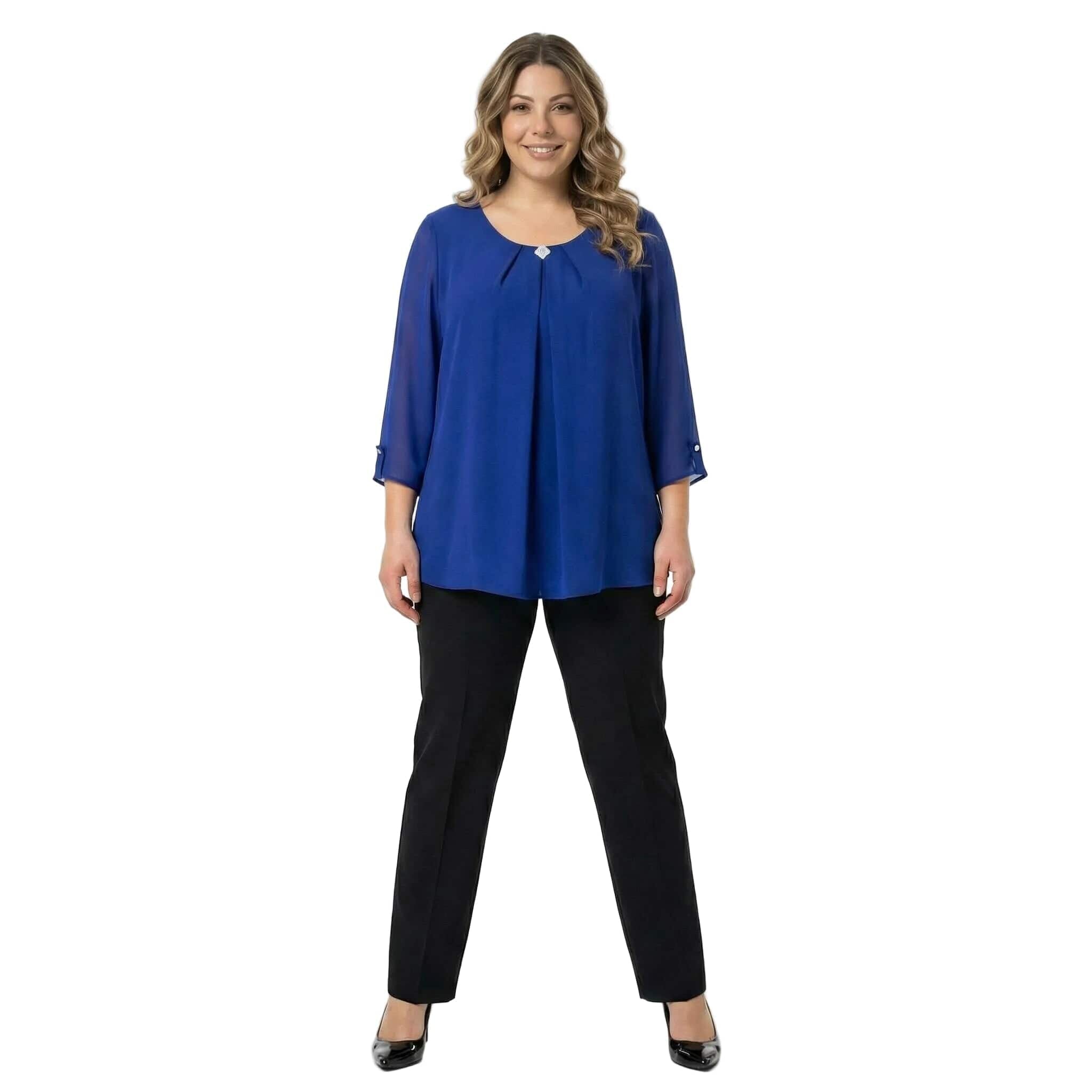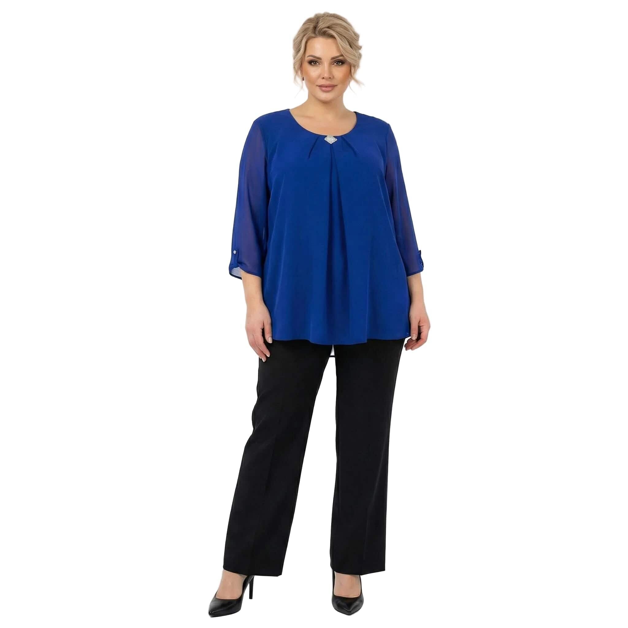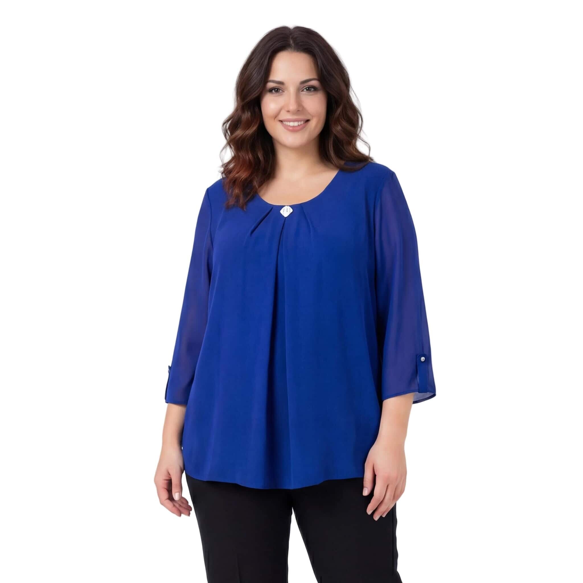 Официална разкроена туника от шифон с брошка в кралскосин цвят