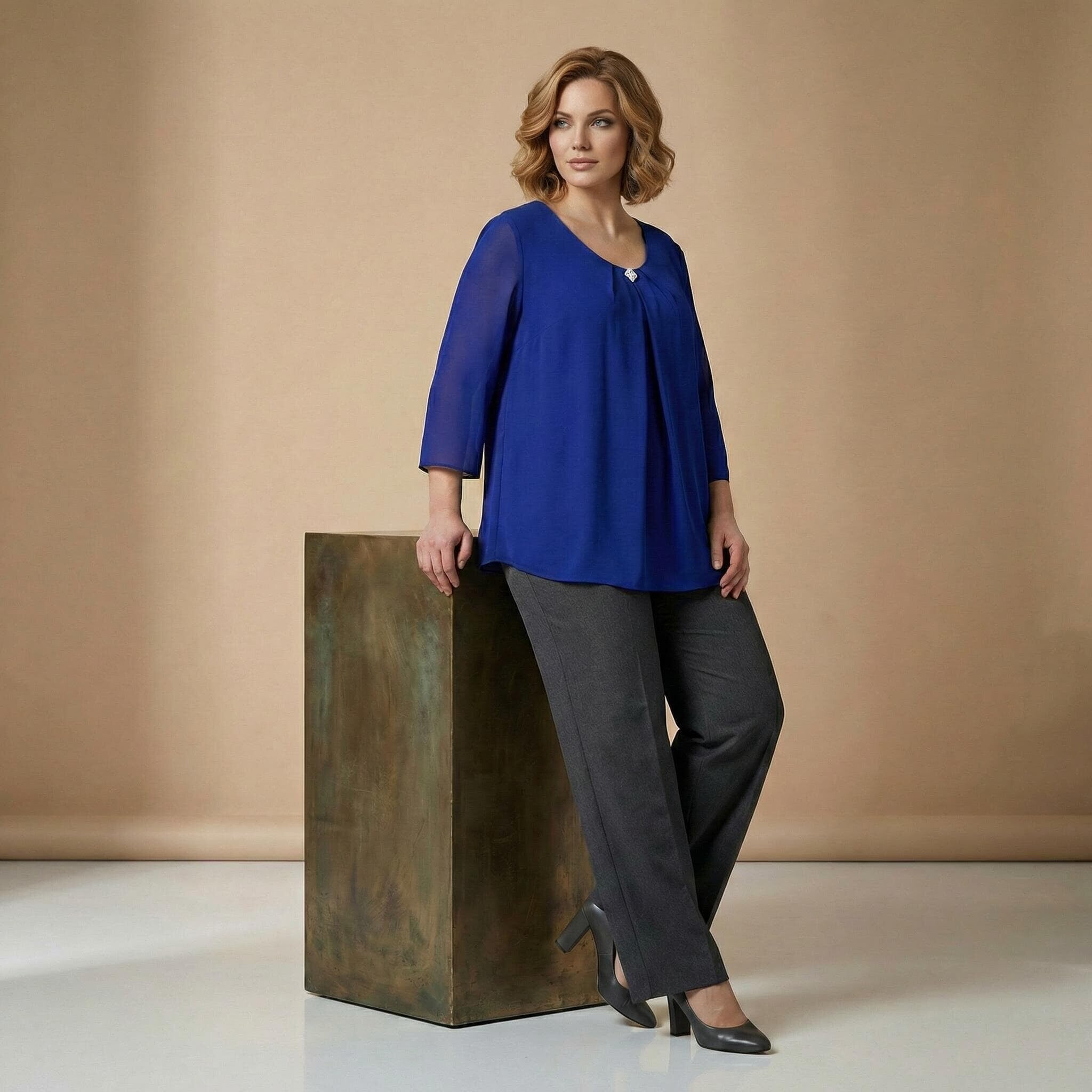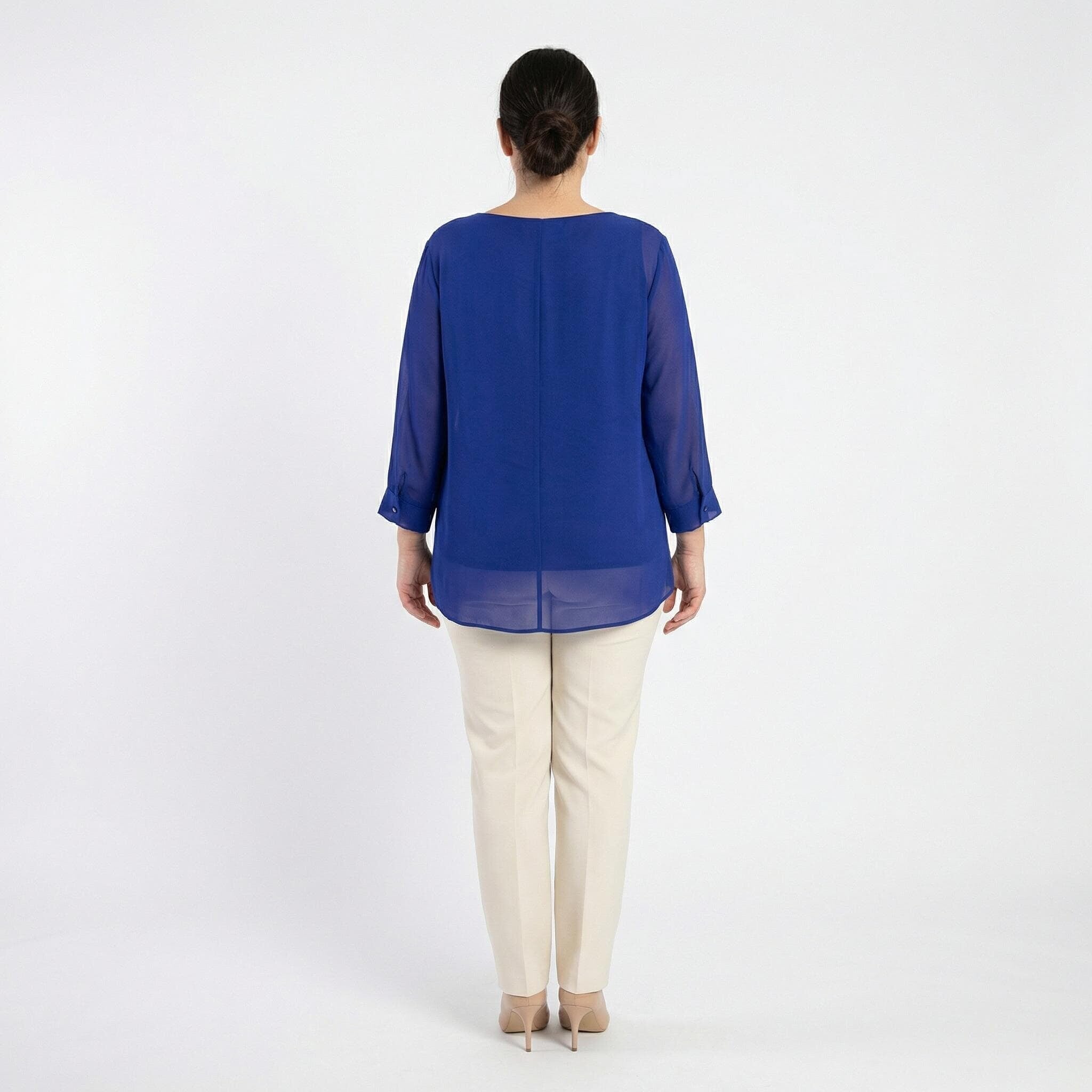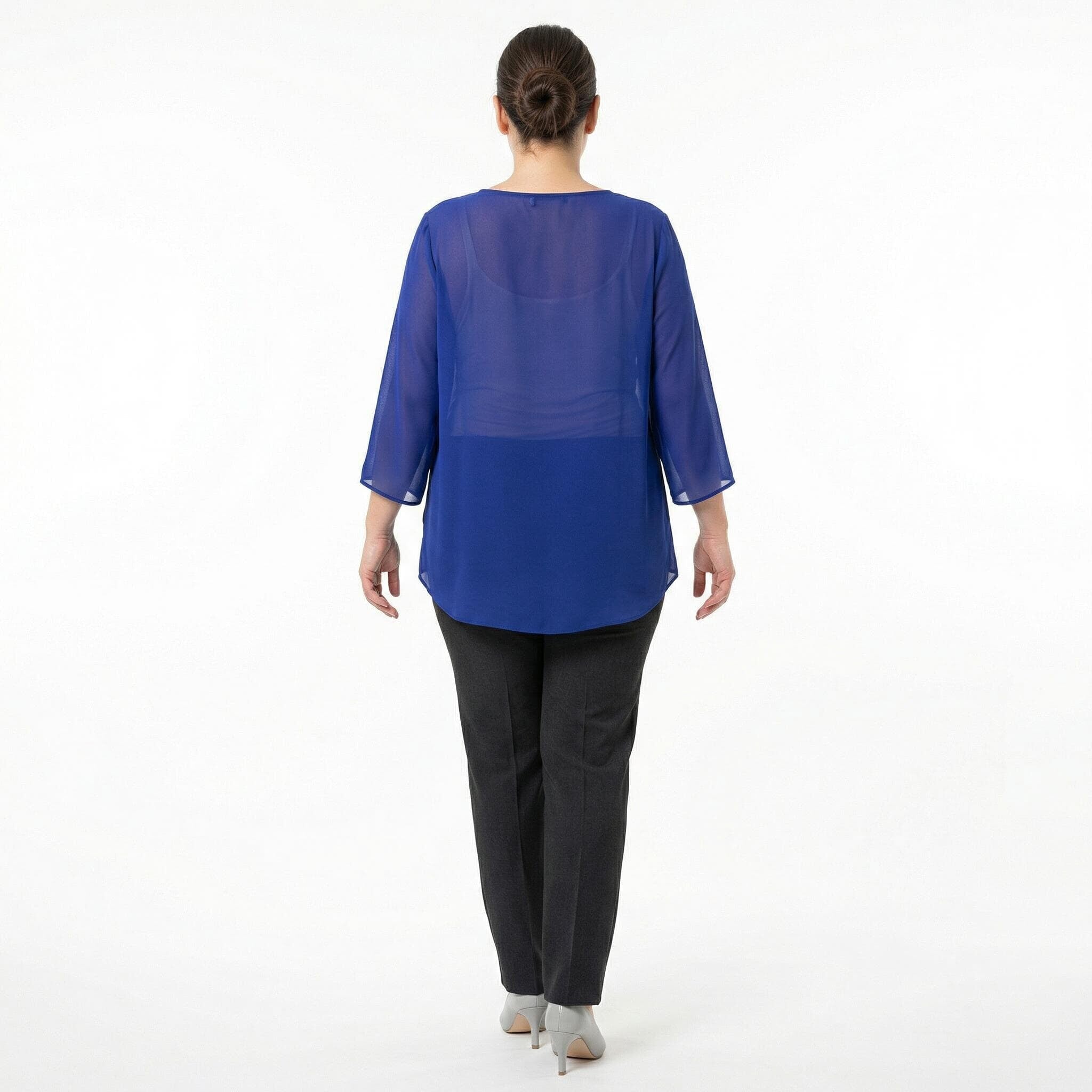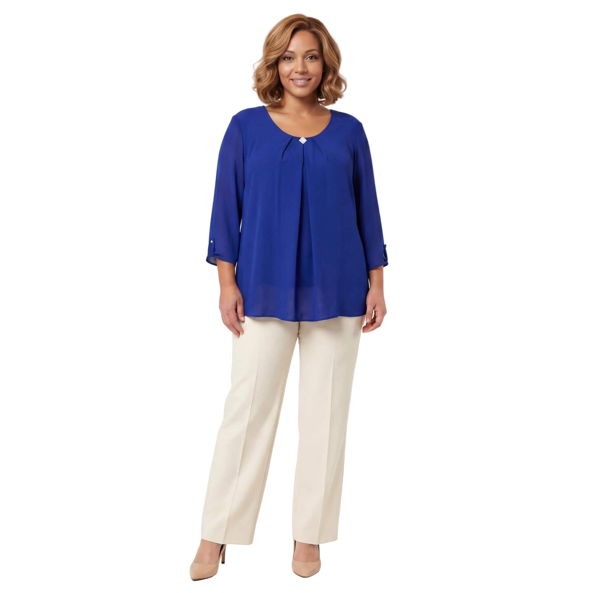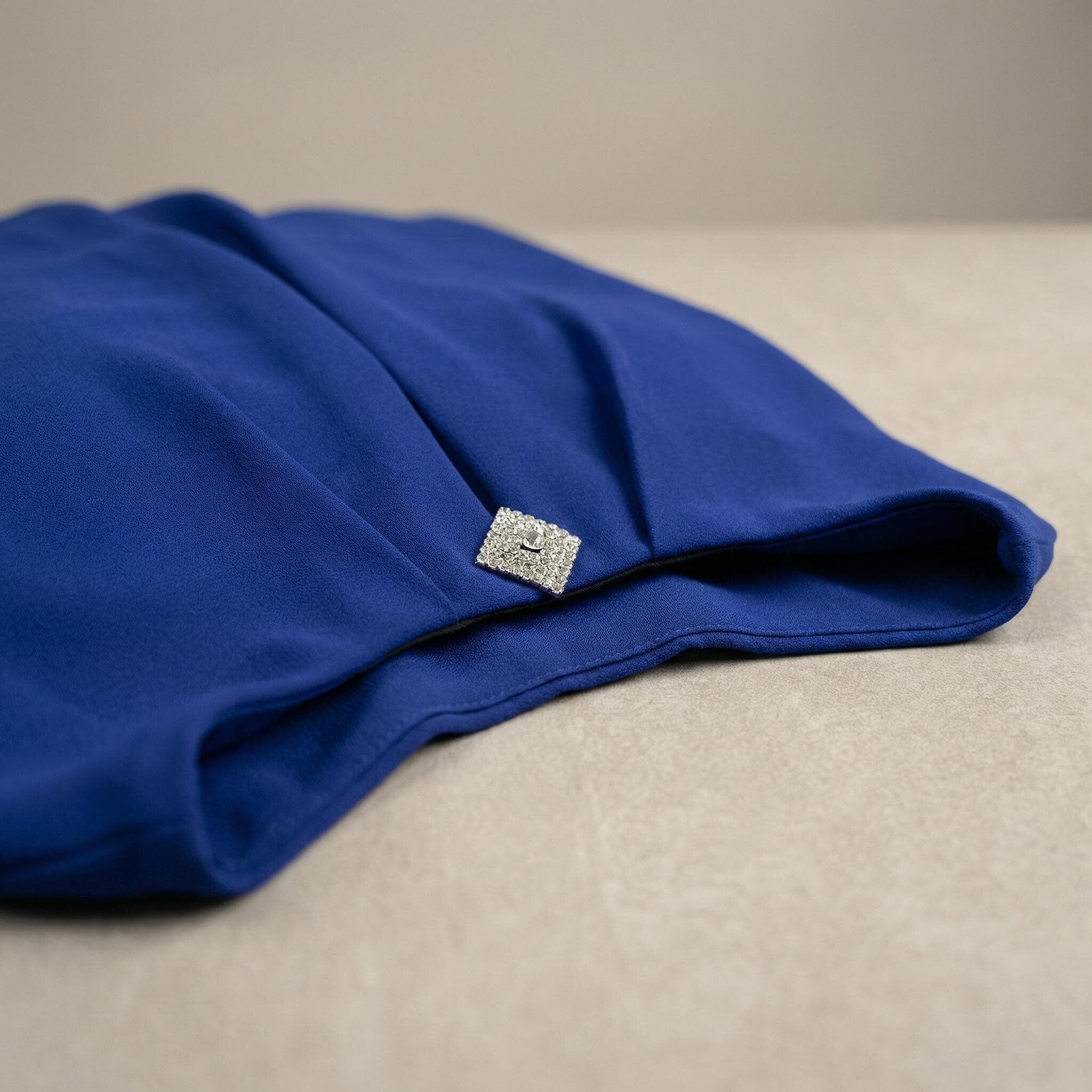 Официална разкроена туника от шифон с брошка в кралскосин цвят