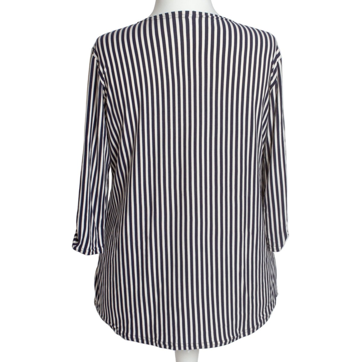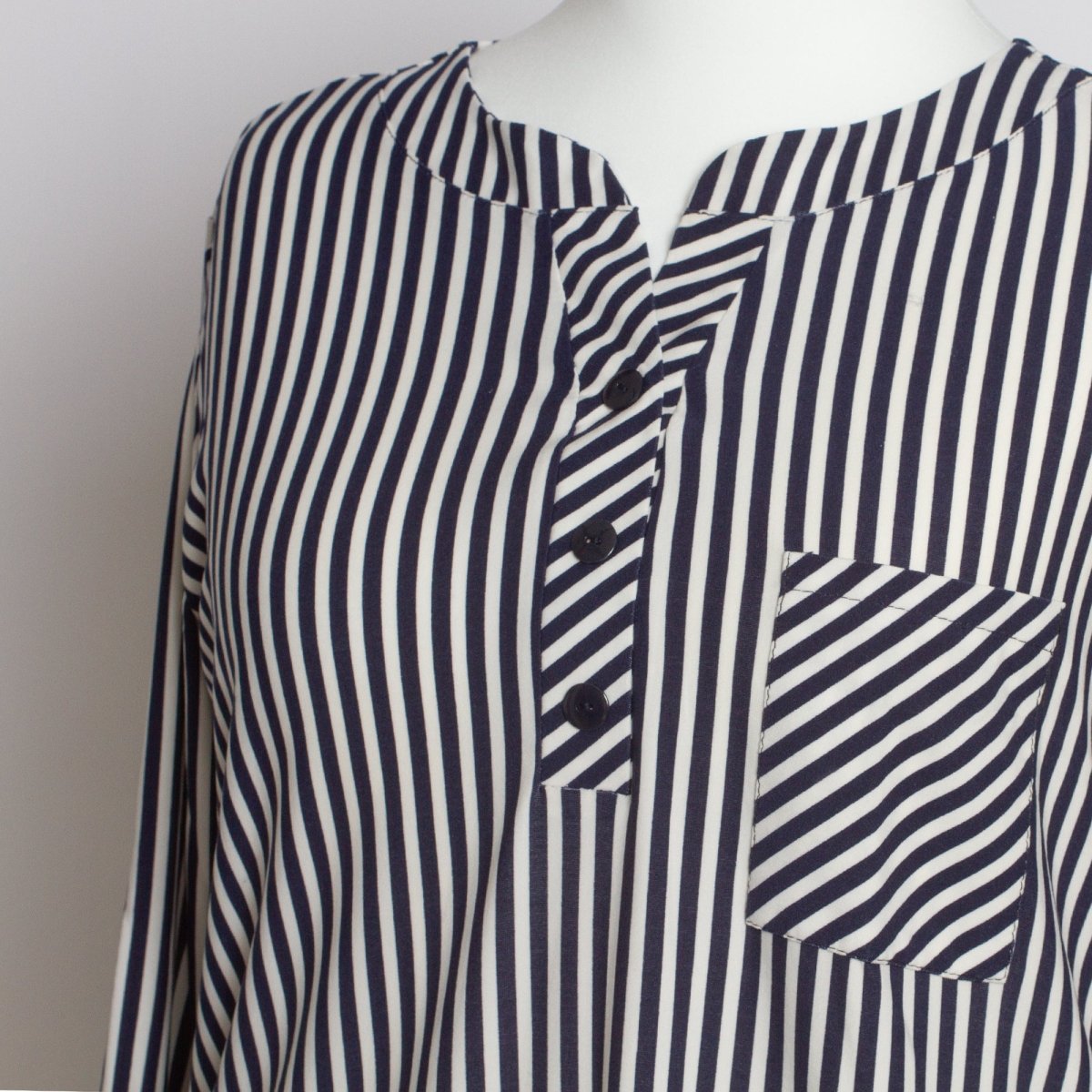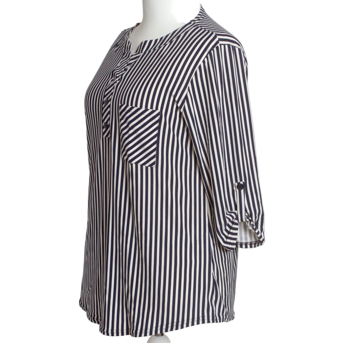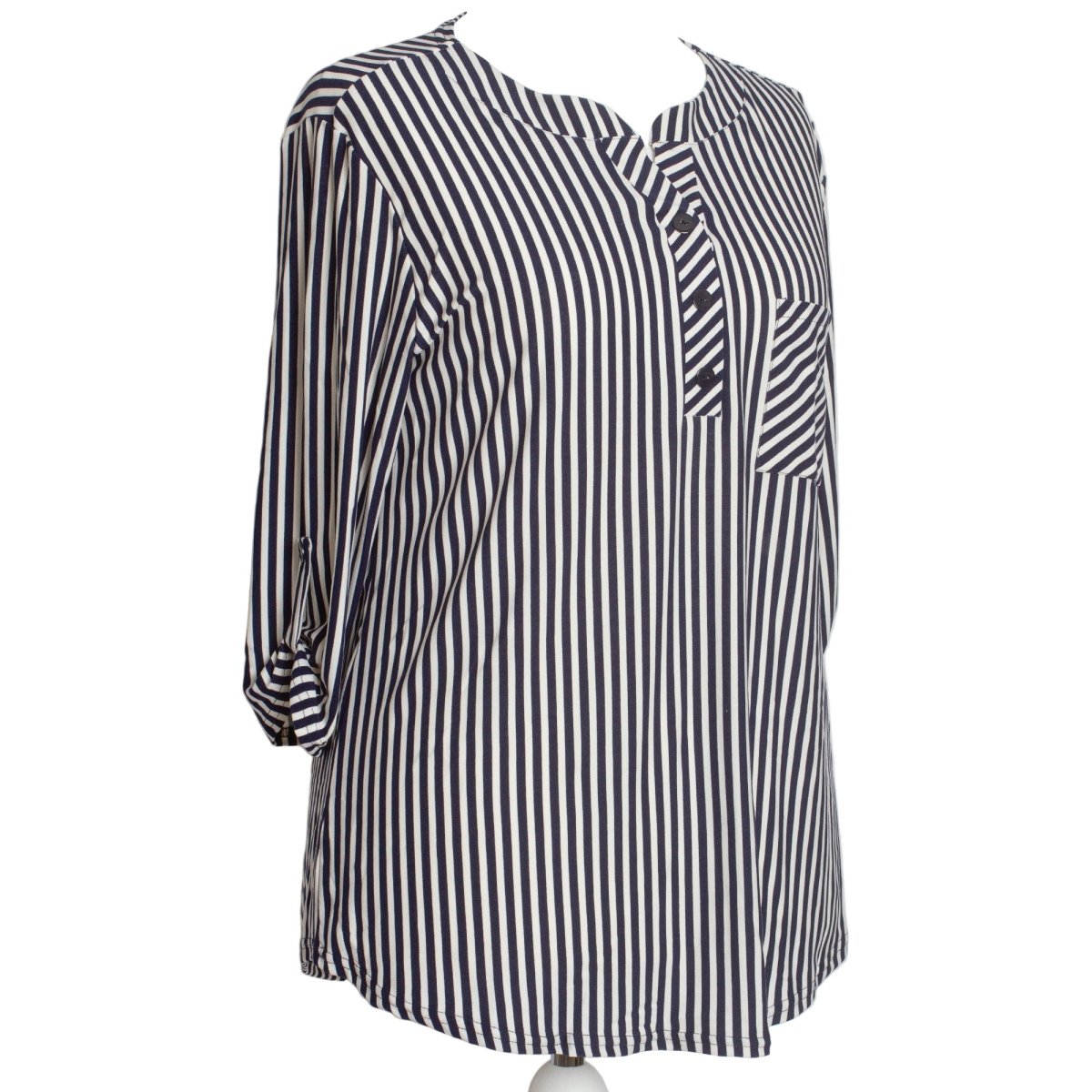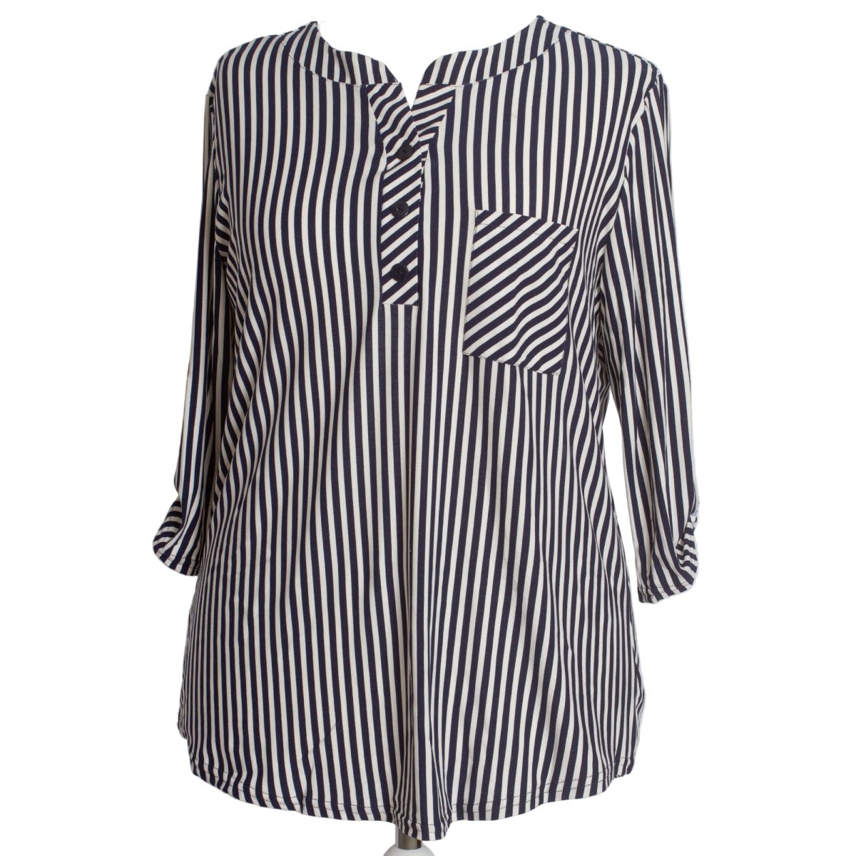 Изискана и удобна, тази официална риза от Maxi Market е идеален избор за всяка дама, търсеща стил и комфорт. Изработена от 95% Вискоза, 5% Еластан, ризата предлага нежно преливащи се сини ивици, които добавят елегантност към вашата визия. Деколтето V-образна форма омекотява силуета, а добавения джоб е практичен и модерен акцент. Перфектна за всякакви официални събития, тази риза е изработена да предложи комфорт през всички сезони. Освен това, ризата е произведена в (ЕС), което гарантира високо качество и стил, съобразен с последните модни тенденции за плюс размери.