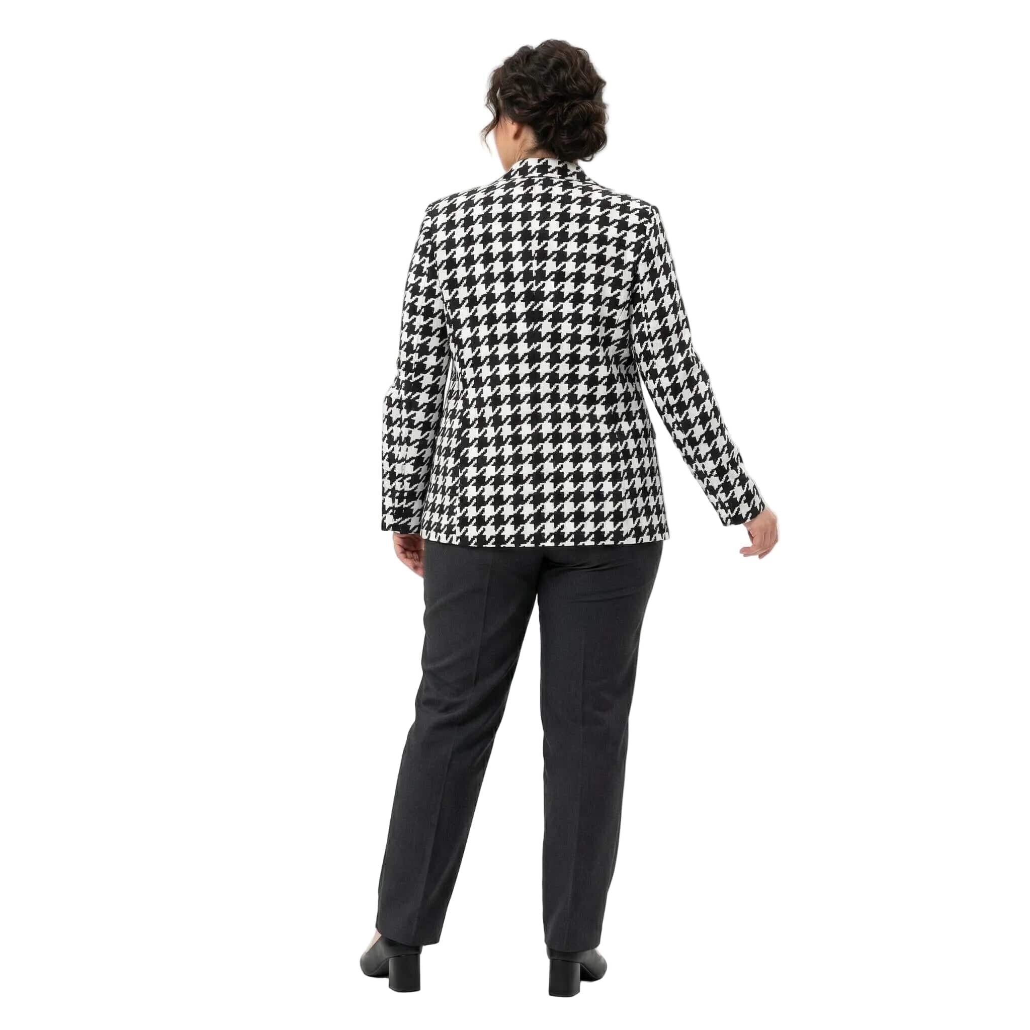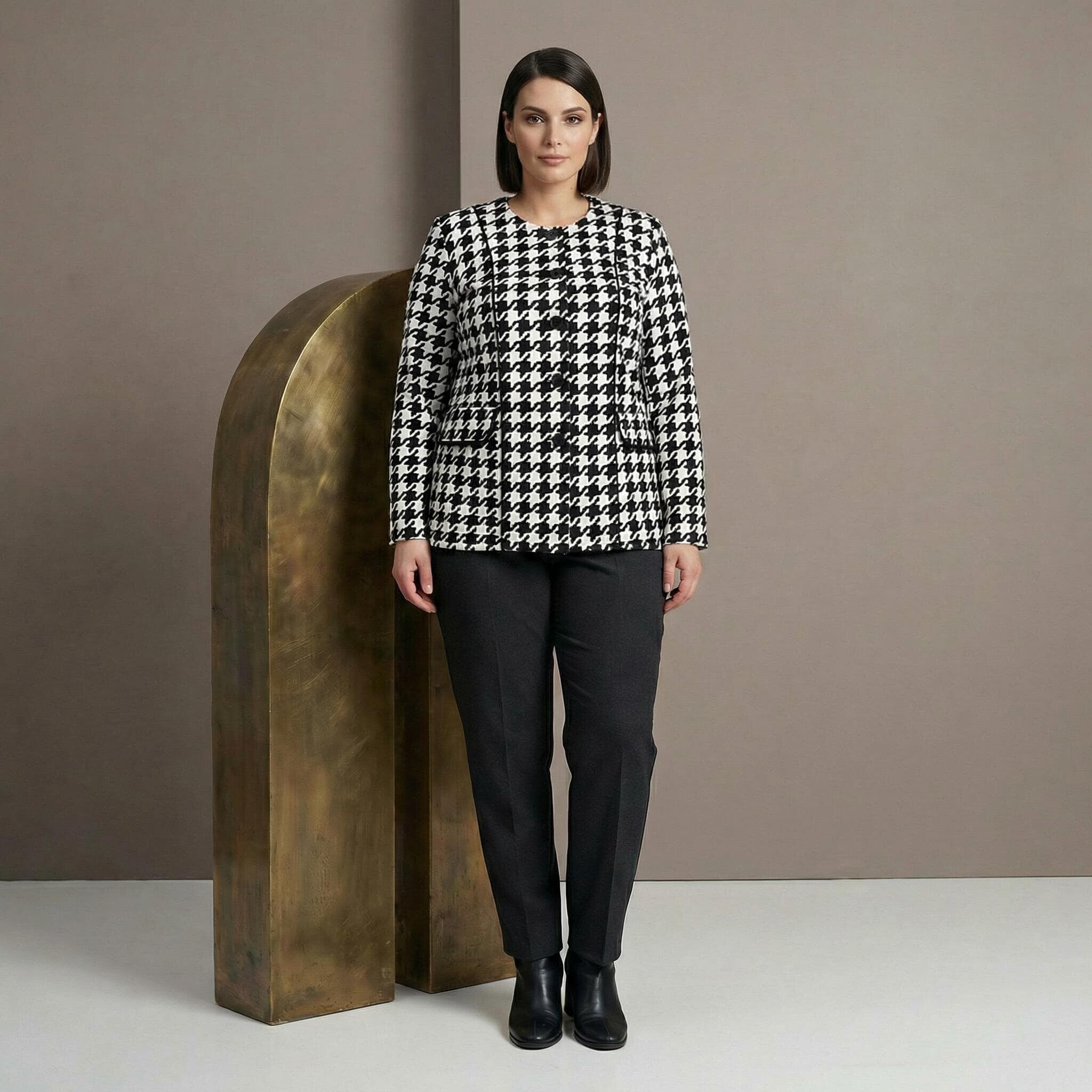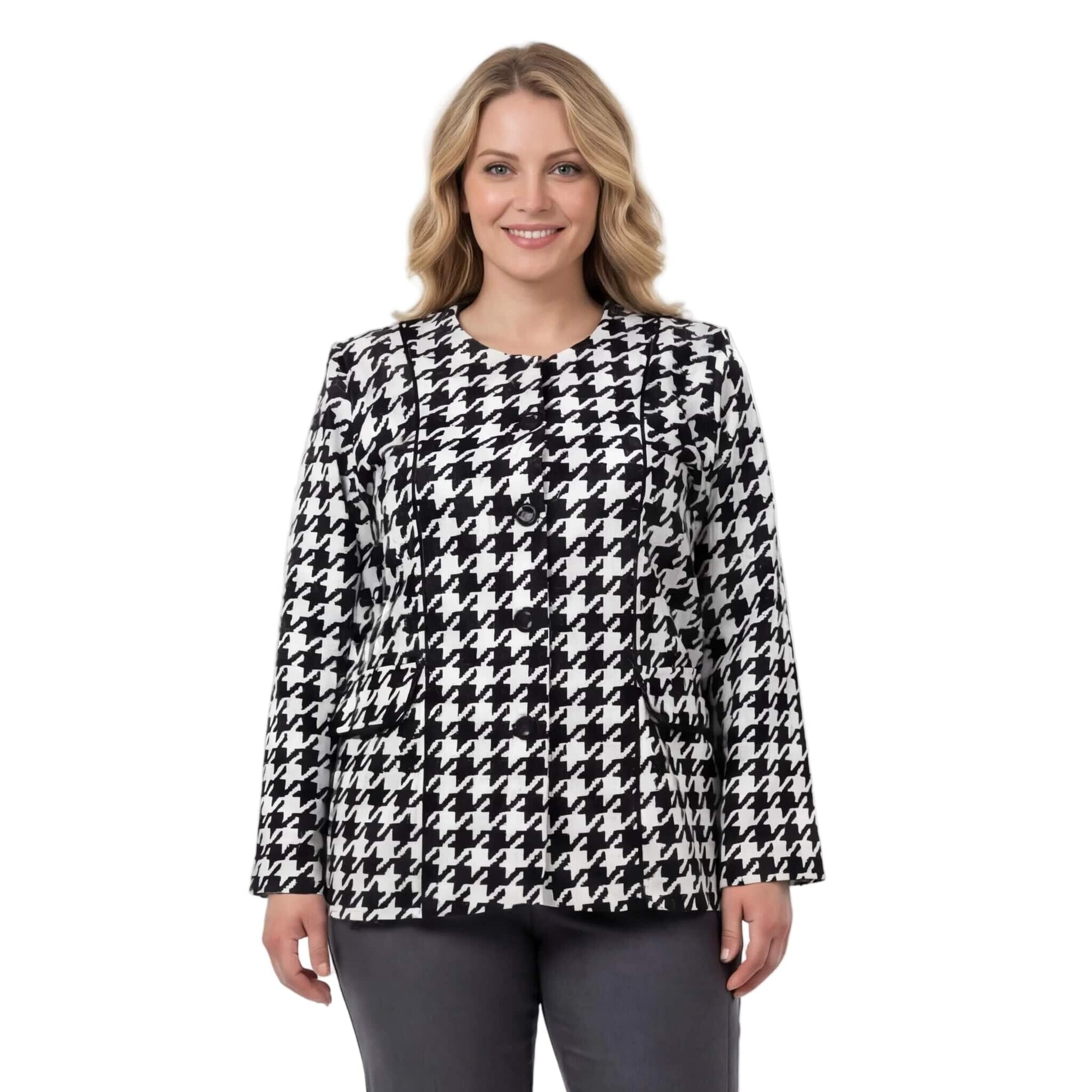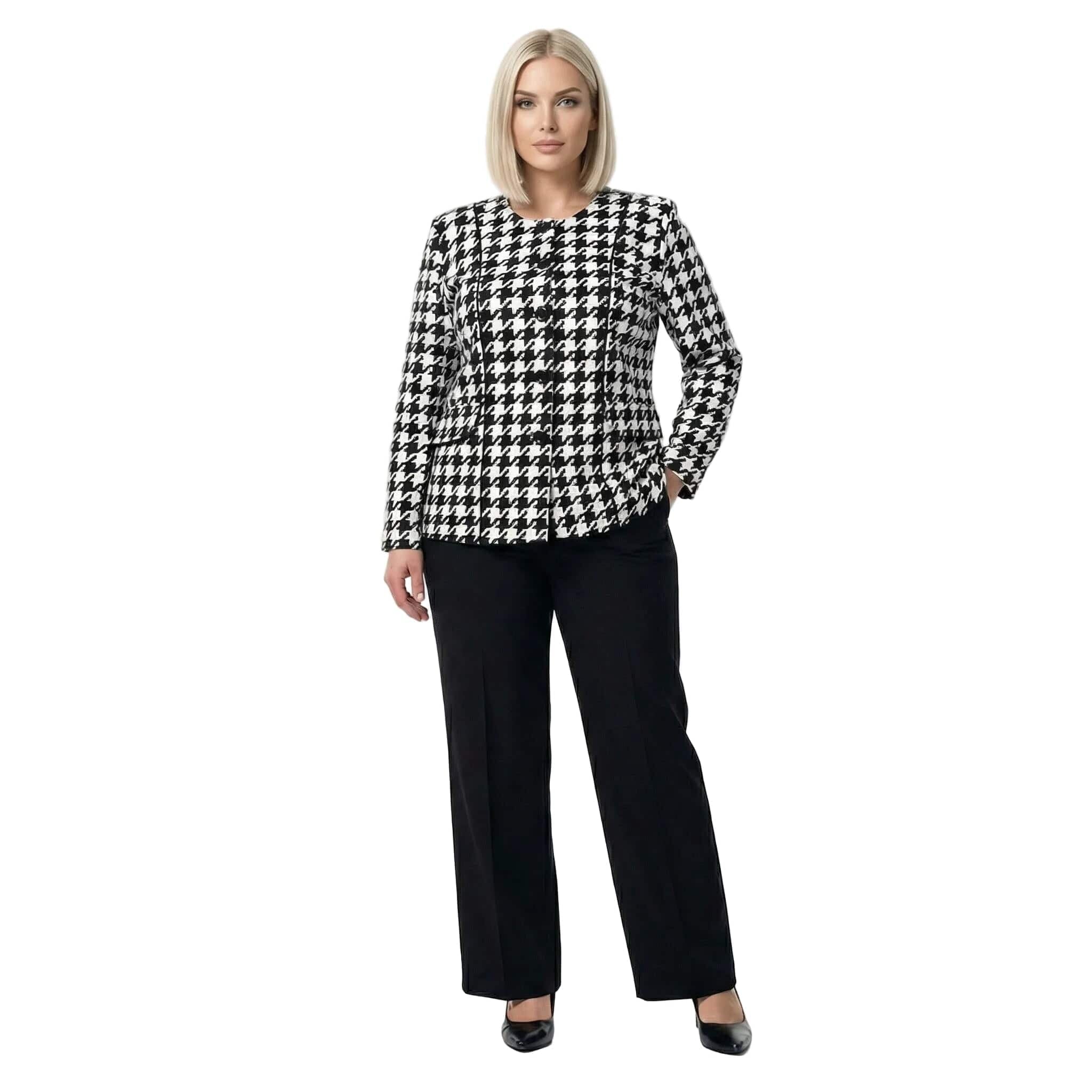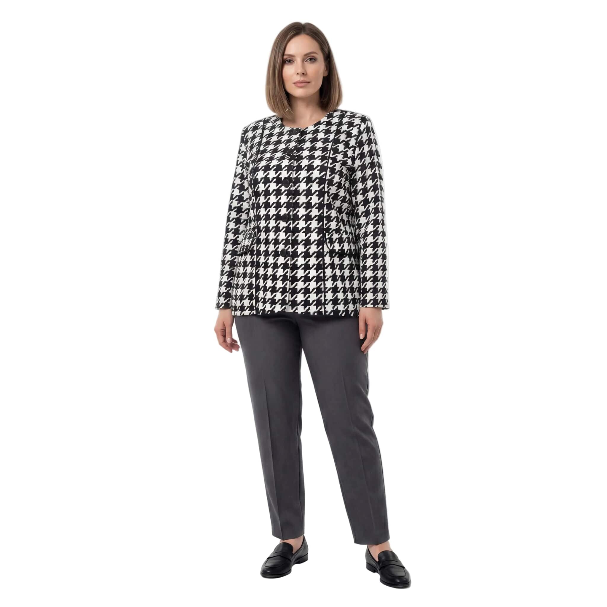 Добавете класа към гардероба си с това изискано официално дамско сако в големи размери. Моделът впечатлява с вечния десен пепит, който е символ на елегантност и стил. Изработено от мека и приятна на допир вискоза с добавен еластан, сакото предлага изключителен комфорт и свобода на движенията. Правата кройка подчертава силуета по женствен начин, а липсата на подплата го прави леко и подходящо за продължително носене. Стилните копчета и декоративните джобчета добавят завършен вид, превръщайки го в перфектния избор за официални събития или деловата визия през есенно-зимния сезон.