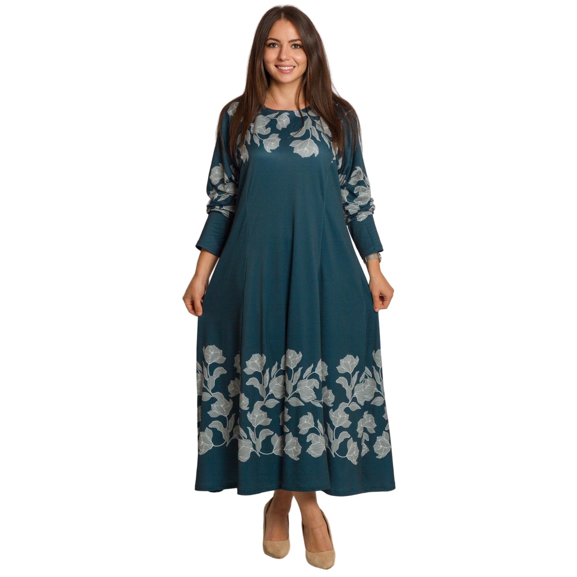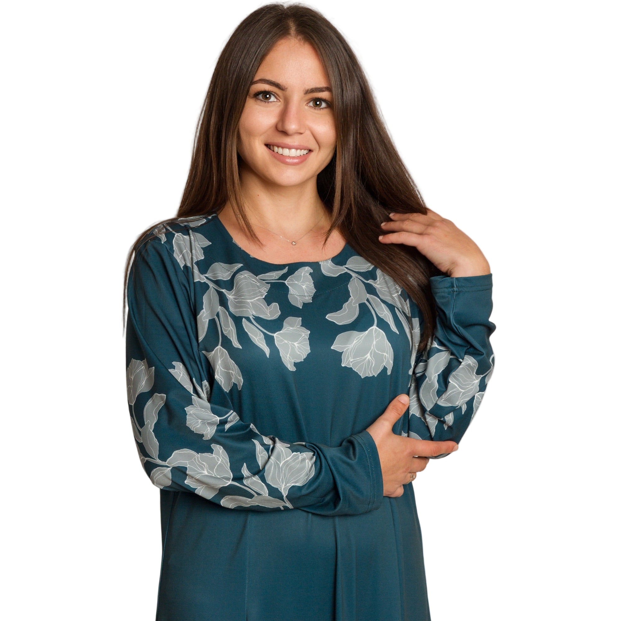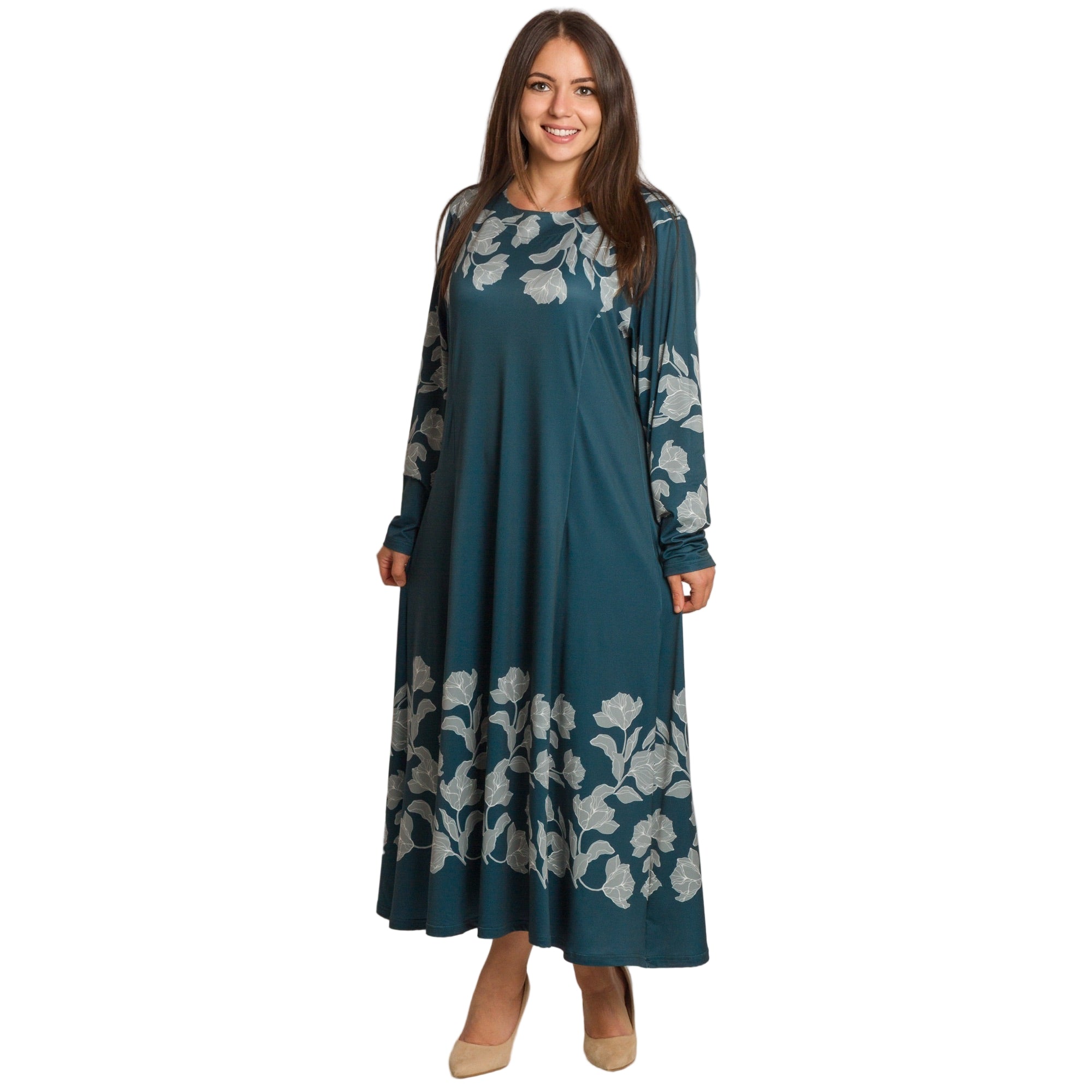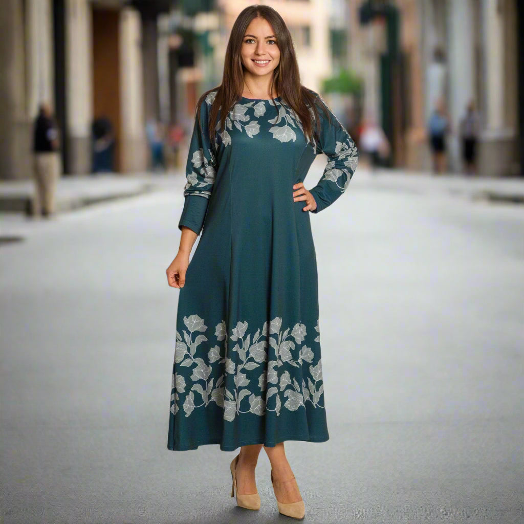 Елегантна дълга рокля в наситен петролен цвят, изработена от мека и еластична материя с високо съдържание на полиестер и ликра. Моделът е с обло деколте и дълги ръкави, украсени с контрастни флорални мотиви в светлосиво. Разкроената кройка осигурява свобода на движението и комфорт, а дължината до глезена придава изтънчен и женствен силует. Подходяща е както за ежедневието, така и за официални поводи през есенно-зимния сезон.