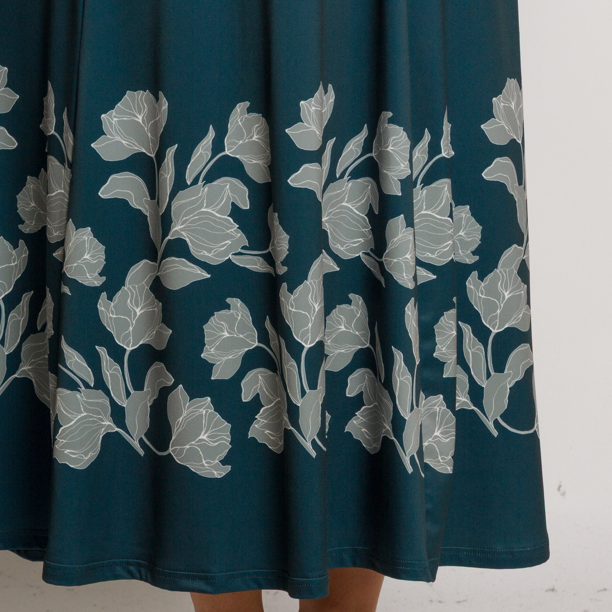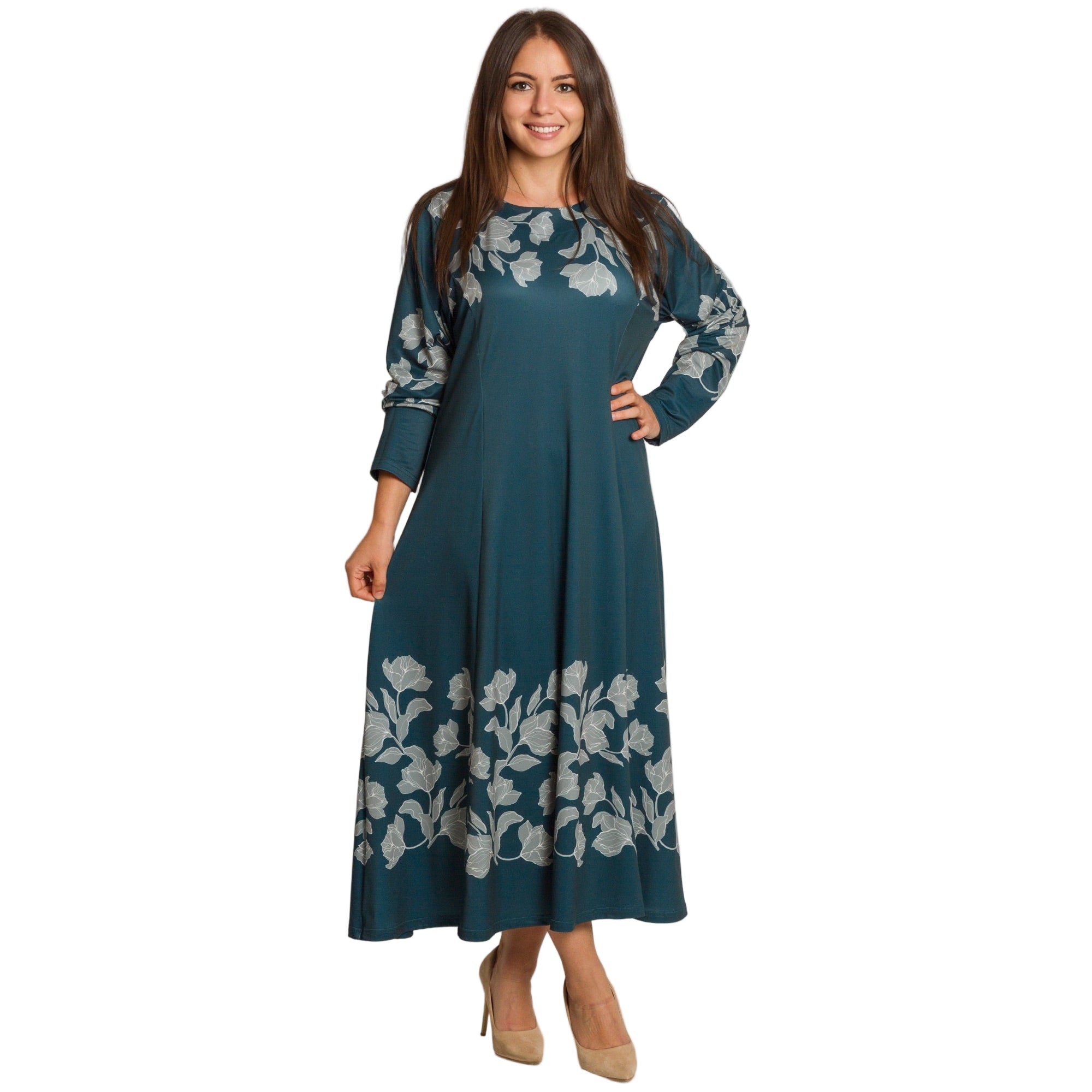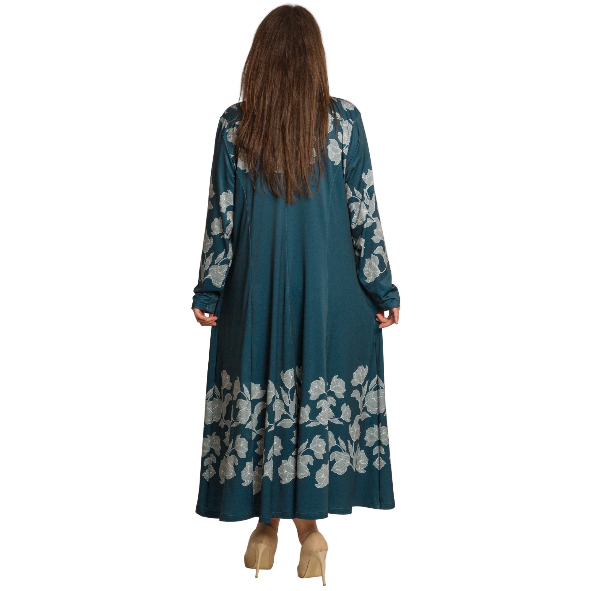 Елегантна дълга рокля в наситен петролен цвят, изработена от мека и еластична материя с високо съдържание на полиестер и ликра. Моделът е с обло деколте и дълги ръкави, украсени с контрастни флорални мотиви в светлосиво. Разкроената кройка осигурява свобода на движението и комфорт, а дължината до глезена придава изтънчен и женствен силует. Подходяща е както за ежедневието, така и за официални поводи през есенно-зимния сезон.