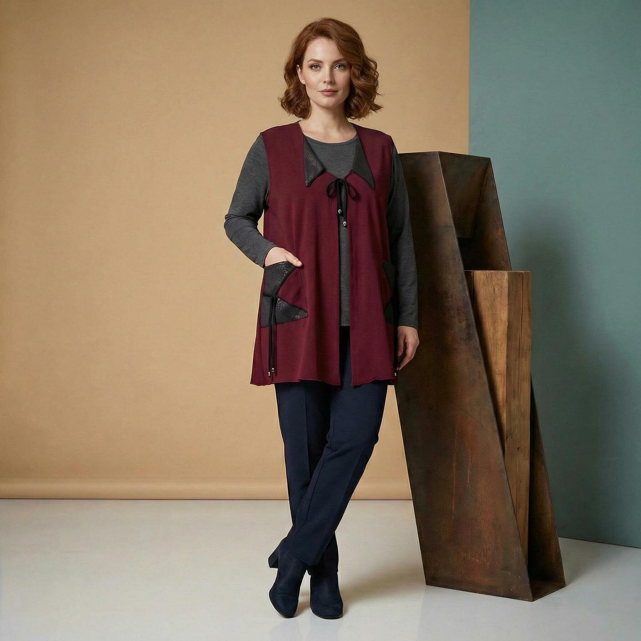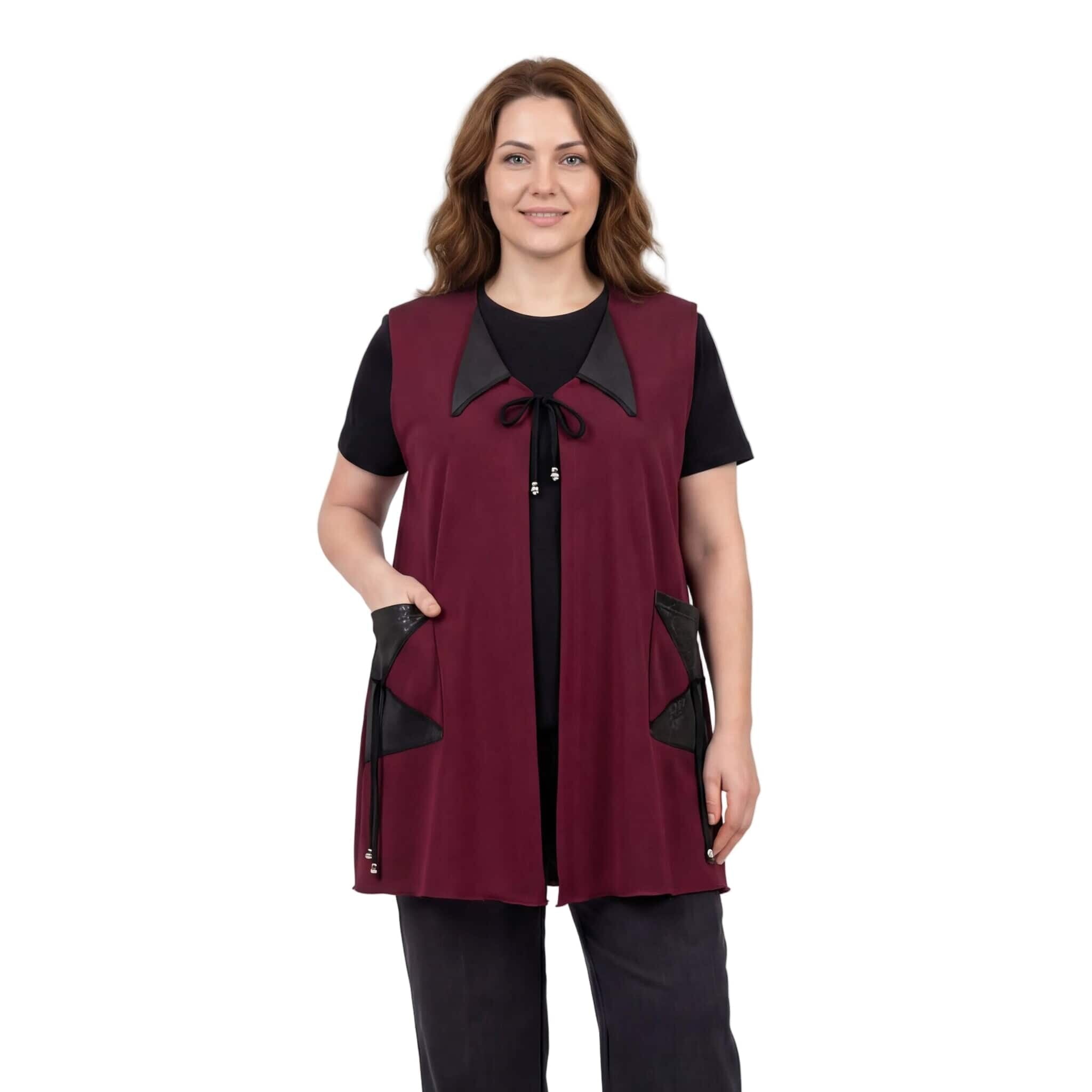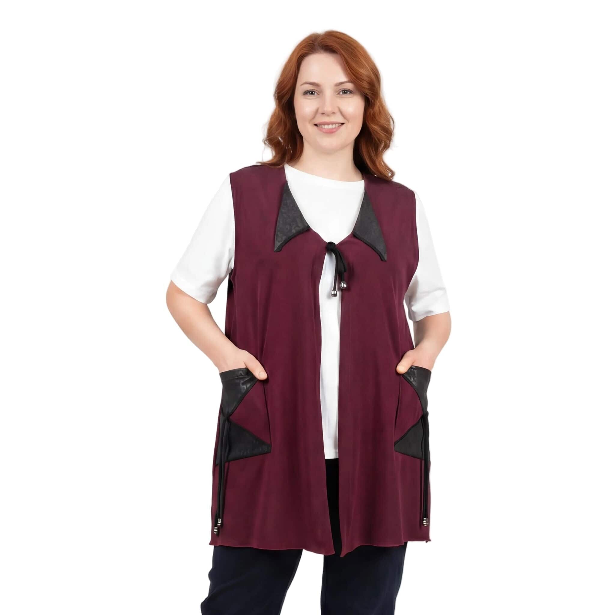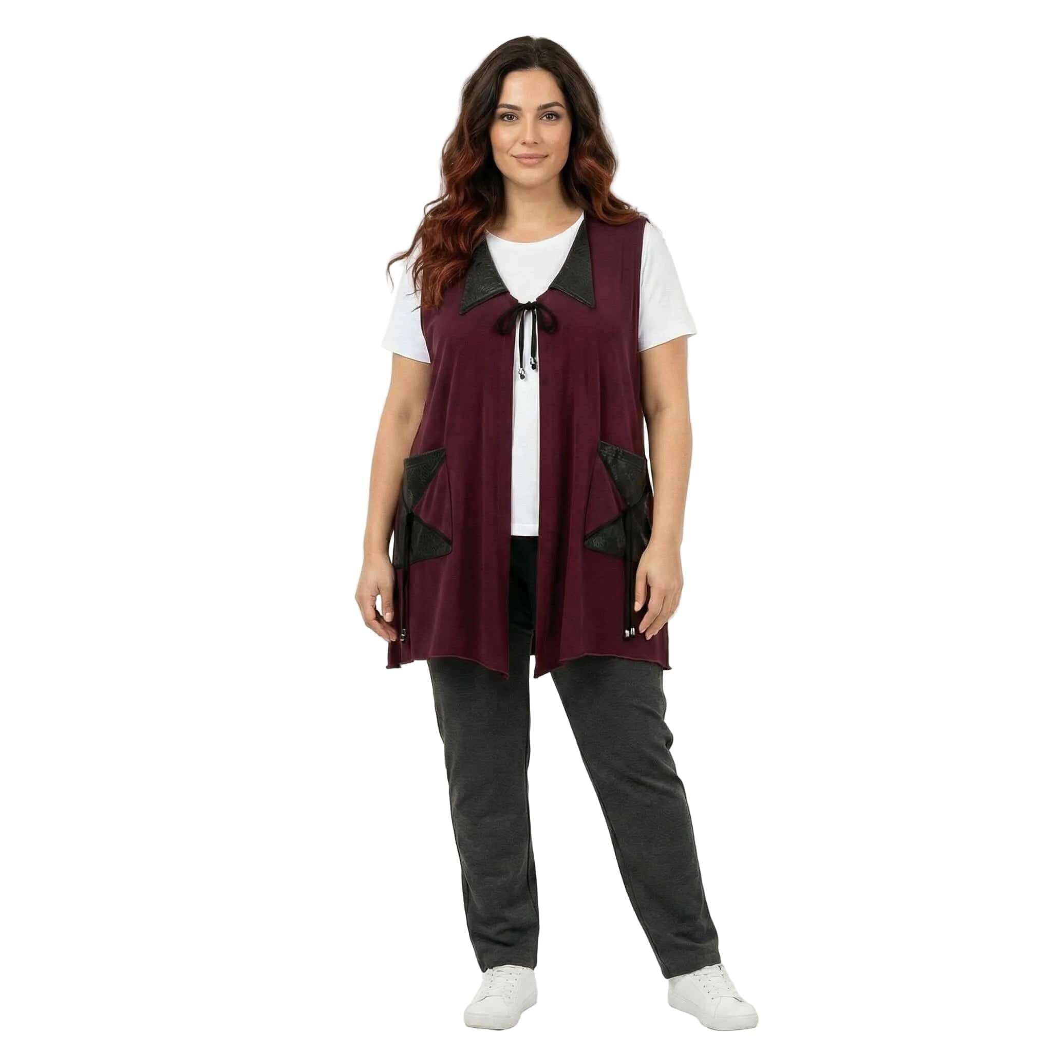 Добавете нотка изисканост и модерен стил към есенния си гардероб с този елегантен макси елек в наситен цвят бордо. Моделът е специално създаден за дами с пищни форми, като комбинира мекотата на висококачествената вискоза с дързостта на елементите от текстурирана еко кожа. Свободната, разкроена кройка пада тежко и грациозно, осигурявайки ненадминат комфорт и свобода на движението. Дизайнът е обогатен с функционални джобове с кожени капаци и стилно закопчаване с връзки, завършващи с фини метални накрайници. Тази дреха е идеалното допълнение към вашата ежедневна или офис визия, съчетавайки класическа елегантност с актуални модни тенденции.