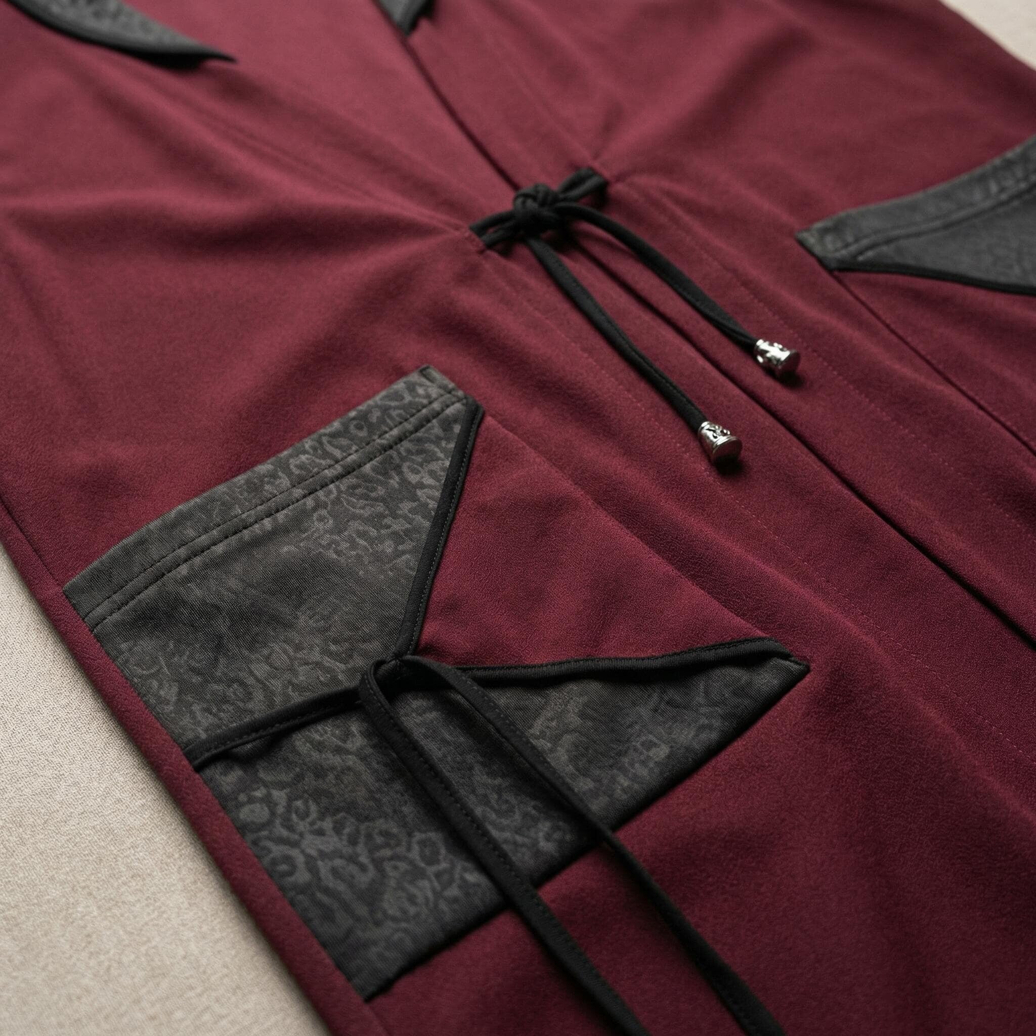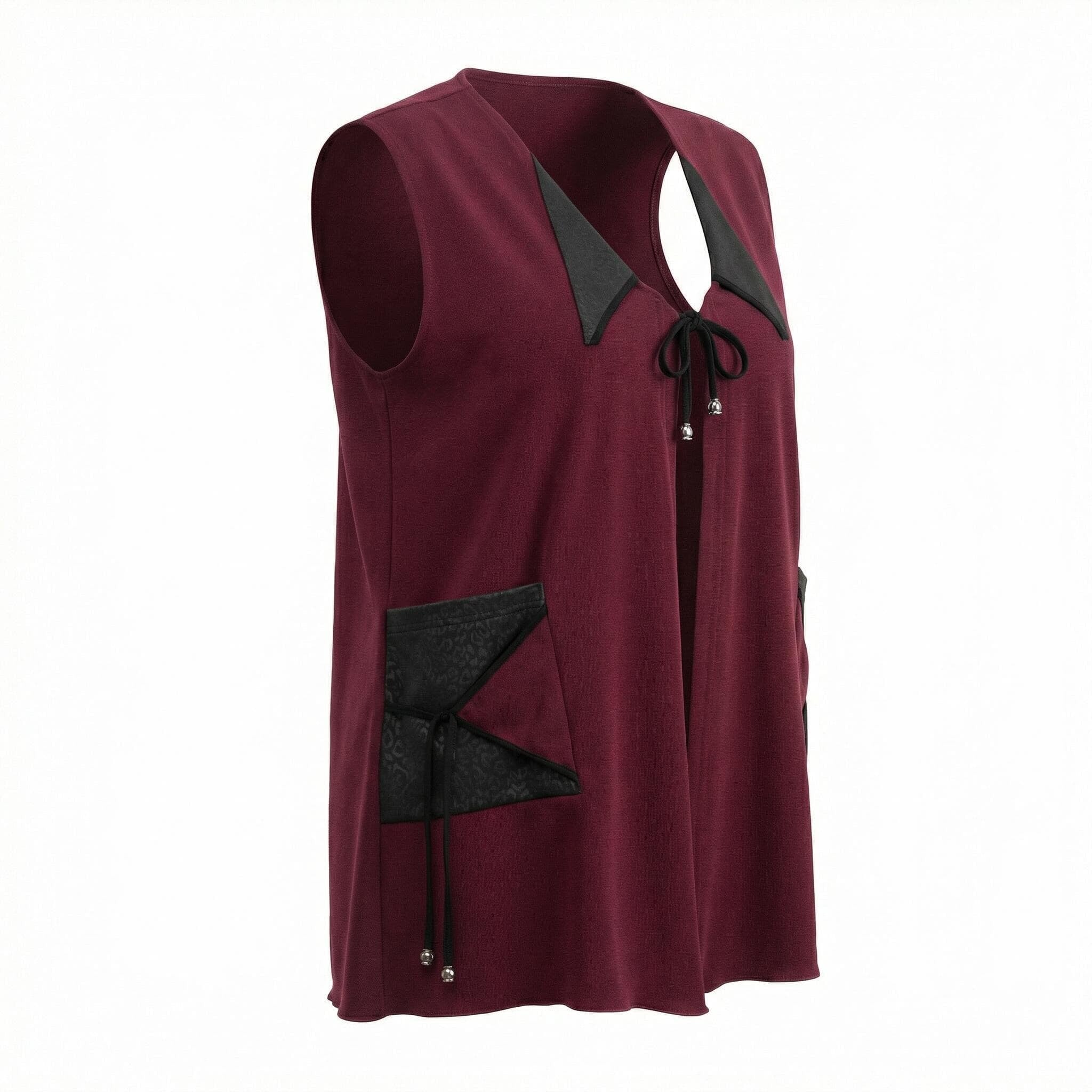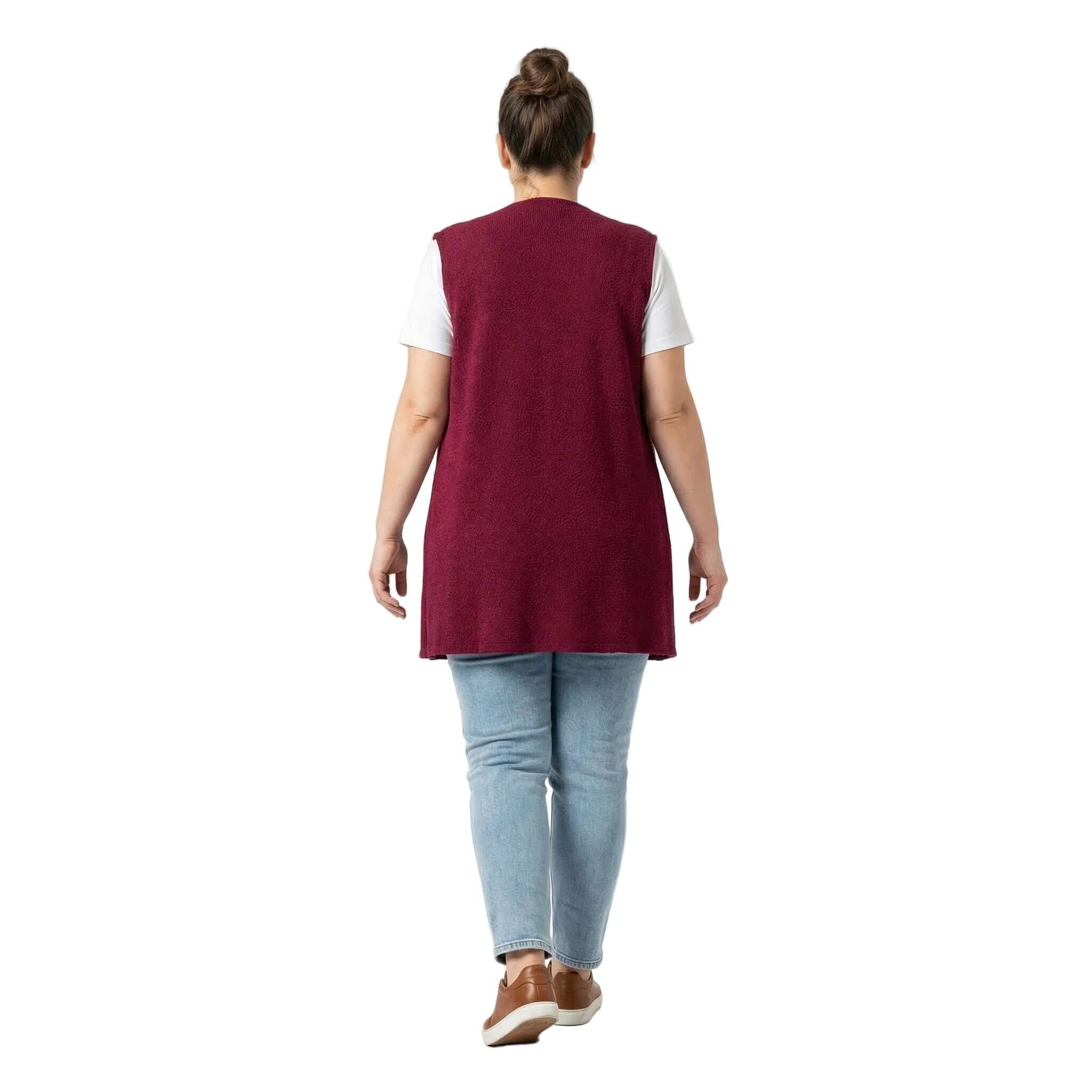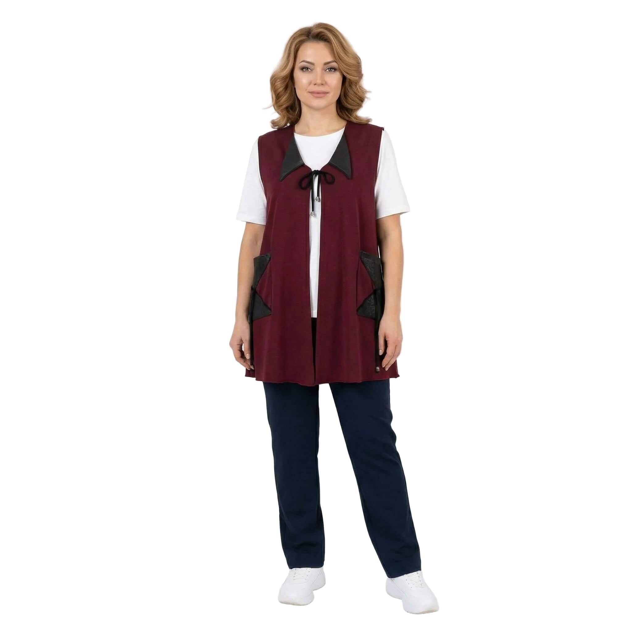 Добавете нотка изисканост и модерен стил към есенния си гардероб с този елегантен макси елек в наситен цвят бордо. Моделът е специално създаден за дами с пищни форми, като комбинира мекотата на висококачествената вискоза с дързостта на елементите от текстурирана еко кожа. Свободната, разкроена кройка пада тежко и грациозно, осигурявайки ненадминат комфорт и свобода на движението. Дизайнът е обогатен с функционални джобове с кожени капаци и стилно закопчаване с връзки, завършващи с фини метални накрайници. Тази дреха е идеалното допълнение към вашата ежедневна или офис визия, съчетавайки класическа елегантност с актуални модни тенденции.