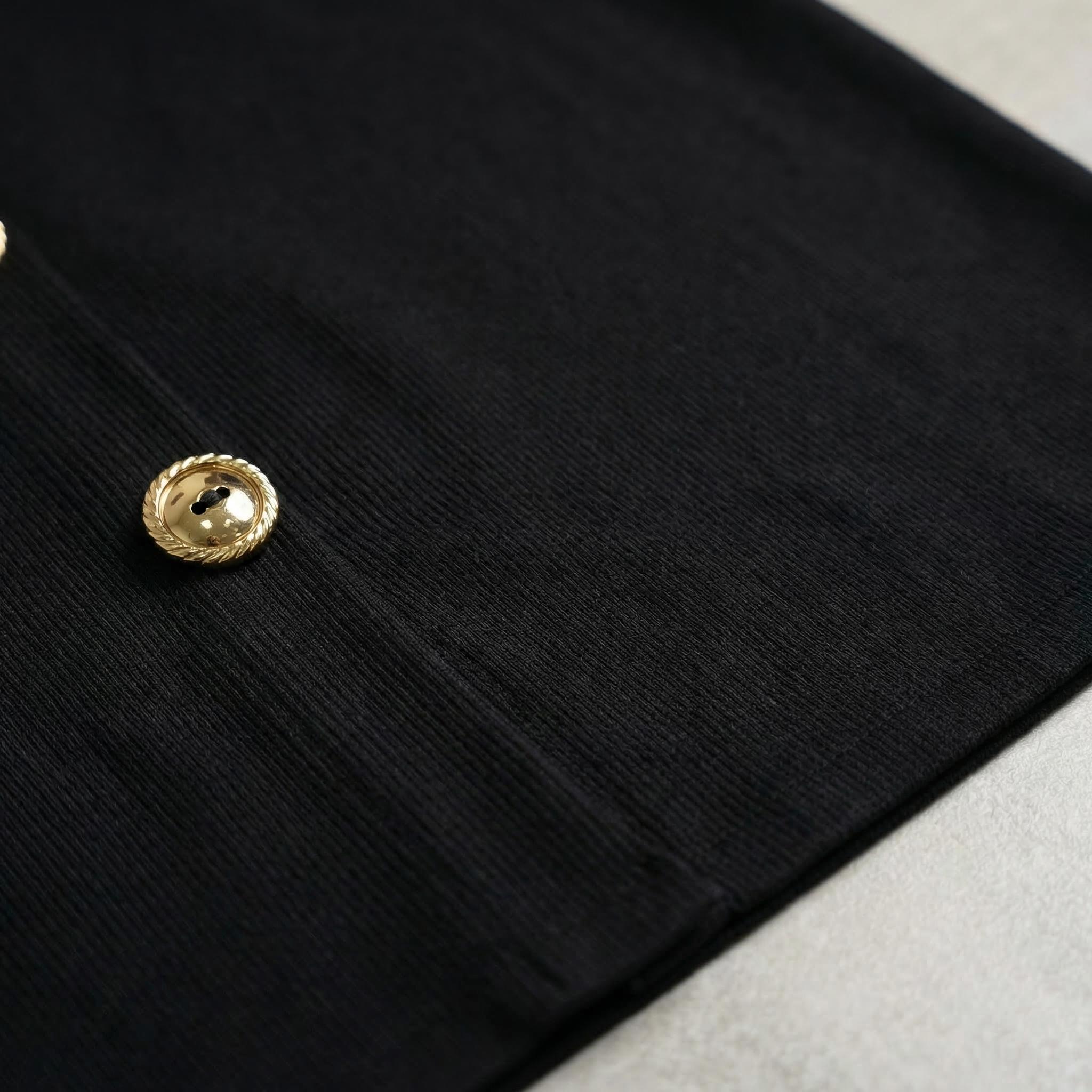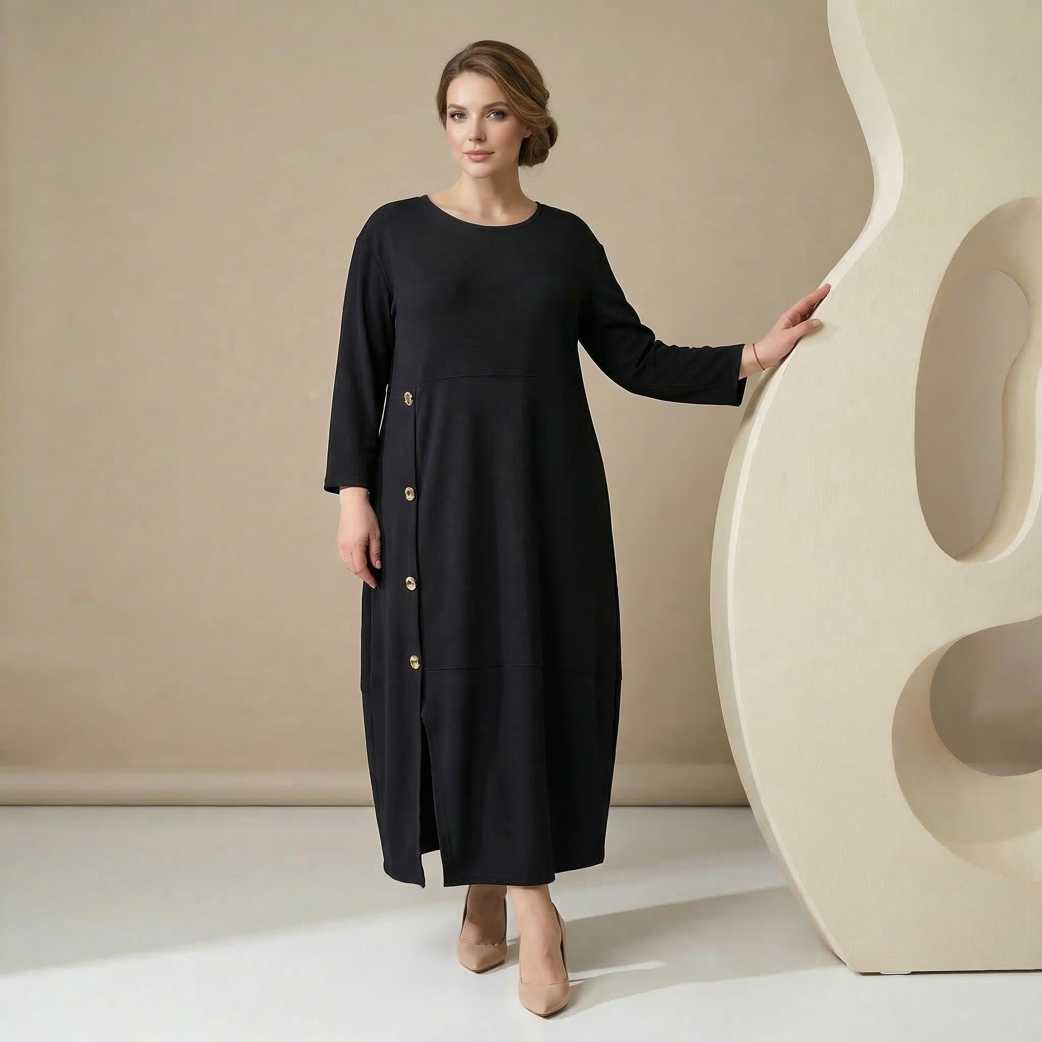 Елегантна официална черна рокля, която съчетава безупречен стил и комфорт, създадена специално за дами, ценящи изисканата визия. Моделът се отличава със свободен и разкроен силует, който пада тежко и красиво, осигурявайки невероятно удобство през целия ден. Роклята е изработена от средно плътно, еластично рипсено плетиво, което гарантира перфектно прилягане и запазване на формата. Дизайнът включва елегантно обло деколте, практични 7/8 ръкави и дължина под коляното. Акцентът пада върху ефектните декоративни златисти копчета с релефен ръб отстрани, допълнени от стилна предна цепка и хоризонтален шев, който придава структура на дрехата. Тази великолепна макси рокля е изключително практична и е идеален избор както за специални официални поводи, така и за елегантното ежедневие на всяка стилна жена.