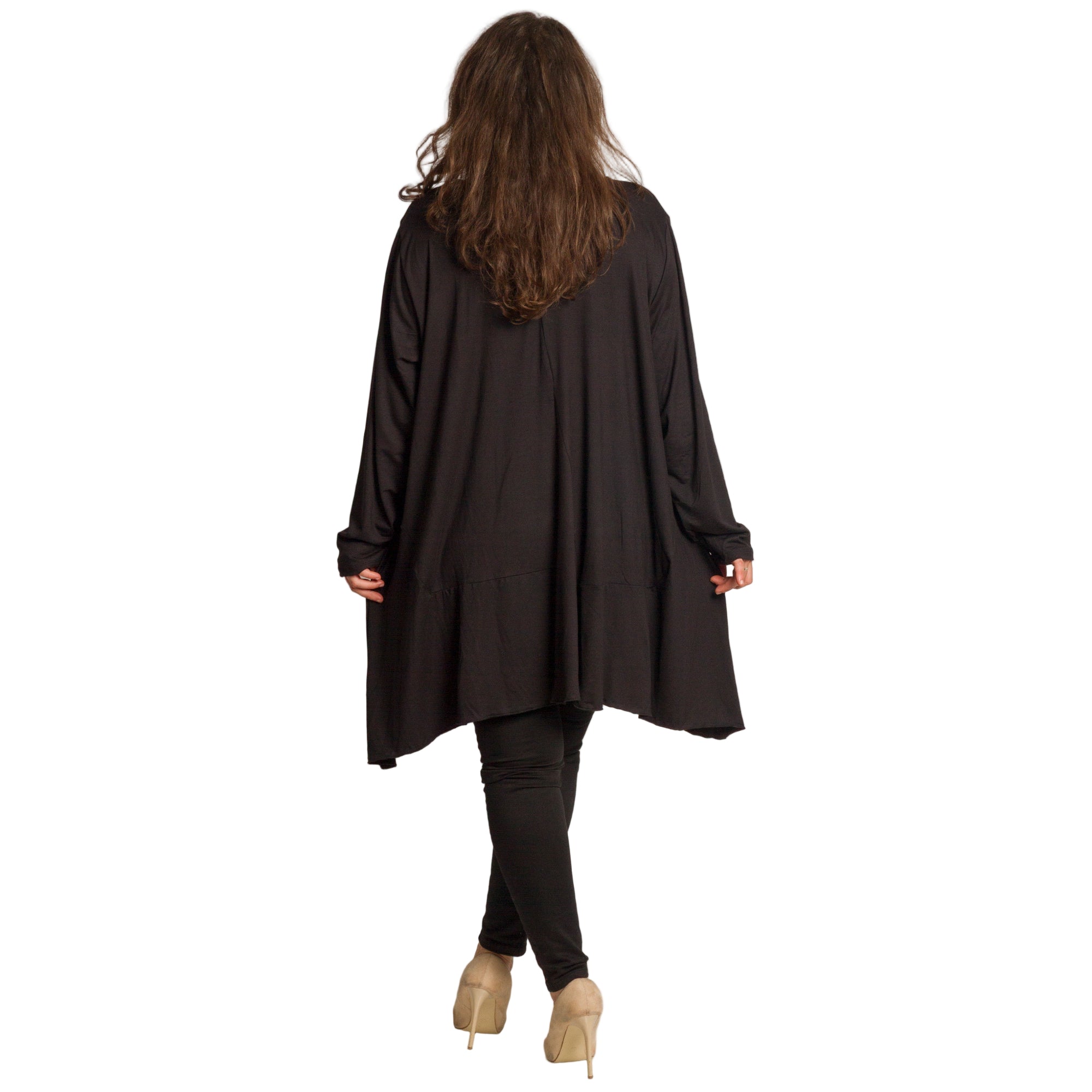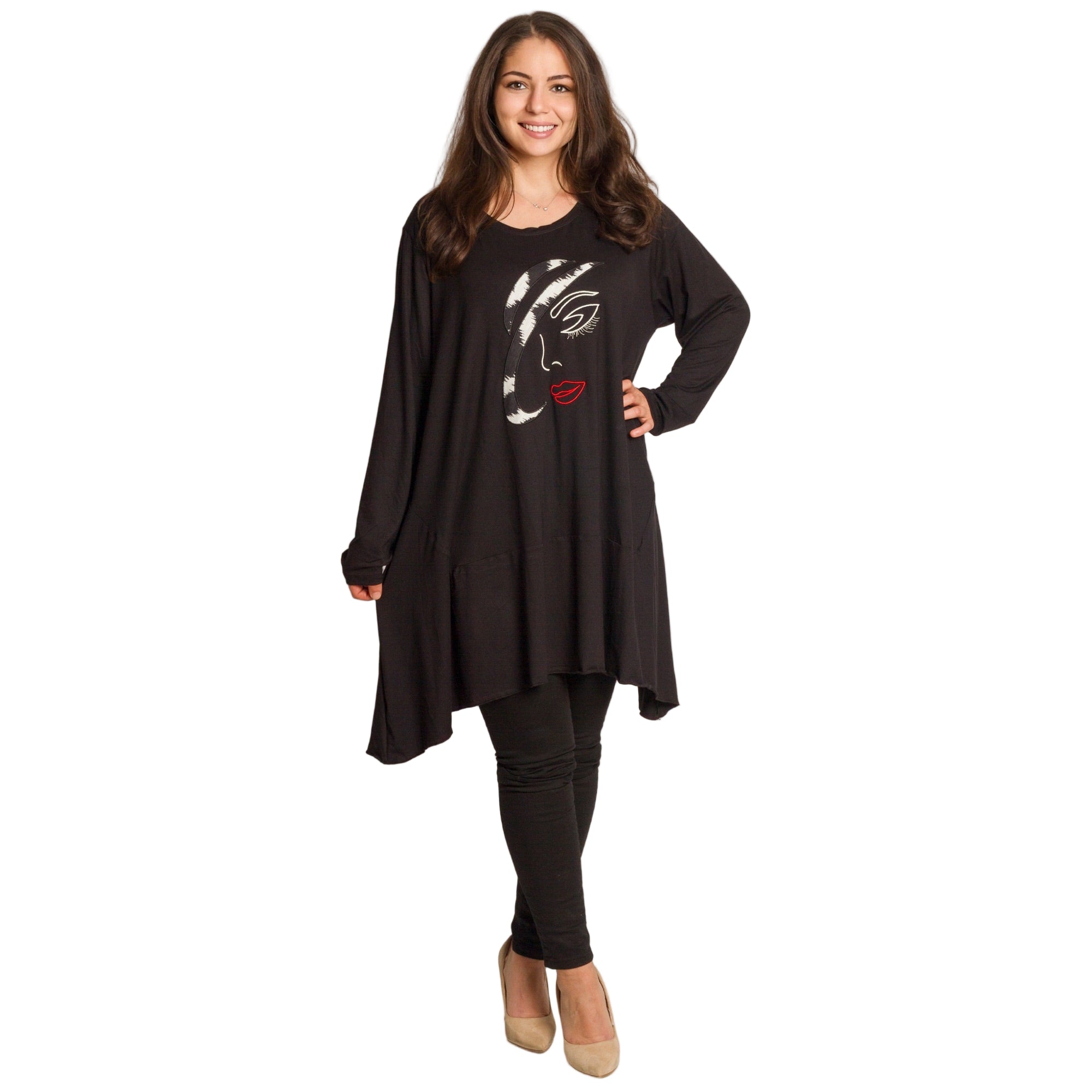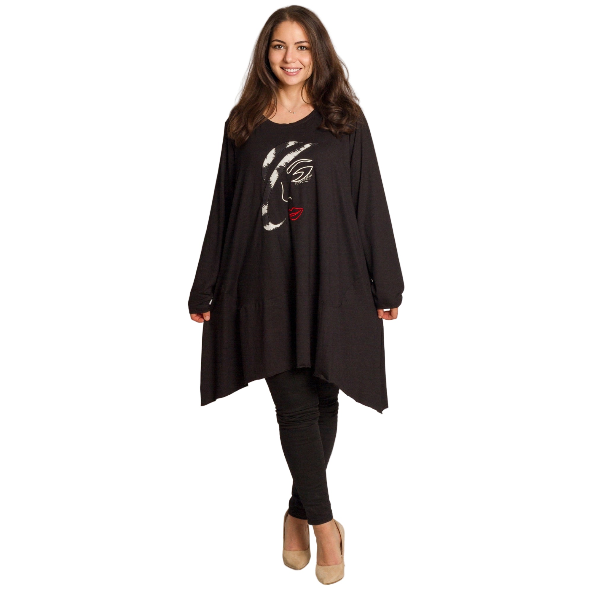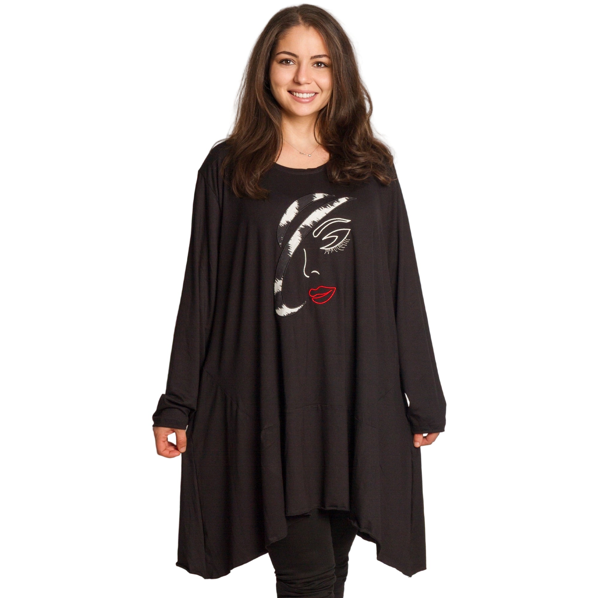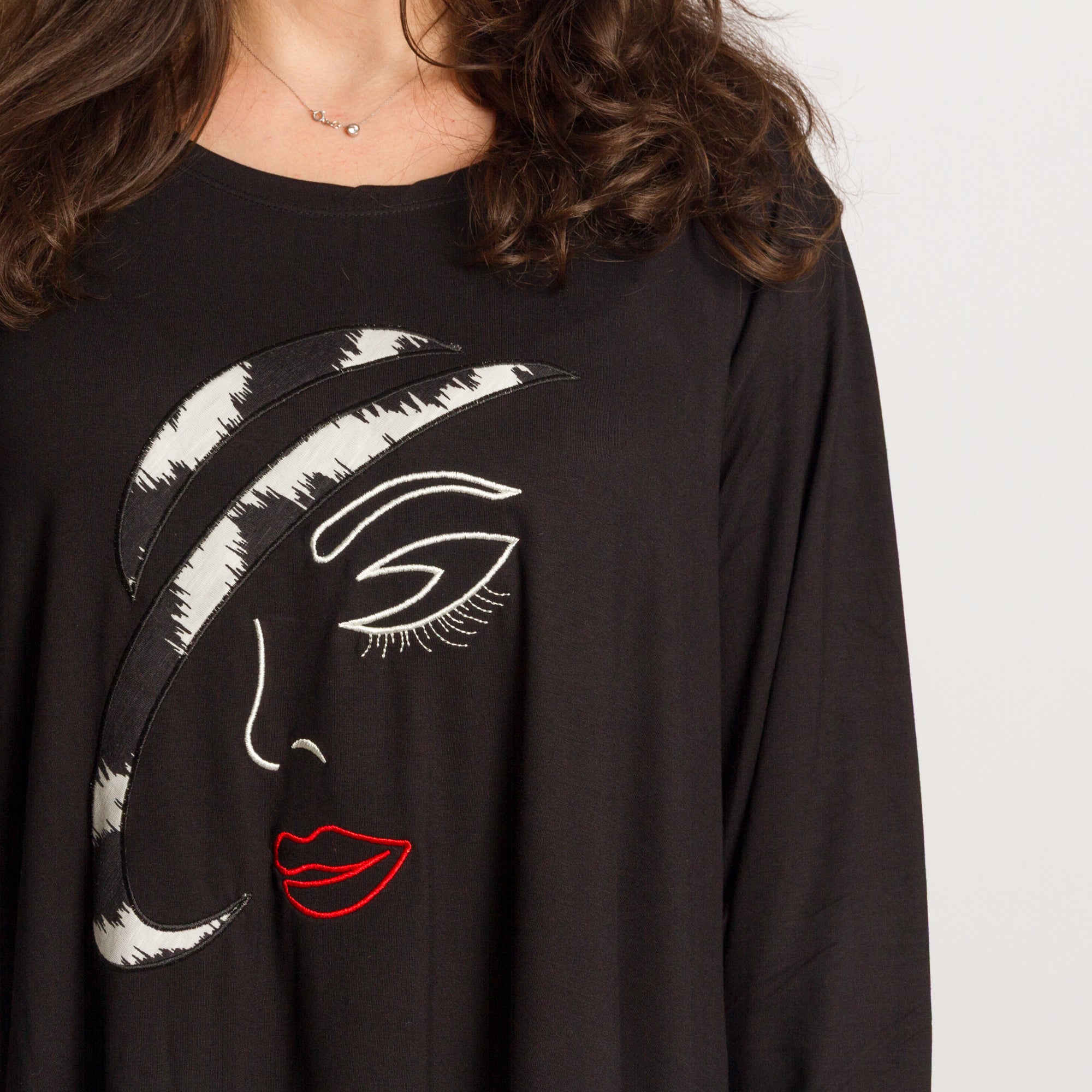 Елегантна черна туника в големи размери, изработена от мека и еластична материя с високо съдържание на вискоза. Дизайнът е акцентиран от артистична апликация „Дама с шапка“, избродирана с контрастни нишки в бяло и червено. Моделът е с обло деколте, дълги ръкави и разкроена кройка, която осигурява комфорт и свобода на движение. Подходяща е както за ежедневието, така и за по-специални поводи през есенно-зимния сезон.