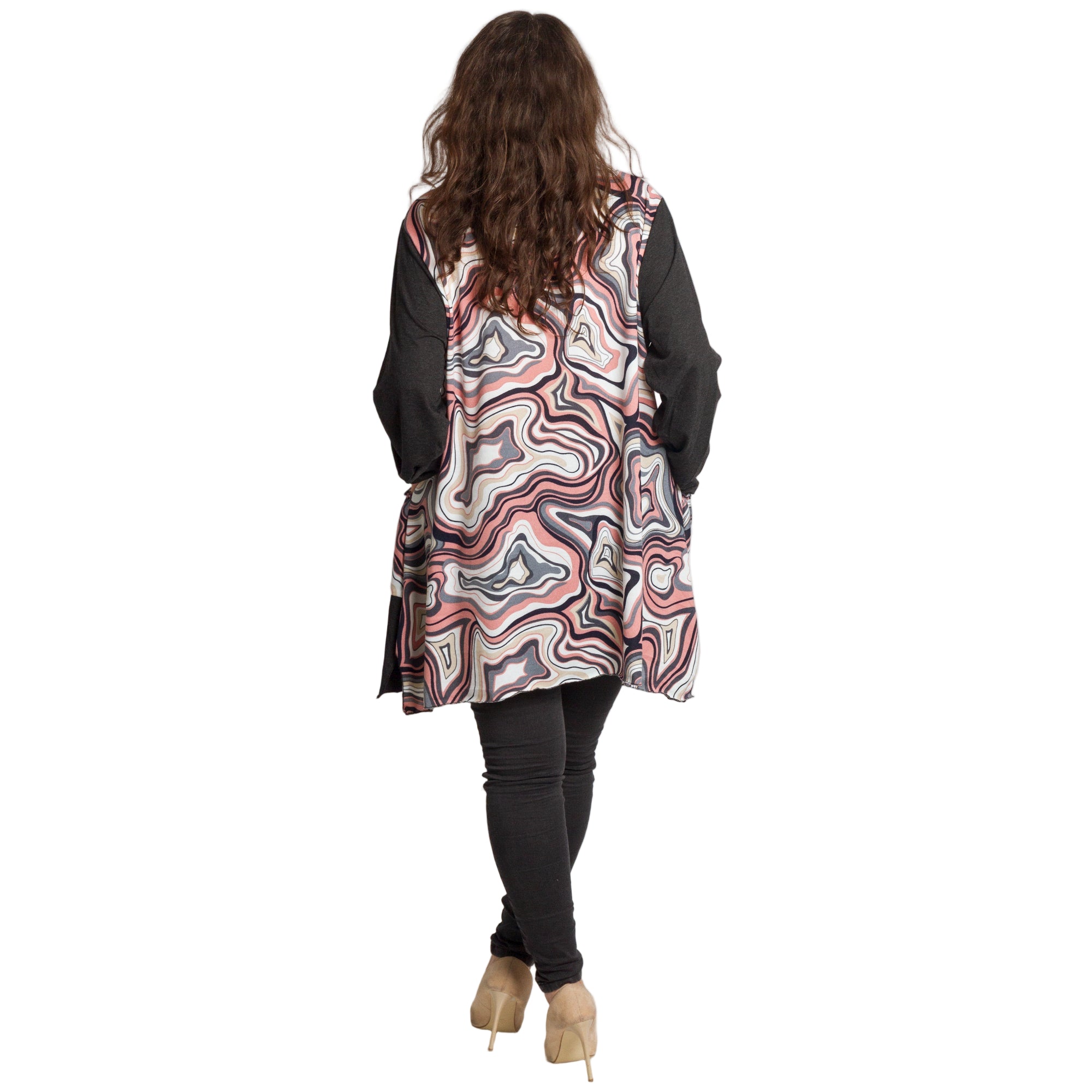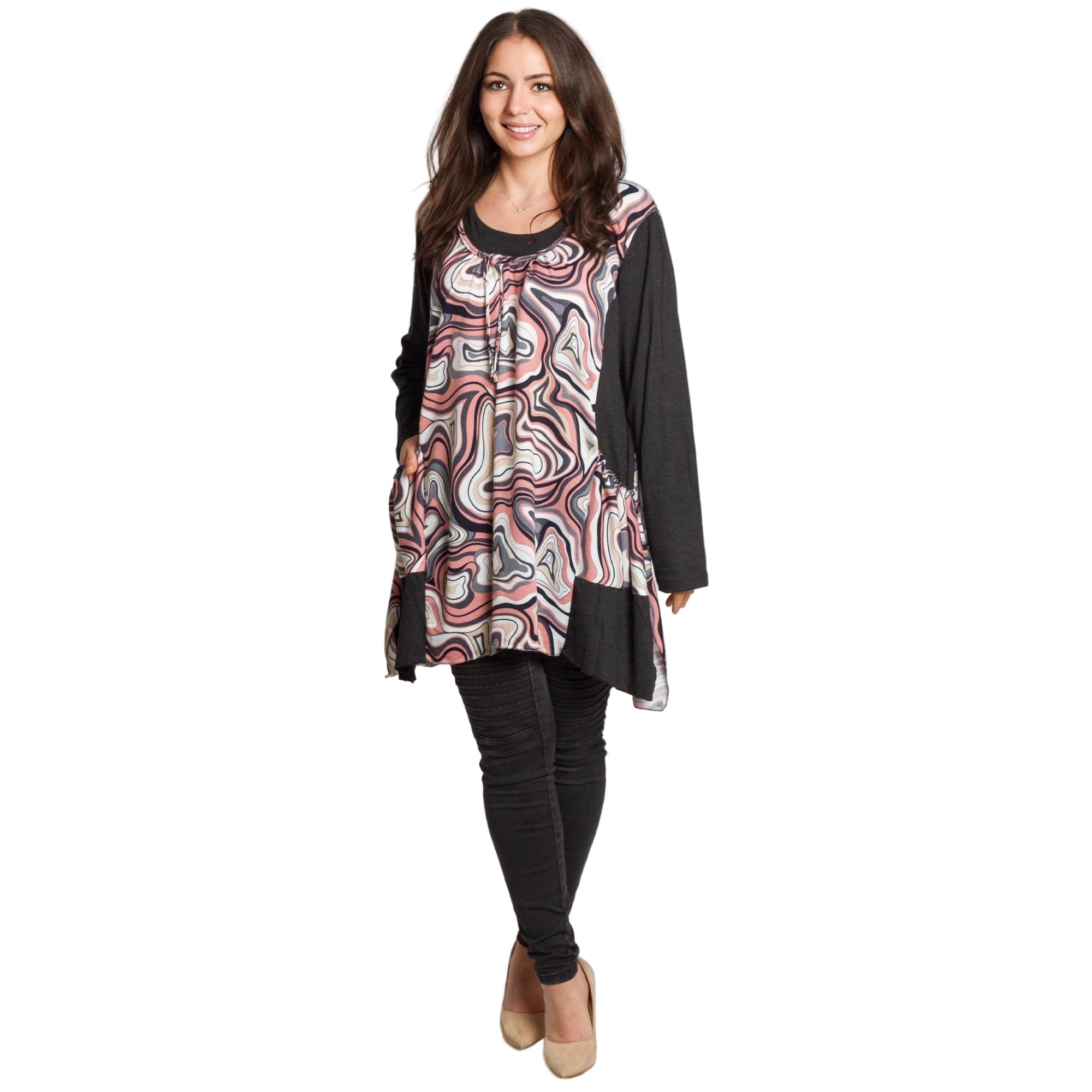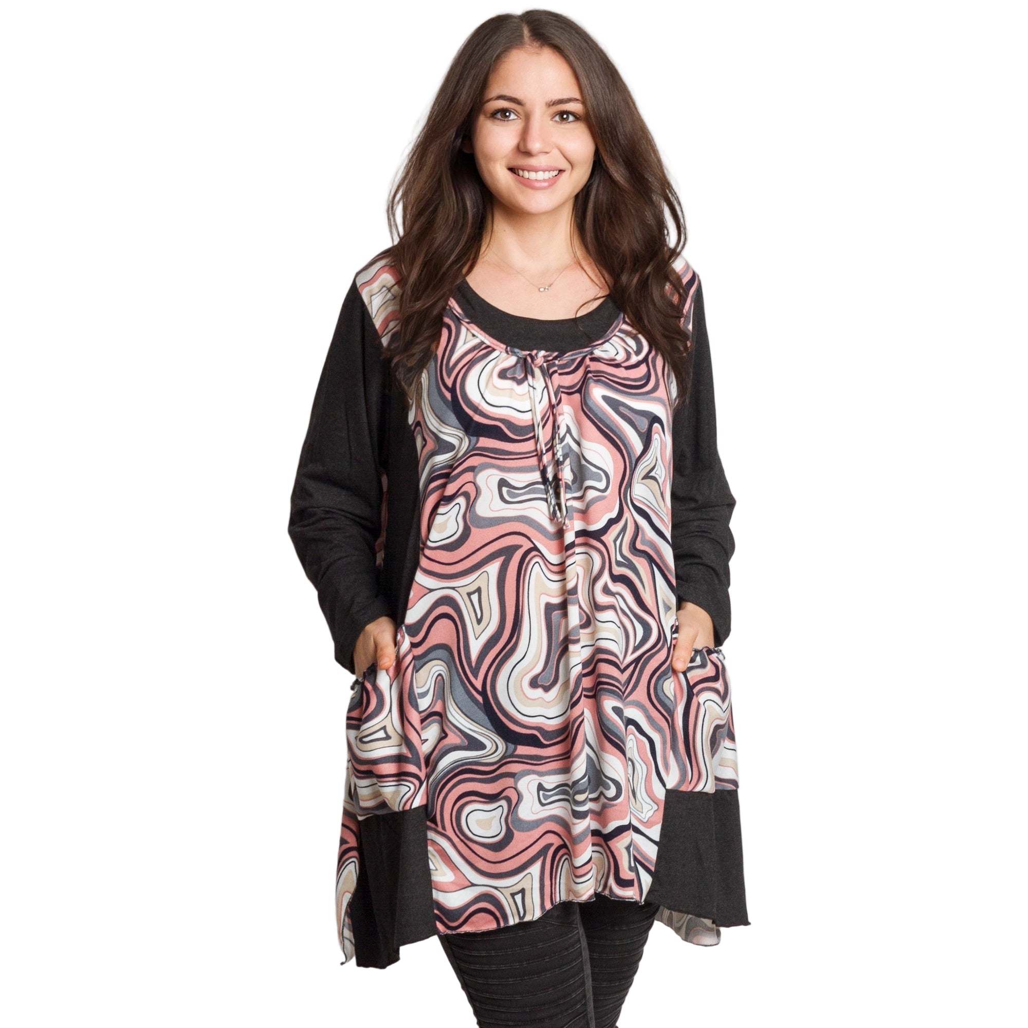 Елегантна разкроена туника с артистичен розово-сив десен и тъмни ръкави за контрастен ефект. Свободната кройка пада красиво по тялото и прикрива корема и ханша, а джобчетата добавят удобство и практичност. Връзките на обло деколте оформят нежна визия, подходяща както за ежедневие, така и за по-официален повод. Меката вискозна материя с еластан осигурява комфорт през целия ден и усещане за лекота през есенно-зимния сезон.