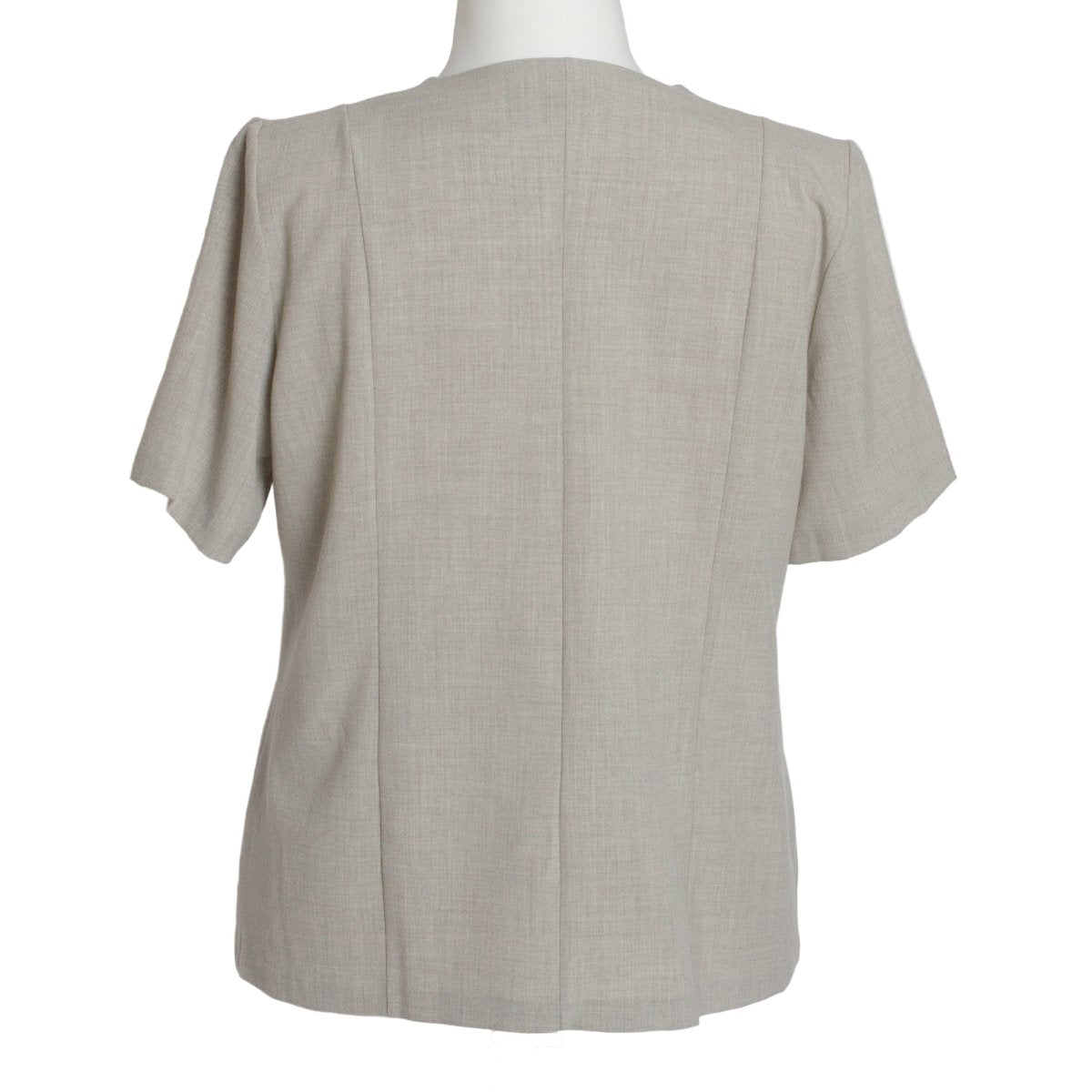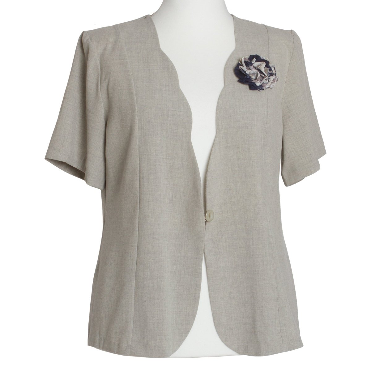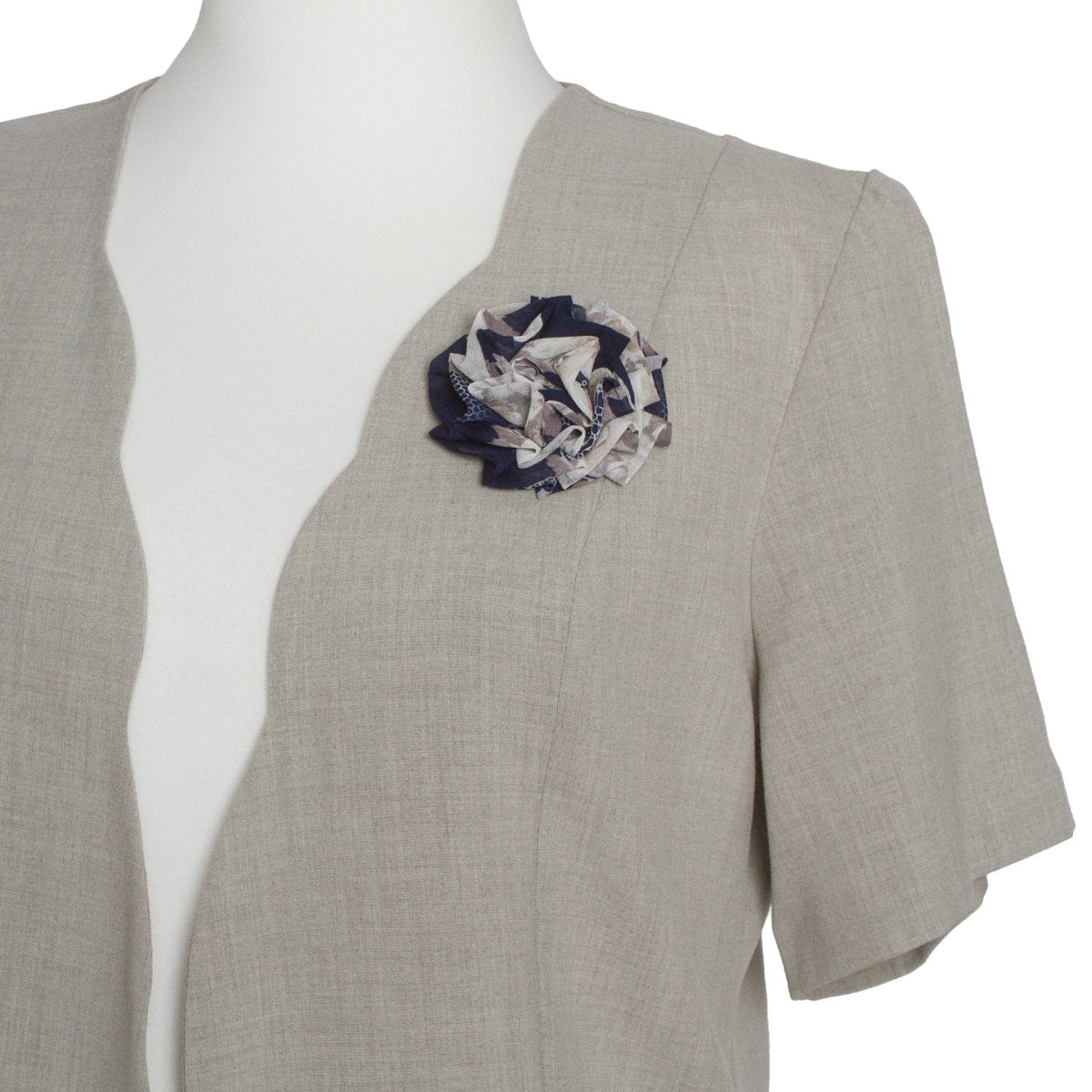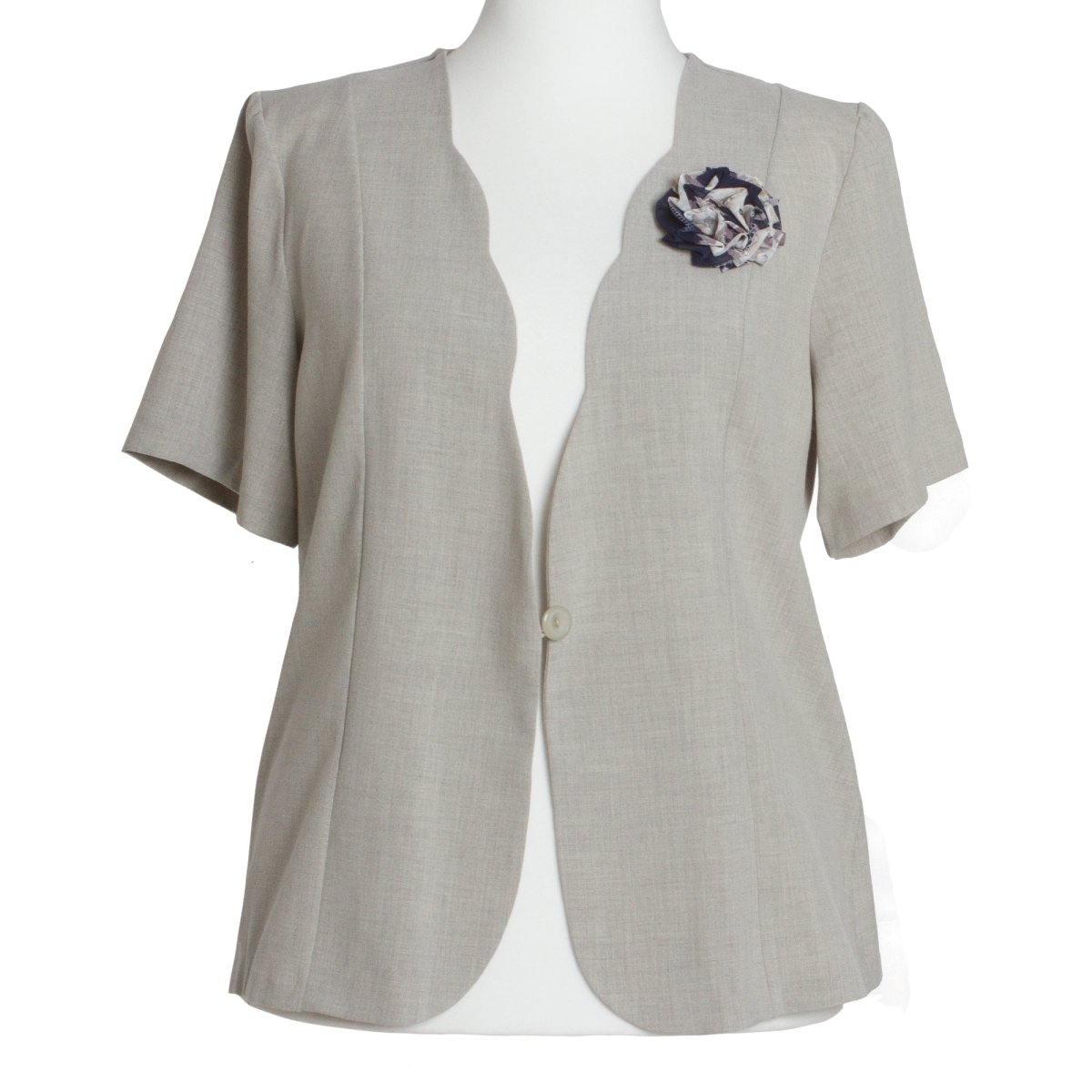 Стилно дамско сако в бежов цвят, изработено от мека и еластична материя с високо съдържание на вискоза. Моделът е с права кройка, къс ръкав и изчистен силует, който подчертава фигурата и осигурява удобство през целия ден. Закопчава се с копче отпред и е допълнено с ефектна флорална брошка, която добавя женственост и елегантност. Подходящо е за официални поводи, бизнес срещи или стилни комбинации за пролетно-летния сезон.