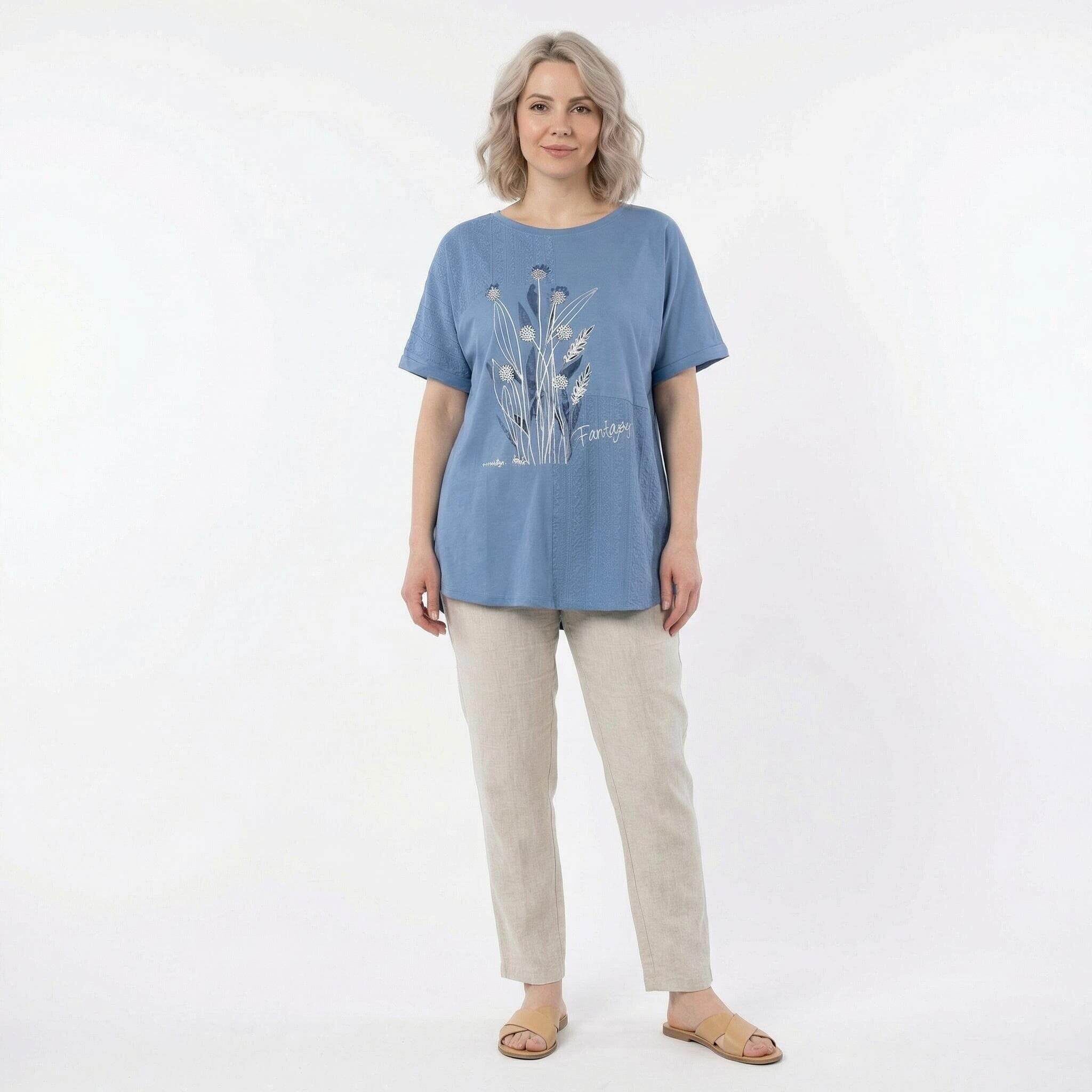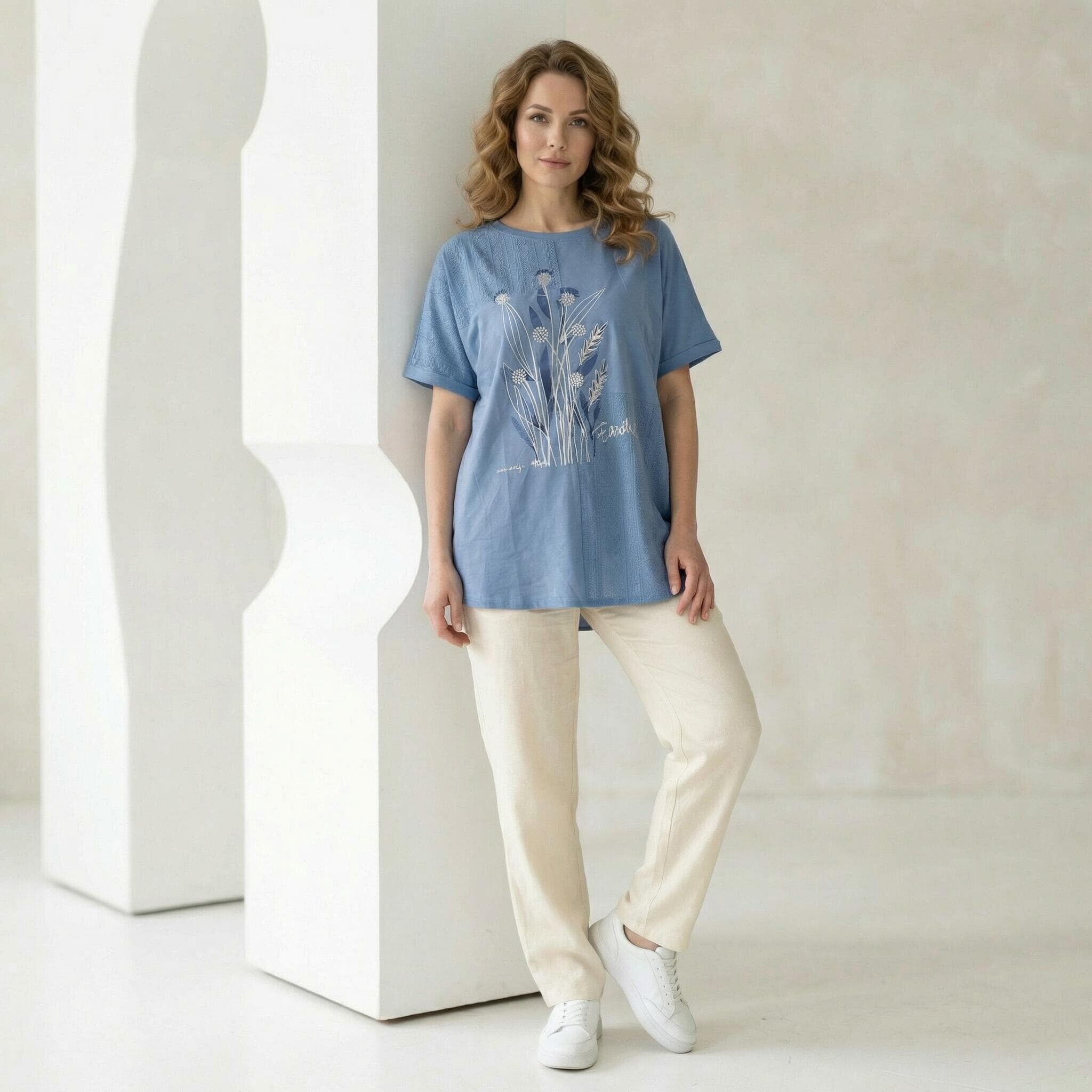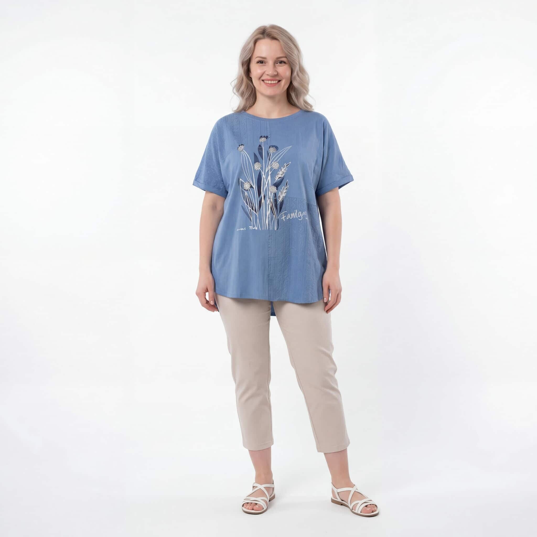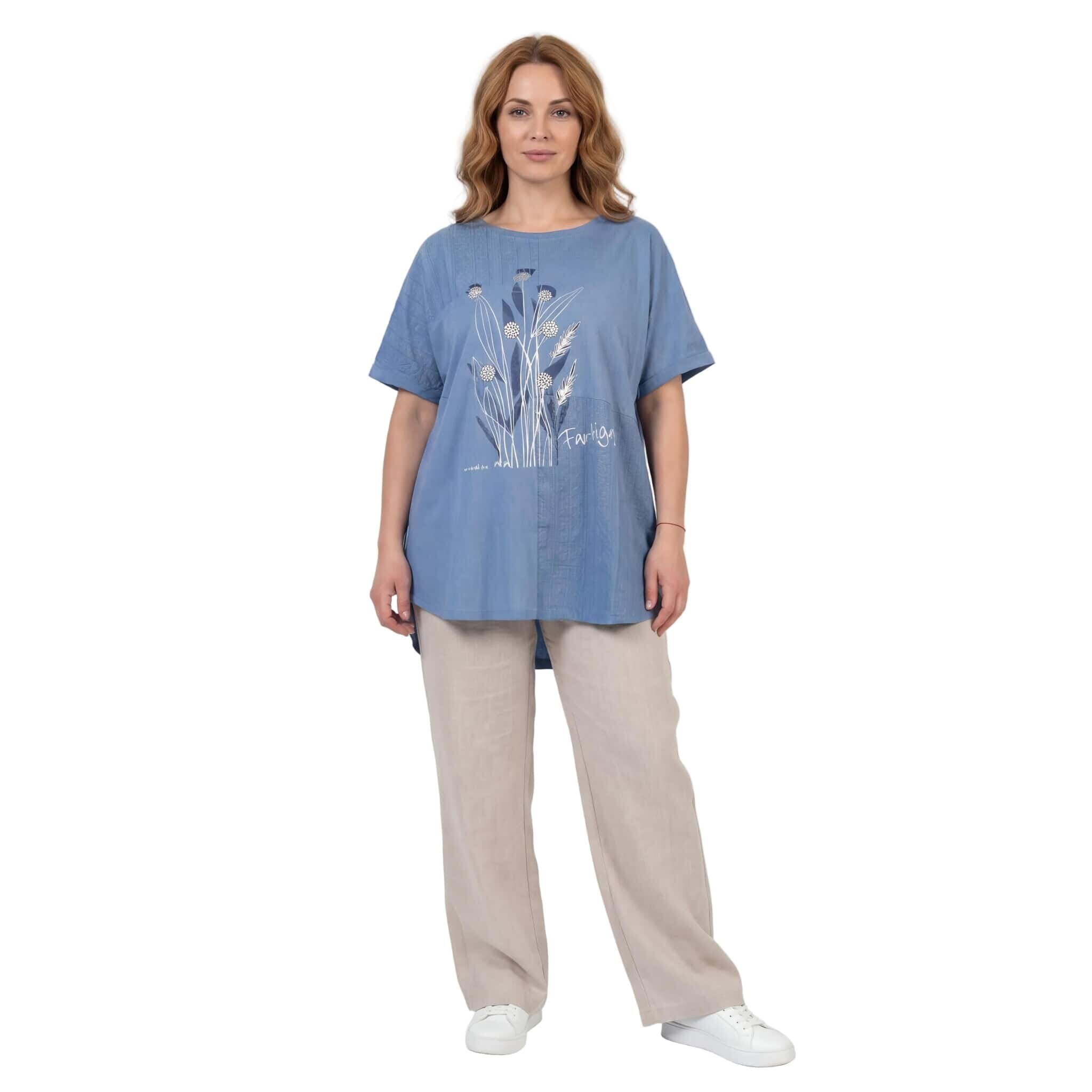 Освежете гардероба си с тази прекрасна синя лятна туника големи размери, създадена специално да подчертава вашата женственост и да осигурява безкомпромисен комфорт през топлите дни. Моделът е изработен от меко, дишащо и непрозрачно памучно трико, което пада свободно и елегантно по тялото. Дизайнът се отличава с удобно овално деколте, къси широки ръкави с паднало рамо и стилен заоблен подгъв, който е леко удължен в задната част. Уникалният асиметричен преден дизайн съчетава красива апликация на цветя с вертикални панели от нежна дантела, превръщайки тази макси туника в перфектния избор за вашата стилна ежедневна визия.