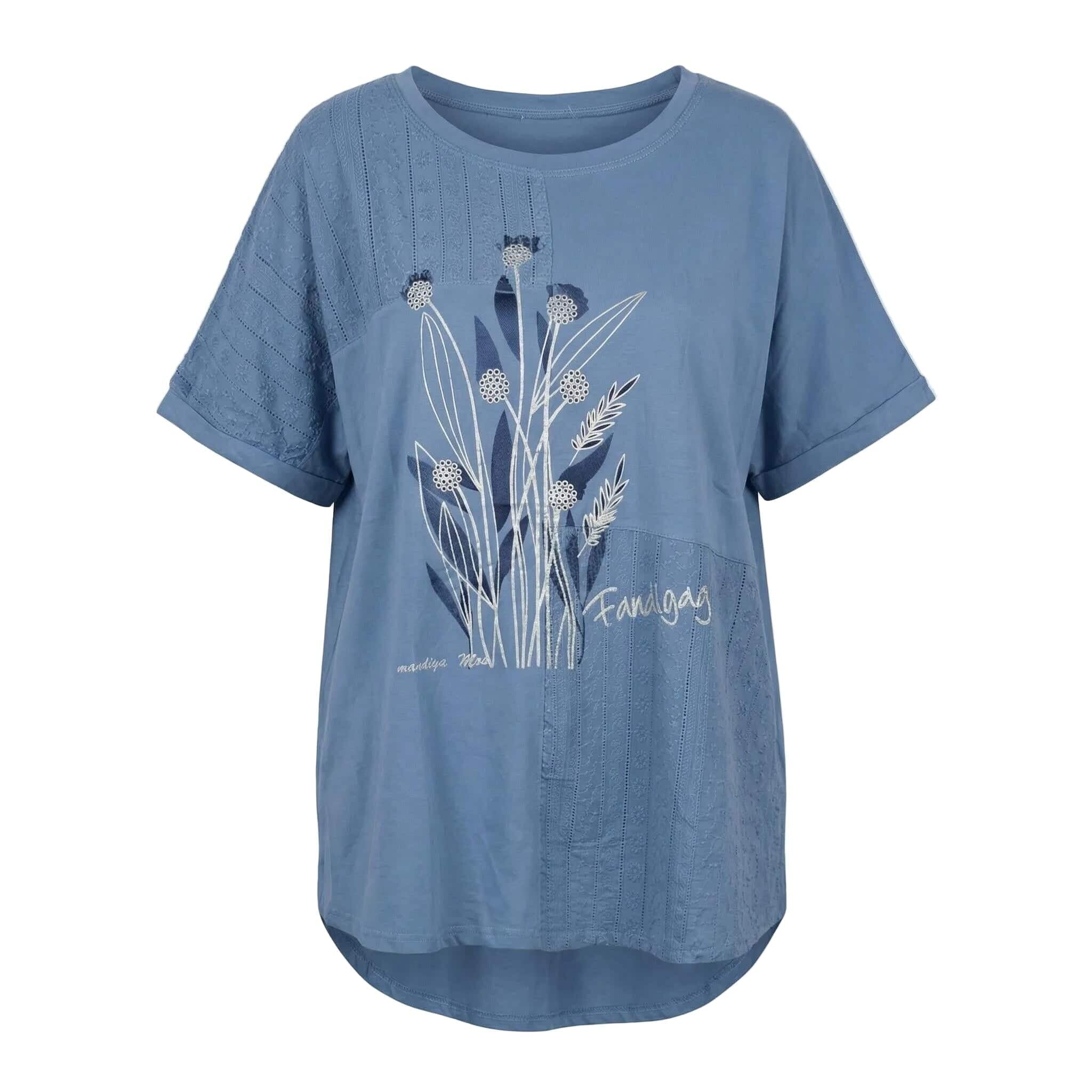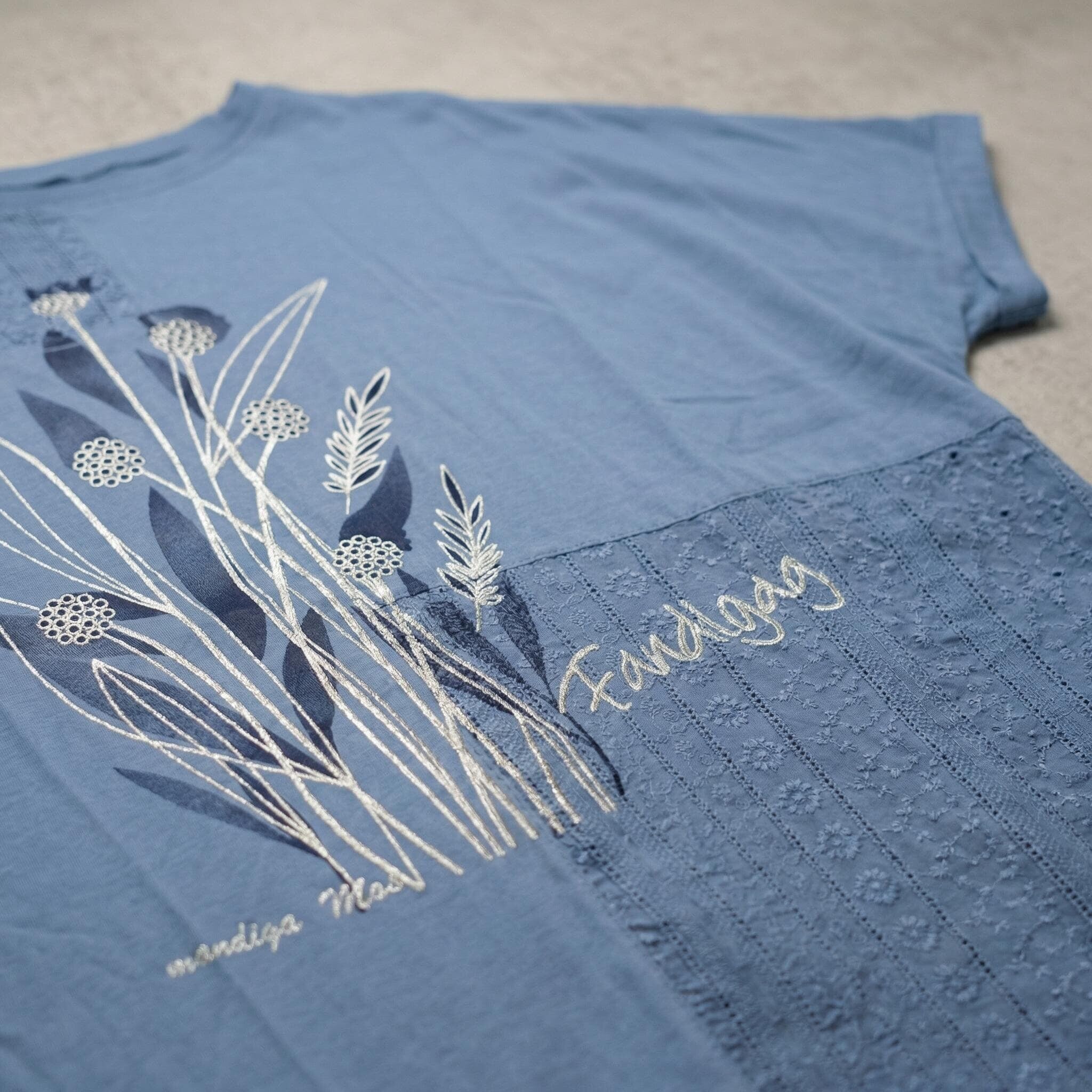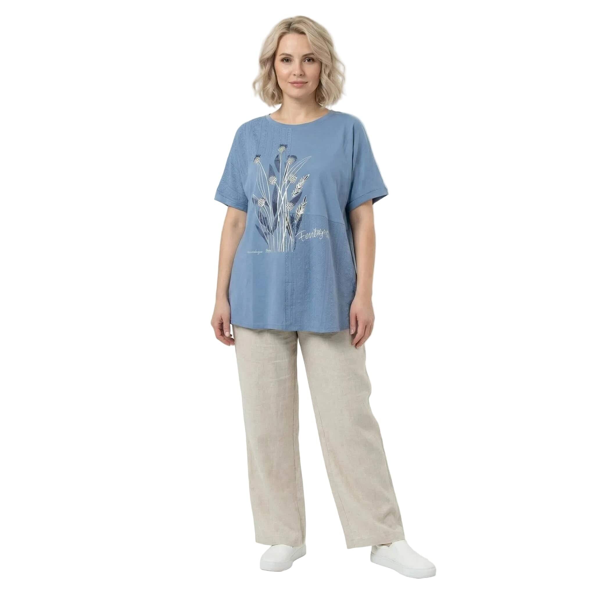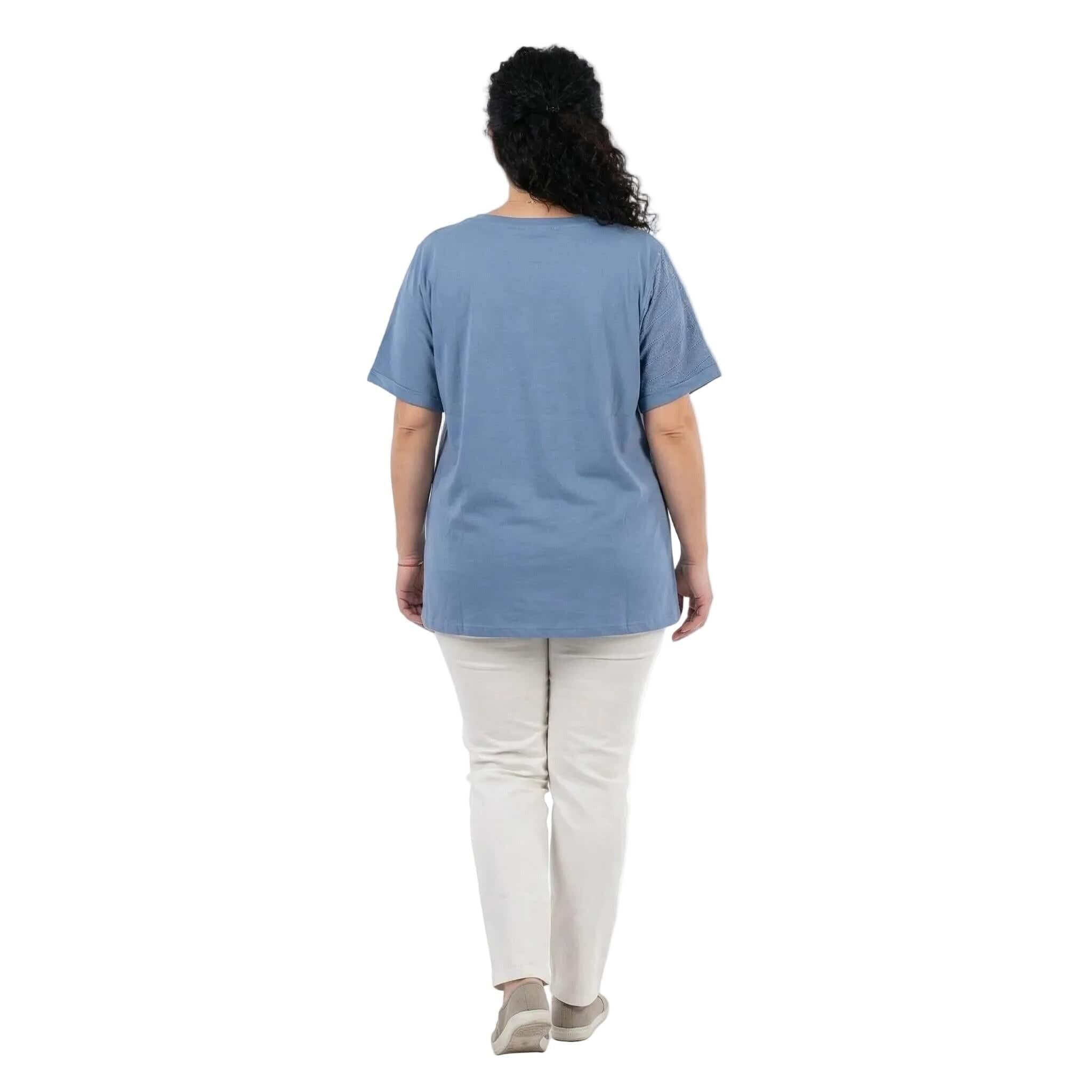 Освежете гардероба си с тази прекрасна синя лятна туника големи размери, създадена специално да подчертава вашата женственост и да осигурява безкомпромисен комфорт през топлите дни. Моделът е изработен от меко, дишащо и непрозрачно памучно трико, което пада свободно и елегантно по тялото. Дизайнът се отличава с удобно овално деколте, къси широки ръкави с паднало рамо и стилен заоблен подгъв, който е леко удължен в задната част. Уникалният асиметричен преден дизайн съчетава красива апликация на цветя с вертикални панели от нежна дантела, превръщайки тази макси туника в перфектния избор за вашата стилна ежедневна визия.