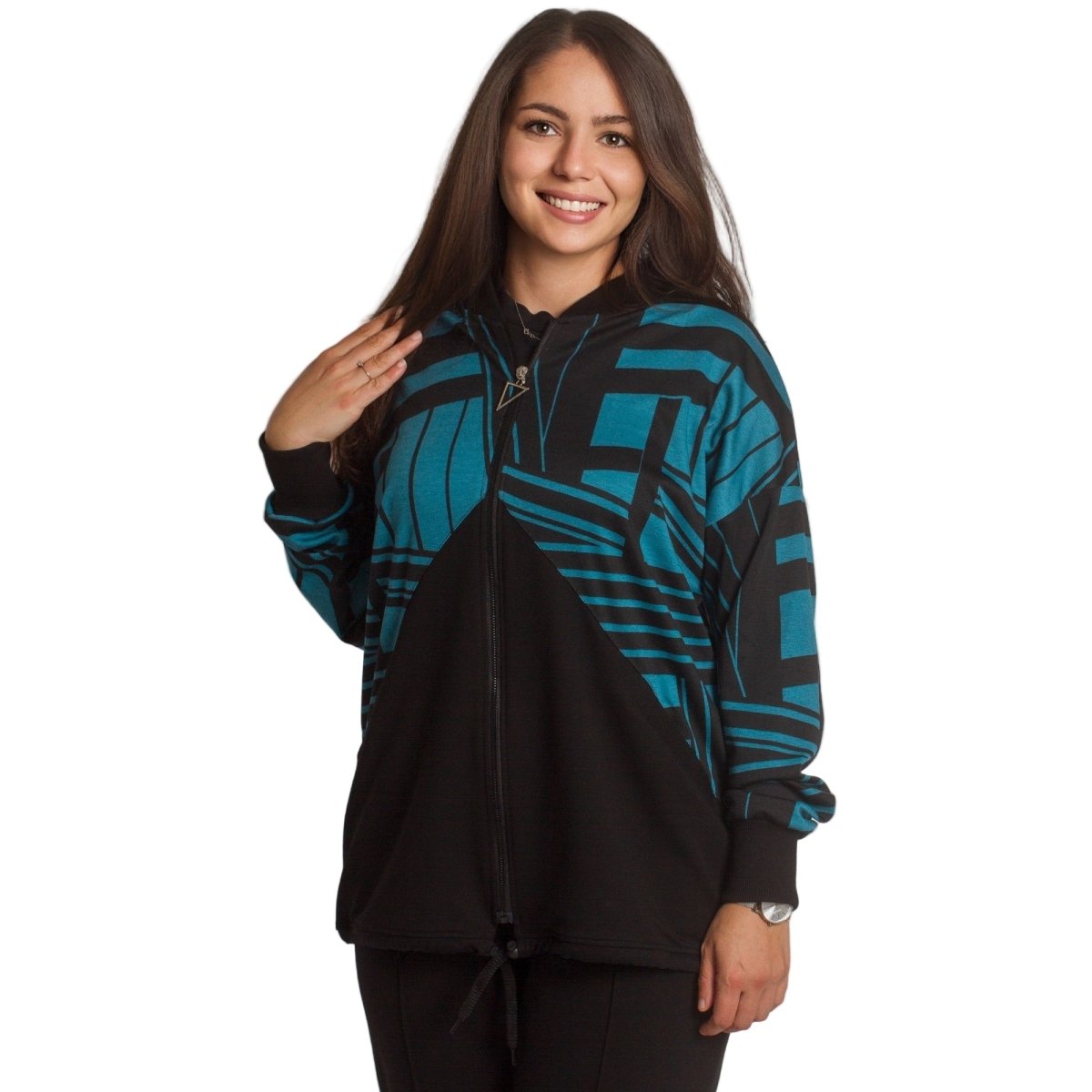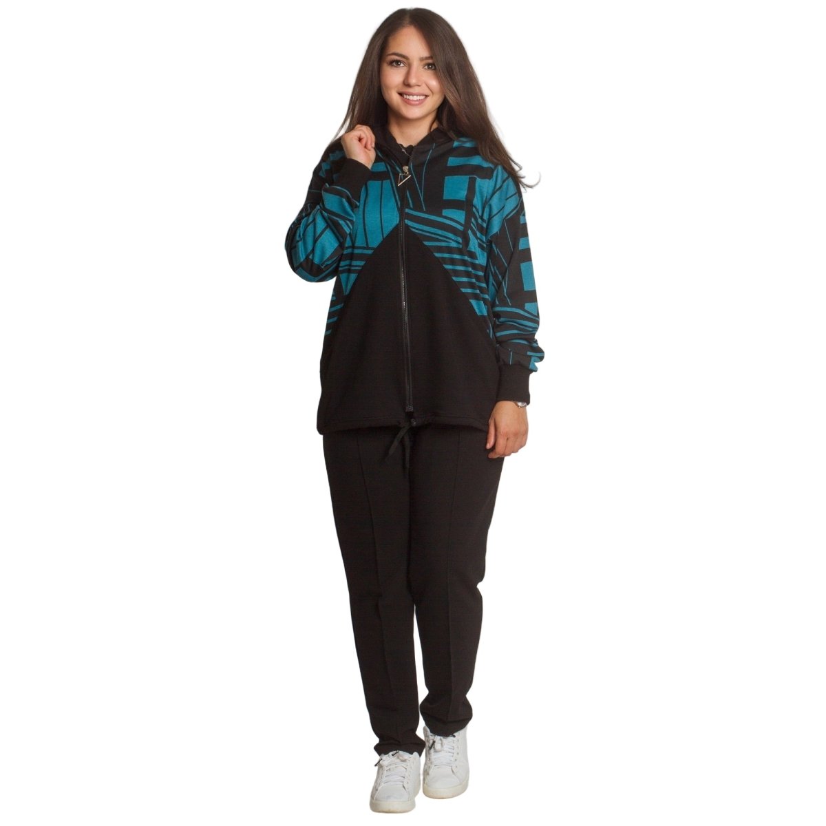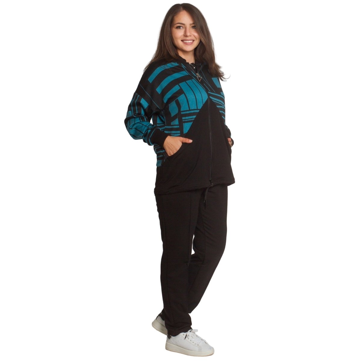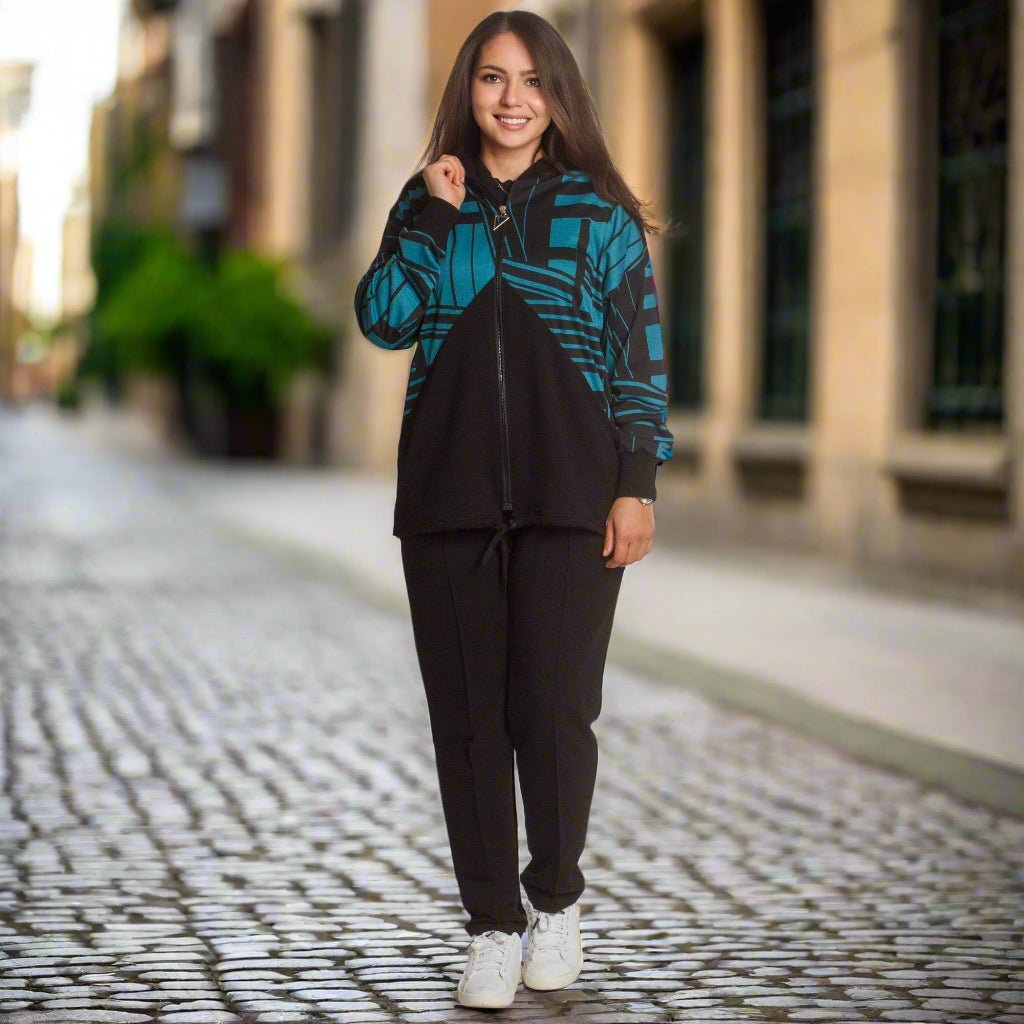 Комфортен и модерен спортен екип, състоящ се от горнище с цип и панталон с еластичен колан. Горнището е с качулка, дълъг ръкав и стилен геометричен принт, който придава свеж и динамичен вид. Панталонът е класически черен с права кройка и джобове, осигуряващи удобство при носене. Материята е мека, еластична и приятна на допир, което прави комплекта подходящ за спорт, разходка и ежедневни занимания през есенно-зимния сезон.
