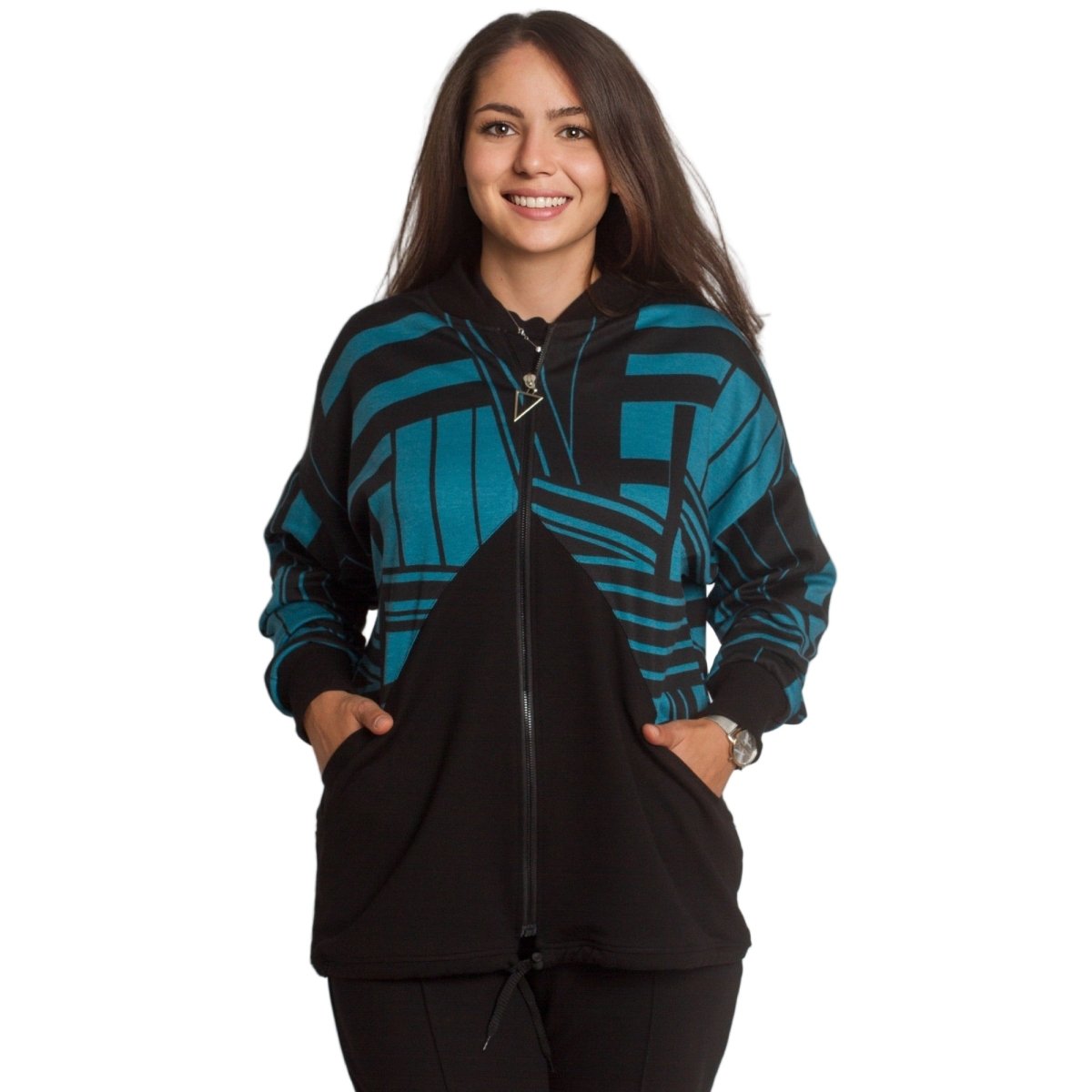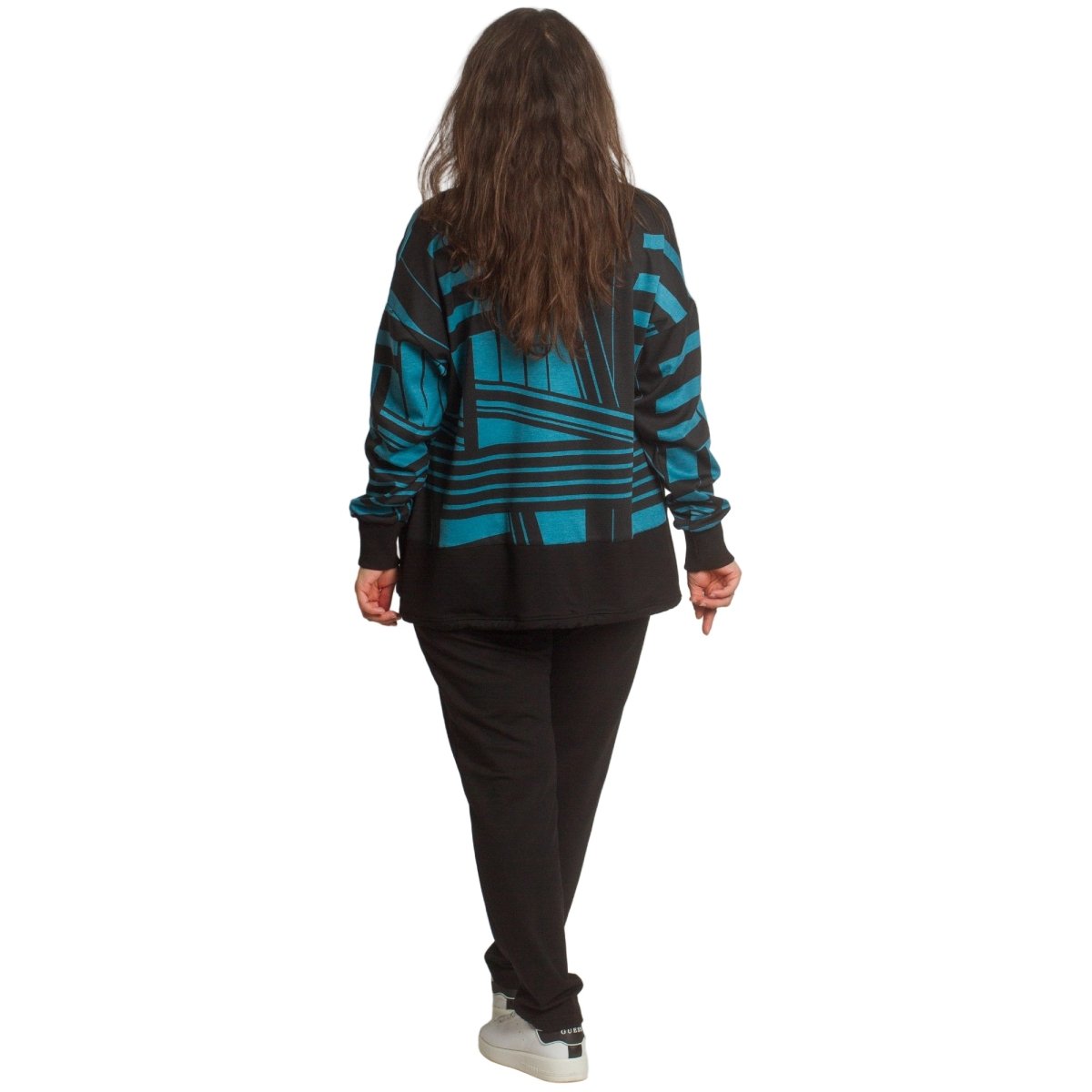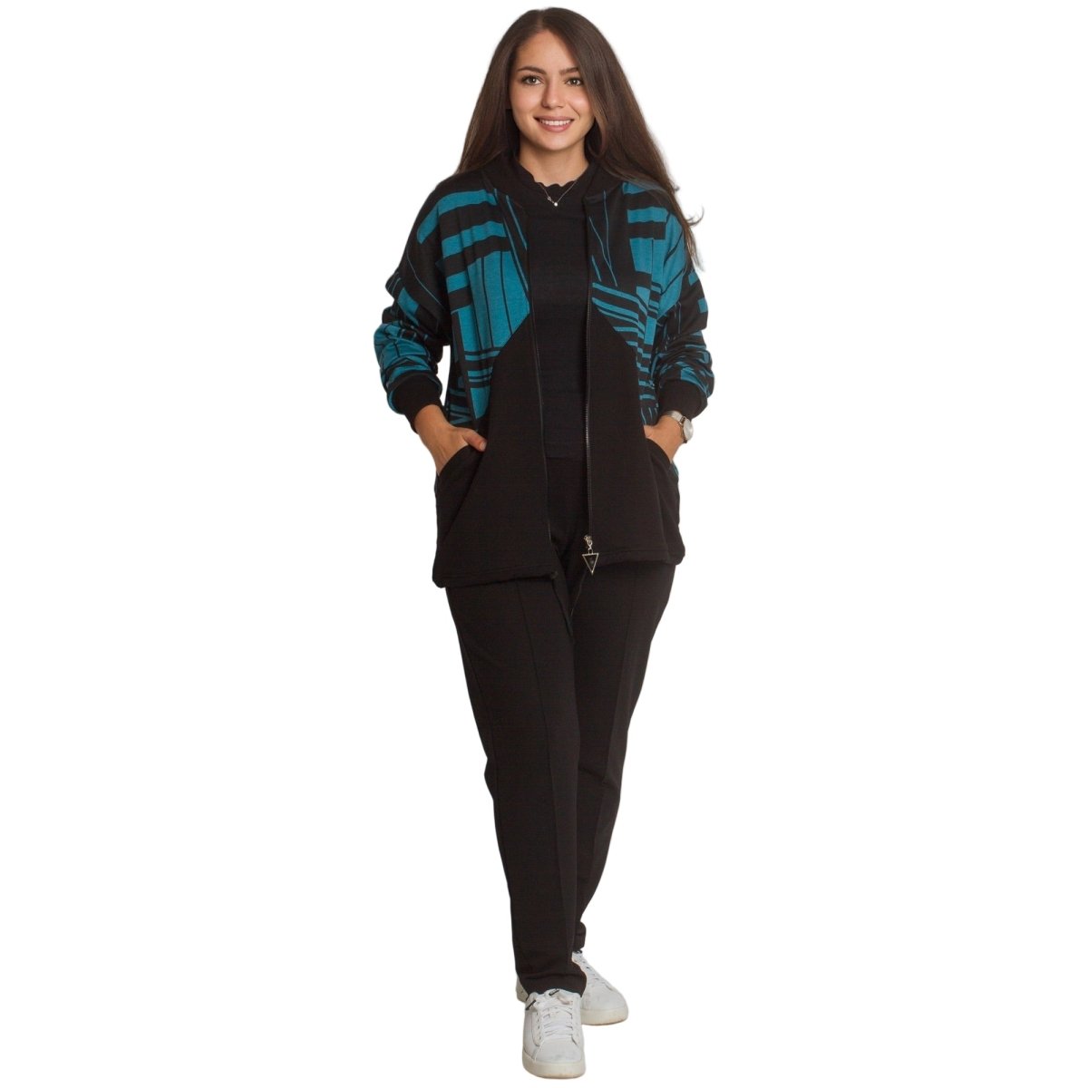 Комфортен и модерен спортен екип, състоящ се от горнище с цип и панталон с еластичен колан. Горнището е с качулка, дълъг ръкав и стилен геометричен принт, който придава свеж и динамичен вид. Панталонът е класически черен с права кройка и джобове, осигуряващи удобство при носене. Материята е мека, еластична и приятна на допир, което прави комплекта подходящ за спорт, разходка и ежедневни занимания през есенно-зимния сезон.