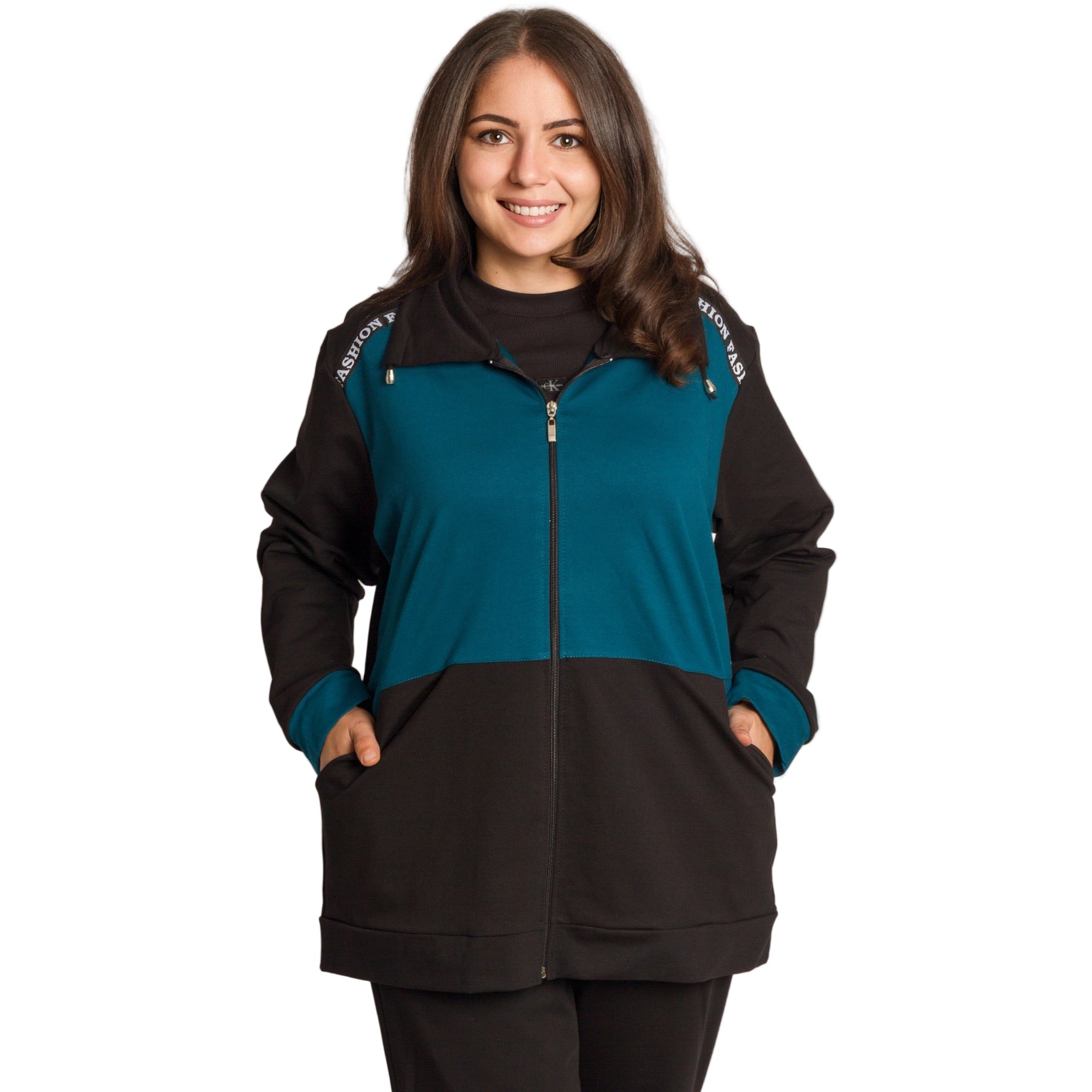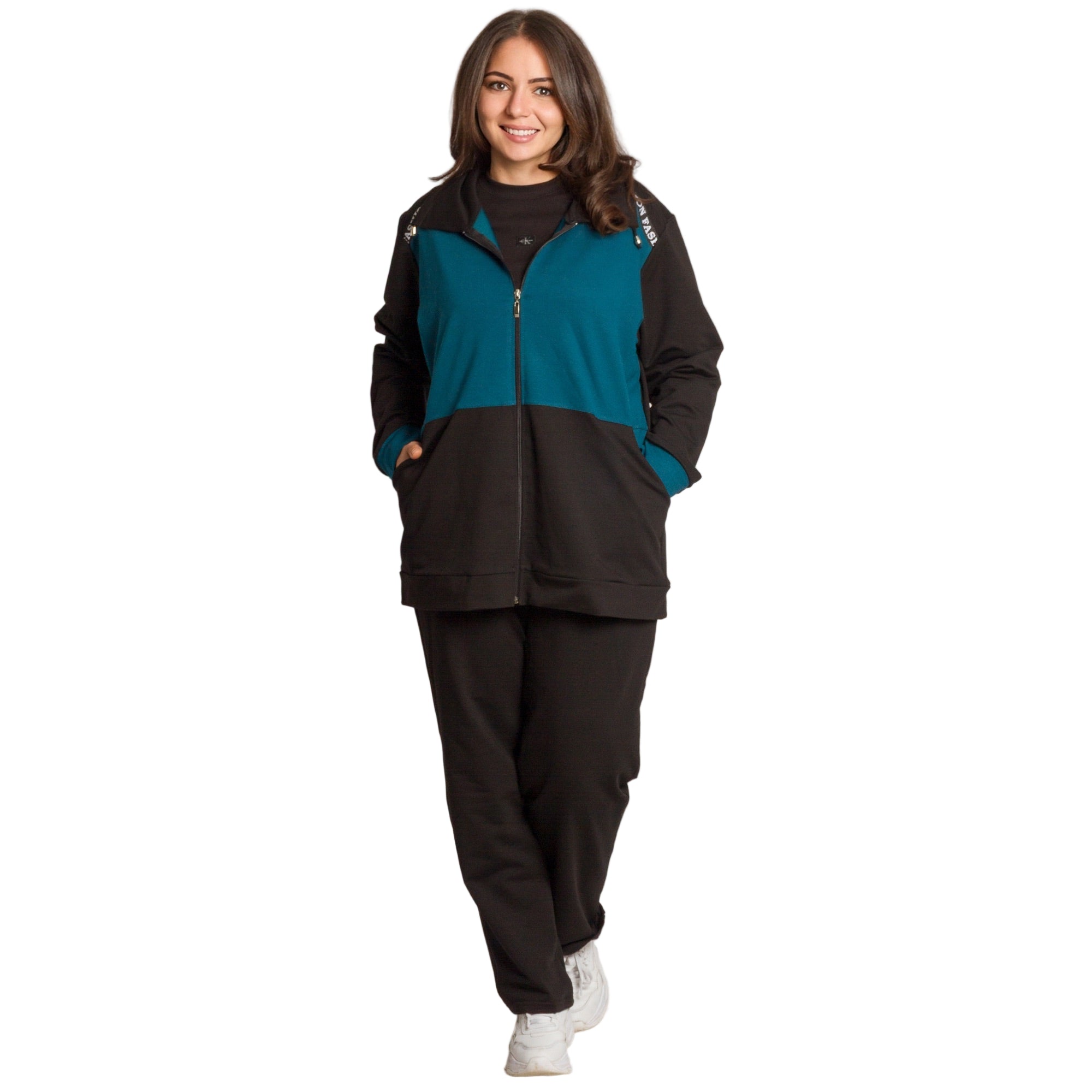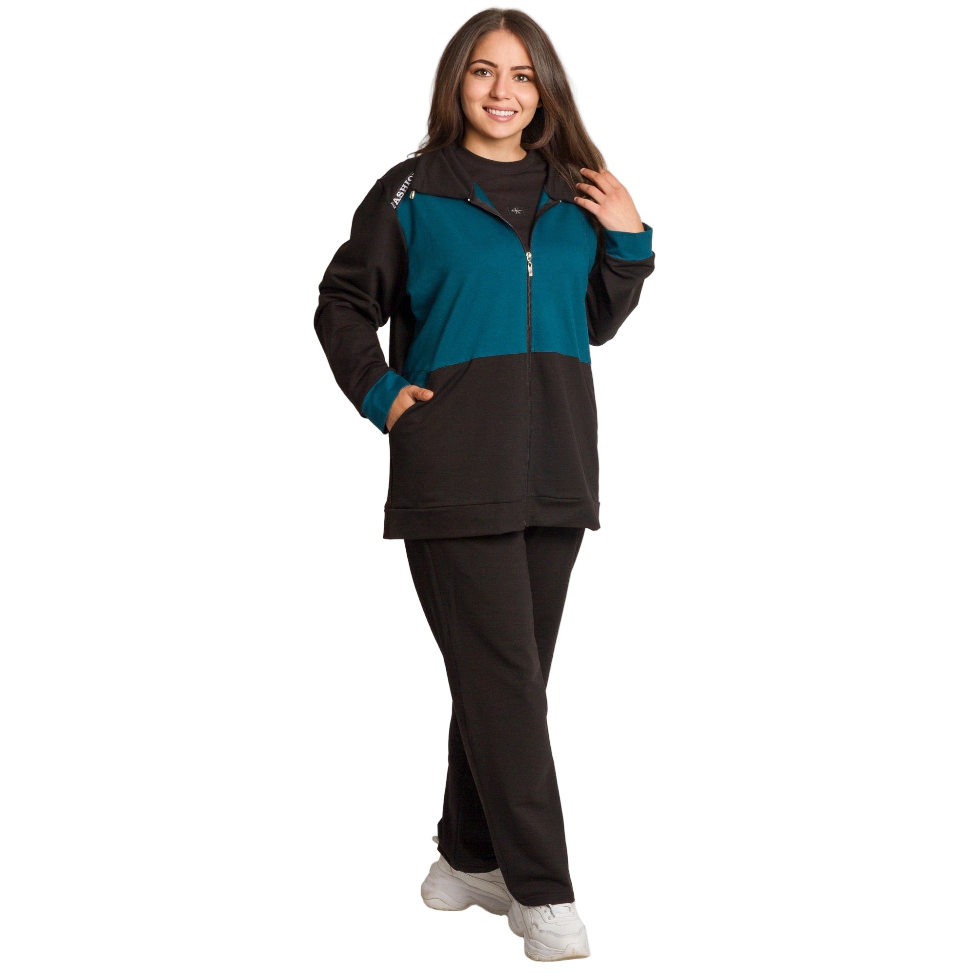 Комфорт и стил в едно! Този спортен екип в черно и петрол е идеален за ежедневието през студените дни. Горната част е с цип и практични джобове, а надписът FASHION по раменете добавя модерен акцент. Изработен от мека и еластична материя, моделът осигурява свобода на движение и усещане за уют през целия ден. Подходящ за разходки, пътувания и почивка у дома.