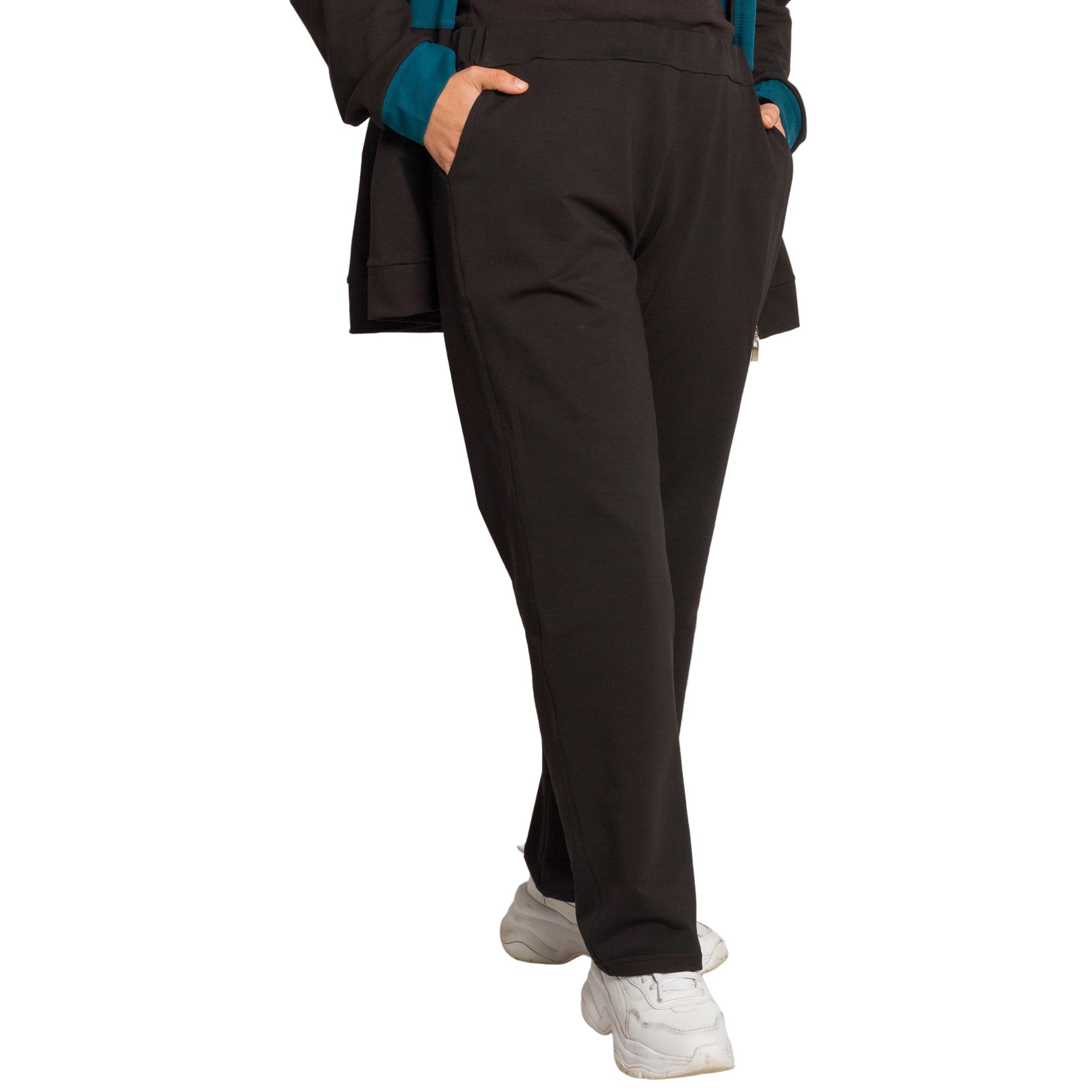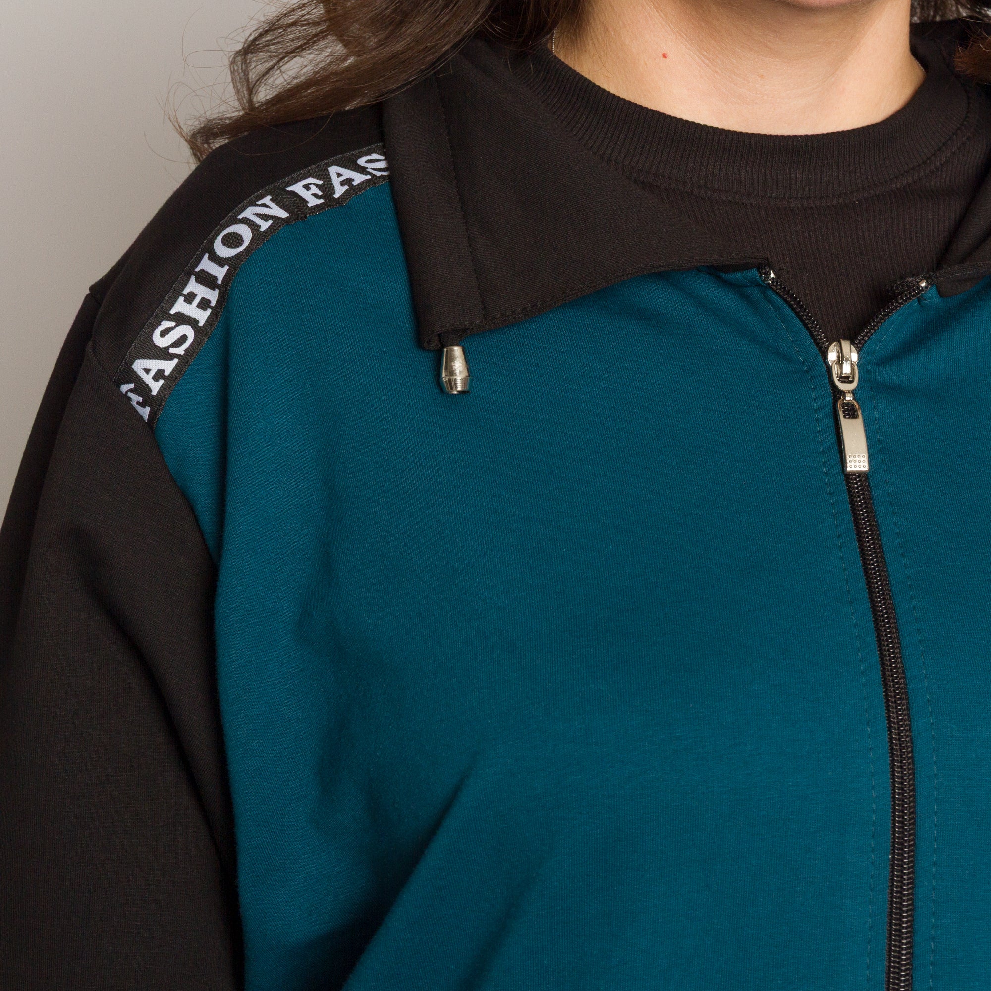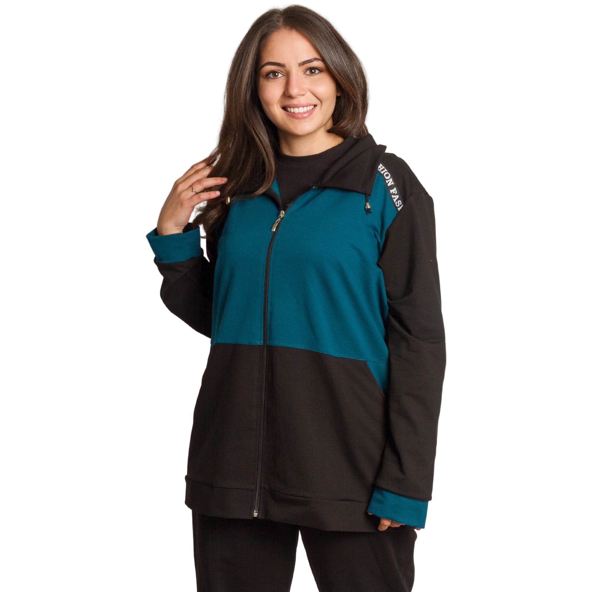 Комфорт и стил в едно! Този спортен екип в черно и петрол е идеален за ежедневието през студените дни. Горната част е с цип и практични джобове, а надписът FASHION по раменете добавя модерен акцент. Изработен от мека и еластична материя, моделът осигурява свобода на движение и усещане за уют през целия ден. Подходящ за разходки, пътувания и почивка у дома.