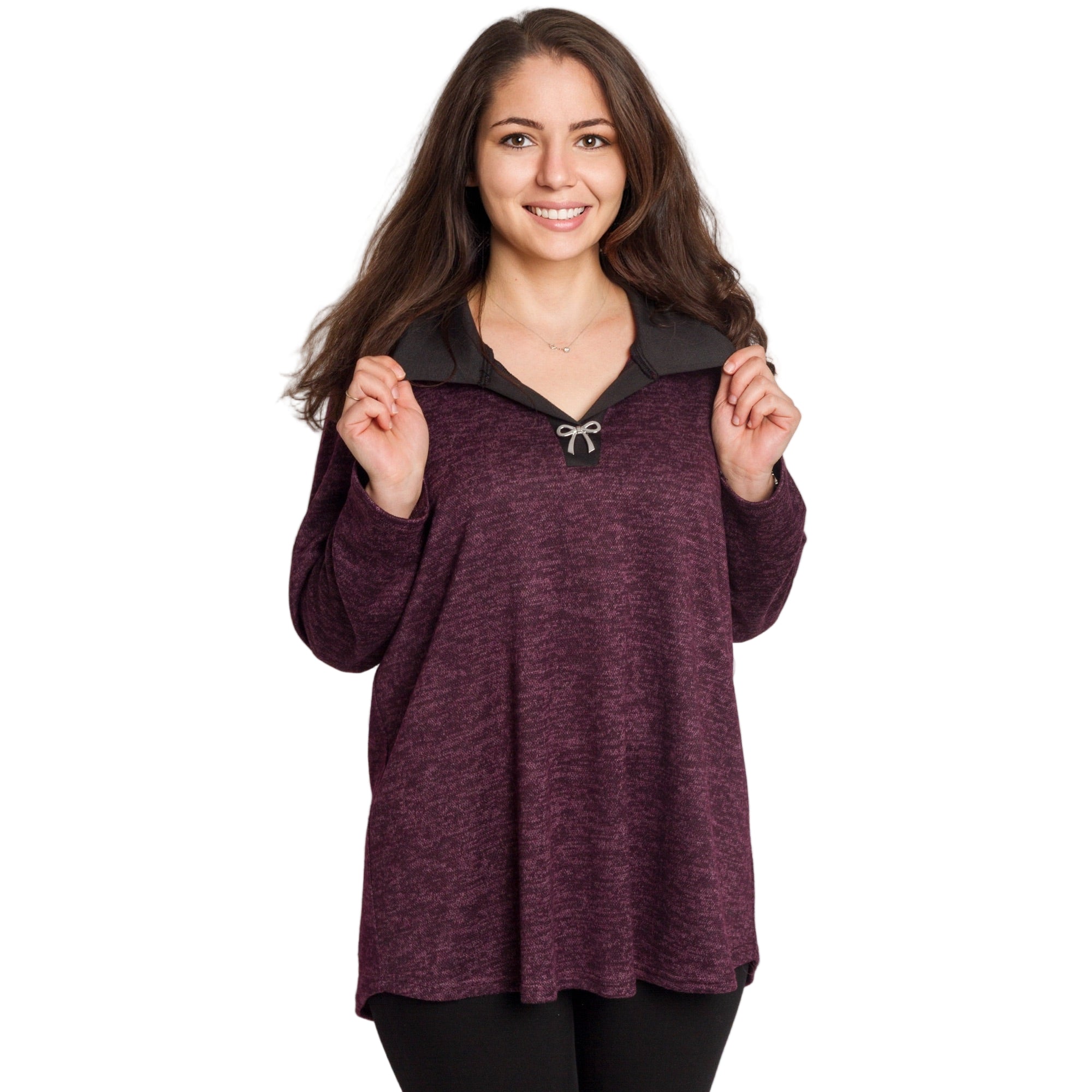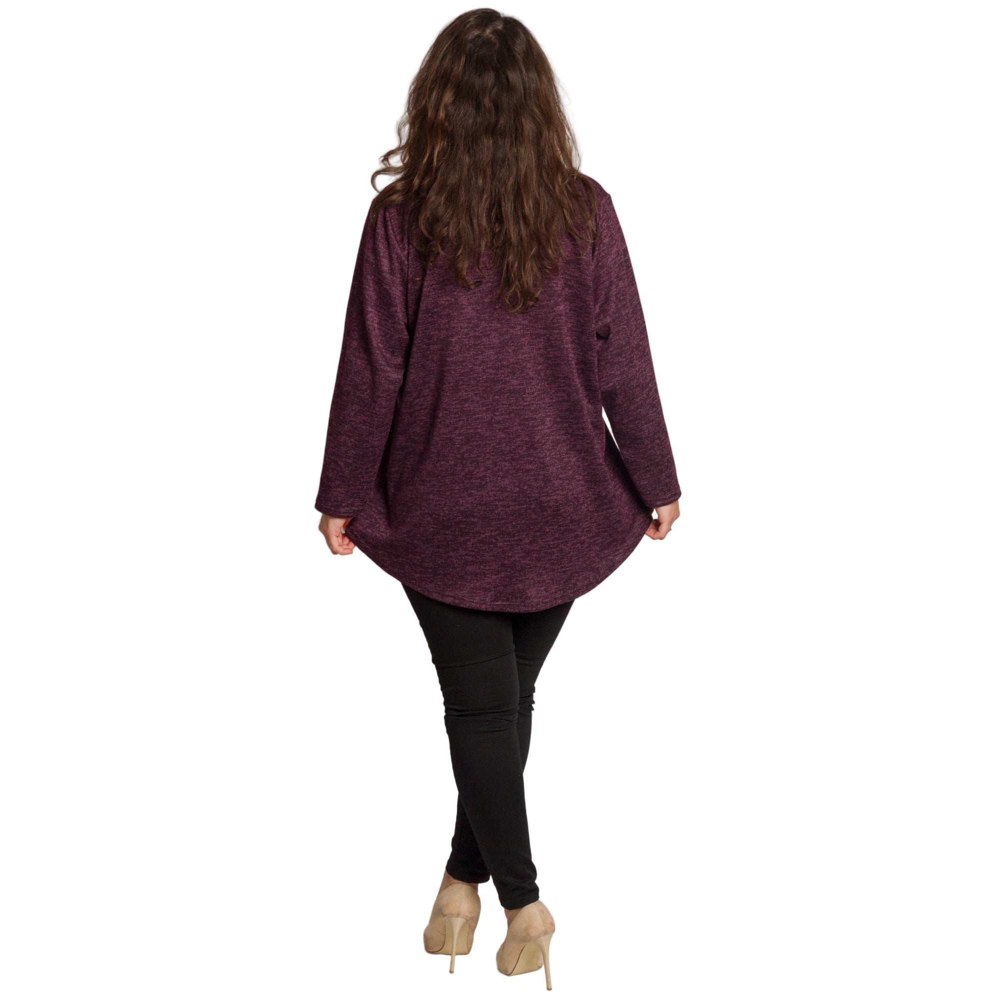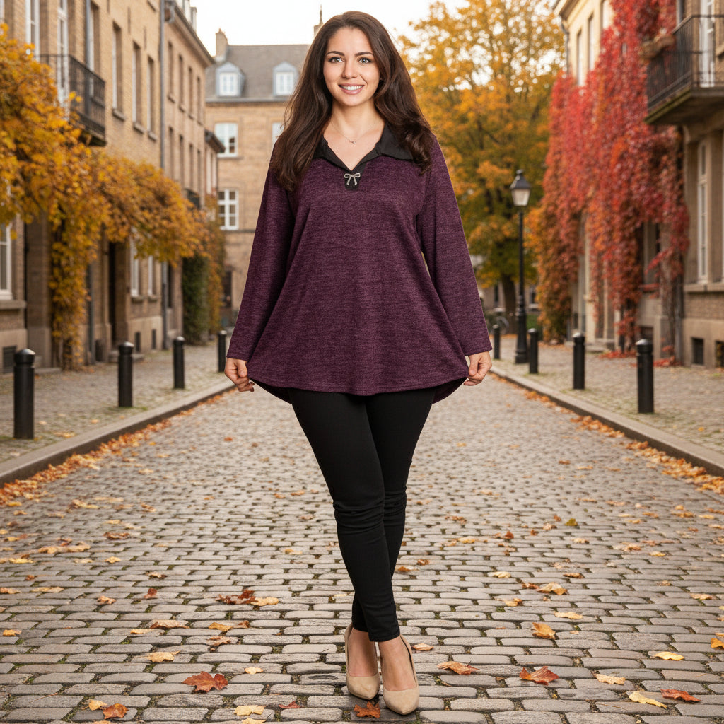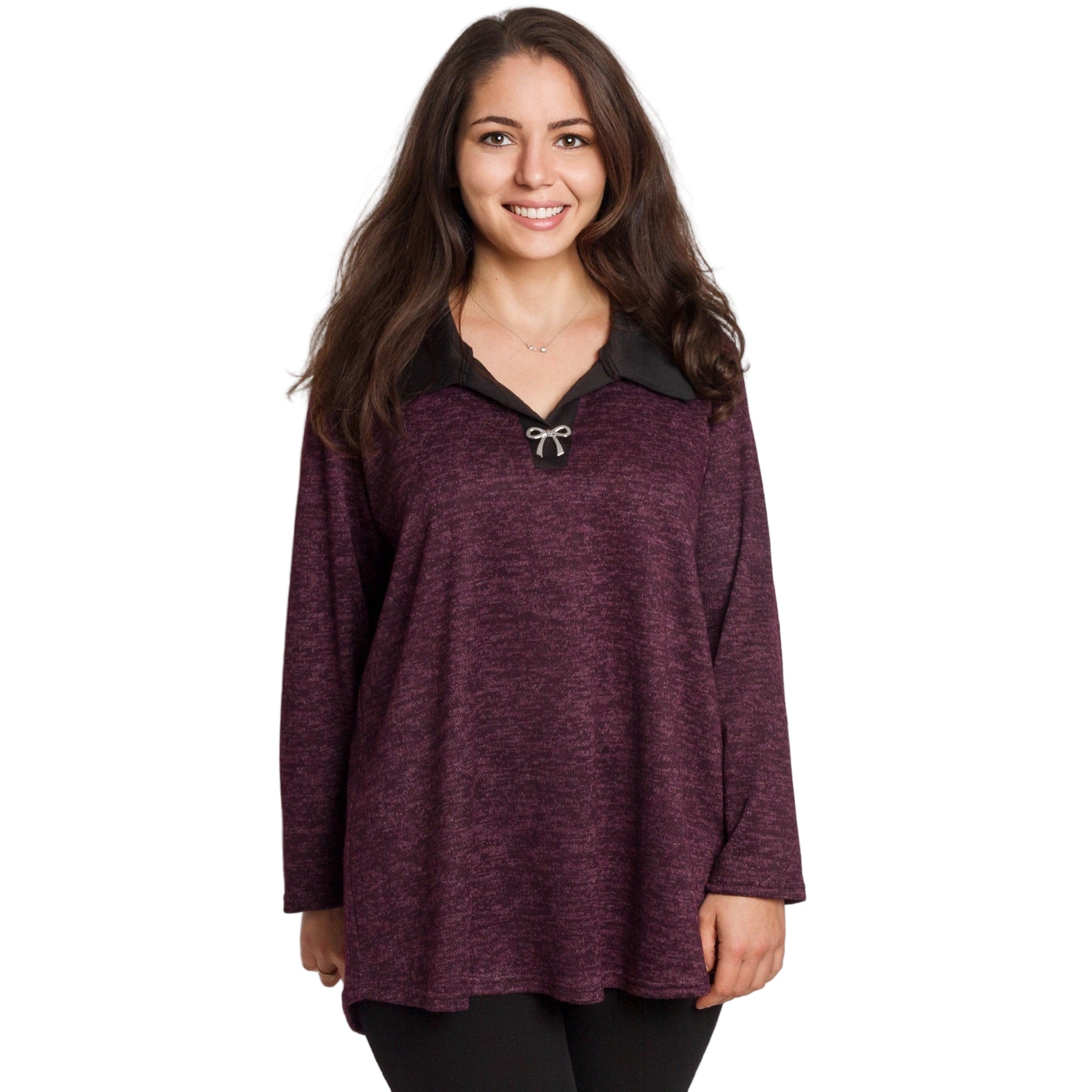 Стилна бордова туника в мек меланжиран десен, която комбинира комфорт и елегантност за плюс сайз дами. Материята от вискоза с еластан осигурява удобно усещане, а правата кройка прикрива деликатно корем и ханш. Декоративната яка и V-образното деколте подчертават бюста и издължават визуално силуета, докато малката панделка добавя женствен финален акцент. Идеален модел за есенно-зимния сезон – подходящ както за ежедневие, така и за по-официални моменти.