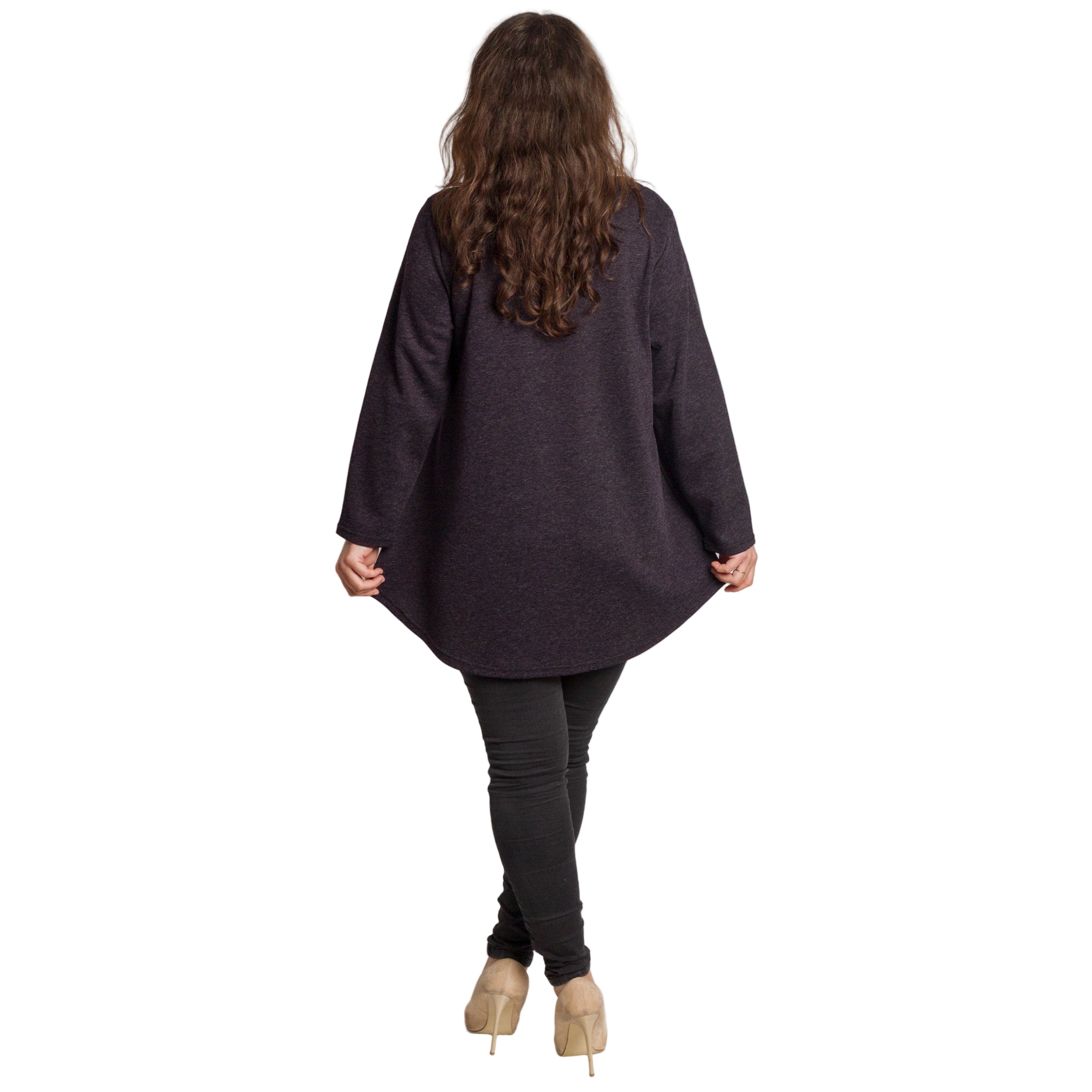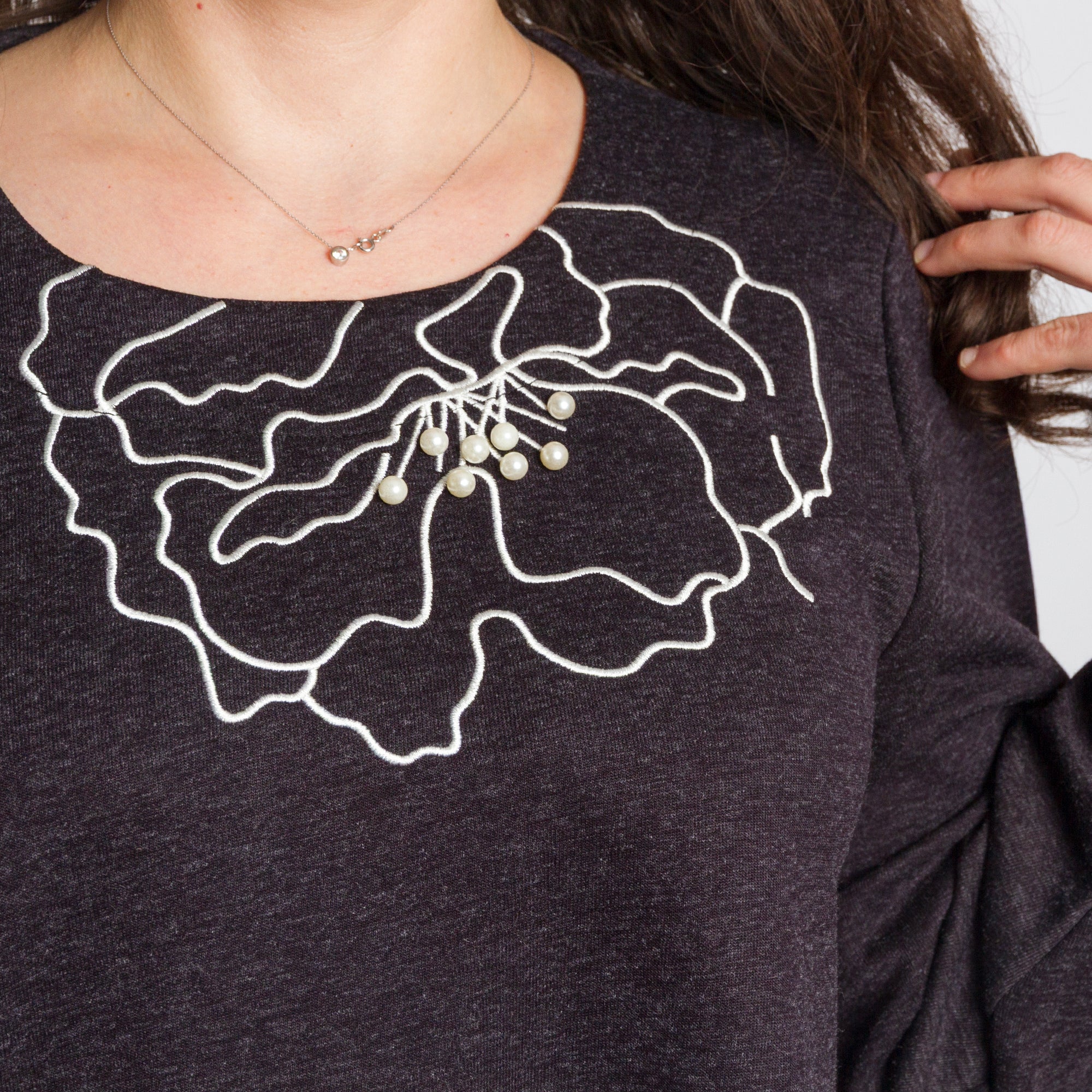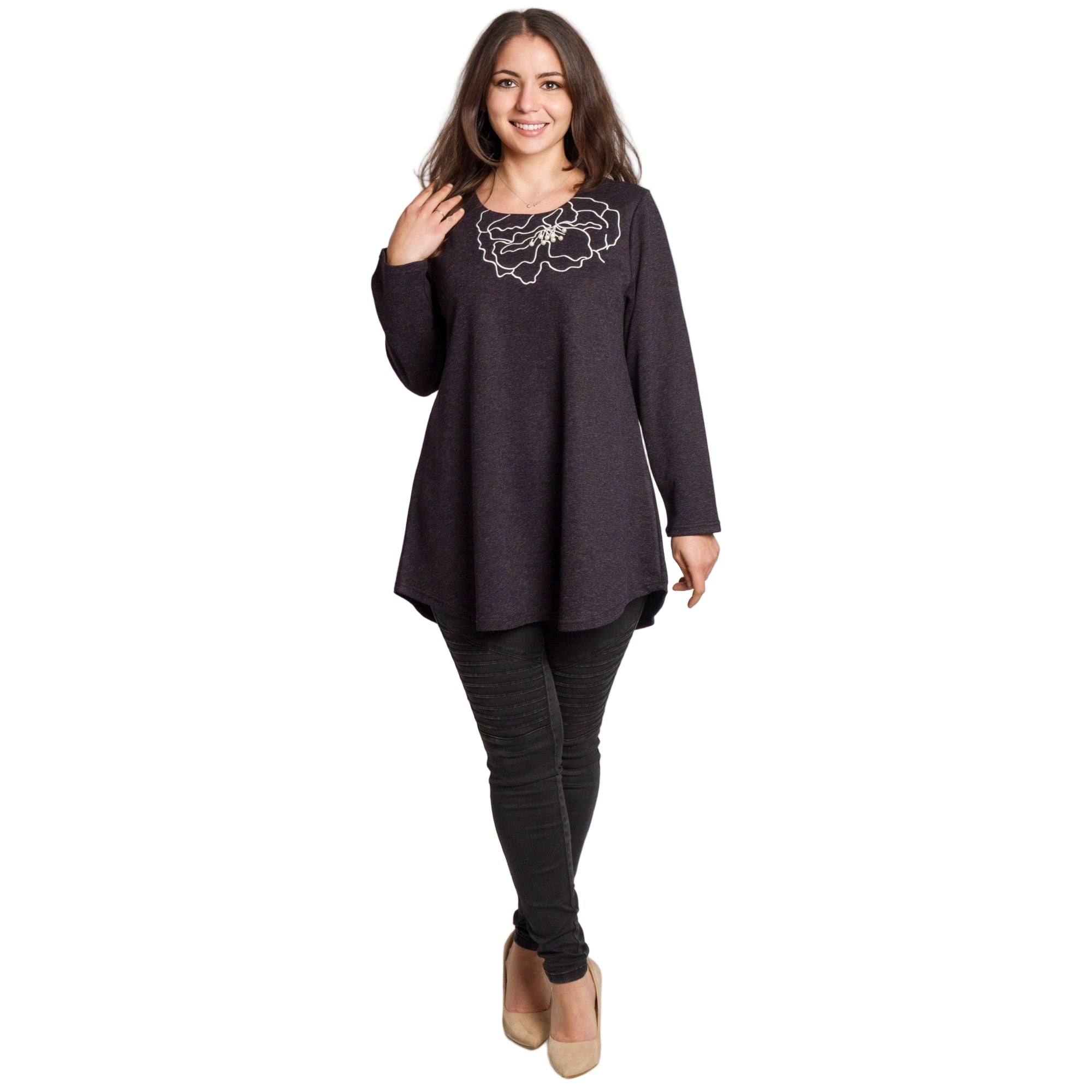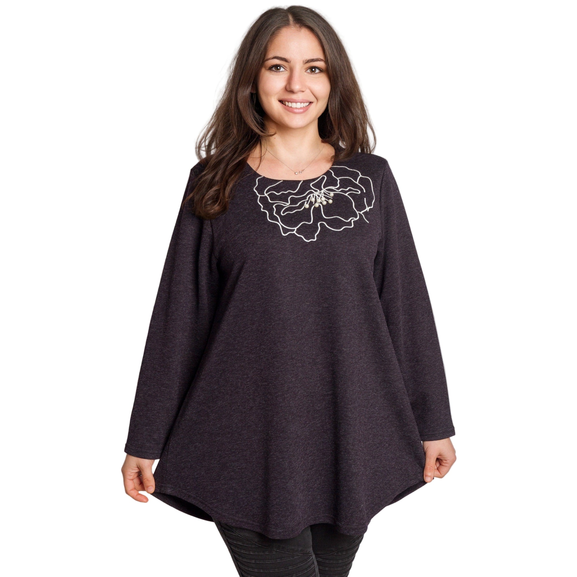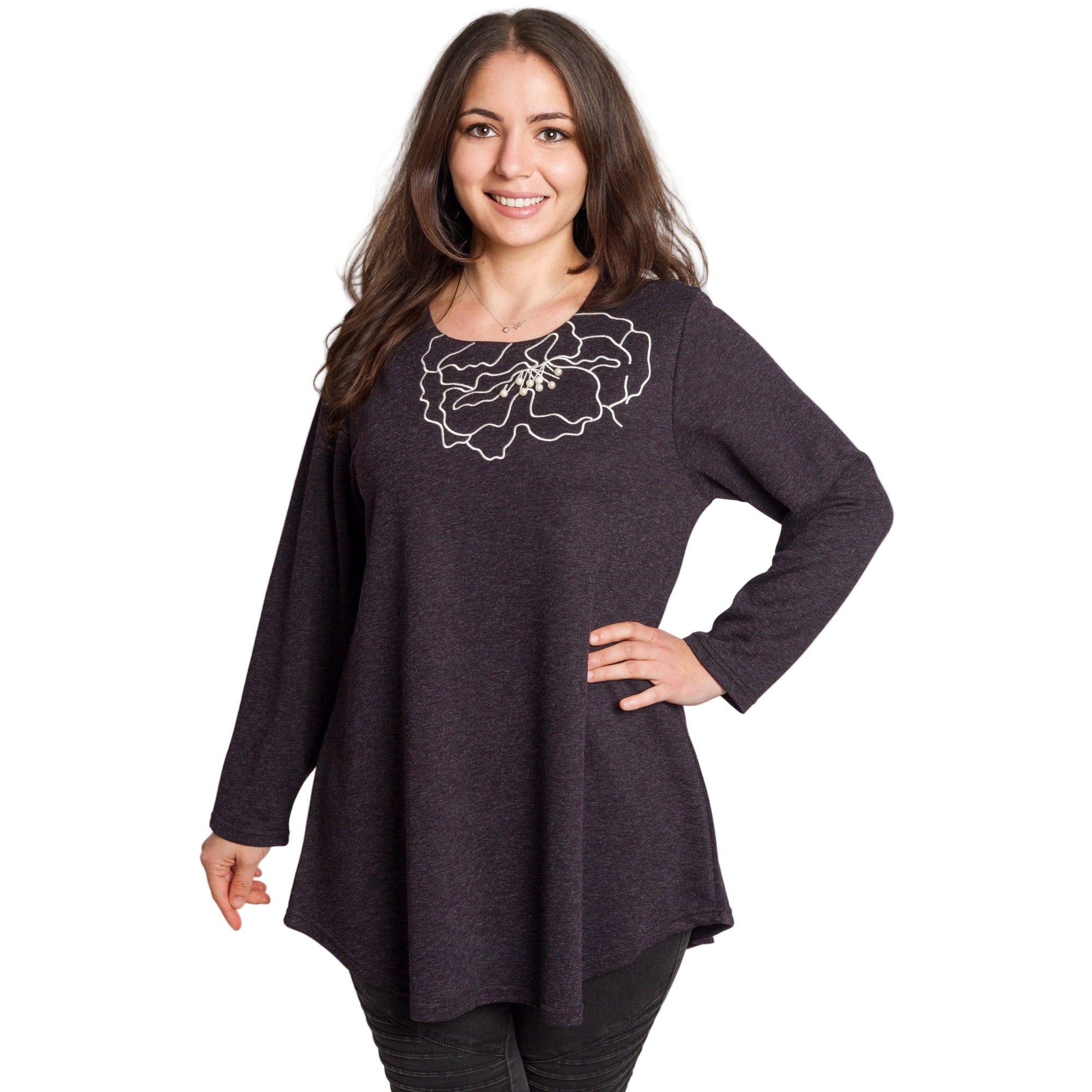 Тази стилна туника в тъмнолилав цвят съчетава комфорт и изисканост. В горната част е декорирана с фина флорална бродерия, допълнена с перлички, които придават нежност и женственост. Разкроената кройка пада меко по тялото и прикрива зоните, които всяка жена иска да оформи визуално. Материята е мека, еластична и пада красиво – подходяща за есенно-зимния сезон. Може да се носи както ежедневно, така и на по-официален повод.