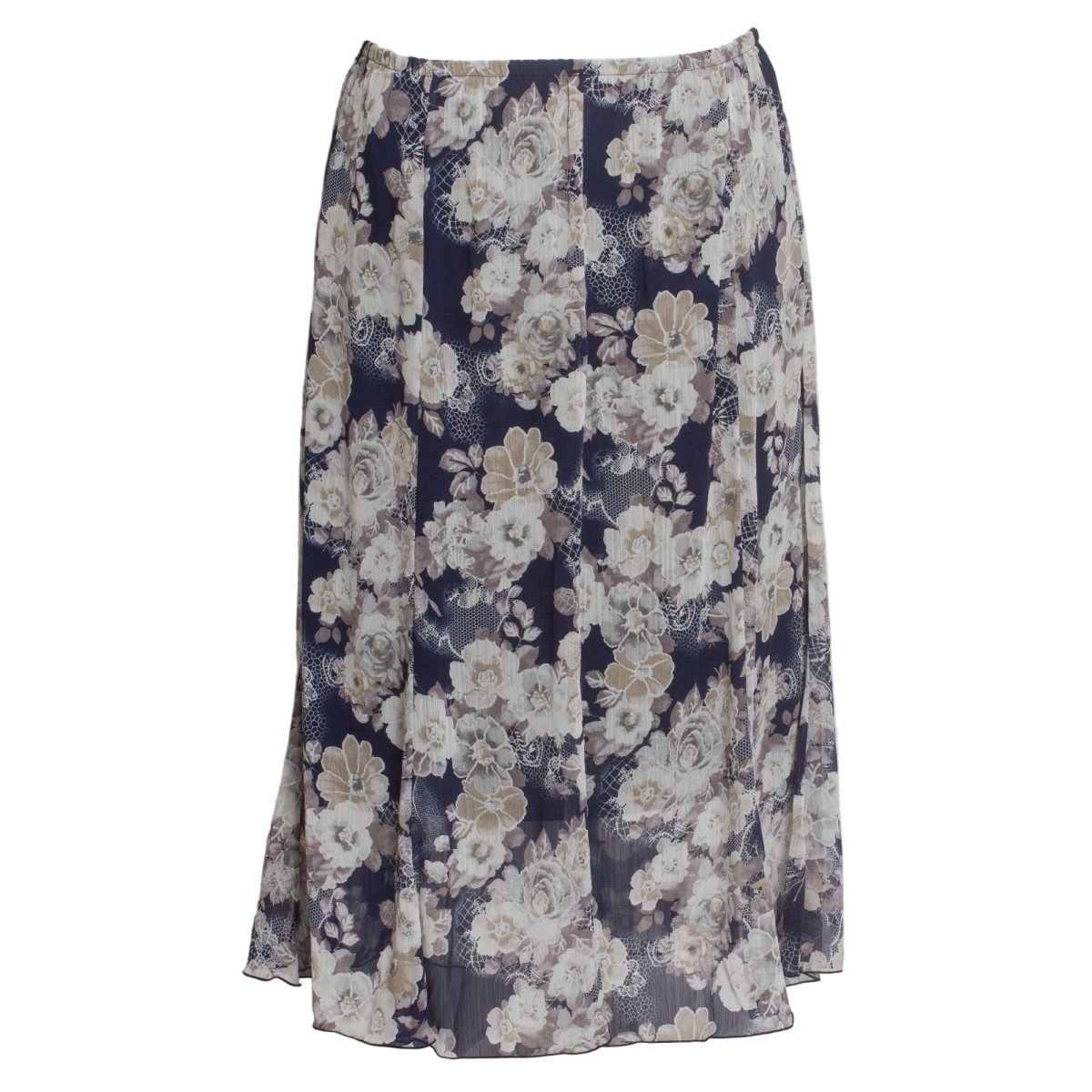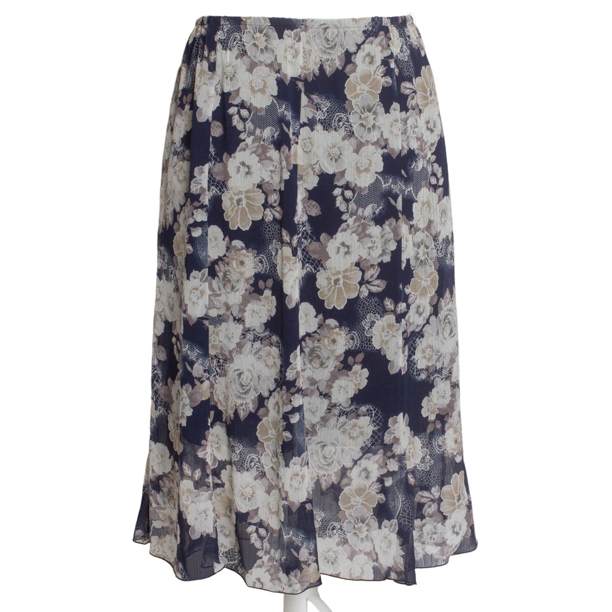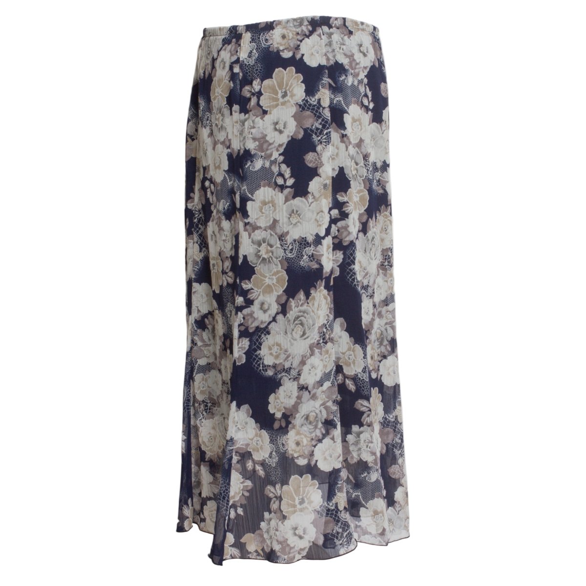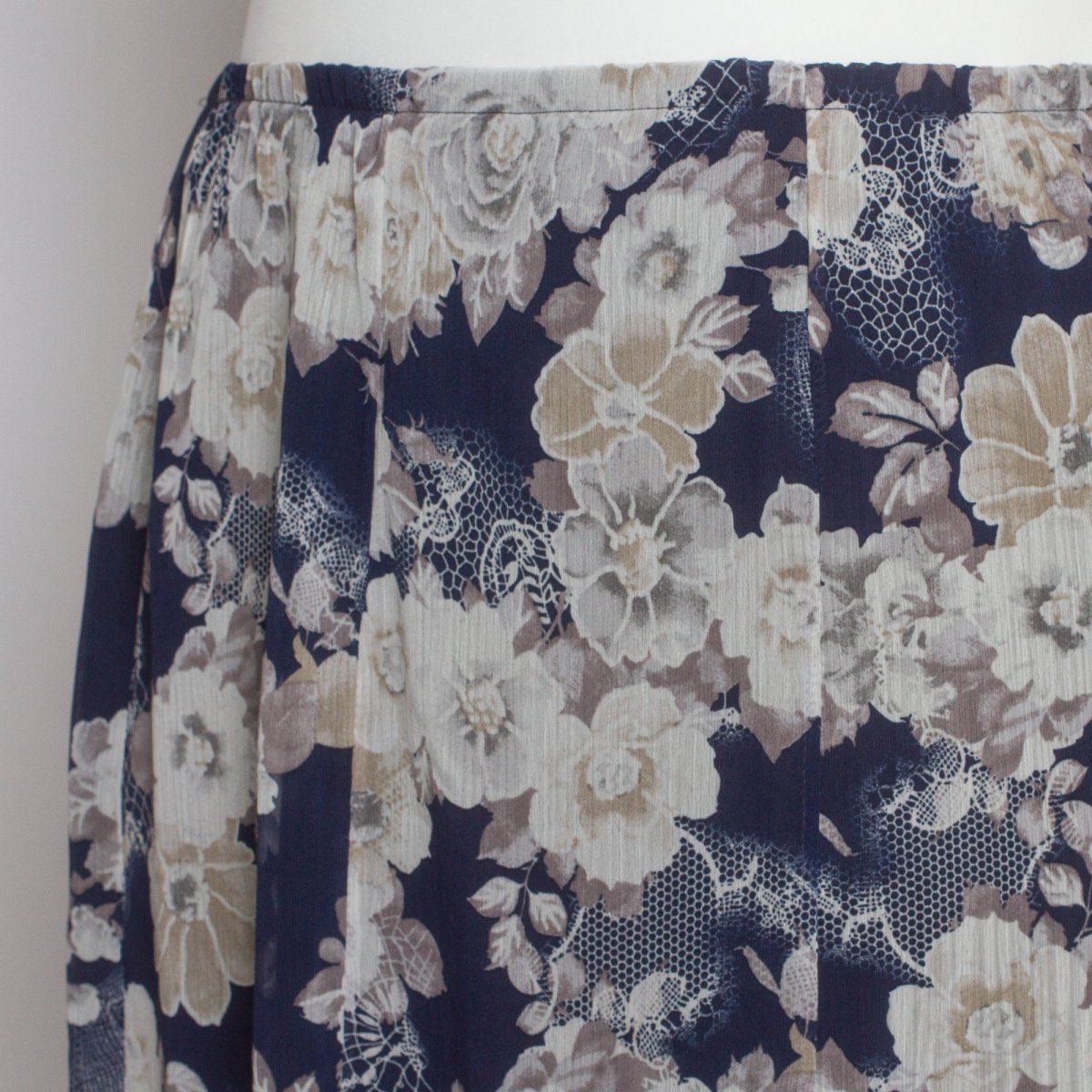 Елегантна пола в тъмносин цвят с красив флорален десен, изработена от мека и еластична материя с високо съдържание на вискоза. Моделът е с ластична талия без копчета, което осигурява удобство и лесно обличане. Дължината е до глезена, а свободната кройка пада леко и женствено. Подходяща е както за ежедневни комбинации, така и за официални поводи през есенно-зимния сезон.