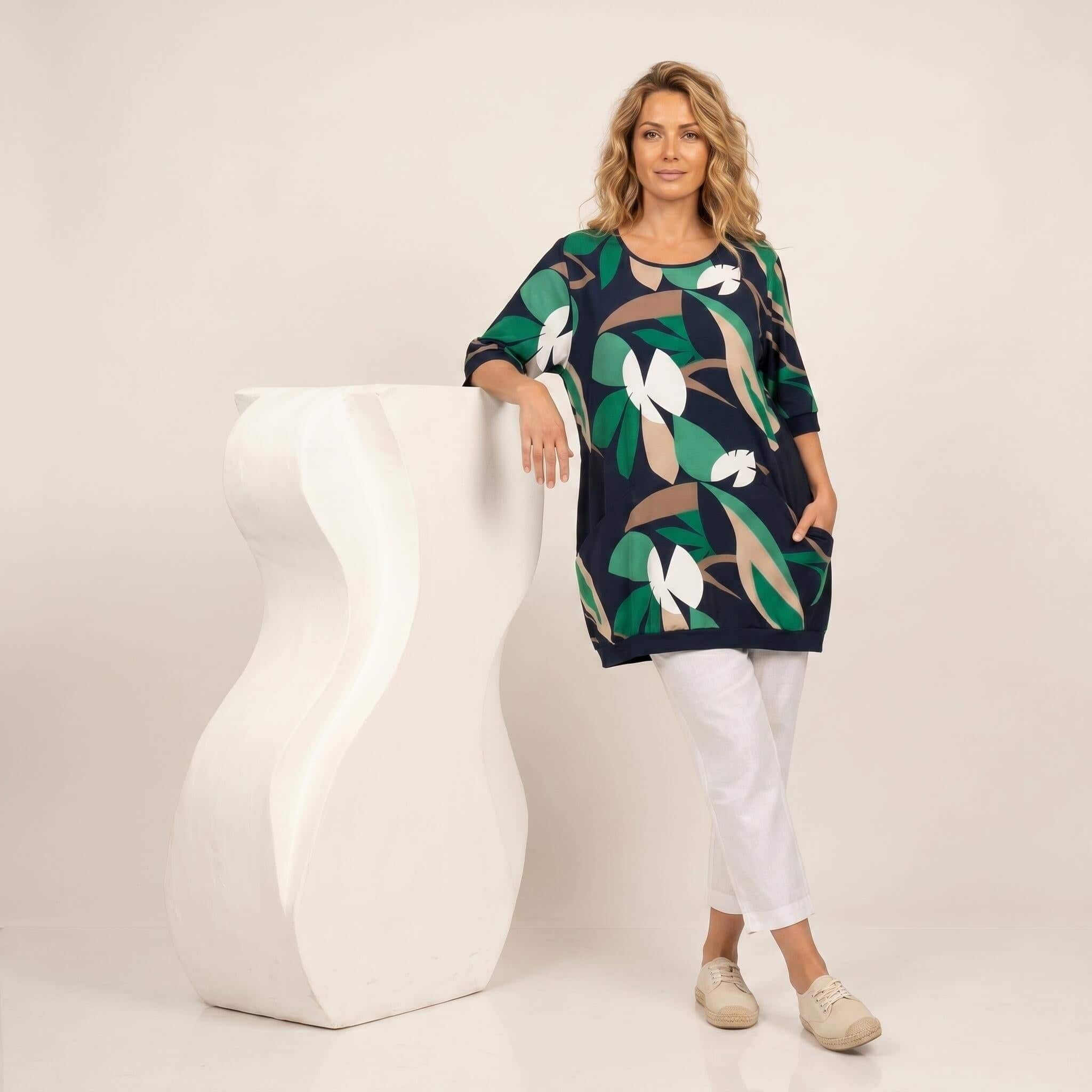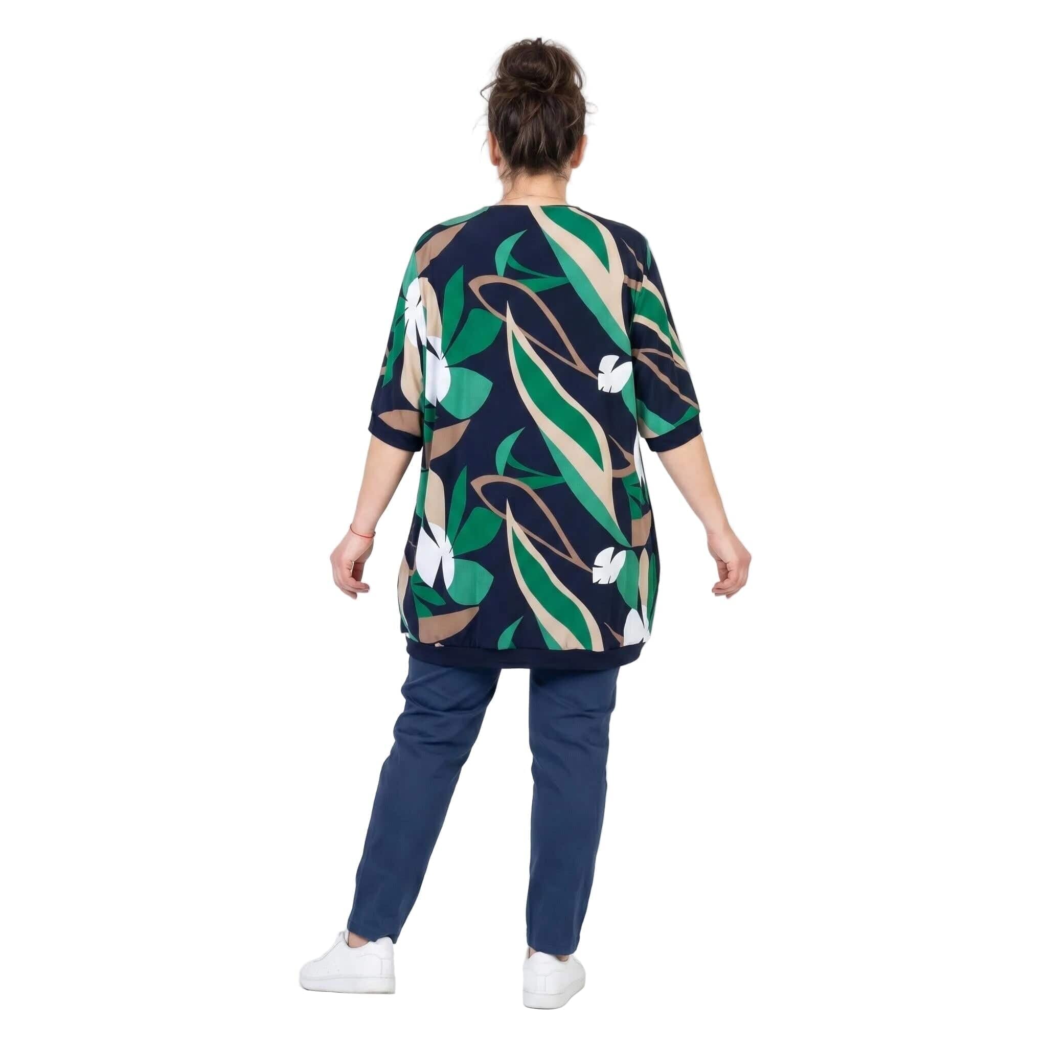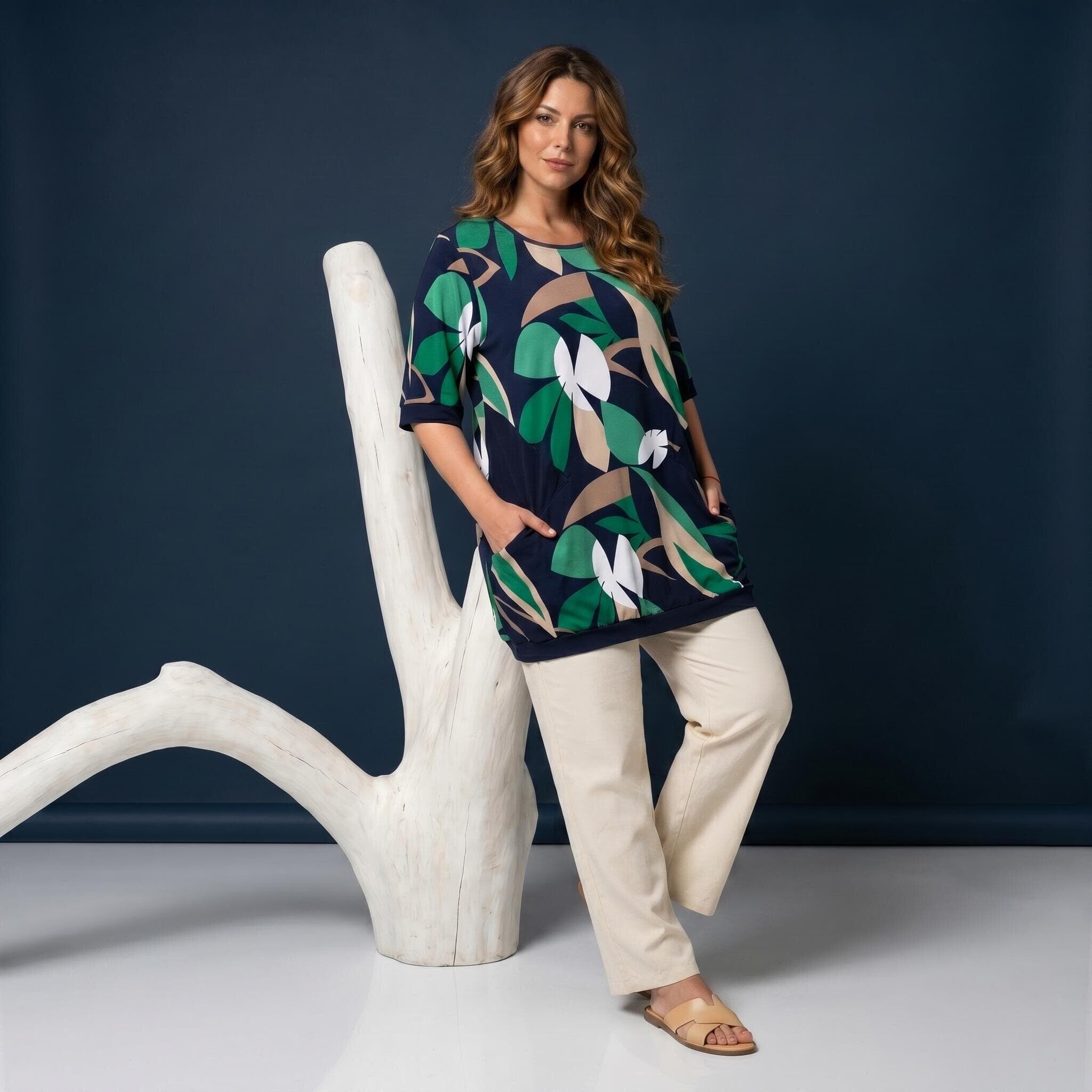 Тази елегантна тъмносиня лятна туника големи размери е перфектният избор за дамите, които ценят безупречния стил и комфорта в ежедневието. Изработена от гладка, мека и еластична материя, туниката пада свободно и грациозно по тялото, осигурявайки усещане за лекота през топлите пролетни и летни дни. Моделът се отличава с разкроена кройка, обло деколте и къси ръкави, като визията е обогатена с красив абстрактен принт на листа в зелено, бежово и бяло. Практичните предни джобчета добавят удобство, а тъмносиният маншет в долната част придава завършеност и елегантна структура на силуета. Чудесно предложение за макси мода, което се съчетава лесно с любимия ви клин или панталон за модерна и уверена визия.