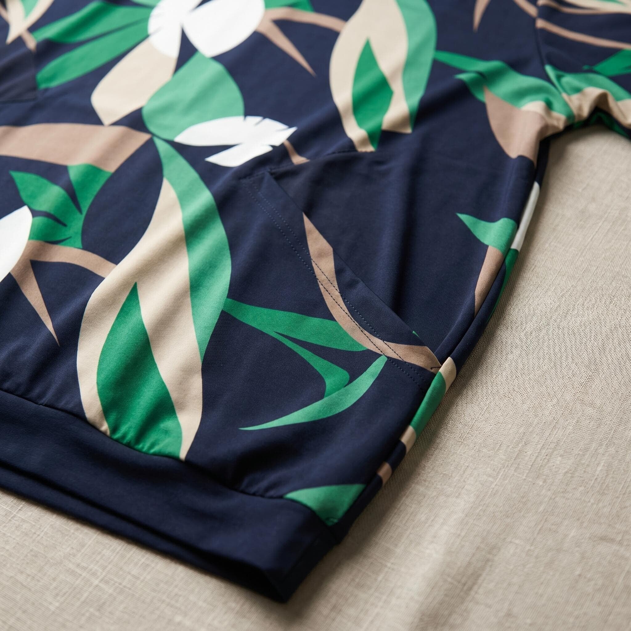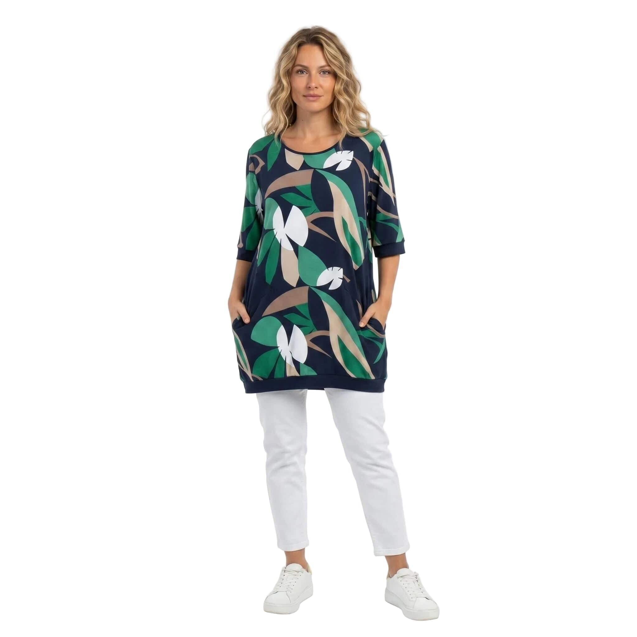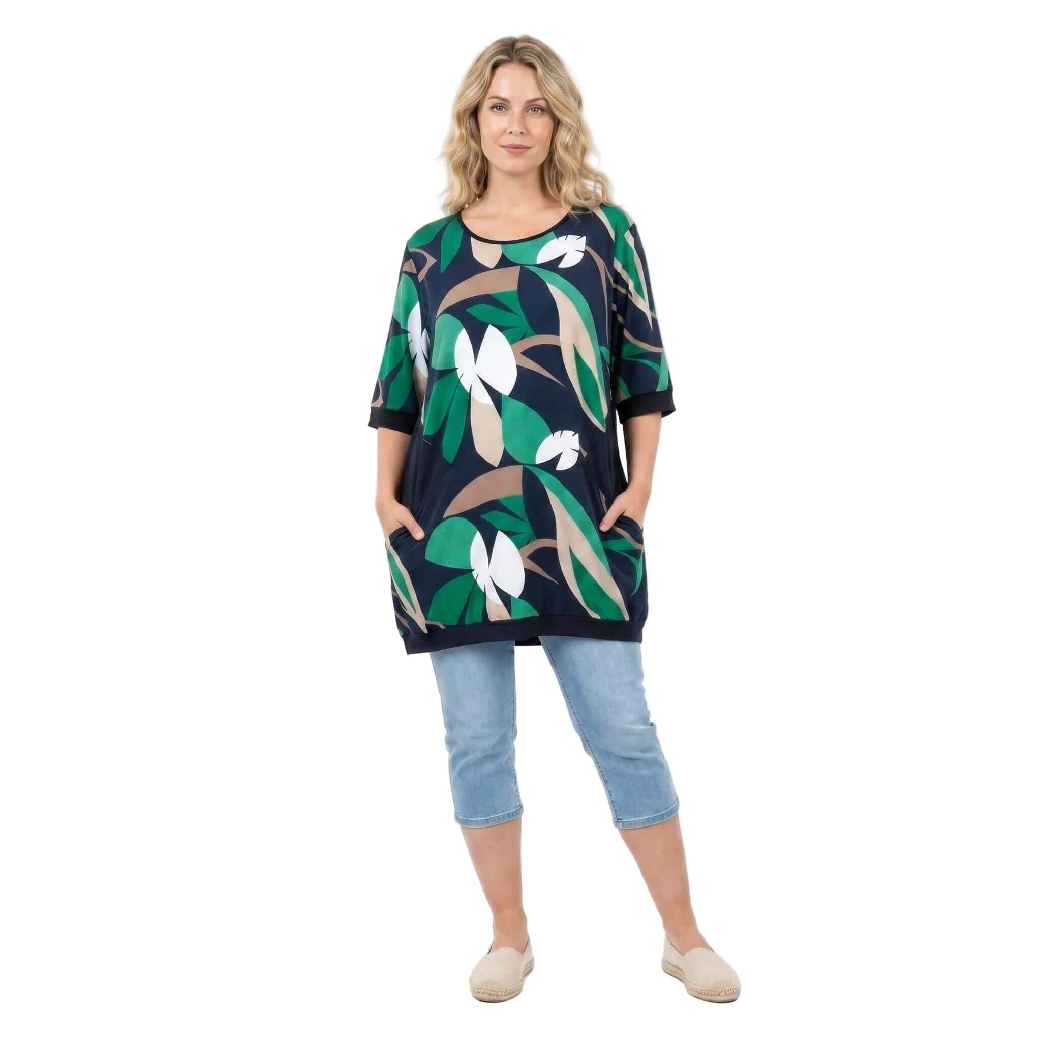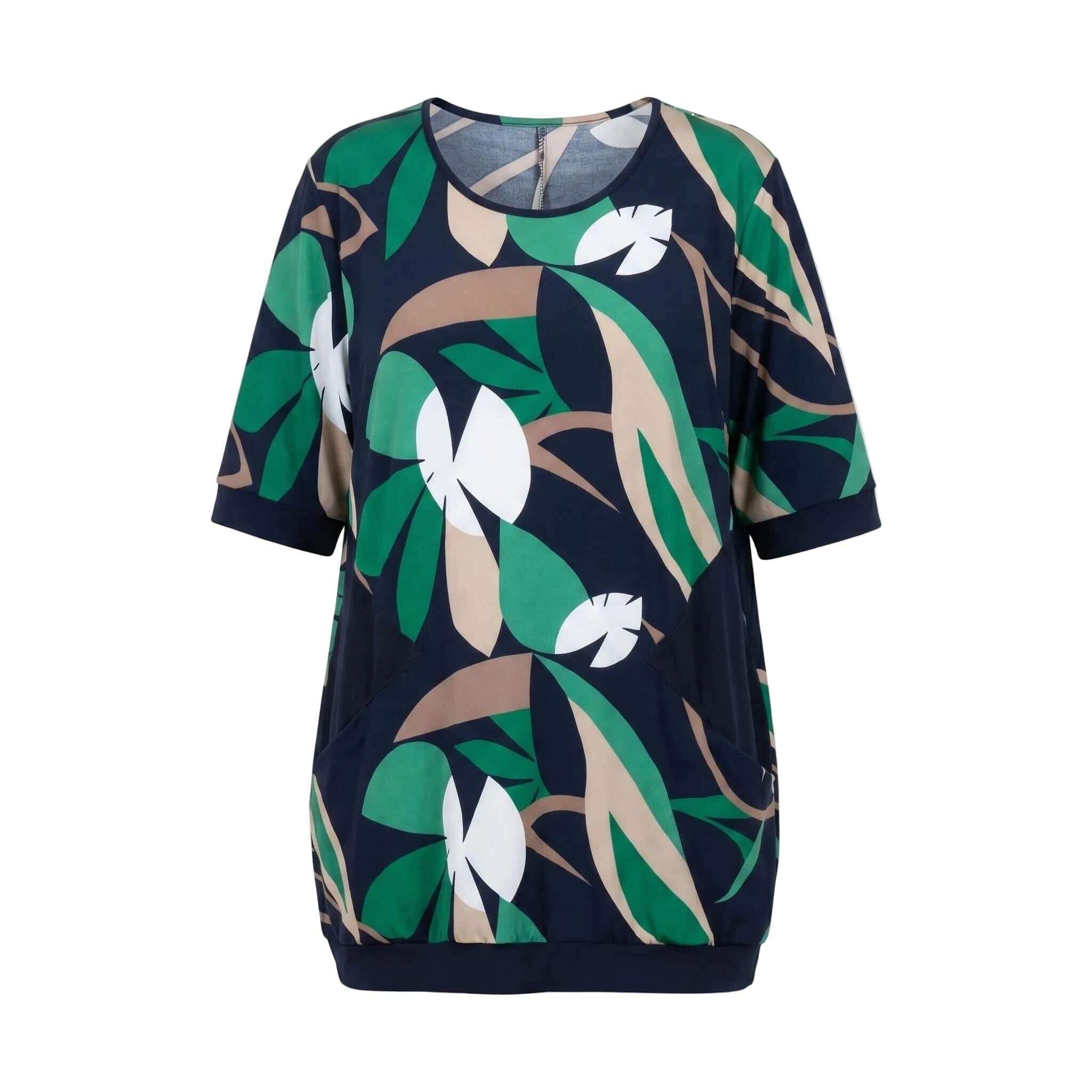 Тази елегантна тъмносиня лятна туника големи размери е перфектният избор за дамите, които ценят безупречния стил и комфорта в ежедневието. Изработена от гладка, мека и еластична материя, туниката пада свободно и грациозно по тялото, осигурявайки усещане за лекота през топлите пролетни и летни дни. Моделът се отличава с разкроена кройка, обло деколте и къси ръкави, като визията е обогатена с красив абстрактен принт на листа в зелено, бежово и бяло. Практичните предни джобчета добавят удобство, а тъмносиният маншет в долната част придава завършеност и елегантна структура на силуета. Чудесно предложение за макси мода, което се съчетава лесно с любимия ви клин или панталон за модерна и уверена визия.